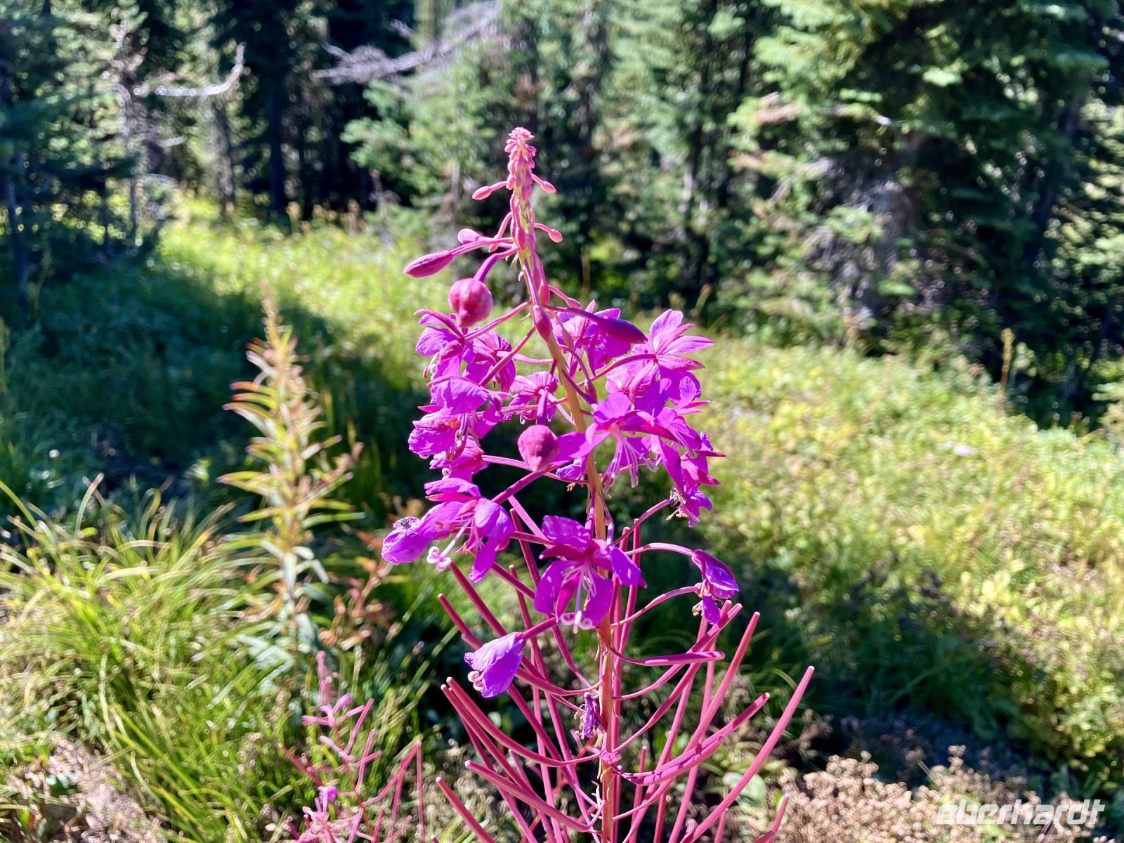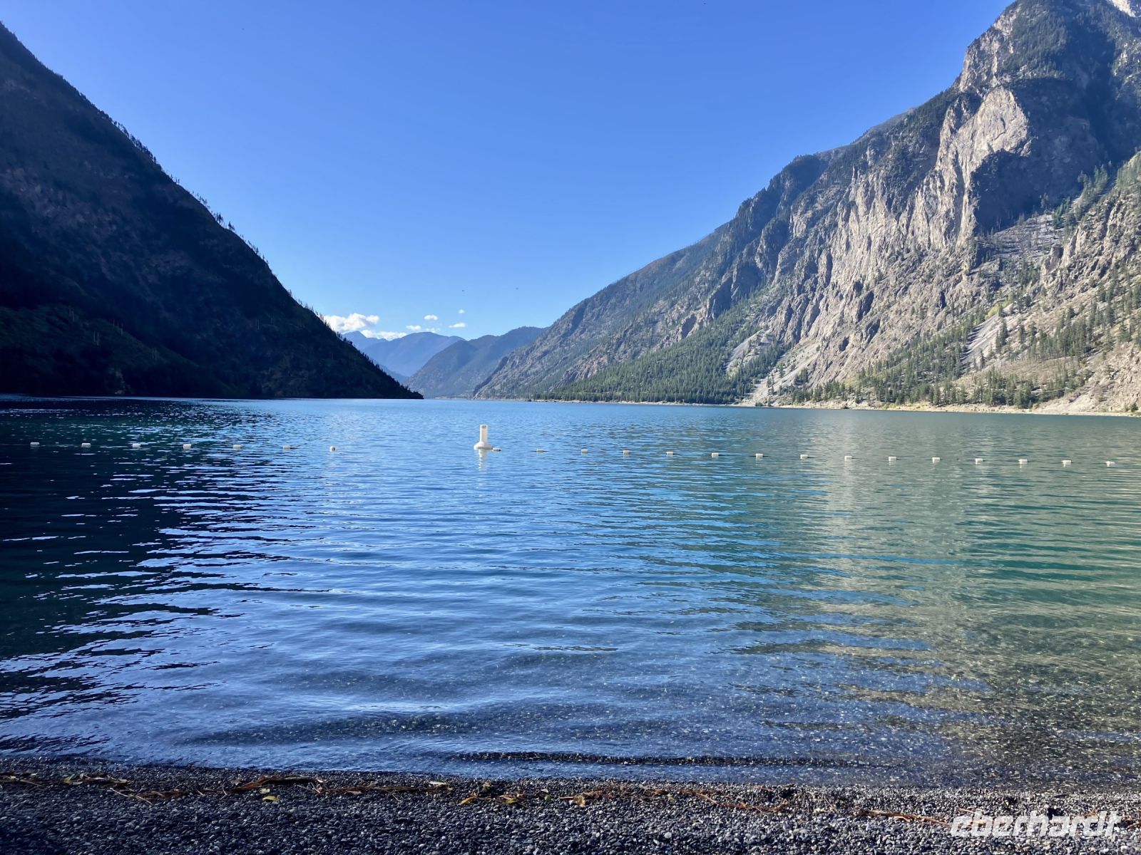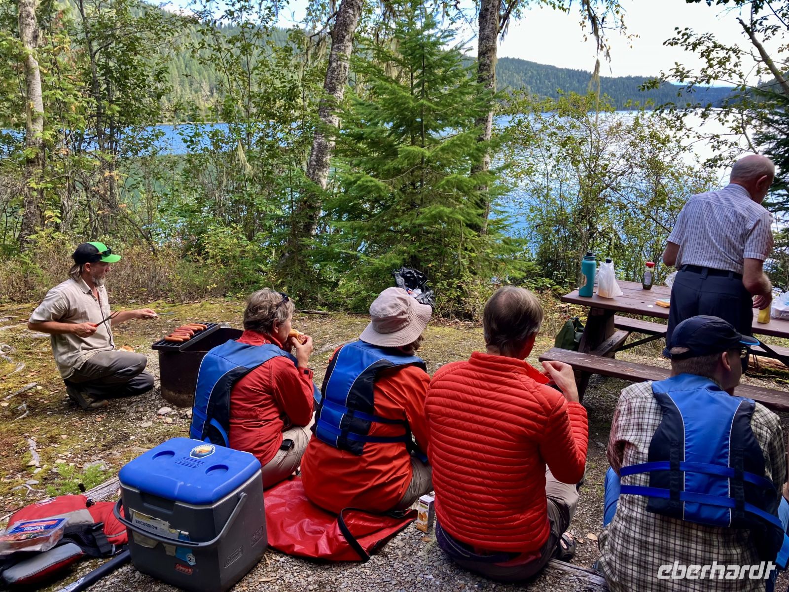 Nach dem schoenen Fruehstueck mit herrlicher Aussicht auf Revelstoke und seinen Columbia Fluss warten auch bereits zwei Minibusse auf uns. Unser heutiges Picknick ist bereit zur Abholung und wir stehen mit unseren Rucksaecken und Wanderschuhe bereit fuer diese Wanderung. Tom und Rob sind die beiden Fahrer und mit den Minibussen fahren wir nun auf den Parkway of the Sky. Ja, 26 Km fahren wir hinauf auf den Berg dieses National Parks. Wir befinden uns auf 1830 Meter ueber Meer, die Luft ist frisch, die Sonne Lacht, kein Woelkchen ist zu sehen. Echt perfektes Wanderwetter. Dem Balsam See wandern wir entlang auf die andere Seite und nehmen gleich schon mal einen falschen Weg der bloss eine Schlaufe macht. Nun aber sind wir auf dem richtigen Pfad der uns zu Millet Lake und Eva Lake fuehren wird. Gluecklich und gespraechig, wandern wir auf einem sehr schoenen Wanderweg an Wiesen vorbei ein bisschen bergauf und dann wieder bergab. Dieser National Park ist im Selkirk Gebirge und die Aussicht auf das Monashee Gebirge gegenueber ist einfach atemberaubend. Dazwischen sehen wir ihn auch immer wieder weit unten im Tal. Es ist der maechtige Columbia River. Nach 2 Stunden, entscheiden wir uns nicht hinunter zu den Seen zu wandern sondern hier auf einer schoenen trockenen Wiese mit tollem Panorama zu verschnaufen und unser Picknick auszupacken. Nach dieser erholsamen Pause wandern wir wieder zurueck und sehen diese Bergwelt nun nochmals aber von der anderen Seite. Angekommen beim Parkplatz haben wir noch Zeit um die Aussicht von dem Feuerwachturm aus zu bestaunen und noch mehr Fotos zu knipsen. Ach schau, da sind sie ja, unsere Minibusse mit Rob und Tom, sie fuehren uns nun wieder den Berg hinunter mit einem kurzen Fotostop dazwischen. Da sehen wir sie auch, 2 Weisskopfadler kreisen ueber unseren Koepfen und nutzen die Thermik um schwebend Hoehe zu gewinnen, immer kleiner werden sie, bis sie nicht im Himmel verschwinden.