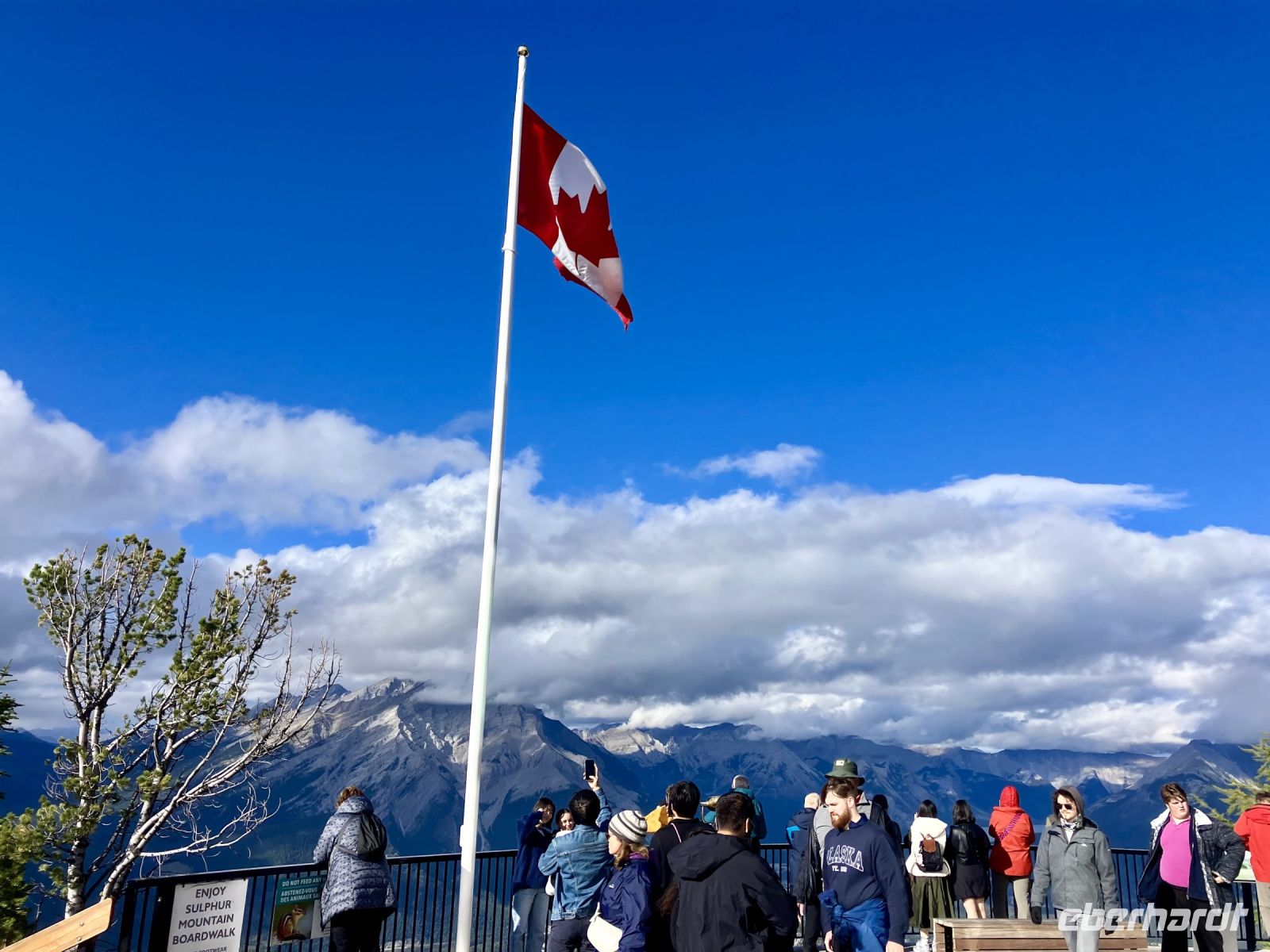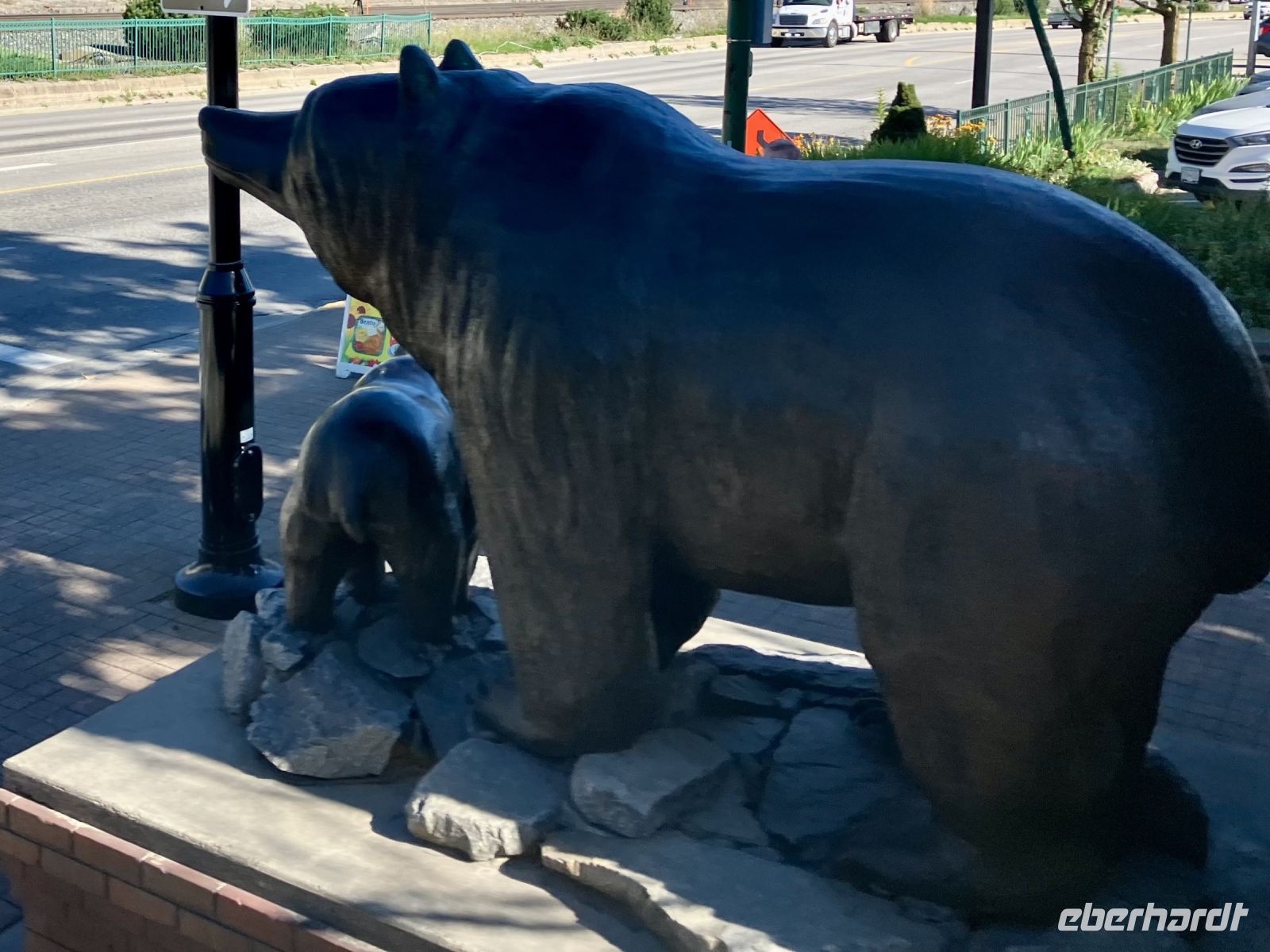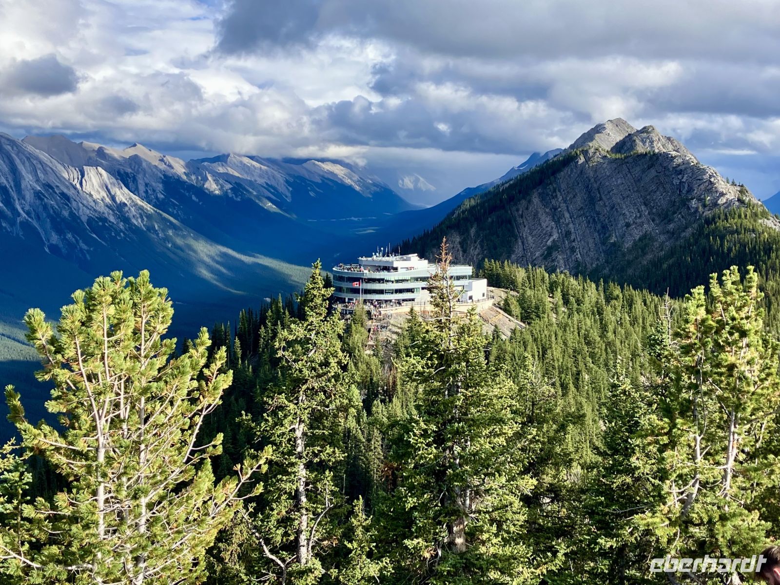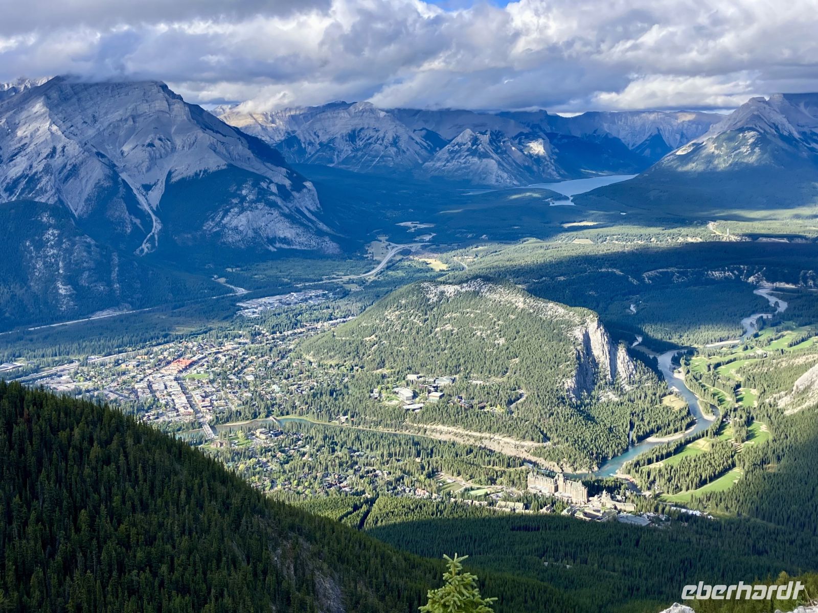 Ehe wir jedoch in Banff zur Gondel fahren gibts noch einen kurzen Abstecher zum beruehmten Banff Springs Hotel. Das schlossartige Gebaeude aus Stein inmitten des tiefgruenen Waldes wird von Prominenz sowie asiatischen Besuchern gern besucht. Die Skulptur von Cornelius Van Horn bewacht das ganze. Bald gehts weiter zu der Gondel womit wir alsobald auf Sulphur Mountain schweben. Oh, die tolle Sonne und diese herrliche Aussicht auf Banff hinunter. Alle 5 Hausberge kann man von hier oben sehen und noch weiter 500 Berge des Banff National Parks. Wir geniessen die frische Luft und den schoenen Fussweg zu Samson’s Huettchen. Das Panorama ist einfach ein Traum und die Geschichte von Mr. Samson inspirierend. Gemuetlich spazieren wir wieder zurueck zur Gondel und viele Fotos spaeter gondeln wir wieder ins Tal wo Chris bereits auf uns wartet. Was fuer ein toller Tag.