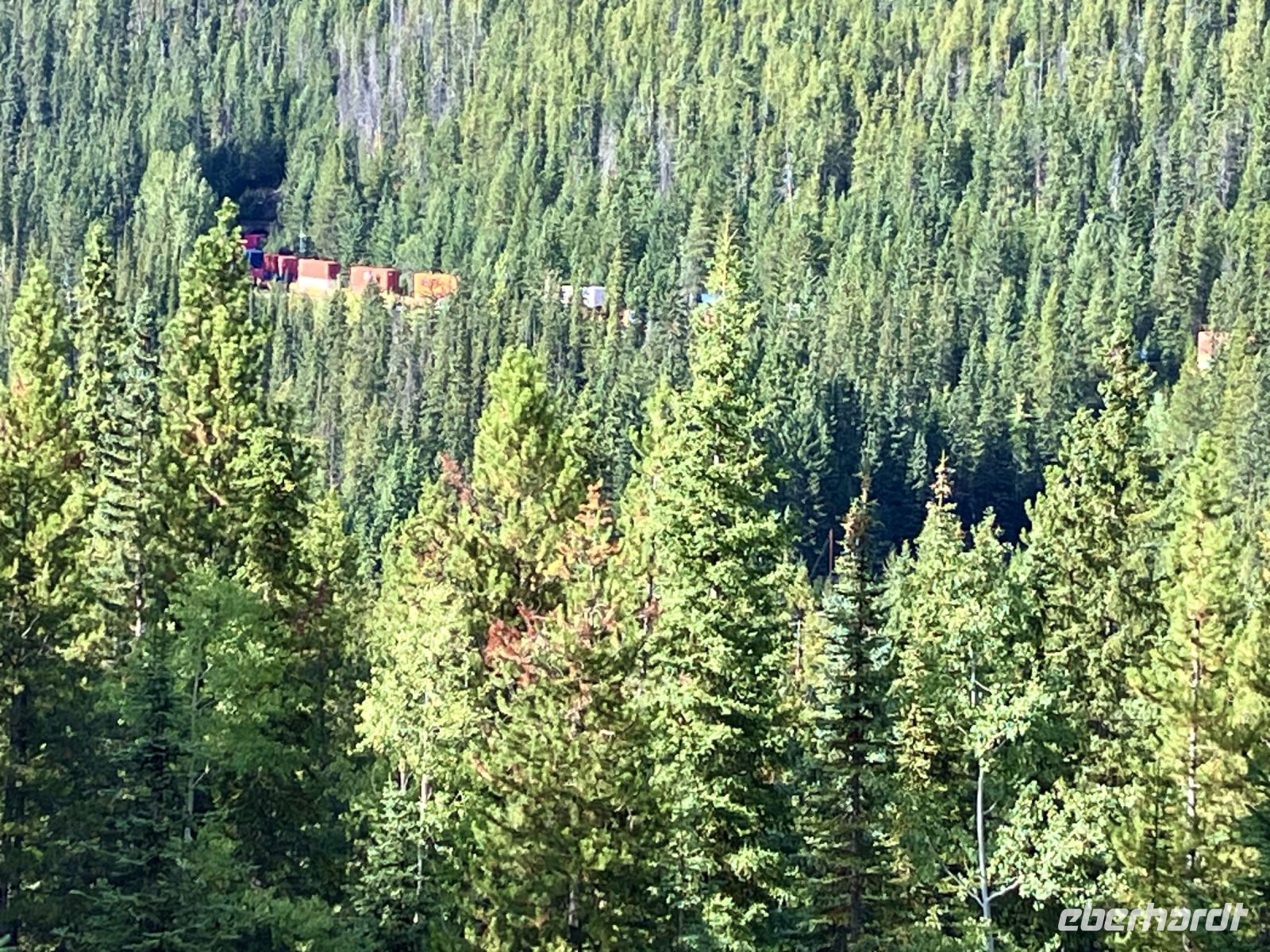 Wir haben nun eine lange Strecke zu fahren bis wir zu unserem Nachtquartier in Revelstoke gelangen. Geschlagene 4 Stunden fahren wir ueber Lake Louise, in den Yoho National Park wo wir einen Zug in den Spiral Tunnel fahren sehen und dann weiter nach Golden und ueber den legendaeren Rogers Pass im Glacier National Park. Die Fahrt ist sehr interessant und wir werden von verschiedenen Bergketeen begleitet. Die Selkirks beim Rogers Pass sind sehr steil und viele Lawinenhaenge sind jetzt im Herbst auch verfaerbt. Unser Hotel in Revelstoke ist sehr schoen auf einer Anhoehe gelegen und im Restaurant essen wir einen leckeren, frischen Sockey Lachs. So ein herrlicher Tag, nun sind wir aber geschafft und die schoenen Zimmer warten auf uns. Gute Nacht liebe Wanderfreunde.