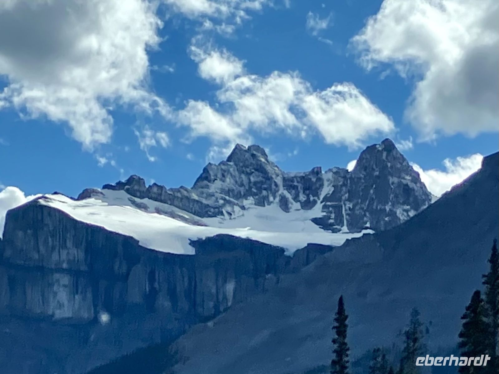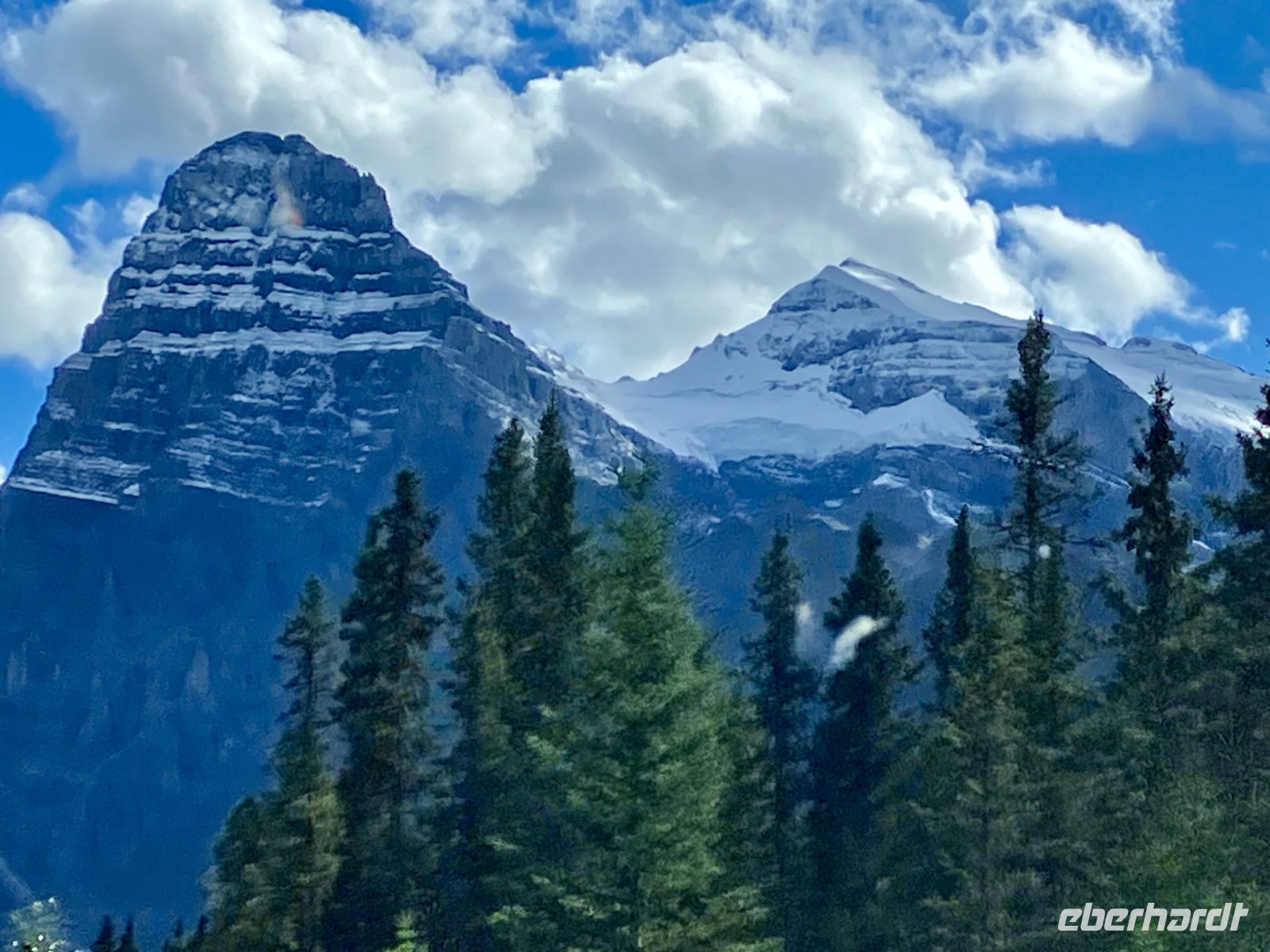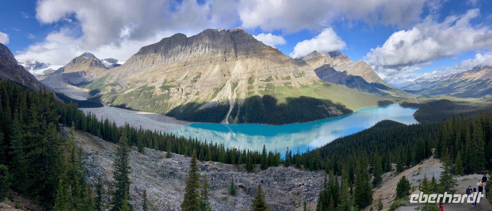 Der naechste Stop ist bei Peto Lake. Die Aussicht auf diesen tollen See wird uns allen in Erinnerung bleiben. Aufgewaermt, gehts nun weiter, dem Waterfowl Lake entlang. Dieser See wartet noch immer geduldig auf seine vielen Wasservoegel um seinem Namen gerecht zu werden. Auf der Parkstrasse schauen die Gletscher von jedem Berg auf uns hinunter. Es ist eine reine Pracht. Mittagspause machen wir heute auf einer natuerlichen Terrasse mit Sicht auf den Saskatchewan River wie er sich in seinem Tal ein Flussbett sucht. Die Sonne strahlt, der Himmel ist dunkelblau und wir sind uebergluecklich. Ach wie herrlich sind doch diese Rockies und ach wie sehr werden wir von Mutter Natur verwoehnt. Auf dem Weg zu unserem Highlight heute sehen wir Schneeziegen auf einer Felswand und erfahren auch, dass es in Kanada sogar Kurven auf der Strasse gibt !! Mit unserer Hilfe schaffen wir auch die Kurve, sodass wir heil beim Columbia Icefield Center ankommen.