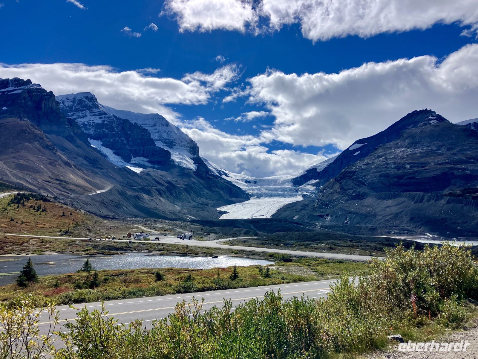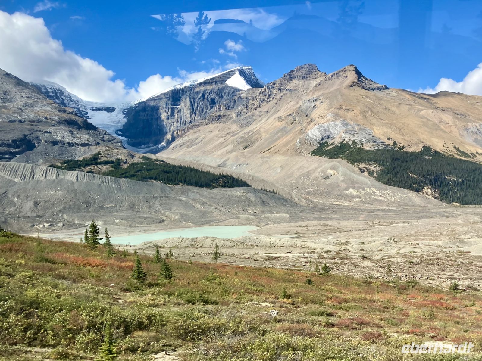 Ach ne, so viele Leute stehen da herum….uuups….ein Feueralarm…..also stehen wir auch mal einfach so herum und verrsuchen herauszufinden, was hier wohl wo passiert sei. 5 Minuten spaeter pirscht Elisabeth ueber die Bruecke, wir hinten nach und siehe da, es war ein Fehlalarm und E hat auch bereits unsere Eintrittskarten. Aber vorerst kommt der obligate Toi Stop. So viele Damen-Toiletten ! Sie sind sogar im Guiness Book of Records vermerkt und das muessen wir natuerlich gleich ausforschen. Einige entscheiden sich fuer eine Moraene-Wanderung am Fusse des Athabasca Gletschers aber die Mehrheit faehrt mit dem riesen Snowcoach aufs Eis. Wir fahren vorerst mit einem normalen Bus auf eine Seitenmoraene und dann steigt man in den Snowcoach um. Damit fahren wir auf den Athabasca Gletscher. Die Fahrer sind alle echt nett und sehr gespraechig. 30 Minuten koennen wir nun auf dem ewigen Eis herumrutschen und kraxeln. Gott Sei Dank gibt es nun ein Schluck Whisky, denn unsere Finger sind ganz schoen kalt geworden mit dem Abfuellen unserer Flaeschchen mit dem „ewig jung“ Gletscherwasser. Wieder unten angekommen, treffen wir unsere Wanderfreunde und sind bald bereit weiter zu fahren.