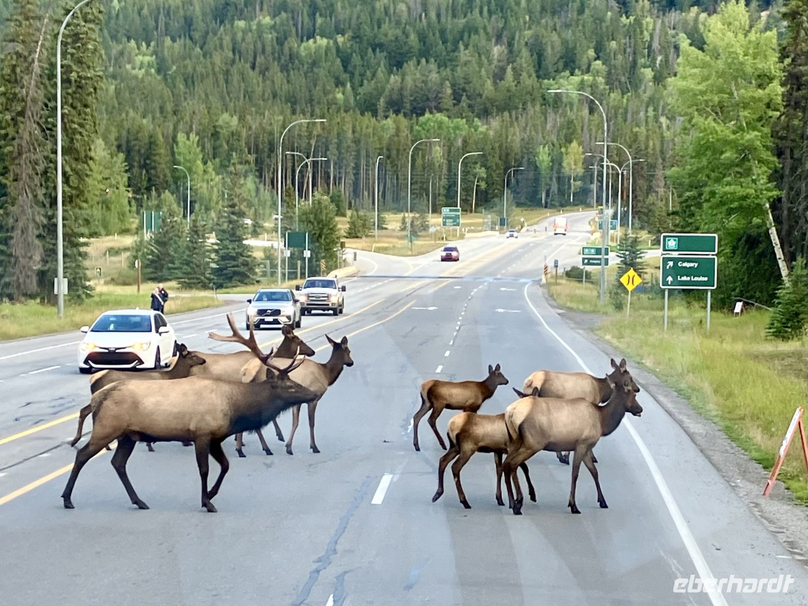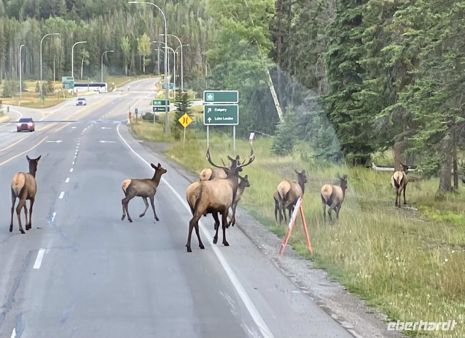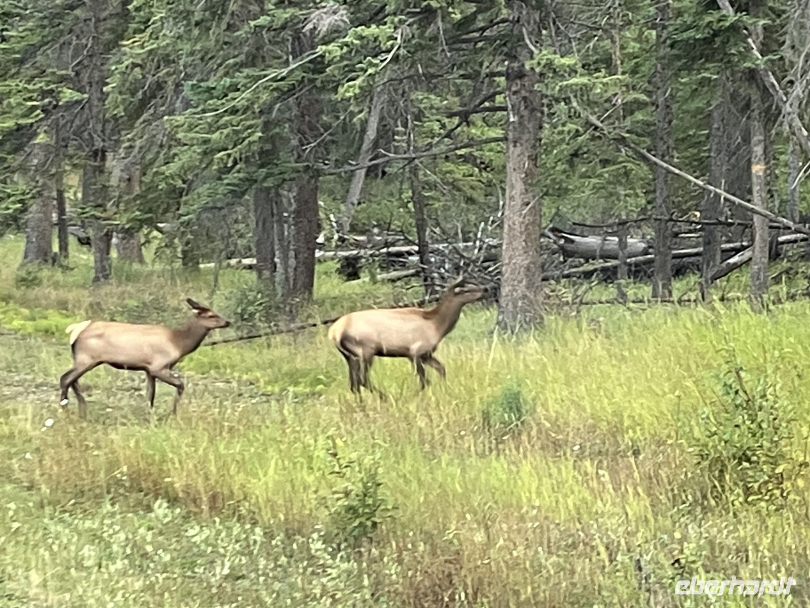 Heute geht es eine 1/2 Stunde frueher als gewohnt los. Also treffen wir uns alle um 7 beim ueppigen Fruehstuecksbuffet denn wir wollen um 8 Uhr bereits abfahren. Nur gut dass die Koffer am Vorabend bereits gepackt wurden, denn nach 3 Tagen, haben sich einige Kleider, Schuhe, Sonnenbrillen und so im ganzen Zimmer verteilt und teilweise sogar versteckt ! Gleich bei der Ausfahrt von Banff werden wir ueberrascht. Eine ganze Herde Wapiti ueberqueren die Strasse vor uns. Erst ein paar Kuehe mit ihren Kids dann ein paar junge Damen die von dem riesen Wapiti Hirsch ueber die Strasse getrieben werden. Wir koennen es kaum fassen, so ein Glueck, es sind insgesamt etwa 22 Tiere die da alle vor unserer Nase ueber die Strasse spazieren. Schaut Euch die Fotos an, es ist wunderschoen. Ach ja, das Wetter, es ist so mittelpraechtig da noch Nebel im Tal liegt. Es wird uns aber versprochen, dass sich der Nebel nach Lake Louise aufloesen soll. Ein kurzes Stuendchen spaeter sind wir in Lake Louise und fahren auf die beruehmte Gletscher Parkstrasse…..und es ist noch immer neblig. Aber ploetzlich erreichen wir die 1600 Meter ueber Meer Grenze und tatsaechlich, beim Bow Gletscher reisst es auf.
