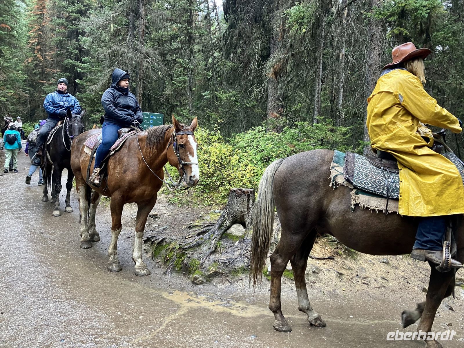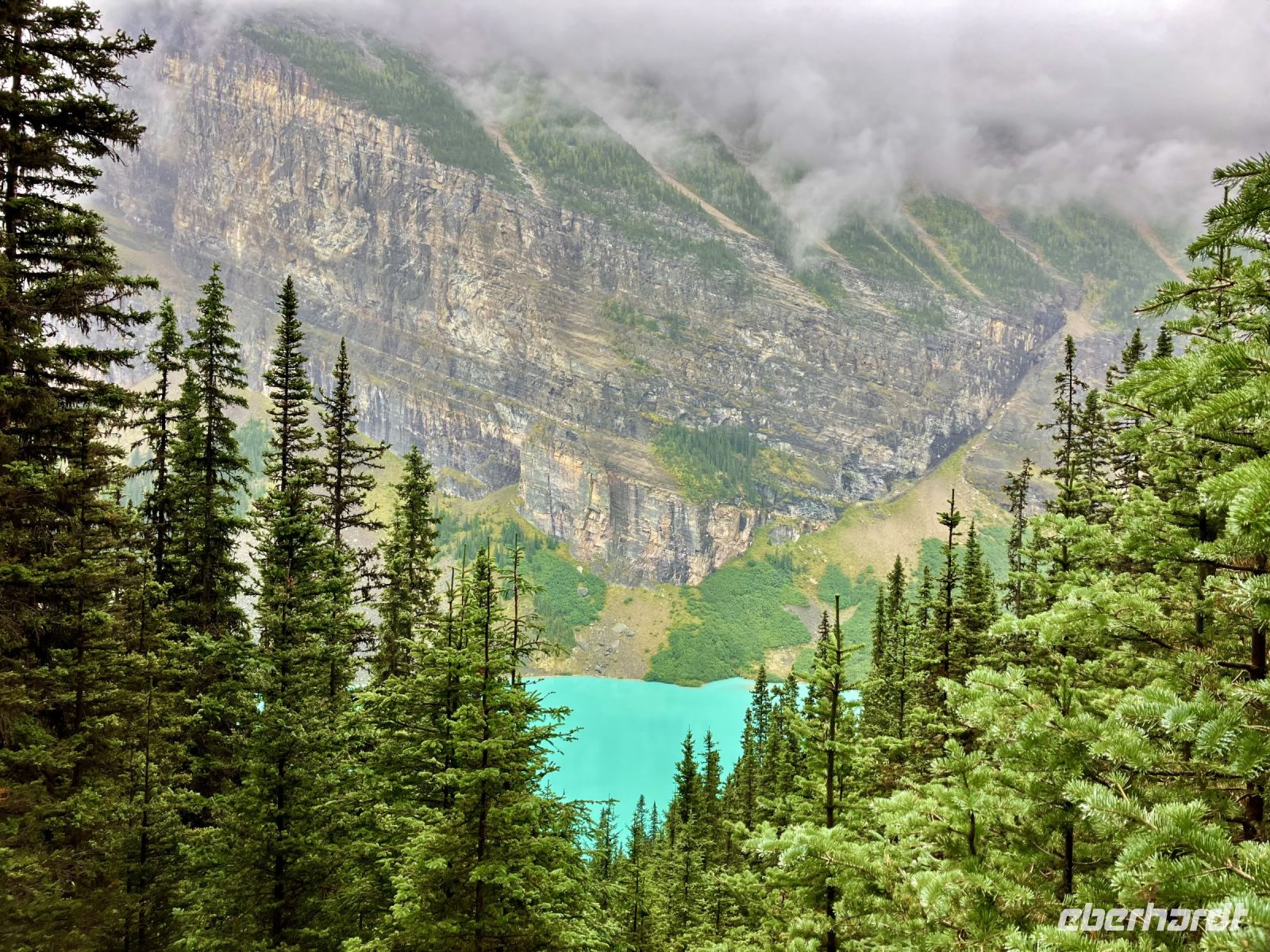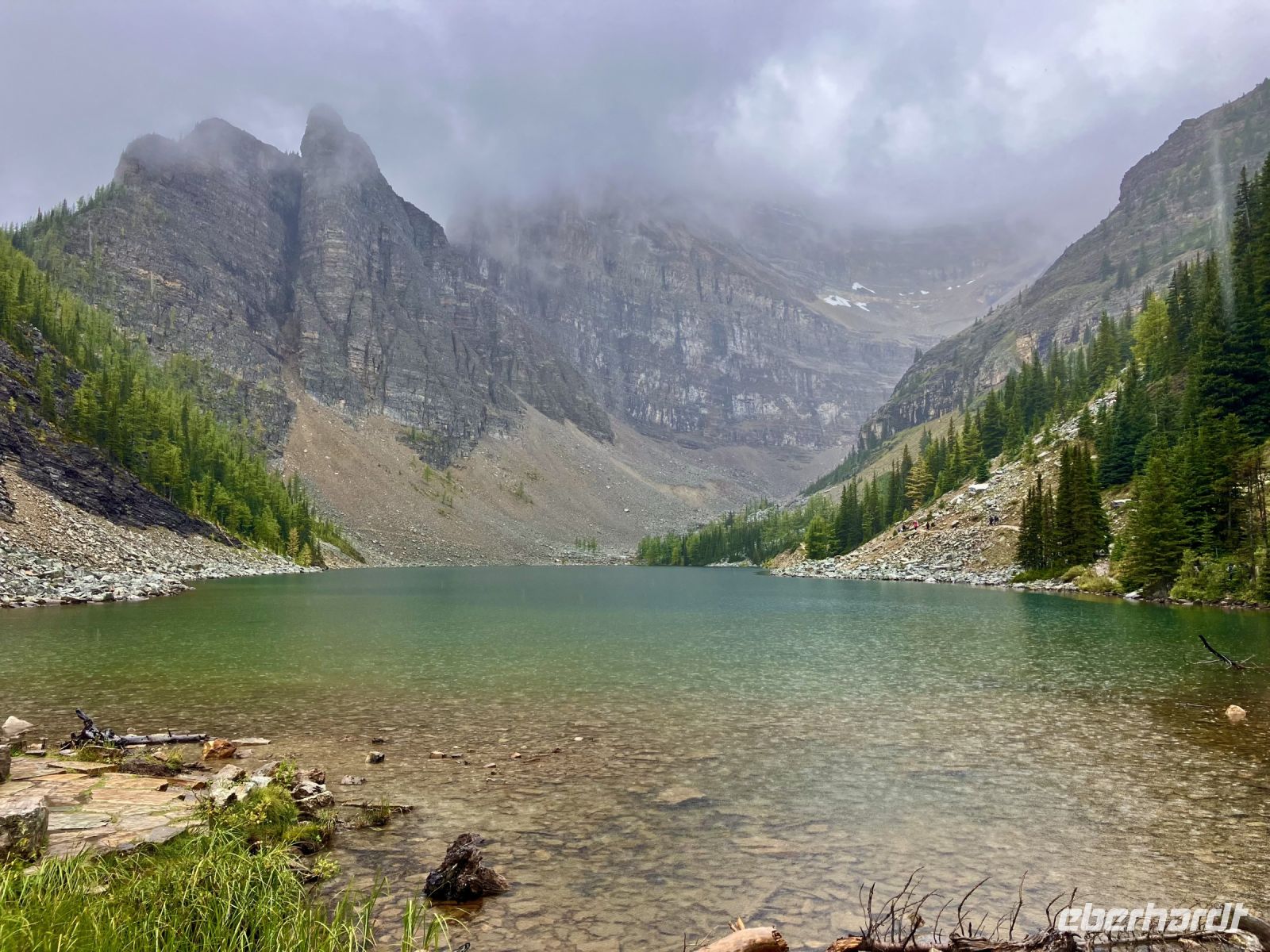 Im Wolkenschein doch gut gelaunt, geht es gleich zum schoenen Fruehstuecksbuffet. Chris faehrt uns nun auf der Hwy no 1 nach Lake Louise. Dort angekommen nieselt es ganz leicht also besichtigen wir schon einmal das maechtige Luxushotel Chateau Lake Louise von aussen und knipsen viele feuchte Fotos. Jetzt gehts auf die Wanderung zum Teehaus bei Agnes Lake. Die Hearte dieser Wanderung erkennt man an den verschwitzten T-Shirts unter der Regenbekleidung. Gleich duerfen auch die eleganten Regencapes der Rucksaecke aus den jeweiligen Taschen rausgezogen werden, sie breiten sich nun farbenfroh ueber die Rucksaecke. Es geht im Nieselregen ganz schoen steil hinauf bis zu Mirror Lake, da machen wir auch Verschnauf-Pause. Nun ist es nicht mehr weit zu Agnes Lake bloss noch 20 Minuten, Treppen inklusive ! Es ist wahrlich eine wunderbare Wanderung mit einer gebuehrenden Belohnung fuer die Strapazen. Die Sicht auf den schimmernde See inmitten hochragender Berge ist heute sehr feucht. Hier am Seeufer wollen wir uns auch setzen und das Mitgebrachte essen. Aber es regnet noch immer, also verstecken wir uns unter Baeume und knabbern halb im stehen halb auf Aesten und Baumstaemmen sitzend etwas von dem Picknick. Den Rest wollen wir dann gemuetlich im Bus verzehren. Die Whisky Jacks und der schoene Blue Jay, beobachten uns staendig und erhoffen sich ein Kruemel. Bald wandern wir mutig ueber Stock und Stein wieder runter zu unserem Bus. Nun gehts mit Chris weiter nach Lake Moraine. Dieser See ist so beruehmt und atemberaubend, dass die alte 20 Dollar Note dieses Motiv aufgedruckt hatte. Die Wolken reissen ploetzlich auf, die Sonne erscheint und wir haben das unsagbare Glueck diesen herrlich schoenen See und seine 10 Bergspitzen in voller Pracht zu sehen. Einfach super dieses tuerkisblau des Sees. Solche Farben kann man kaum beschreiben. Sehen um zu glauben. Noch ein Kaffe und los geht es wieder zurueck nach Banff.
