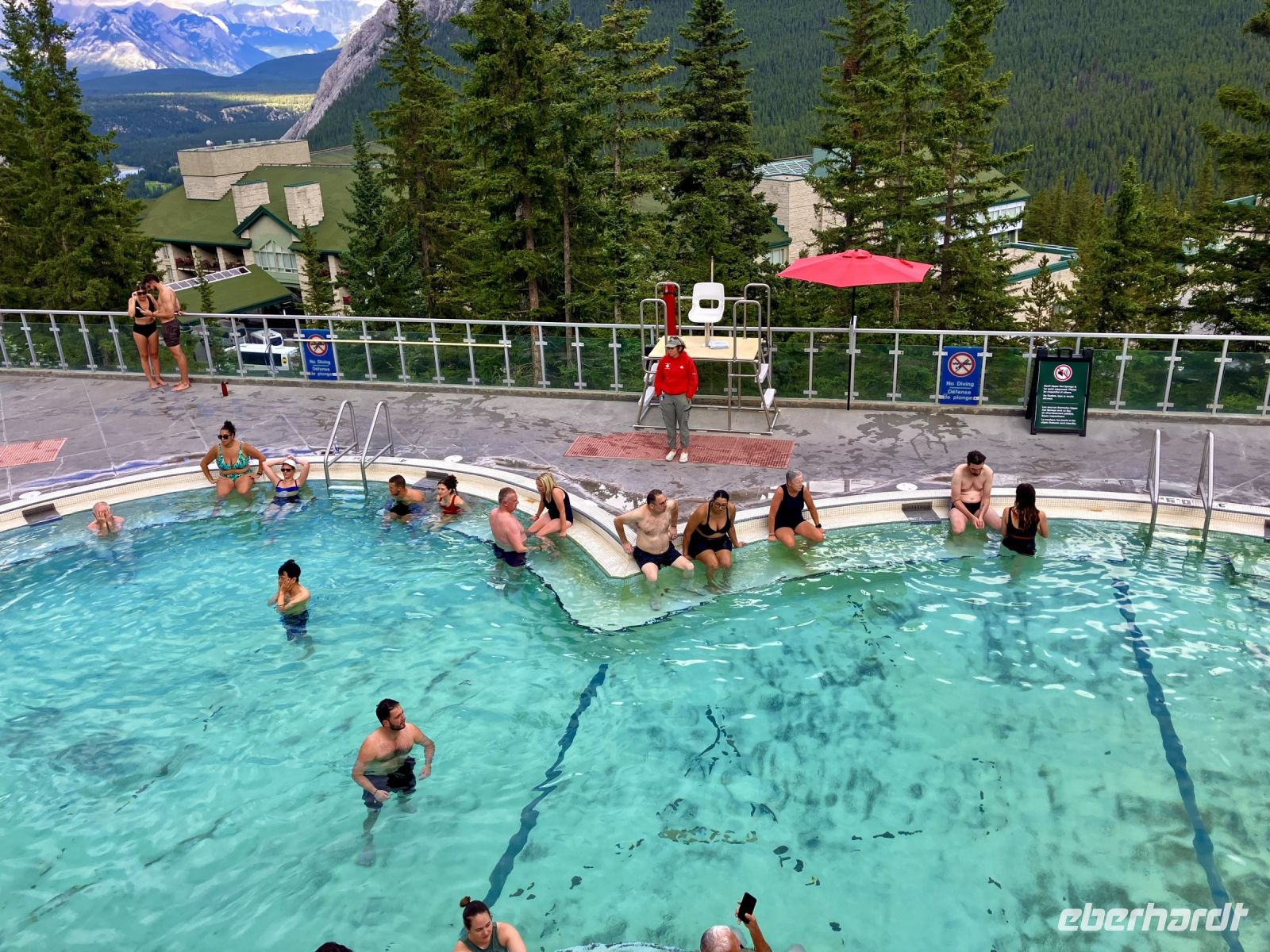 Die Busfahrt zurueck nach Banff beinhaltet daher eine kleine Siesta. In Banff besuchen wir noch die Hoodoos also die Steinformationen und dann noch die tolle Terrasse mit Blick auf das beruehmte Banff Spring Hotel, ehe es weitergeht zu den Banff Hot Springs. Das ist genau das Richtige fuer unsere armen und mueden Muskeln und Glieder. Nach 30 Minuten sind wir gar-gekocht in dem 39 Grad warmen Schwefelwasser. Chris steht auch wieder bereit und faehrt uns nun ins Hotel zurueck. Unser Abendessen ist heute in einem nahe gelegenen Restaurant. Auch das ist gelungen und das Rindsfilet ist sehr lecker, wie das Bierchen dazu auch. Jetzt aber nichts wie ab in unsere Zimmer, sonst kommt der Elisabeth noch was in den Sinn. Wir schlafen wie die Herrgoettchen in den grossen Zimmer.