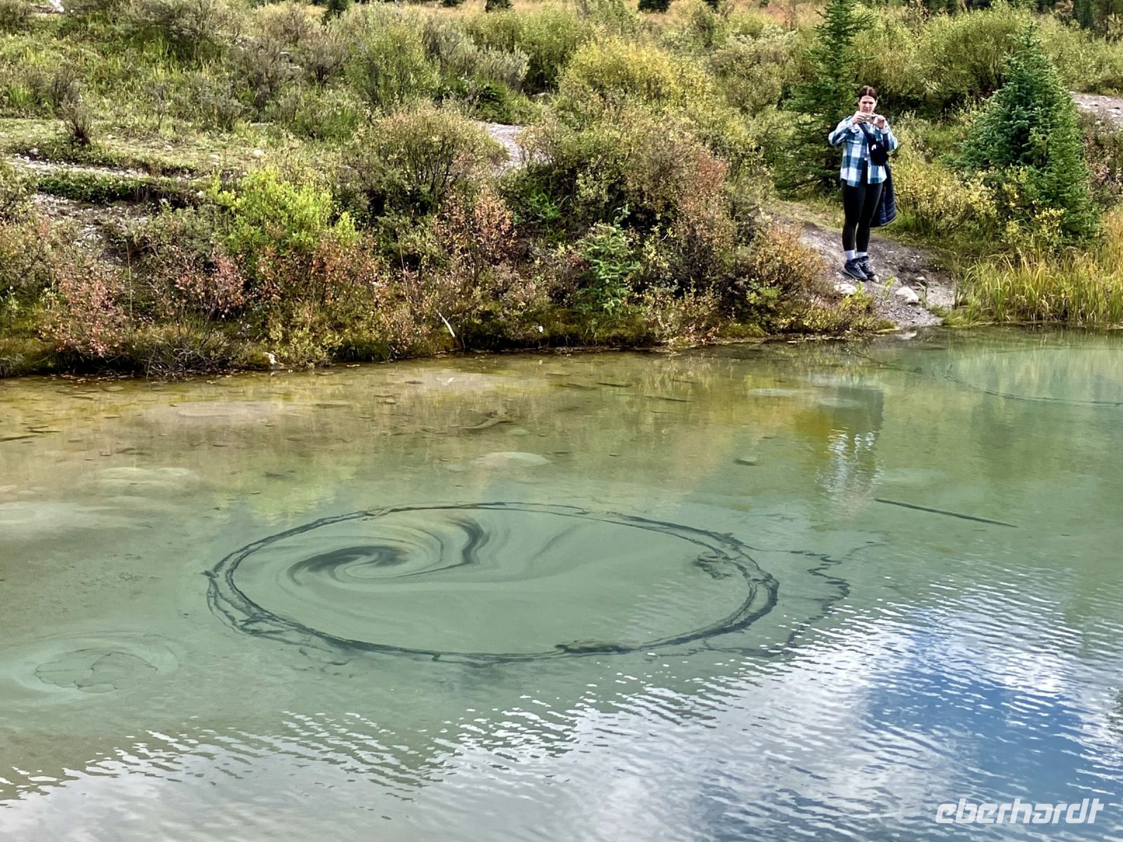 In Johnston Canyon angekommen, gehts nun los. Wir wandern bis ganz hinauf zu den Ink Pots. Das sind insgesamt gute 14 Kilometer mit stetigem leichten An-und Abstieg. 400 Meter Hoehendifferenz. Der erste Kilometer ist geteert und zieht deshalb auch viele Spaziergaenger an. Wir ueben uns im Slalomlauf und kurven geschickt um die Leute, Kinder und Hunde. Schoene Wasserfaelle begleiten diese Schlucht. Nach dem 3. Wasserfall haben wir den Weg fast ausschliesslich nur noch fuer uns alleine. Der Pfad fuehrt uns nun durch einen lichten Wald und steigt staendig leicht an. Auf einmal aber wissen unsere Muskeln nicht mehr was mit ihnen geschieht denn nach gut 2 Stunden bergan, gehts auf einmal bergab. Oh nein, wir verlieren an Hoehe, da muessen wir uns danach wieder hinauf bemuehen ! Aber es ist nicht mehr weit, da sind sie schon, die Tintenfaesser in diesem Hochtal. Es sind kleine Seen die unterirdisch von Gletscherwasser gespiesen werden. Da der Boden aus Sand und Kalk besteht sieht man grosse und kleine Ringe in den Seen wo das Wasser hinaufgestossen wird. Bei manchen Seelein sprudelt es regelrecht. Nun ist Zeit zum ausspannen, Fotos knipsen und picknicken. Es ist ploetzlich kaelter geworden und so ziehen wir wieder alle Schichten ueber das T-Shirt an. Mit einem kanadischen Whisky und Ahornsirup-Kekse stossen wir nun auf eine wunderbare Reise an. Vorgestellt haben wir uns auch, wir sind eine super Gruppe. Spaeter wandern wir schwatzend, kichernd und diskutierend wieder gute 2 Stunden hinunter zu unserem Bus. Wir waren geschlagene 5 Stunden unterwegs.