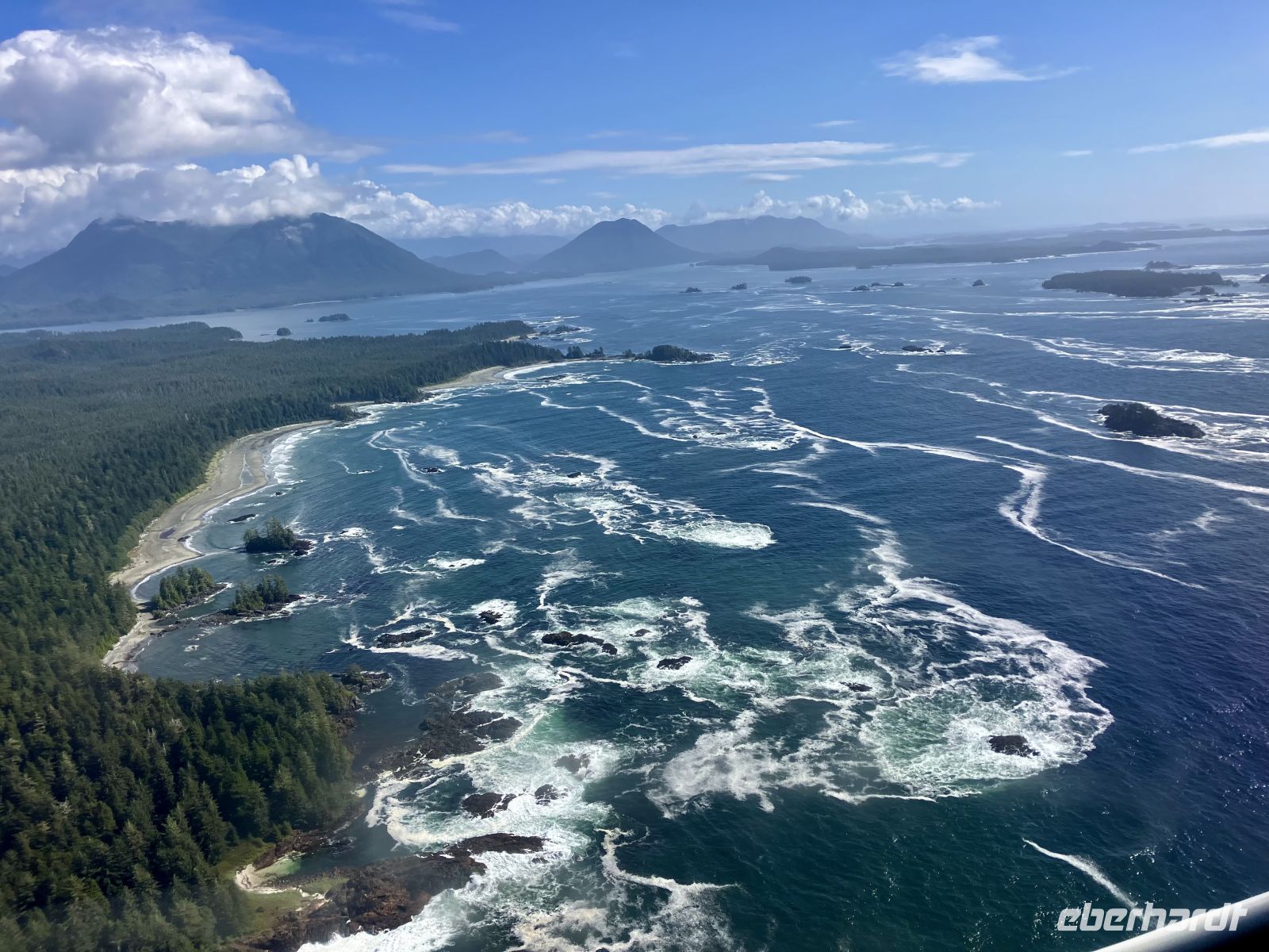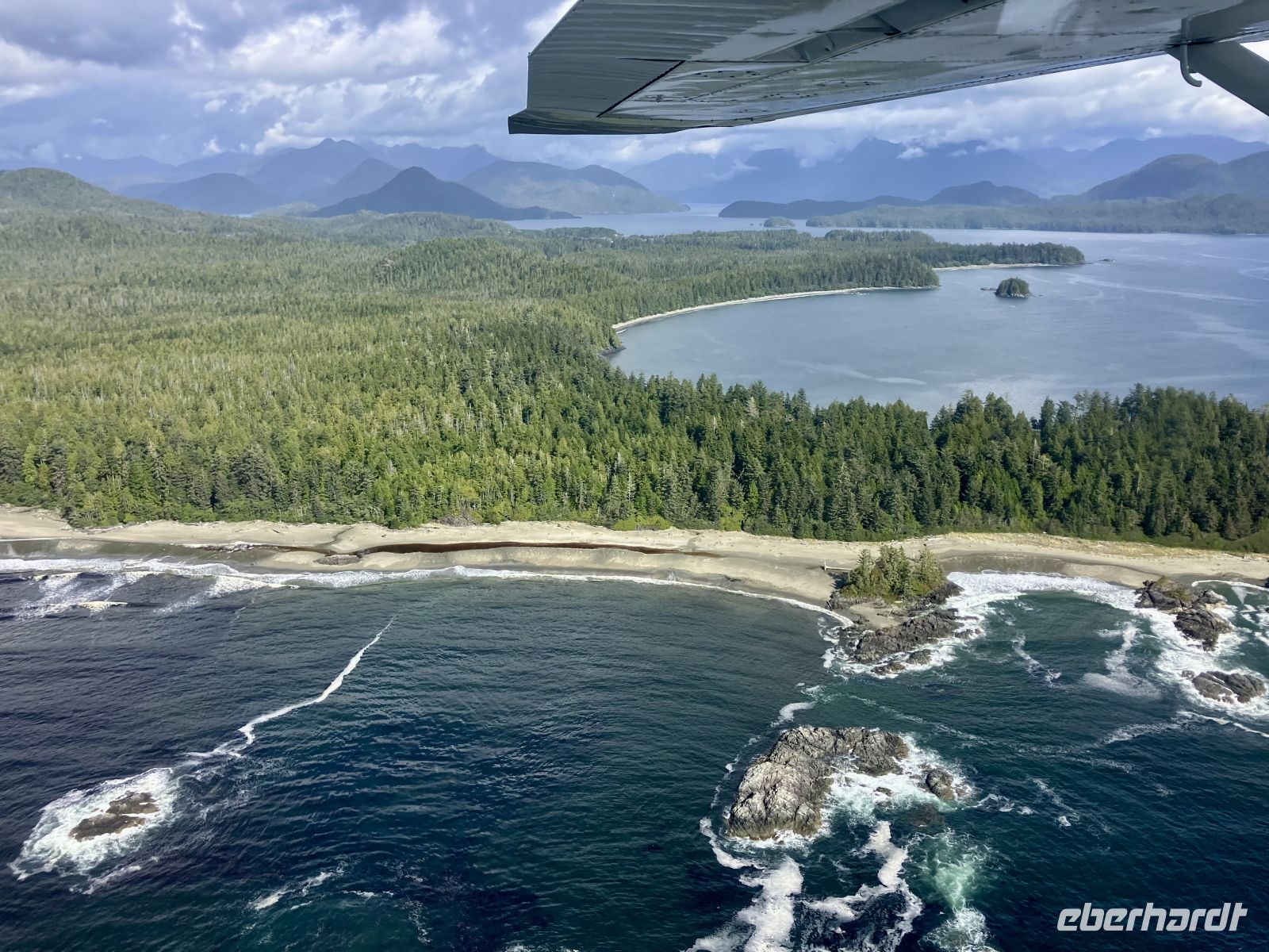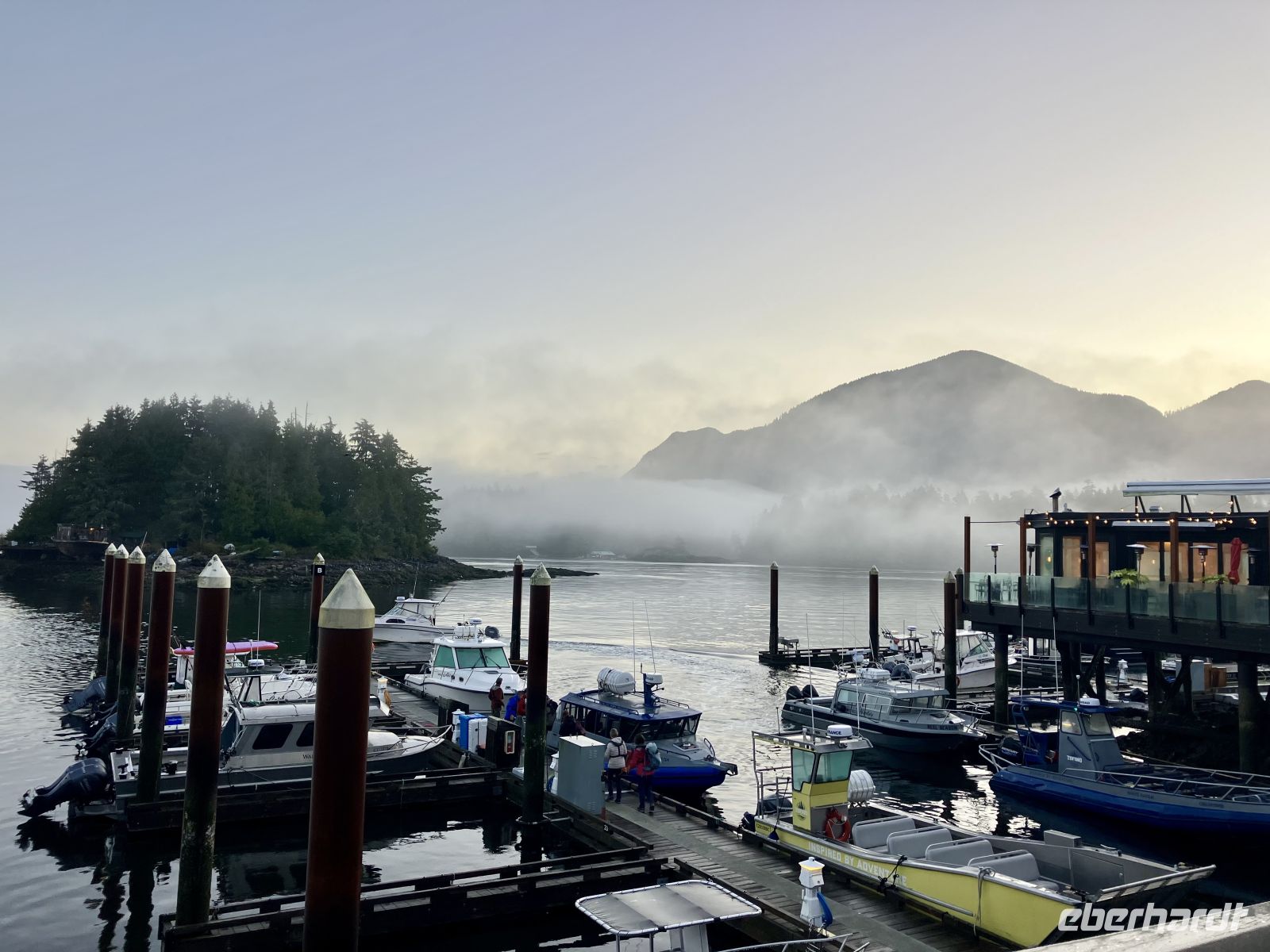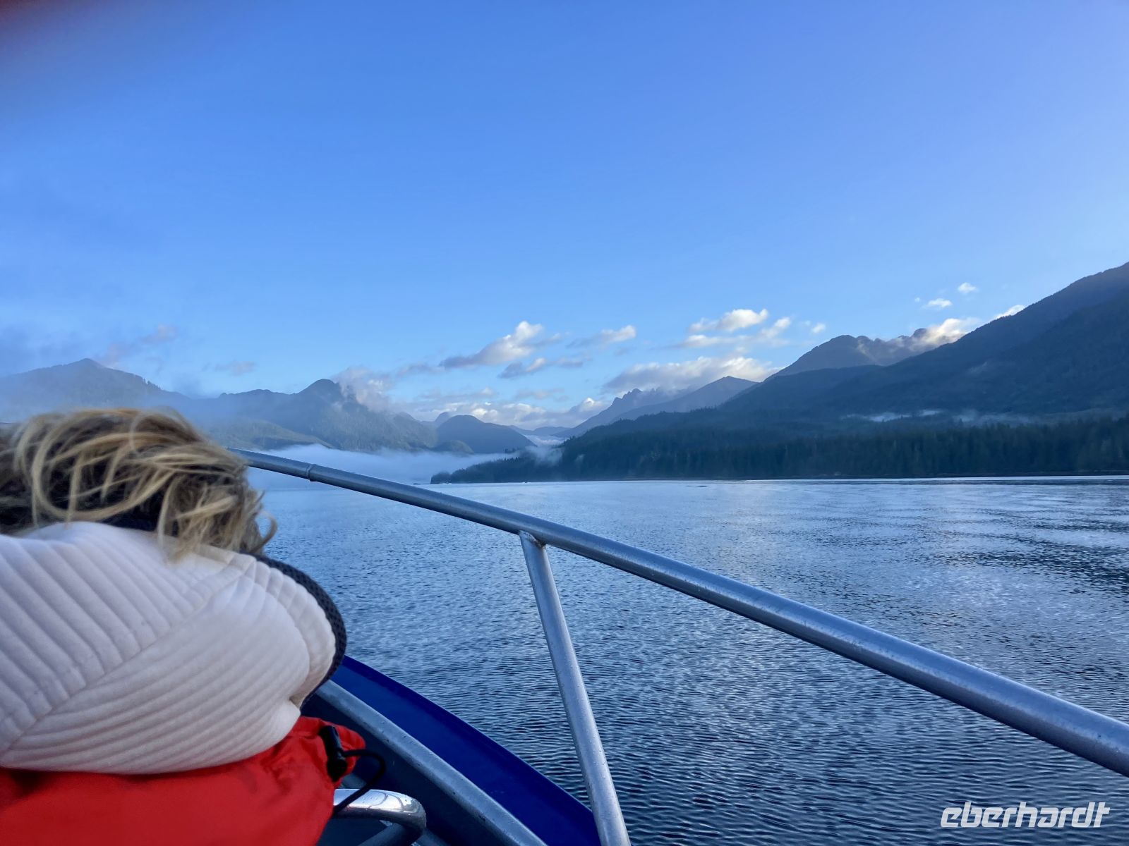 Es ist unser Westkuesten-Tag, der Regenwald-Tag, und die Sonne ist wieder da. Alle Geaste haben sich fuer die Baerenbeobachtung eingeschrieben. Also haben wir heute eine fruehe Tagwacht. Um 6:15 koennen wir die Schachteln mit dem Fruehstueck bei der Rezeption abholen, uns einen Kaffe aus der Maschine lassen (oder im Zimmer brauen) und um 7:00 faengt das erste Abenteuer an. Alles ist perfekt in Tofino, das Meer vor dem Hotel ist spiegelglatt, es weht ein zartes kleines Lueftchen, die Temperatur ist lau, und die zwei Boote warten bereits auf uns und wir sind bereit. Rasant saussen wir zwischen vielen Inseln durch, mal rechts, mal links, mal mitten im Morgennebel mal bei guter Sicht. Ploetzlich geht die Sonne auf, der Nebel laesst alles in die pure Romatik verfallen. Baeren, sehen wir auch, einen etwas weiter entfernt auf einem Steinchenstrand. Er schaut was es da heute zum Fruehstueck gibt und dreht deshalb groessere Steine um, da drunter, da sind sie, kleine Krebschen, Muscheln, Schneckchen, Mmmm. Wir sehen aber auch riesen Seehunde wie sie sich auf den Felsen raekeln und sich sonnen. Aber die Otter, die sind faszinierend, auf dem Ruecken schwimmend mit Koepfchen hoch und den Vorder- und Hinterbeinchen in die Luft streckend ruhen sie sich hier einfach aus und schauen zu, wie wir mit unserem Zodiak ganz nahe zu ihnen kommen. Wir sehen nicht bloss einer oder zwei Otter, nein gleich eine ganze Meute, etwa 20 an der Zahl ! Bitte schaut in die Bildergalerie. Nach diesem wunderbaren Ausflug auf dem Wasser geht es nun zum Wasserflugzeug Landeplatz. Da sind wir bereits gebucht. Es gibt wohl nichts schoeneres, als ueber diese wunderbare, wilde Meer- und Insellandschaft des Pacific Rim Nationalparks zu fliegen. Bitte schaut in die Bildergalerie. Sehen um zu glauben. Es ist fabelhaft besonders wenn man denn auch noch einen Wal von oben sieht wie er auf- und abtaucht. Nach diesem schoenen Erlebnis wandern wir durch Tofino durch und auf die andere Seite der Halbinsel zu Tonquin Beach. Etwas weiter an einem wilden kleinen Strand halten wir auch um nun endlich die beiden Champagner aufzuknallen. Heute hat ein Mitreisender seinen Geburtstag und das wollen wir nun hier gebuehrend feiern. Zum Geburtstag also Bären, Wale, Bootsfahrt, Wasserflugzeug, Wanderung und eine kleine Party ! Das Geburtstagskind ist ganz schön gerührt. Wir andern wieder zurück durch diese legendaeren Riesenbaeume des Pacific Rim Nationalpark. Auf einem schönen Pfad gehend, geniessen wir die Ueberschwenglichkeit und Vielfalt dieses Waldes. Es ist wirklich ein Urwald auf 3 Etagen und wir bewegen uns mal im Unterholz und mal im Mittelbereich. Die Krone des Waldes ist kaum sichtbar...so hoch oben... 80 Meter hoch werden diese Riesen. Der hoechste soll ueber 100 Meter hoch sein. Heute sind diese Waelder am schoensten, alles glitzert, die Farne leuchten und die Troepfchen des Taus trauen sich aus dem Moos und aus den Luftpflanzen, auch bei einem schoenen, sonnigen Tag wie heute regnet es daher immer ein bisschen in diesem dichten Regenwald. Baeren soll es hier viele geben, doch wir sind eine muntere Gruppe und somit sind alle Baeren gewarnt und verstecken sich im Dickicht. Ihre Jungen haben sie bereits auf die Baeume gejagt. Wir gehen staunend weiter knipsen viele Bilder bleiben immer wieder stehen, reden und lachen viel. Ploetzlich sind wir wieder bei der Strasse wo Tracey auf uns wartet um uns zurück in unser Hotel zu fahren. Jetzt haben wir Zeit zum genießen, baden, essen und plaudern bis die Augenlider von innen beobachtet werden können.