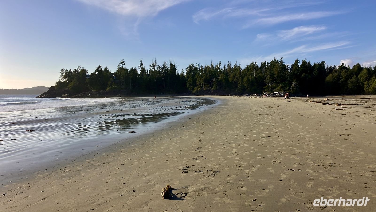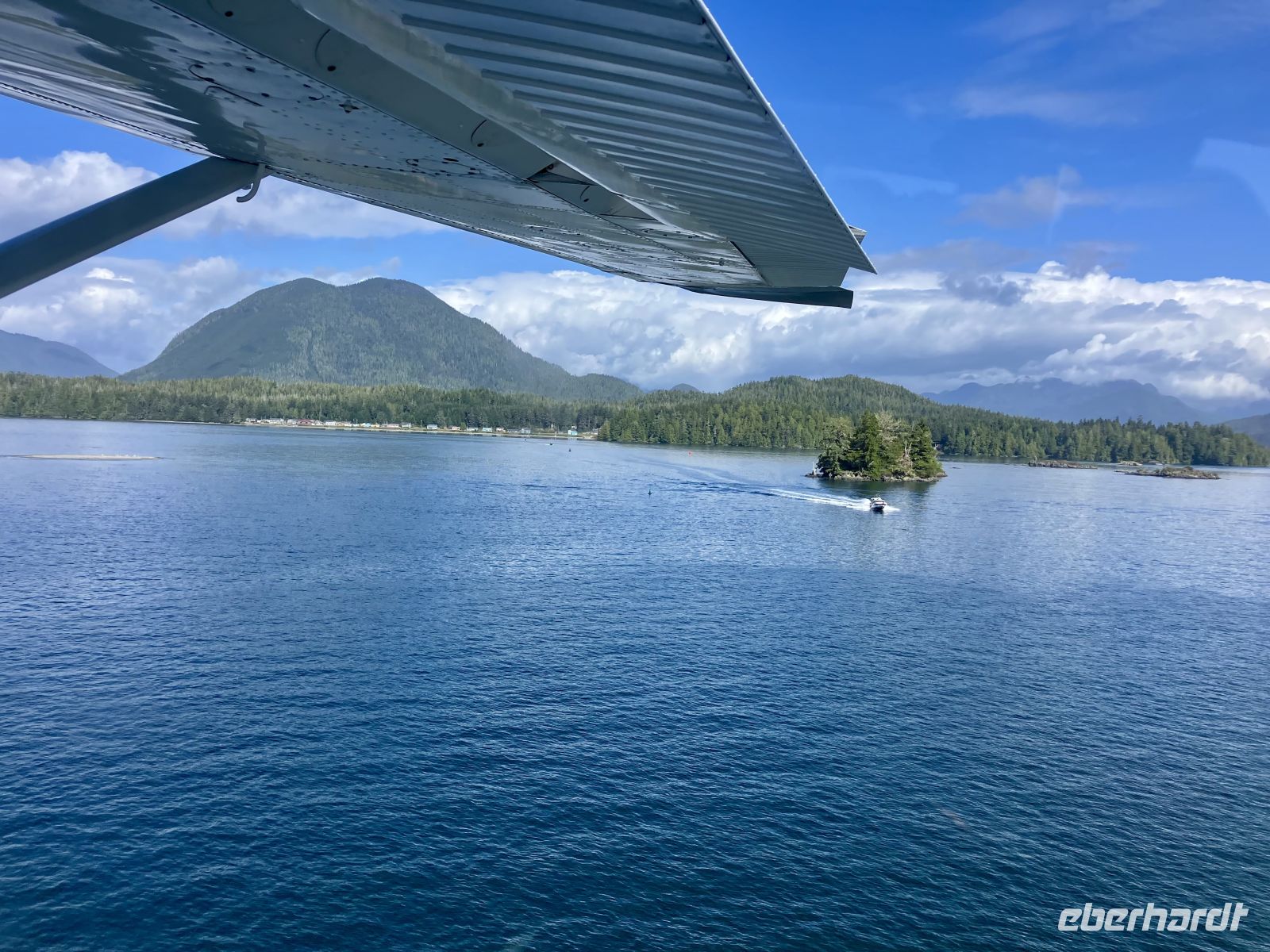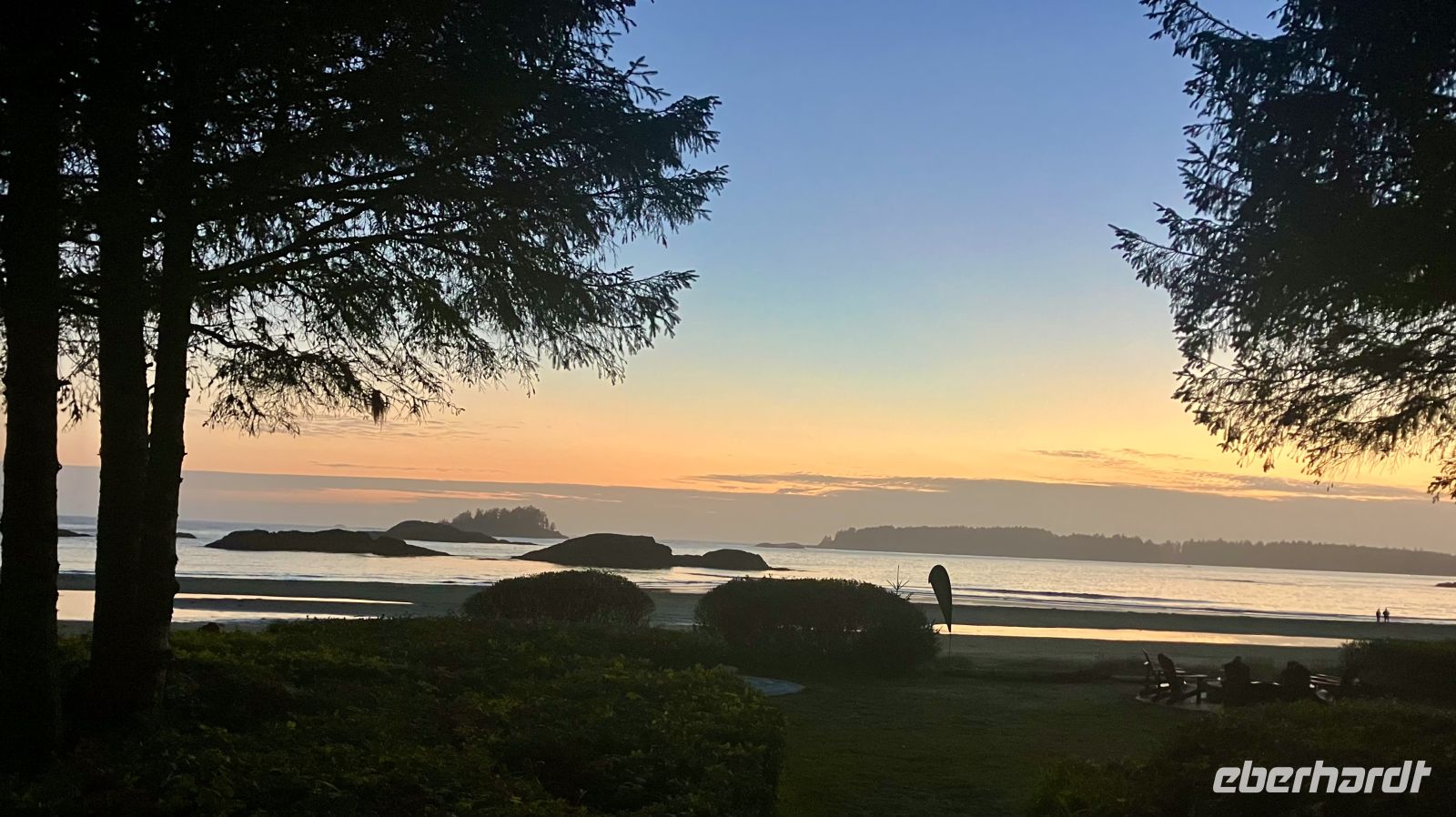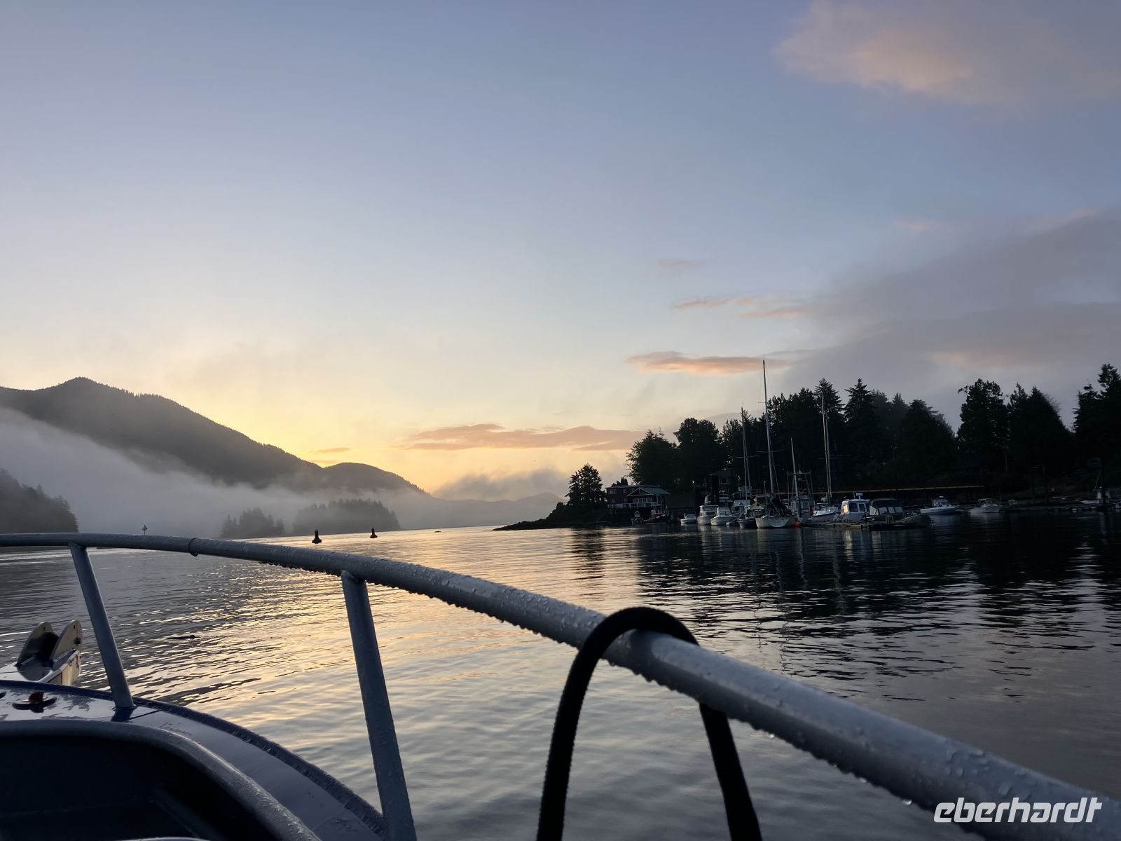 Es ist unser Westkuesten-Tag, der Regenwald-Tag, und die Sonne ist wieder da. Alle Geaste haben sich fuer die Baerenbeobachtung eingeschrieben. Also haben wir heute eine fruehe Tagwacht. Um 6:15 koennen wir die Schachteln mit dem Fruehstueck bei der Rezeption abholen, uns einen Kaffe aus der Maschine lassen (oder im Zimmer brauen) und um 7:00 faengt das erste Abenteuer an. Alles ist perfekt in Tofino, das Meer vor dem Hotel ist spiegelglatt, es weht ein zartes kleines Lueftchen, die Temperatur ist lau, und die zwei Boote warten bereits auf uns und wir sind bereit. Rasant saussen wir zwischen vielen Inseln durch, mal rechts, mal links, mal mitten im Morgennebel mal bei guter Sicht. Ploetzlich geht die Sonne auf, der Nebel laesst alles in die pure Romatik verfallen. Baeren, sehen wir auch, einen etwas weiter entfernt auf einem Steinchenstrand. Er schaut was es da heute zum Fruehstueck gibt und dreht deshalb groessere Steine um, da drunter, da sind sie, kleine Krebschen, Muscheln, Schneckchen, Mmmm. Wir sehen aber auch riesen Seehunde wie sie sich auf den Felsen raekeln und sich sonnen. Aber die Otter, die sind faszinierend, auf dem Ruecken schwimmend mit Koepfchen hoch und den Vorder- und Hinterbeinchen in die Luft streckend ruhen sie sich hier einfach aus und schauen zu, wie wir mit unserem Zodiak ganz nahe zu ihnen kommen. Wir sehen nicht bloss einer oder zwei Otter, nein gleich eine ganze Meute, etwa 20 an der Zahl ! Bitte schaut in die Bildergalerie. Nach diesem wunderbaren Ausflug auf dem Wasser geht es nun zum Wasserflugzeug Landeplatz. Da sind wir bereits gebucht. Es gibt wohl nichts schoeneres, als ueber diese wunderbare, wilde Meer- und Insellandschaft des Pacific Rim Nationalparks zu fliegen. Bitte schaut in die Bildergalerie. Sehen um zu glauben. Es ist fabelhaft besonders wenn man denn auch noch einen Wal von oben sieht wie er auf- und abtaucht. Nach diesem schoenen Erlebnis wandern wir durch Tofino durch und auf die andere Seite der Halbinsel zu Tonquin Beach. Etwas weiter an einem wilden kleinen Strand halten wir auch um nun endlich die beiden Champagner aufzuknallen. Heute hat ein Mitreisender seinen Geburtstag und das wollen wir nun hier gebuehrend feiern. Zum Geburtstag also Bären, Wale, Bootsfahrt, Wasserflugzeug, Wanderung und eine kleine Party ! Das Geburtstagskind ist ganz schön gerührt. Wir andern wieder zurück durch diese legendaeren Riesenbaeume des Pacific Rim Nationalpark. Auf einem schönen Pfad gehend, geniessen wir die Ueberschwenglichkeit und Vielfalt dieses Waldes. Es ist wirklich ein Urwald auf 3 Etagen und wir bewegen uns mal im Unterholz und mal im Mittelbereich. Die Krone des Waldes ist kaum sichtbar...so hoch oben... 80 Meter hoch werden diese Riesen. Der hoechste soll ueber 100 Meter hoch sein. Heute sind diese Waelder am schoensten, alles glitzert, die Farne leuchten und die Troepfchen des Taus trauen sich aus dem Moos und aus den Luftpflanzen, auch bei einem schoenen, sonnigen Tag wie heute regnet es daher immer ein bisschen in diesem dichten Regenwald. Baeren soll es hier viele geben, doch wir sind eine muntere Gruppe und somit sind alle Baeren gewarnt und verstecken sich im Dickicht. Ihre Jungen haben sie bereits auf die Baeume gejagt. Wir gehen staunend weiter knipsen viele Bilder bleiben immer wieder stehen, reden und lachen viel. Ploetzlich sind wir wieder bei der Strasse wo Tracey auf uns wartet um uns zurück in unser Hotel zu fahren. Jetzt haben wir Zeit zum genießen, baden, essen und plaudern bis die Augenlider von innen beobachtet werden können.