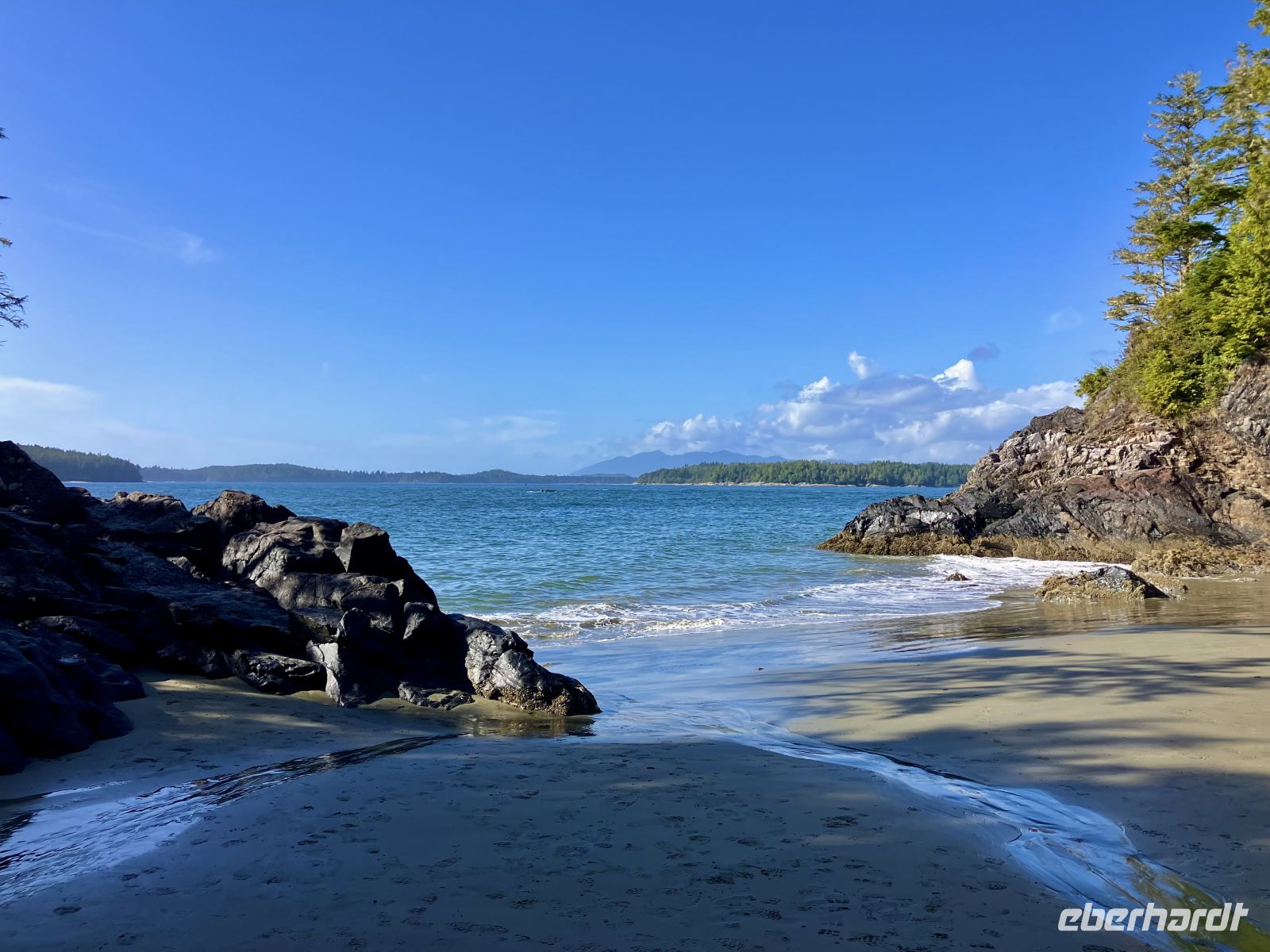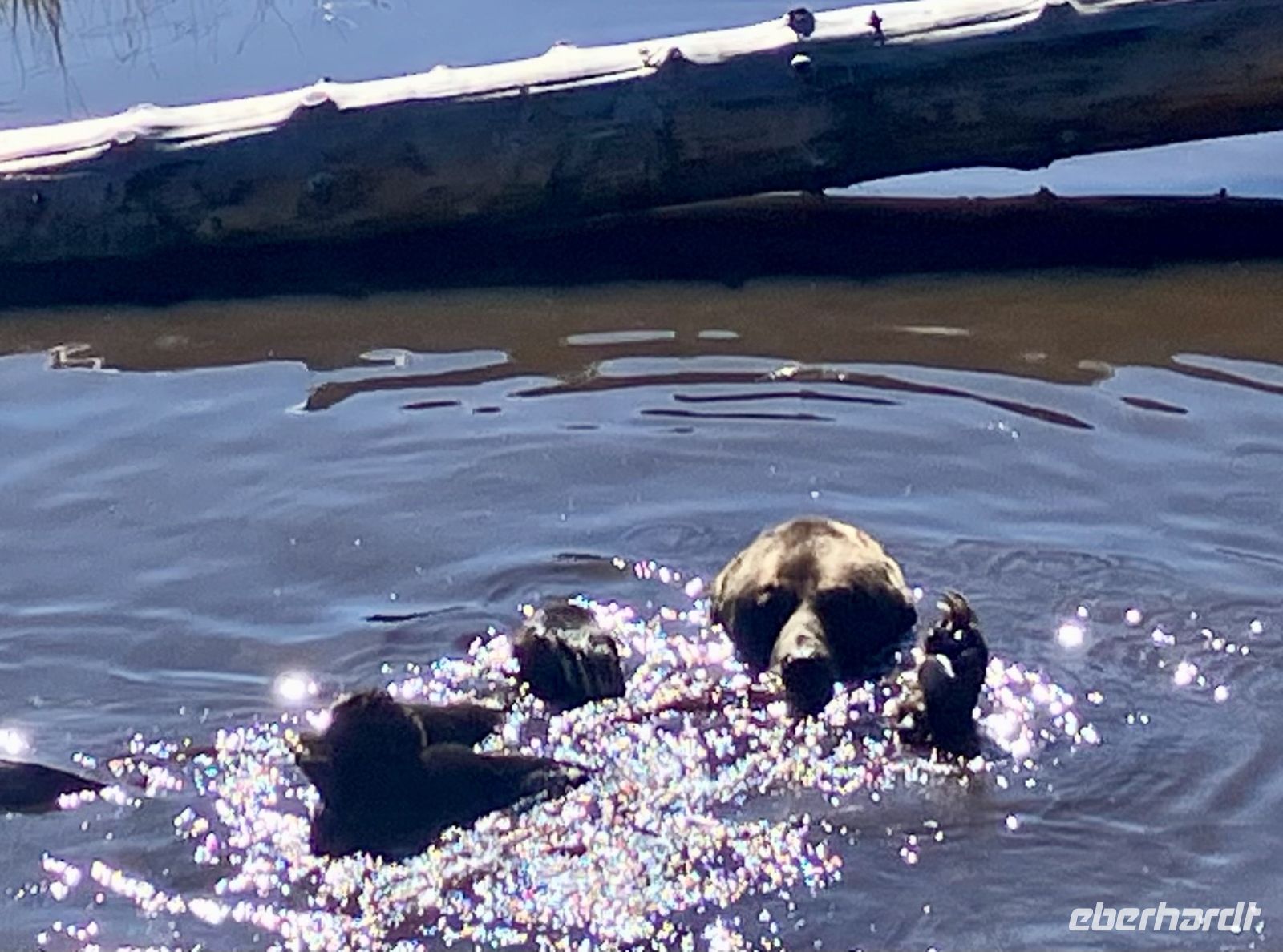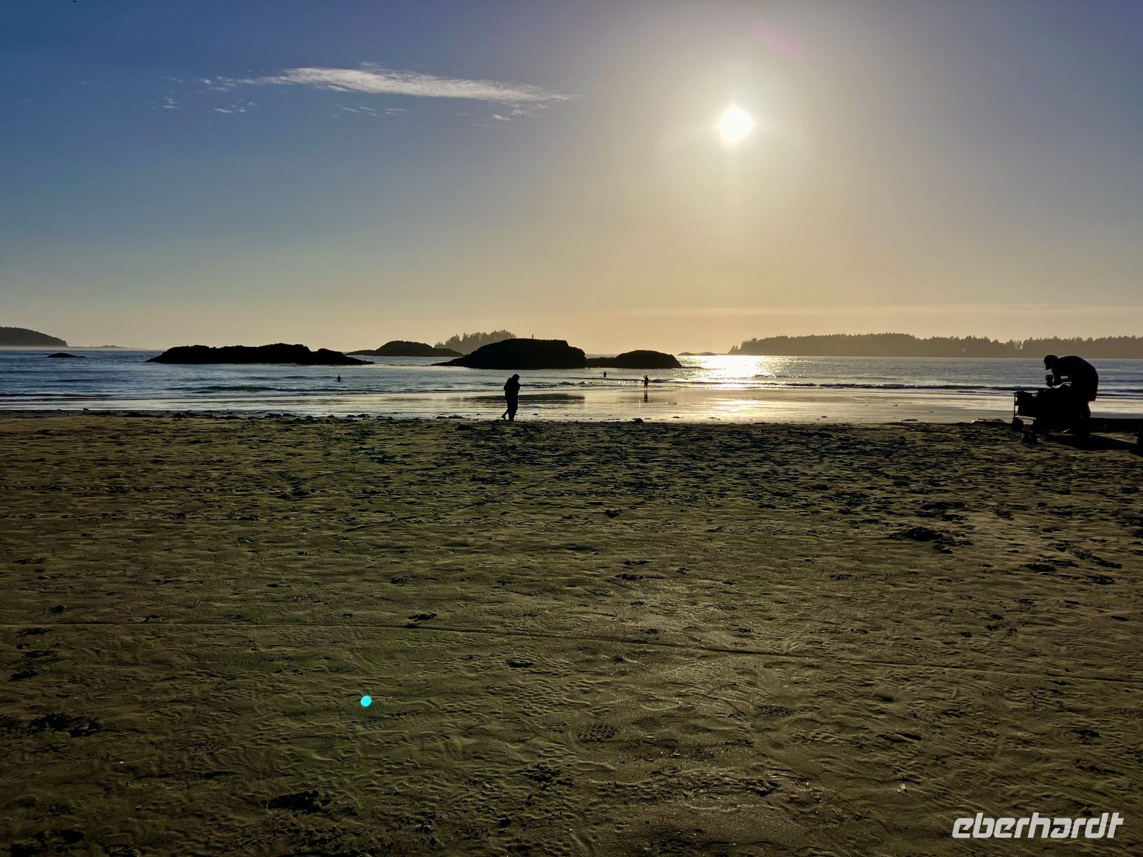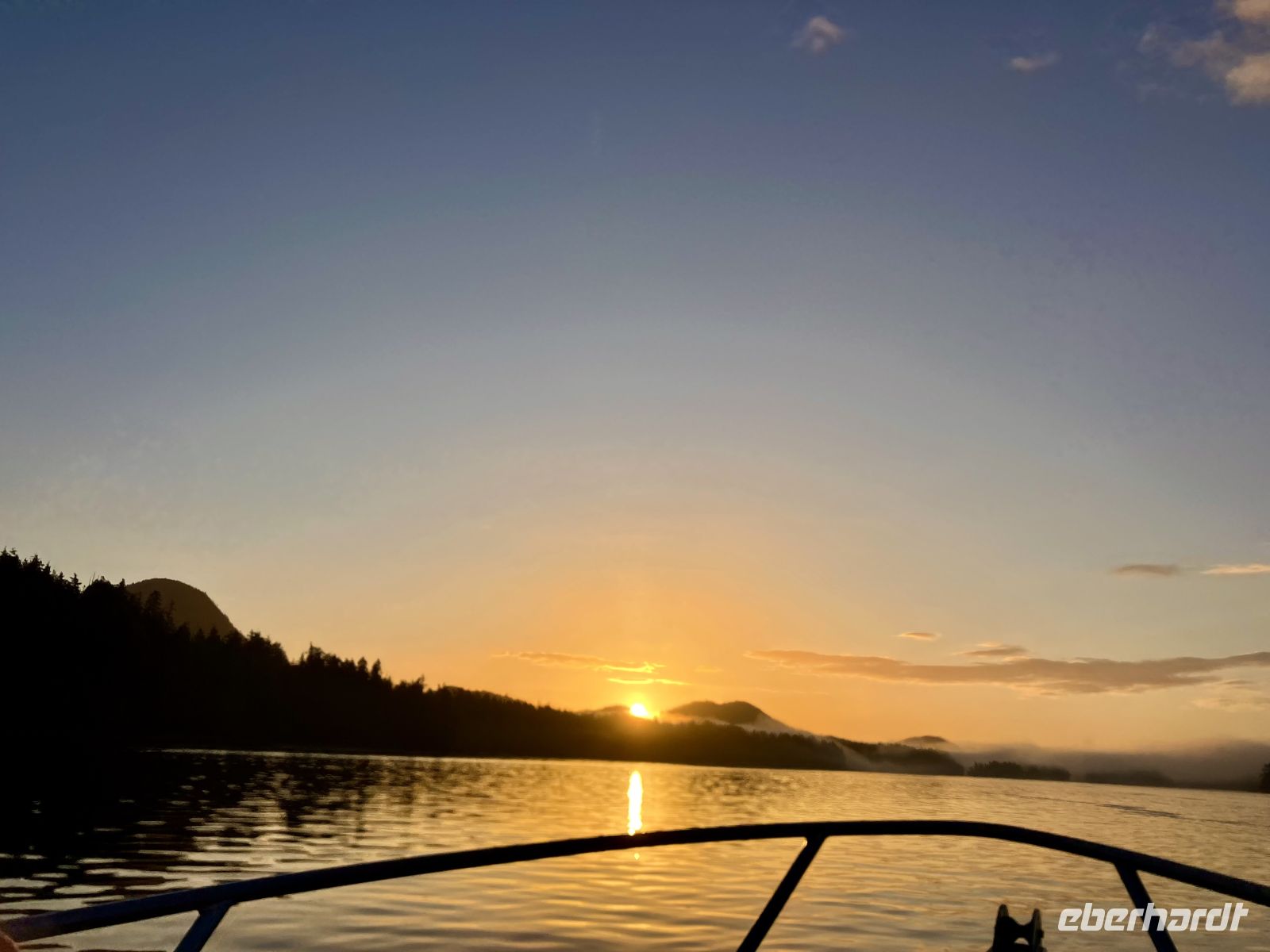 Es ist unser Westkuesten-Tag, der Regenwald-Tag, und die Sonne ist wieder da. Alle Geaste haben sich fuer die Baerenbeobachtung eingeschrieben. Also haben wir heute eine fruehe Tagwacht. Um 6:15 koennen wir die Schachteln mit dem Fruehstueck bei der Rezeption abholen, uns einen Kaffe aus der Maschine lassen (oder im Zimmer brauen) und um 7:00 faengt das erste Abenteuer an. Alles ist perfekt in Tofino, das Meer vor dem Hotel ist spiegelglatt, es weht ein zartes kleines Lueftchen, die Temperatur ist lau, und die zwei Boote warten bereits auf uns und wir sind bereit. Rasant saussen wir zwischen vielen Inseln durch, mal rechts, mal links, mal mitten im Morgennebel mal bei guter Sicht. Ploetzlich geht die Sonne auf, der Nebel laesst alles in die pure Romatik verfallen. Baeren, sehen wir auch, einen etwas weiter entfernt auf einem Steinchenstrand. Er schaut was es da heute zum Fruehstueck gibt und dreht deshalb groessere Steine um, da drunter, da sind sie, kleine Krebschen, Muscheln, Schneckchen, Mmmm. Wir sehen aber auch riesen Seehunde wie sie sich auf den Felsen raekeln und sich sonnen. Aber die Otter, die sind faszinierend, auf dem Ruecken schwimmend mit Koepfchen hoch und den Vorder- und Hinterbeinchen in die Luft streckend ruhen sie sich hier einfach aus und schauen zu, wie wir mit unserem Zodiak ganz nahe zu ihnen kommen. Wir sehen nicht bloss einer oder zwei Otter, nein gleich eine ganze Meute, etwa 20 an der Zahl ! Bitte schaut in die Bildergalerie. Nach diesem wunderbaren Ausflug auf dem Wasser geht es nun zum Wasserflugzeug Landeplatz. Da sind wir bereits gebucht. Es gibt wohl nichts schoeneres, als ueber diese wunderbare, wilde Meer- und Insellandschaft des Pacific Rim Nationalparks zu fliegen. Bitte schaut in die Bildergalerie. Sehen um zu glauben. Es ist fabelhaft besonders wenn man denn auch noch einen Wal von oben sieht wie er auf- und abtaucht. Nach diesem schoenen Erlebnis wandern wir durch Tofino durch und auf die andere Seite der Halbinsel zu Tonquin Beach. Etwas weiter an einem wilden kleinen Strand halten wir auch um nun endlich die beiden Champagner aufzuknallen. Heute hat ein Mitreisender seinen Geburtstag und das wollen wir nun hier gebuehrend feiern. Zum Geburtstag also Bären, Wale, Bootsfahrt, Wasserflugzeug, Wanderung und eine kleine Party ! Das Geburtstagskind ist ganz schön gerührt. Wir andern wieder zurück durch diese legendaeren Riesenbaeume des Pacific Rim Nationalpark. Auf einem schönen Pfad gehend, geniessen wir die Ueberschwenglichkeit und Vielfalt dieses Waldes. Es ist wirklich ein Urwald auf 3 Etagen und wir bewegen uns mal im Unterholz und mal im Mittelbereich. Die Krone des Waldes ist kaum sichtbar...so hoch oben... 80 Meter hoch werden diese Riesen. Der hoechste soll ueber 100 Meter hoch sein. Heute sind diese Waelder am schoensten, alles glitzert, die Farne leuchten und die Troepfchen des Taus trauen sich aus dem Moos und aus den Luftpflanzen, auch bei einem schoenen, sonnigen Tag wie heute regnet es daher immer ein bisschen in diesem dichten Regenwald. Baeren soll es hier viele geben, doch wir sind eine muntere Gruppe und somit sind alle Baeren gewarnt und verstecken sich im Dickicht. Ihre Jungen haben sie bereits auf die Baeume gejagt. Wir gehen staunend weiter knipsen viele Bilder bleiben immer wieder stehen, reden und lachen viel. Ploetzlich sind wir wieder bei der Strasse wo Tracey auf uns wartet um uns zurück in unser Hotel zu fahren. Jetzt haben wir Zeit zum genießen, baden, essen und plaudern bis die Augenlider von innen beobachtet werden können.