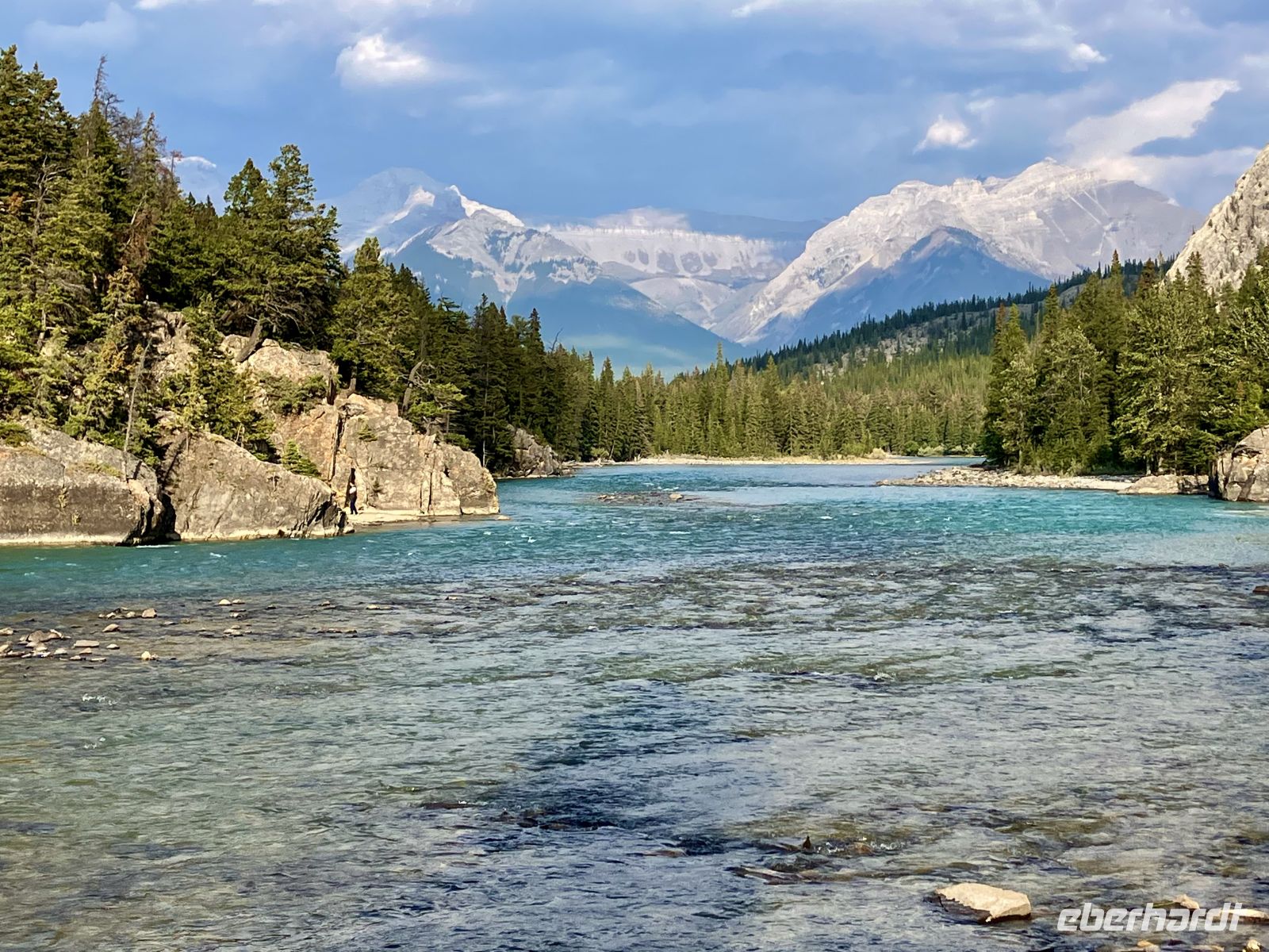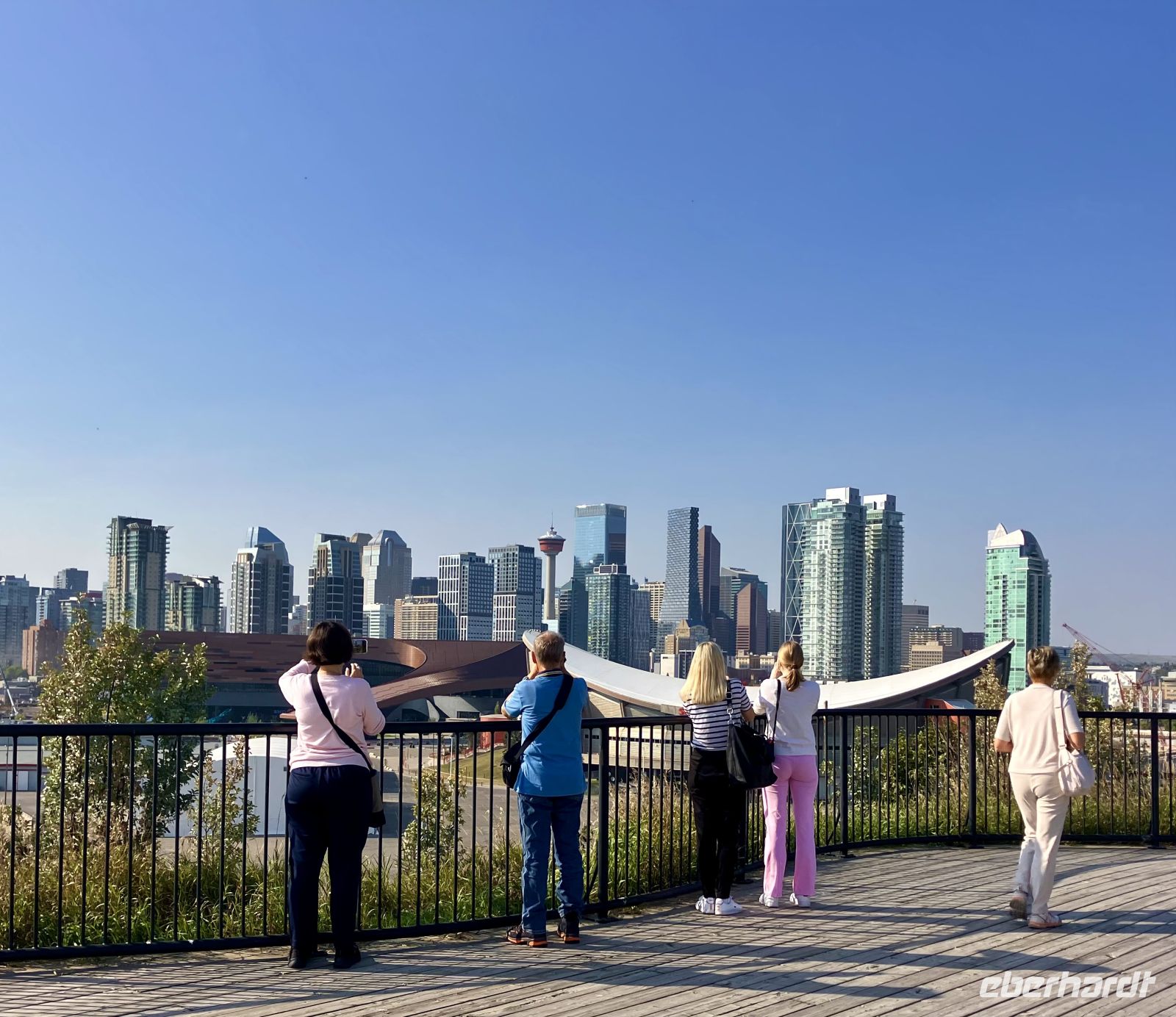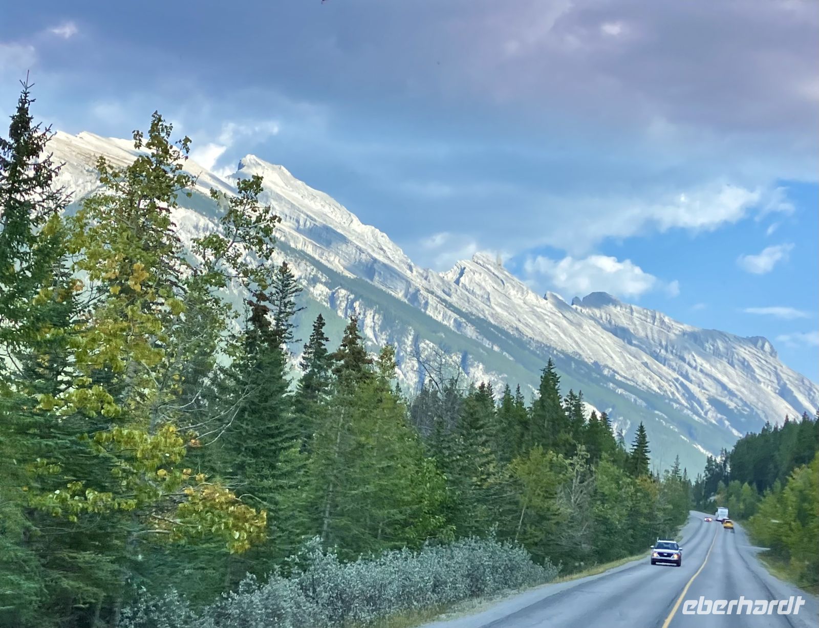 Die Wanderschuhe stehen bereit um auf eine unvergessliche Reise zu gehen. Der stolze Schuhbesitzer ist bereit seinen/ihren Traum zu verwirklichen. Auf gehts, in den Westen Kanadas. Passen die Wanderschuhe noch in den Koffer ? Notfalls koennen sie ja auch jetzt schon die Fuesse zieren. Der Rucksack wird sicherlich zum Handgepaeck. In Frankfurt treffen wir uns alle beim Gate nach Calgary. Das Abenteuer kann beginnen. Erst mal den Pass abstempeln lassen und ploetzlich kommt der Aufruf zum Einstieg in den Discovery Flieger. Oliver Stoecklin ist unser Pilot auf diesem Flug, wir sind sicher in guten Haenden. An die 60 Quadrat Zentimeter Spielwiese die nun jedem angeboten werden, koennen wir uns schlecht gewoehnen aber wir haben ja 8 Stunden und 40 Minuten Zeit, um uns damit anzufreunden. Alles laeuft wie am Schnuerchen, unsere A 330 ist nicht mehr nigel-nagel-neu aber das Flugpersonal ist jung. Ein paar Filme, Nickerchen, Snacks und Mittagessen spaeter, kommen wir puenktlich am Nachmittag desselben Tages in Calgary an. Unser Bussfahrer, Tracey sieht uns schon kommen und bald sind wir bereits unterwegs um das Zentrum dieser neuen Glasspalast-Stadt zu erkunden. Das Wetter ist wunderbar, der Bow River glitzert in der Sonne und die Hochhaeuser kaempfen um die beste Spiegelung. Viele Fotos spaeter fahren wir nun Richtung Berge, d.h. in den Westen. Uuups wir stecken im Stau. Das gibt es also auch hier. Feierabend startet hier bereits um 4 Uhr nachmittags ! Wir fahren beim Olympia Zentrum vorbei, wo 1988 unsere Katarina Witt als Goldmedalien Siegerin glaenzte, Eddy the Eagle das Kukuksei spielte, die jamaikanische Bobmanschaft der Liebling dieser aussergewoehnlichen Winterolympiade wurde und viele neue Sportarten in diese Spiele aufgenommen wurden. Außer Tracey sind wir allesamt ganz schoen geschaffen und doesen nun ein Stuendchen im Bus ehe wir in Banff ankommen und in dem schoenen und so zentral gelegenen Hotel unsere Zimmer beziehen koennen. Noch mal kurz Einkaufen im Nebenhaus und bald sehen wir die Bettdecken von unten. Ohhh der Schlaf in diesem tollen Bett, wir koennen es kaum erwarten.