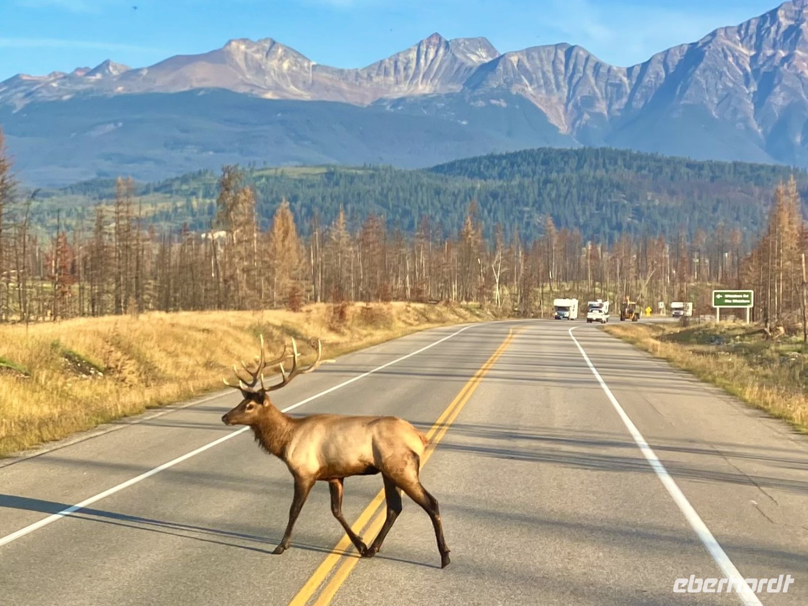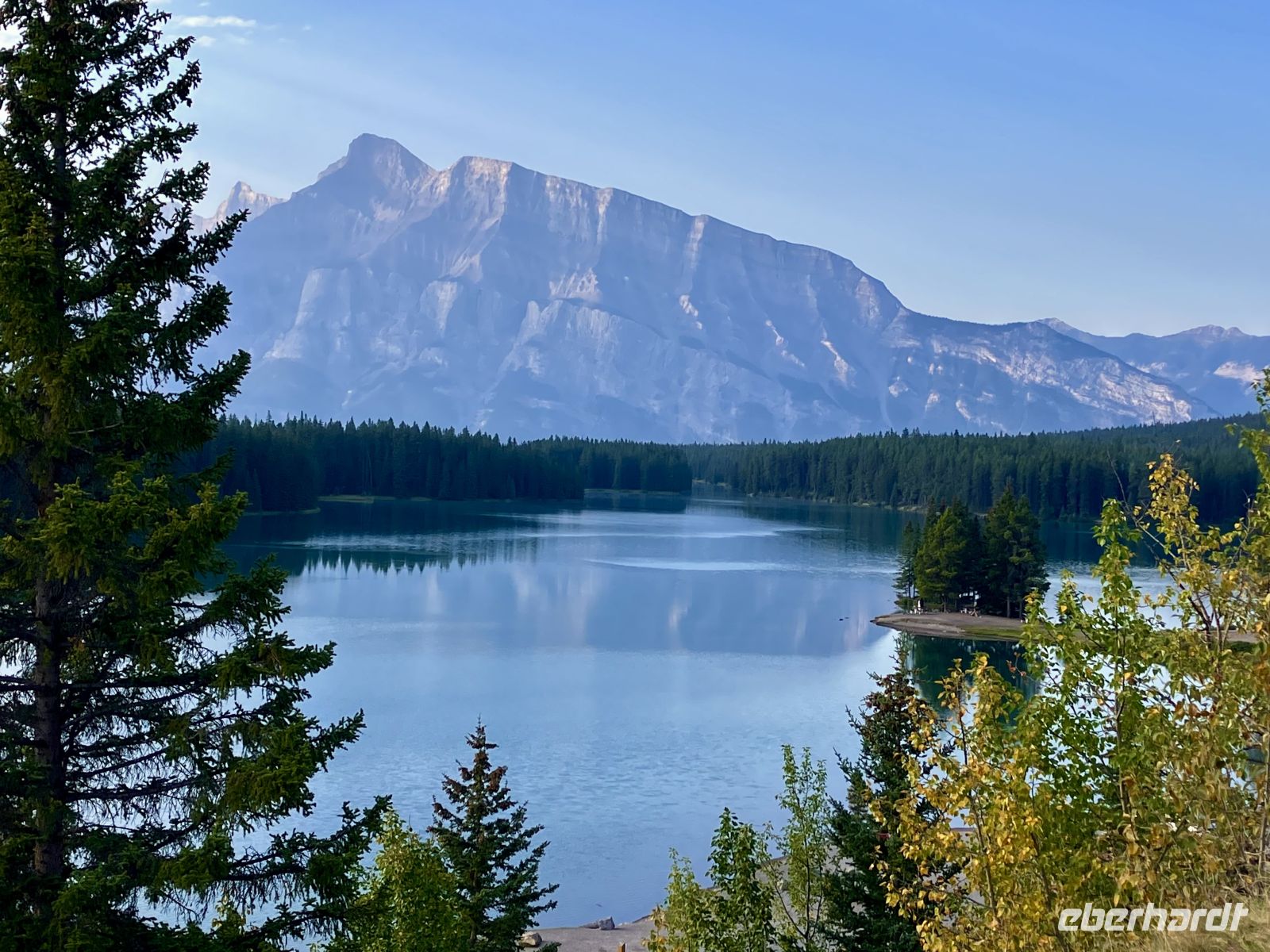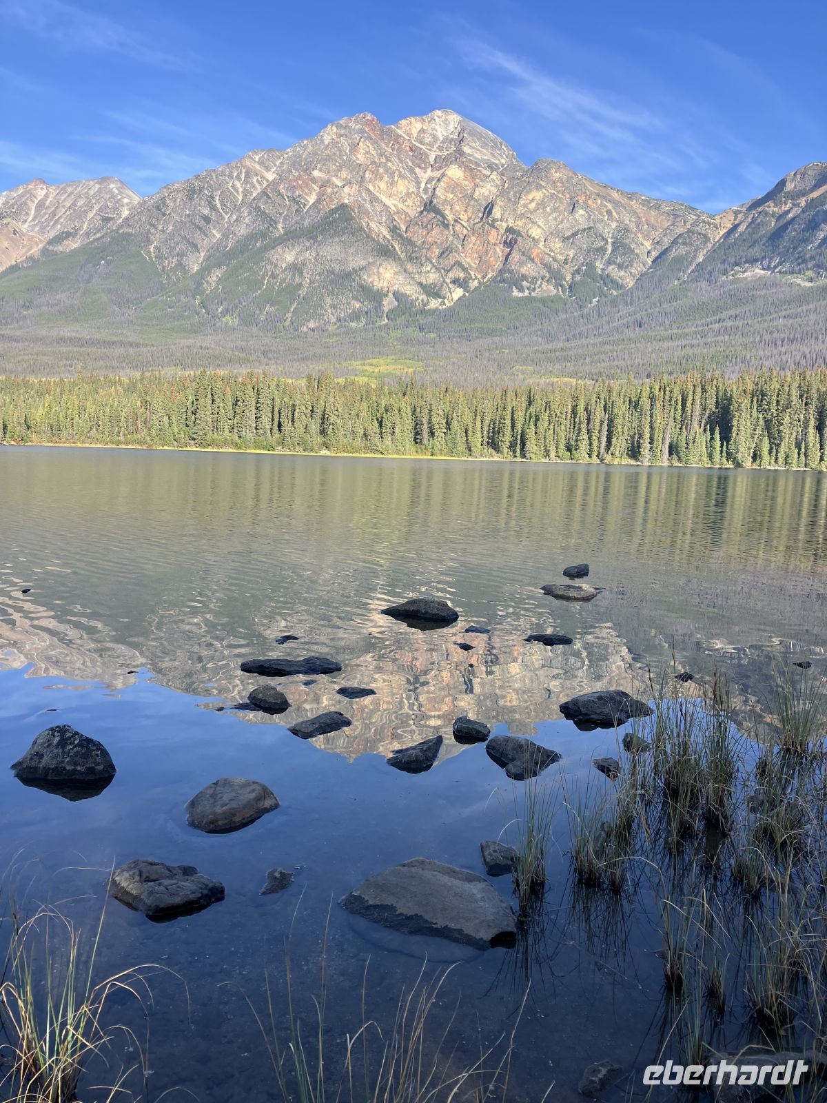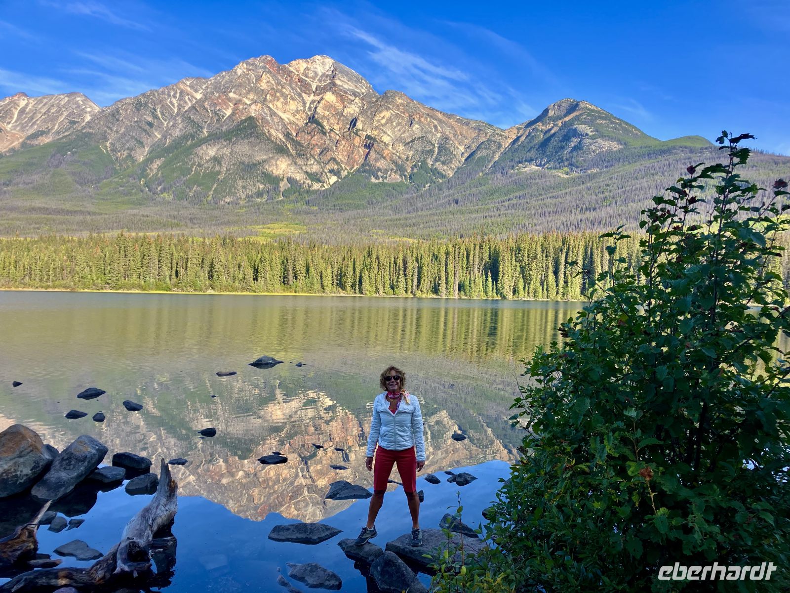 Nach dem Weckruf strecke ich auch gleich meinen Kopf erwartungsvoll zum Fenster hinaus und es ist noch dunkel aber trocken also wird es sonnig. Ich habe ein sehr feines app, denn es wird immer noch schoener als geplant. Schnell alle Fenster wieder zu, denn es ist draussen doch sehr kuehl . Mein Blockhaeuschen am Fluss ist jedoch angenhem warm. Nun heisst es wieder alle 7 Sachen zusammenpacken und Tracey verstaut alles wieder im Bus. In Richtung Jasper fahrend ueberrascht uns ploetzlich wieder derselbe schlanke und doch ausgewachsene Wapiti von gestern. Er schaut uns an, wir halten, er geht unbesorgt ueber die Strasse. Unsere Kameras sind ja eigentlich noch wohlverpackt und haben schlagartig Hochbetrieb. Die Sonne scheint schon in voller Pracht und so schaut auch dieser Tag wieder sehr vielversprechend aus. In Jasper fahren wir vorerst den Anhang hinter Jasper hinauf um dort zwei Seen zu besichtigen. Vorerst halten wir nun bei Patricia Lake denn wir wollen erstens die Spiegelung aufnehmen und natuerlich kontrollieren, ob die Geschichte der Eisschiff-Werft auch stimmt. Alles gut, das Foto der Werft steht noch da. Eine unglaubliche Geschichte und die Spiegelung ist genauso unglaublich schoen. Bei Pyramid Lake halten wir fuer einen kleinen Spaziergang auf der Insel. Auch hier bieten sich viele tolle Motive und unsere Kameras und Handy werden gut genutzt.