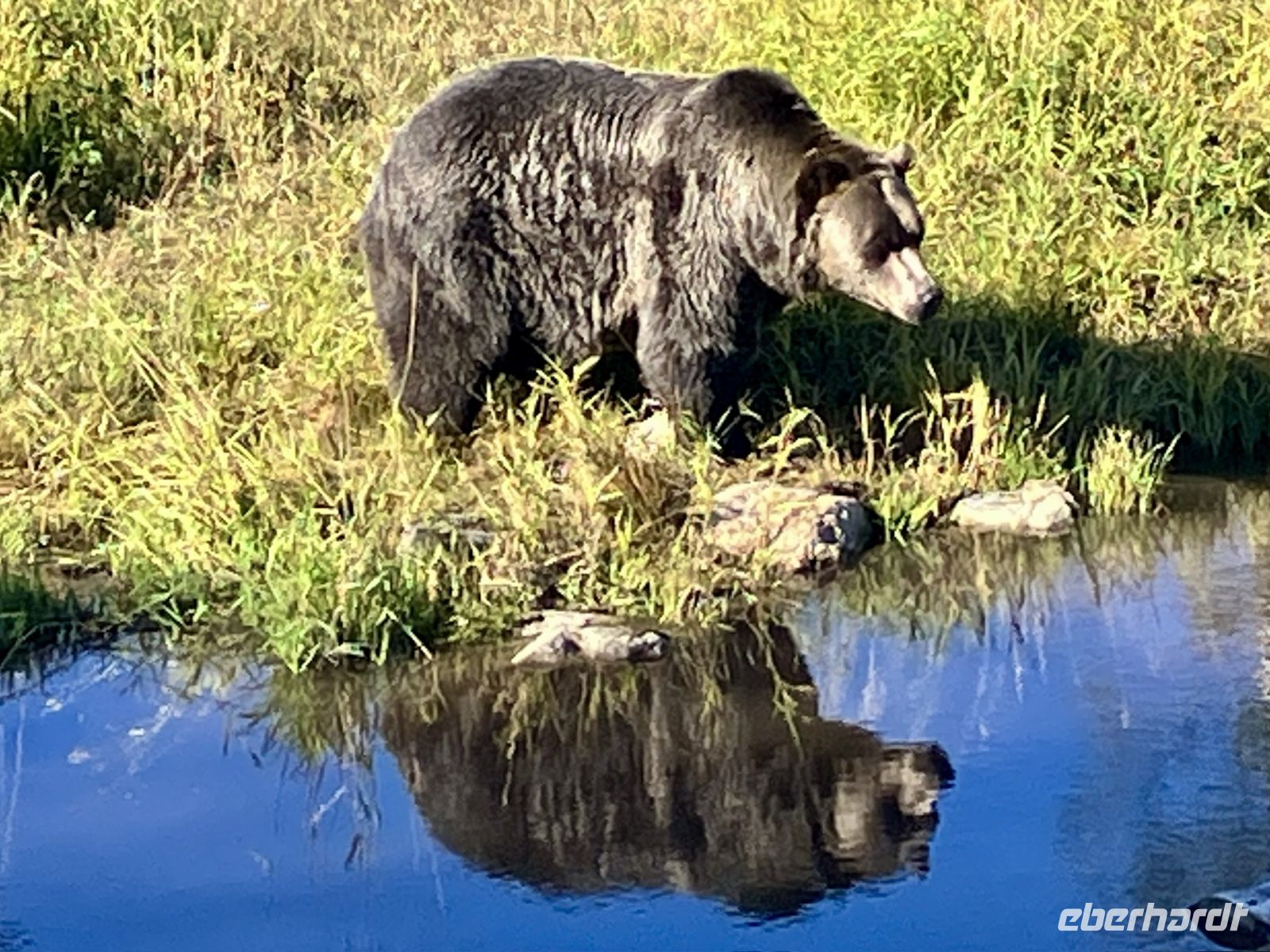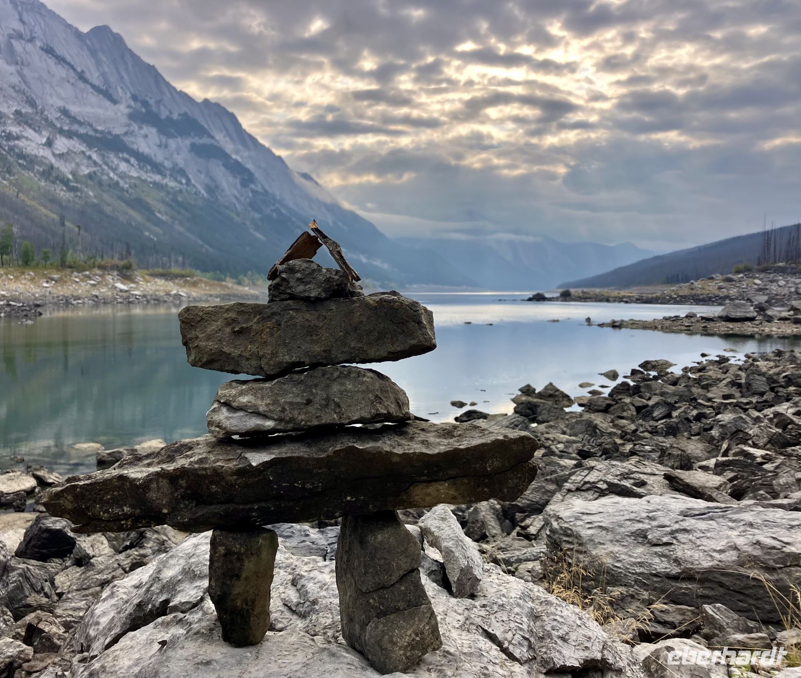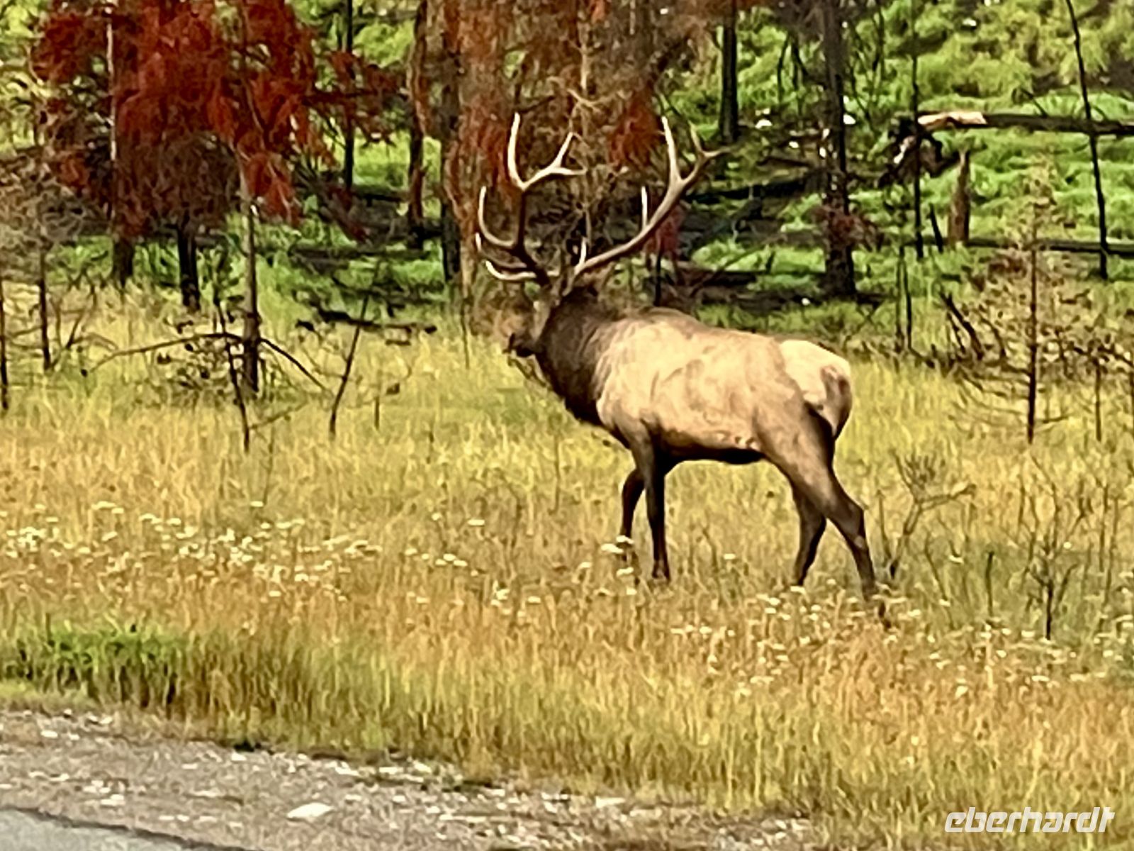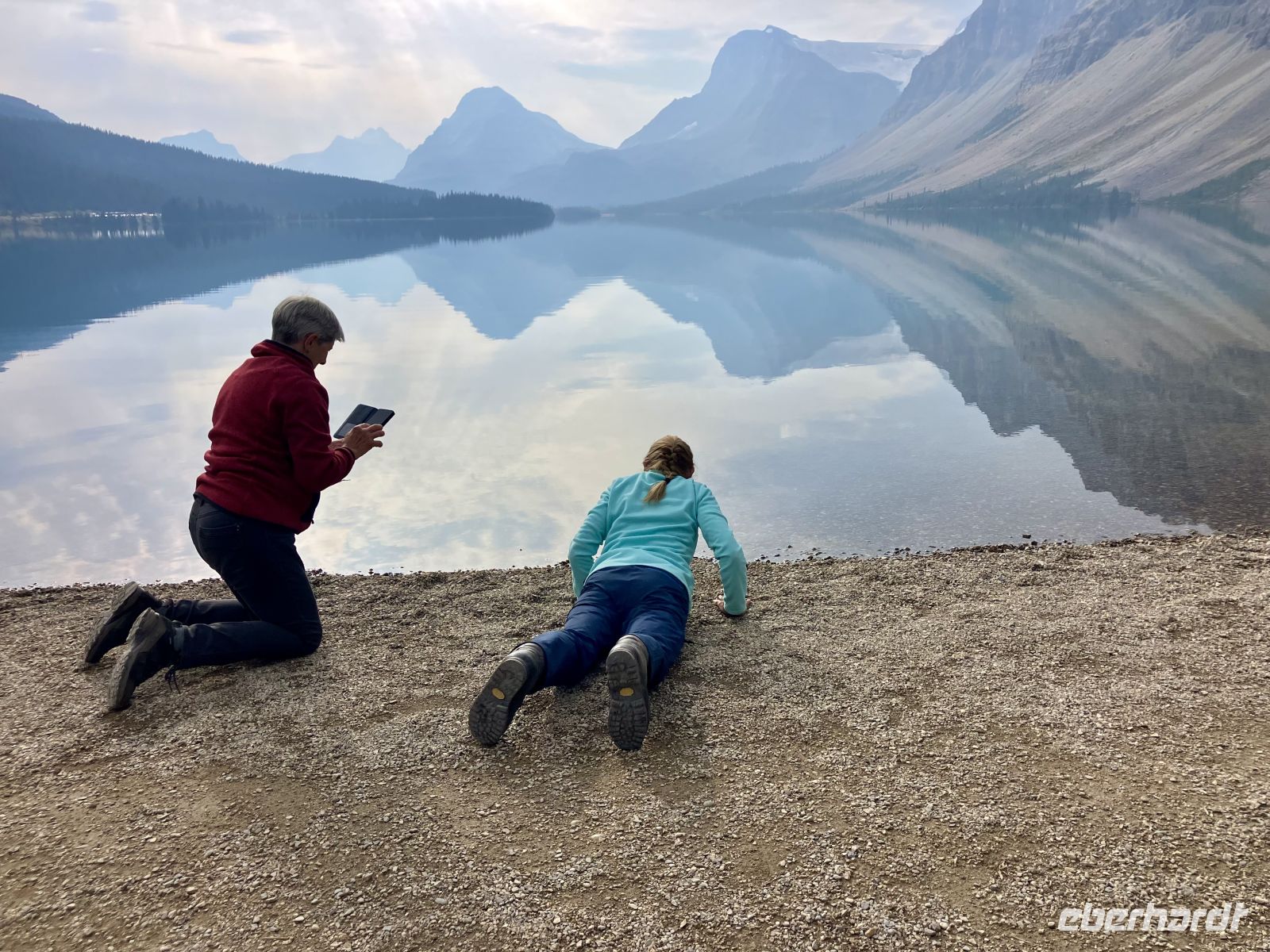 Nach dem Weckruf strecke ich auch gleich meinen Kopf erwartungsvoll zum Fenster hinaus und es ist noch dunkel aber trocken also wird es sonnig. Ich habe ein sehr feines app, denn es wird immer noch schoener als geplant. Schnell alle Fenster wieder zu, denn es ist draussen doch sehr kuehl . Mein Blockhaeuschen am Fluss ist jedoch angenhem warm. Nun heisst es wieder alle 7 Sachen zusammenpacken und Tracey verstaut alles wieder im Bus. In Richtung Jasper fahrend ueberrascht uns ploetzlich wieder derselbe schlanke und doch ausgewachsene Wapiti von gestern. Er schaut uns an, wir halten, er geht unbesorgt ueber die Strasse. Unsere Kameras sind ja eigentlich noch wohlverpackt und haben schlagartig Hochbetrieb. Die Sonne scheint schon in voller Pracht und so schaut auch dieser Tag wieder sehr vielversprechend aus. In Jasper fahren wir vorerst den Anhang hinter Jasper hinauf um dort zwei Seen zu besichtigen. Vorerst halten wir nun bei Patricia Lake denn wir wollen erstens die Spiegelung aufnehmen und natuerlich kontrollieren, ob die Geschichte der Eisschiff-Werft auch stimmt. Alles gut, das Foto der Werft steht noch da. Eine unglaubliche Geschichte und die Spiegelung ist genauso unglaublich schoen. Bei Pyramid Lake halten wir fuer einen kleinen Spaziergang auf der Insel. Auch hier bieten sich viele tolle Motive und unsere Kameras und Handy werden gut genutzt.
