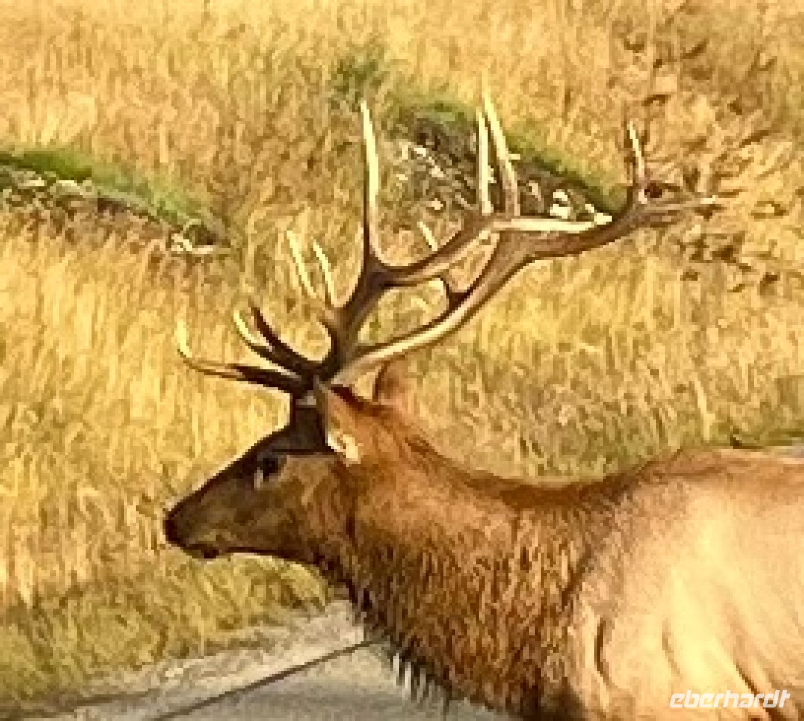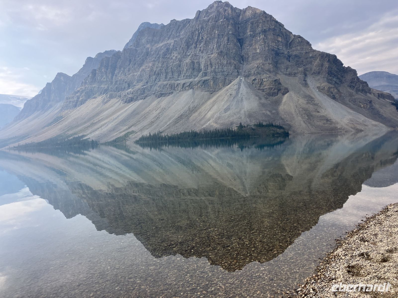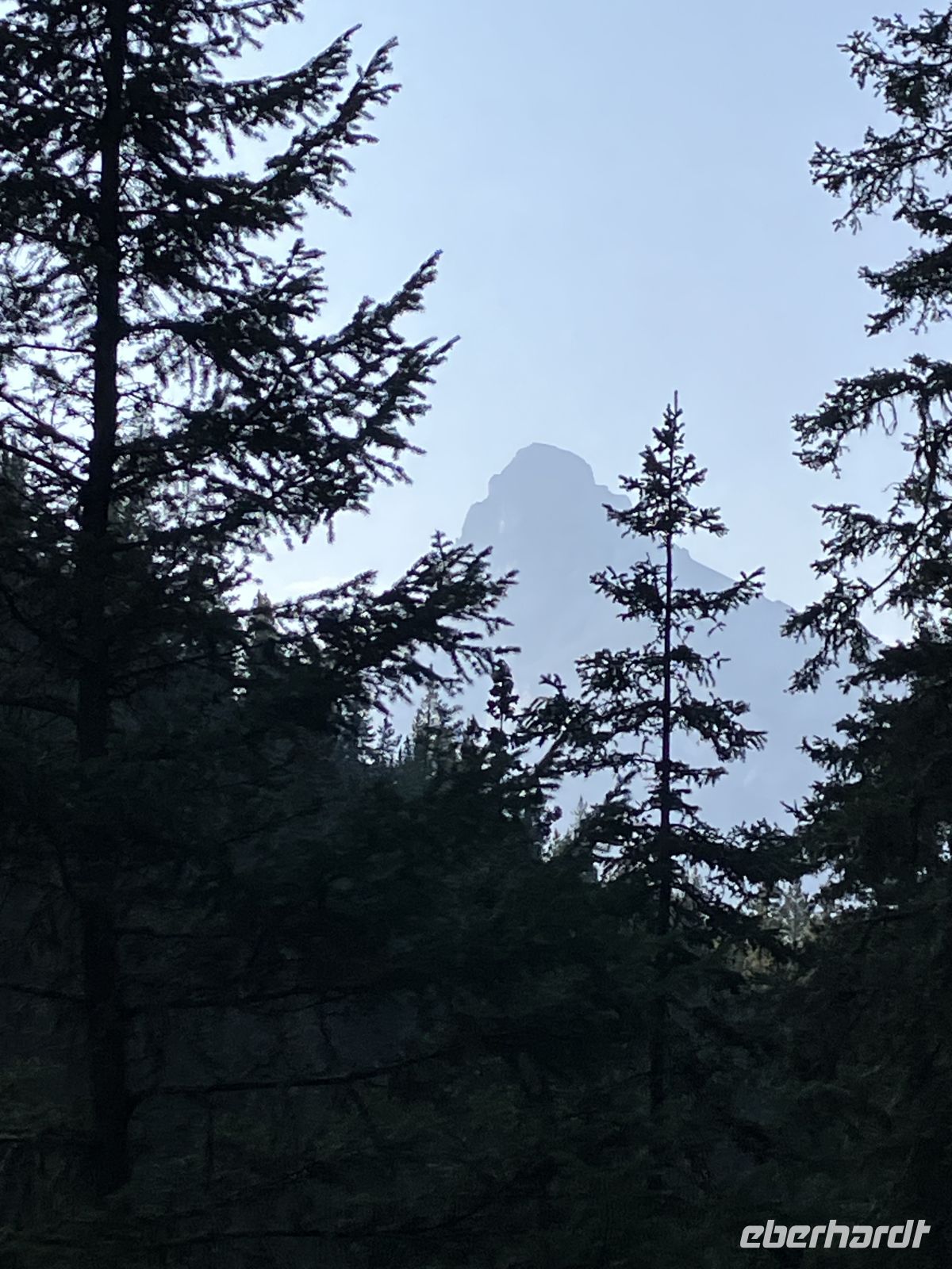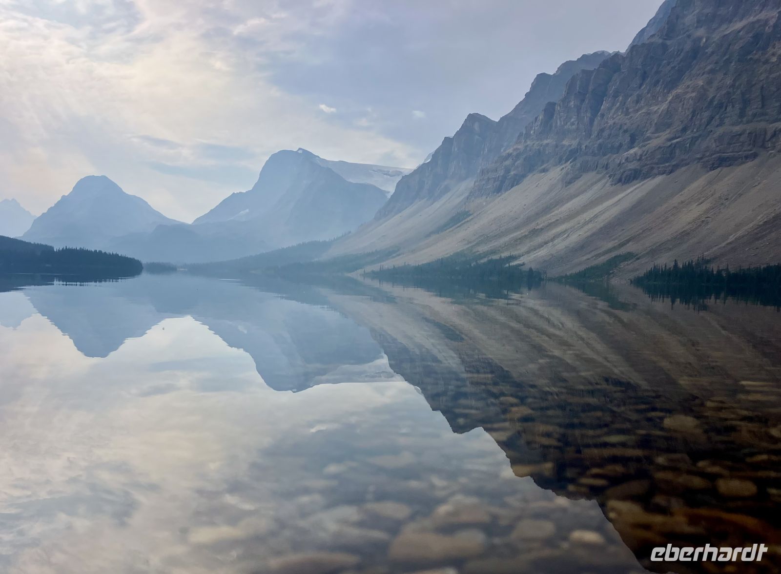 Nach dem Weckruf strecke ich auch gleich meinen Kopf erwartungsvoll zum Fenster hinaus und es ist noch dunkel aber trocken also wird es sonnig. Ich habe ein sehr feines app, denn es wird immer noch schoener als geplant. Schnell alle Fenster wieder zu, denn es ist draussen doch sehr kuehl . Mein Blockhaeuschen am Fluss ist jedoch angenhem warm. Nun heisst es wieder alle 7 Sachen zusammenpacken und Tracey verstaut alles wieder im Bus. In Richtung Jasper fahrend ueberrascht uns ploetzlich wieder derselbe schlanke und doch ausgewachsene Wapiti von gestern. Er schaut uns an, wir halten, er geht unbesorgt ueber die Strasse. Unsere Kameras sind ja eigentlich noch wohlverpackt und haben schlagartig Hochbetrieb. Die Sonne scheint schon in voller Pracht und so schaut auch dieser Tag wieder sehr vielversprechend aus. In Jasper fahren wir vorerst den Anhang hinter Jasper hinauf um dort zwei Seen zu besichtigen. Vorerst halten wir nun bei Patricia Lake denn wir wollen erstens die Spiegelung aufnehmen und natuerlich kontrollieren, ob die Geschichte der Eisschiff-Werft auch stimmt. Alles gut, das Foto der Werft steht noch da. Eine unglaubliche Geschichte und die Spiegelung ist genauso unglaublich schoen. Bei Pyramid Lake halten wir fuer einen kleinen Spaziergang auf der Insel. Auch hier bieten sich viele tolle Motive und unsere Kameras und Handy werden gut genutzt.