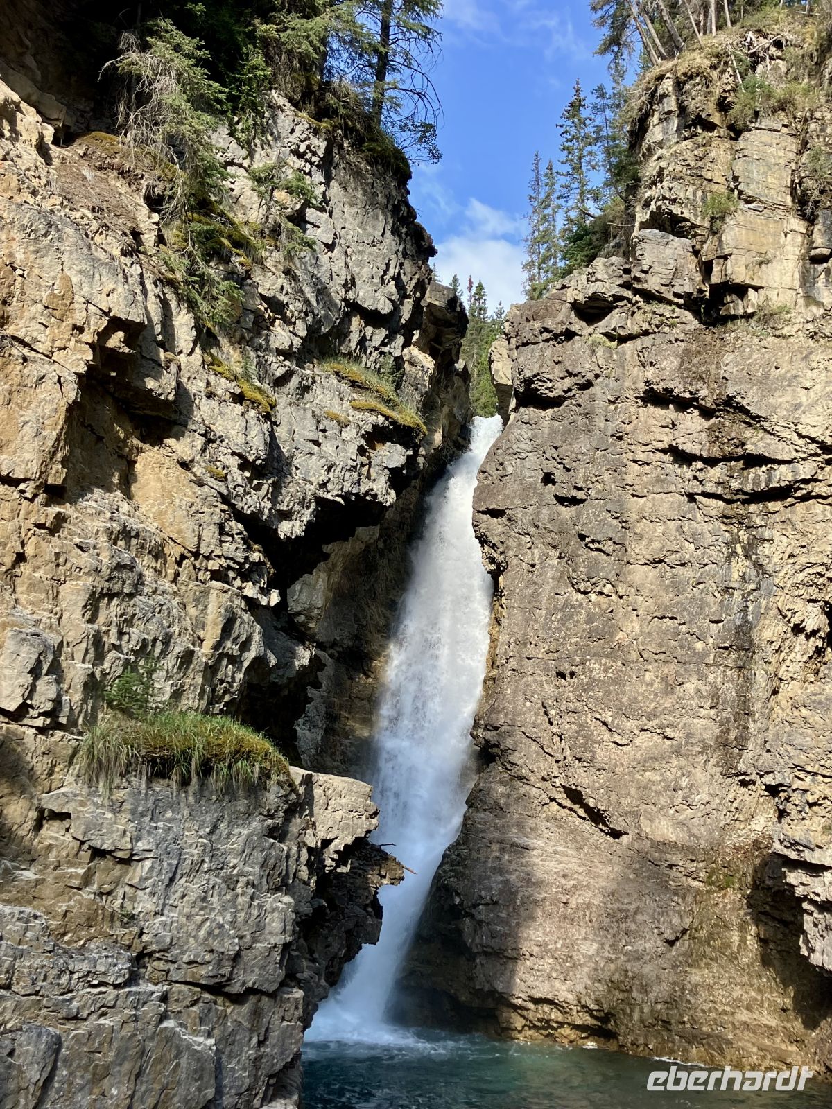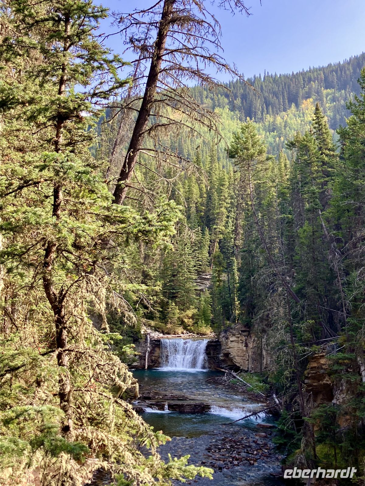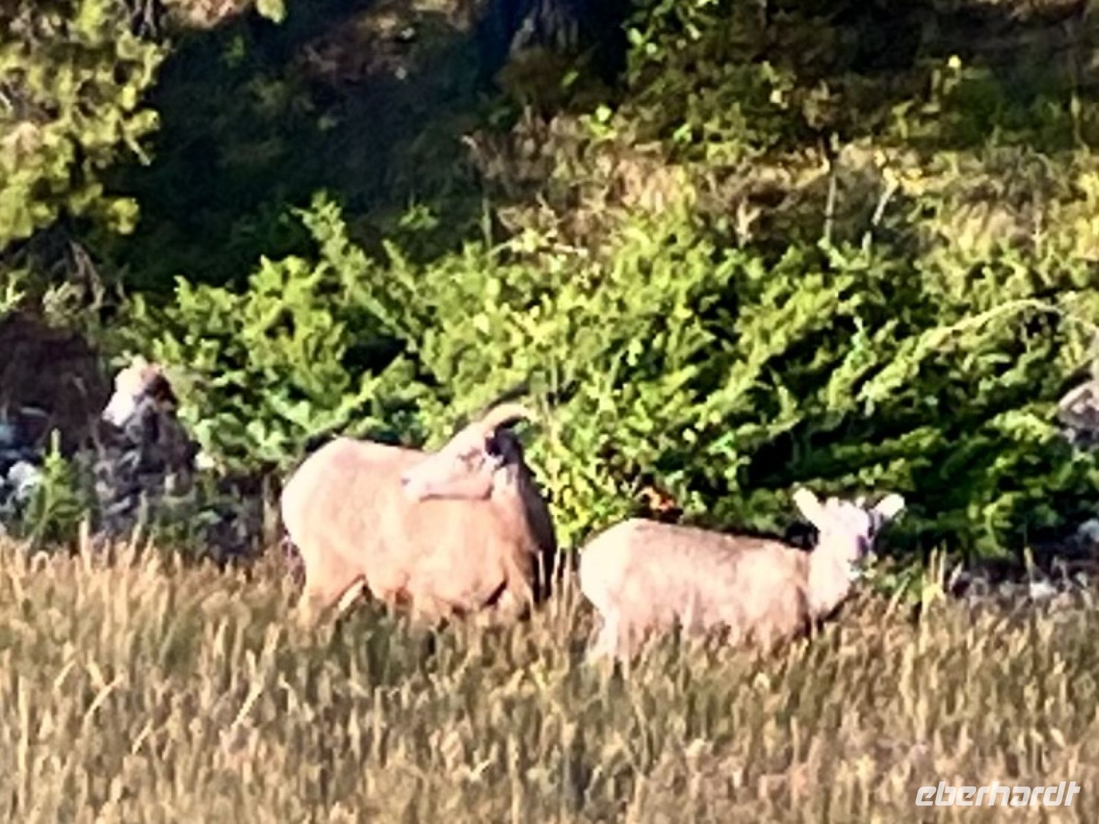 Ein herrlicher Tag bricht an. Wir erwachen im Banff National Park. Oh wie majestaetisch sie doch in den Himmel ragen, wie eindrucksvoll sie doch gezeichnet sind und wie imposant sie doch wirken, diese herrlichen Rocky Mountains. Gleich nach dem Fruehstueck gehts schon ab mit Tracey, denn wir wollen heute schoen wandern gehen. Vorerst aber fahren wir zum Miniwanka See. Da stehen sie auch schon. 2 Wapiti grasen an einem kleinen Bach und schauen zu, wie sich ein Fotograf ihnen naehert. Bald huschen sie immer weiter weg, bis wir nur noch zwei helle Flecken auf einer Wiese sehen. Wir fahren weiter und halten auf einer kleinen Anhoehe. Die Sicht von hier, auf den two Jack Lake mit seiner kleinen Halbinsel und dem majestaetischen Mount Rundel im Hintergrund ist heute bei dem Sonnenschein einfach Postkartenmaessig. Nun muessen wir aber weiter…..da stehen nun auch 2 Krummhornschafe und denen muessen wir natuerlich auch Zeit geben. Jetzt aber, schleunigst auf die Hwy No 1 zu unserer heutigen Wanderung. In Johnston Canyon angekommen, wandern wir bis ganz hinauf zu den Ink Pots. Das sind insgesamt gute 11 Kilometer mit stetigem leichten An-und wenig Abstieg. Der erste Kilometer ist geteert und zieht deshalb auch viele Spaziergaenger an. Wir sind jedoch so frueh dran, dass noch nicht unmengen andere hier wandern. Wir ueben uns im Slalomlauf und kurven geschickt um die Leute, Kinder und Hunde. Schoene Wasserfaelle begleiten diese Schlucht. Immer wieder halten wir an und immer wieder staunen wir ueber die Naturschoenheit. Nach dem 3. Wasserfall haben wir den Weg fast ausschliesslich nur noch fuer uns alleine. Der Pfad fuehrt uns nun durch einen lichten Wald und steigt staendig leicht an. Auf einmal aber wissen unsere Muskeln nicht mehr was mit ihnen geschieht denn nach gut 2 Stunden bergan, gehts auf einmal bergab. Oh nein, wir verlieren an Hoehe, da muessen wir uns danach wieder hinauf bemuehen ! Aber es ist nicht mehr weit, da sind sie schon, die Tintenfaesser in diesem weiten, von herrlichen Bergen umgebenen Hochtal. Es sind kleine Seen die unterirdisch von Gletscherwasser gespiesen werden. Da der Boden aus Sand besteht sieht man grosse und kleine Ringe in den Seen wo das Wasser hinaufgestossen wird. Bei manchen Seelein sprudelt es regelrecht. Nun ist Zeit zum ausspannen, Fotos knipsen und picknicken. Es ist wunderschoen hier oben und wir haben auch Zeit zum Essen, Plaudern und uns besser kennenzulernen. Um 1 Uhr offeriert uns das Haus zum Dessert auch einen feinen Whisky aus Alberta mit Ahorn-Kekschen. Leicht und lustig, wandern wir danach schwatzend, kichernd und diskutierend wieder gute 2 Stunden hinunter zu unserem Bus. Wir waren geschlagene 5 Stunden unterwegs. Die Busfahrt zurueck nach Banff kommt nun sehr gelegen, gemuetlich lassen wir uns durch diese wunderschoene Landschaft kutschieren. In Banff machen wir noch einen Abschwenker zu den Steinformationen die hier Hoodoos genannt werden und zu einem Aussichtspunkt mit der perfekten Perspektive auf das ehemalige Eisenbahnhotel, das Banff Spring Hotel. Unser Abendessen ist heute in einem nahegelegenen Restaurant. Der Staek hier ist besonders lecker wie das Bierchen oder Weinchen dazu auch. Jetzt aber nichts wie ab in unsere Zimmer, die Augen schaffen es schon beinahe nicht mehr. Wir schlafen wie die Herrgoettchen in den schoenen Zimmer.