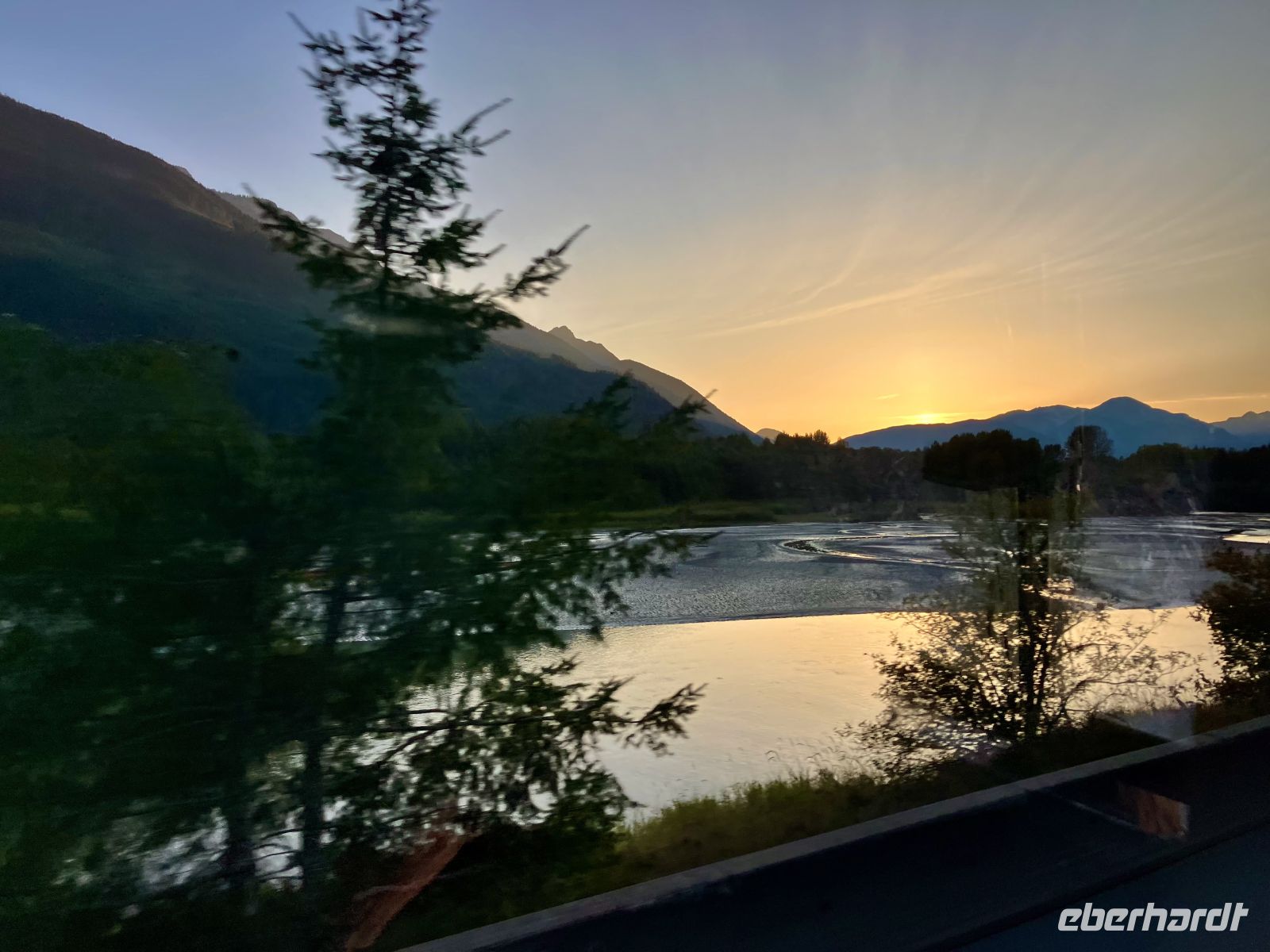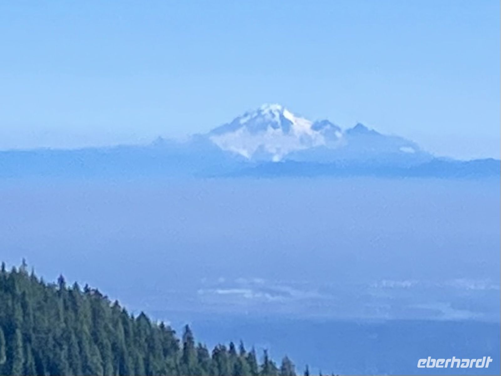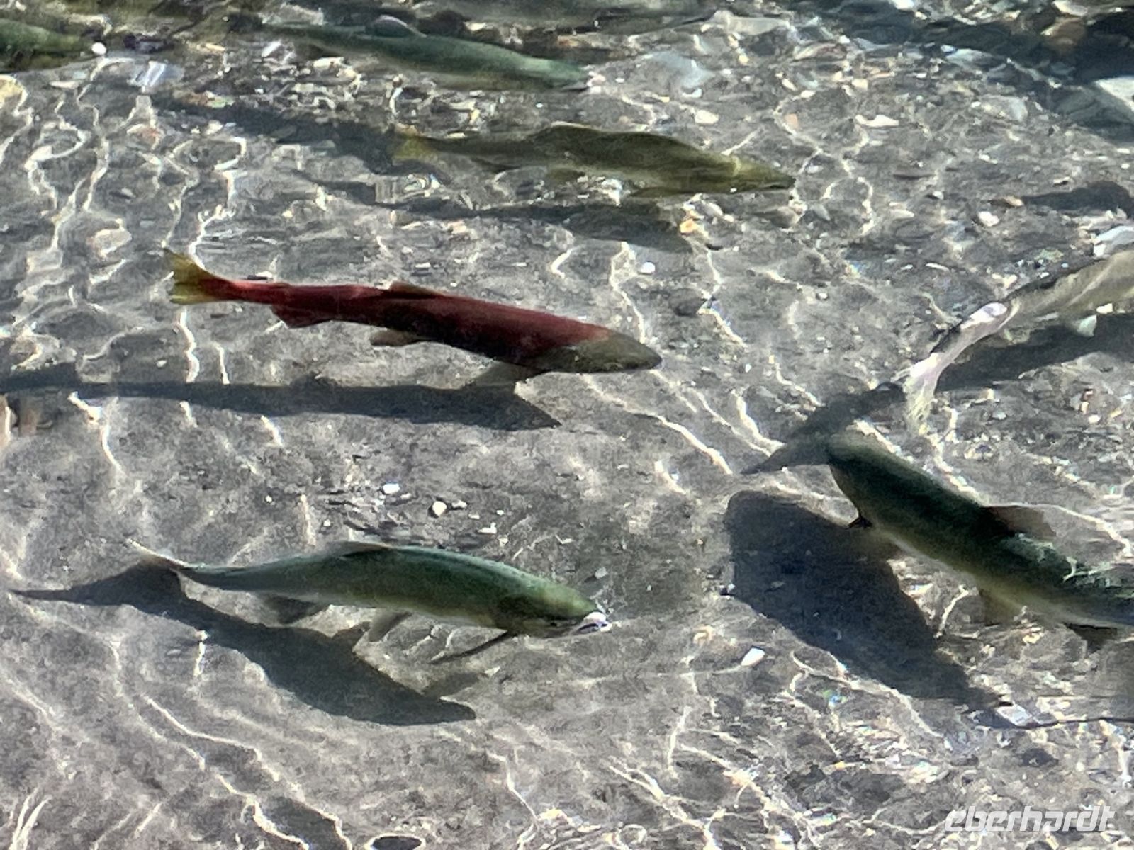 Nach einem kurzen technischen Halt in Jasper ist es aber wirklich Zeit diese schoene Gegen zu verlassen, denn Britisch Columbien erwartet uns schon. Ueber der grossen Wasserscheide treffen wir auf den Fraser Fluss. Der erste Fluss der in den Pazifischen Ozean fliesst. Da wir bereits die Uhren eine Stunde zurueckstellen koennen, ist es wieder frueh vormittags, es ist frisch und wir freuen uns ueber die Extrastunde Spielzeit heute. Da wir so eine muntere Wanderrunde sind, gehen wir vorerst auf den Ueberlaender Trail dem Fraser und Robson Fluss entlang. Ueber Stock und Stein und den Wald hier kennenlernend, treffen wir eine Stunde spaeter Tracey der auf uns wartet. Wir fahren 4 Km mit dem Bus bis zum Start der eigentlichen Wanderung entlang des Robson Rivers bis zu einem tollen See. Es geht gemuetlich auf einem breiteren Pfad dem Ufer des Robson Flusses entlang, stetig ein wenig steigend. Nach einer Stunde sehen wir ihn ploetzlich, der wunderbare, grosse, ruhige Kinney See. Der Magen hat sich auch schon gemeldet also setzen wir uns ans Ufer mit Blick auf den See und Whitehorn Mountain. Mmm ein schmackhaftes Sandwich ist nun die richtige Staerkung. Kein Lueftchen ergibt auch hier wieder die perfekte Spiegelung. Heute ist wieder so ein Spiegelungen Tag ! Auf der Fahrt nach Clearwater sprechen wir ueber die Lachse und ihren Lebenszyklus. In Valemount halten wir auch kurz an, um uns so eine Laichstelle anzuschauen. Die Lachse habe alle schon vor 2 Wochen gelaicht. Vielleicht sehen wir sie ja noch in einem anderen Fluss. Britisch Kolumbien ist durchzogen von Fluessen die von Lachsen heimgesucht werden. Nun machen wir endlich Siesta im Bus. Die Reise dauert 2 Stunden bis Clearwater also hat Elisabeth auch eine kleine Abwechslung fuer uns bereit. Ein Bierchen bei Larry in seiner tollen Kneipe ist genau das Richtige. Nun reden wir ueber Waelder, Studenten, Sozialwesen, Arbeit, Mieten, Pensionskasse usw bis wir in Clearwater ankommen. Ach ja, ein Baer zeigt sich auch noch aber er verschwindet auch recht schnell wieder im Dickicht. So vergeht die Zeit sehr schnell. Das Abendessen ist heute im Hotel. Dieser schoene Wander- und Reise-Tag endet in strahlendem Sonnen-und Mondschein.