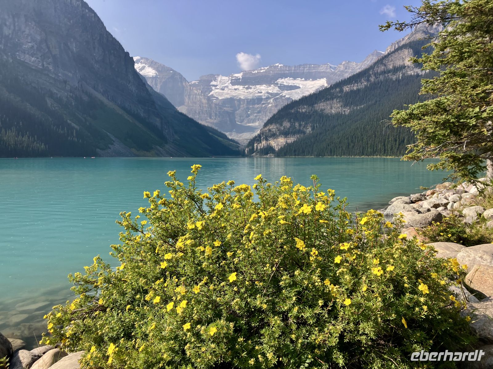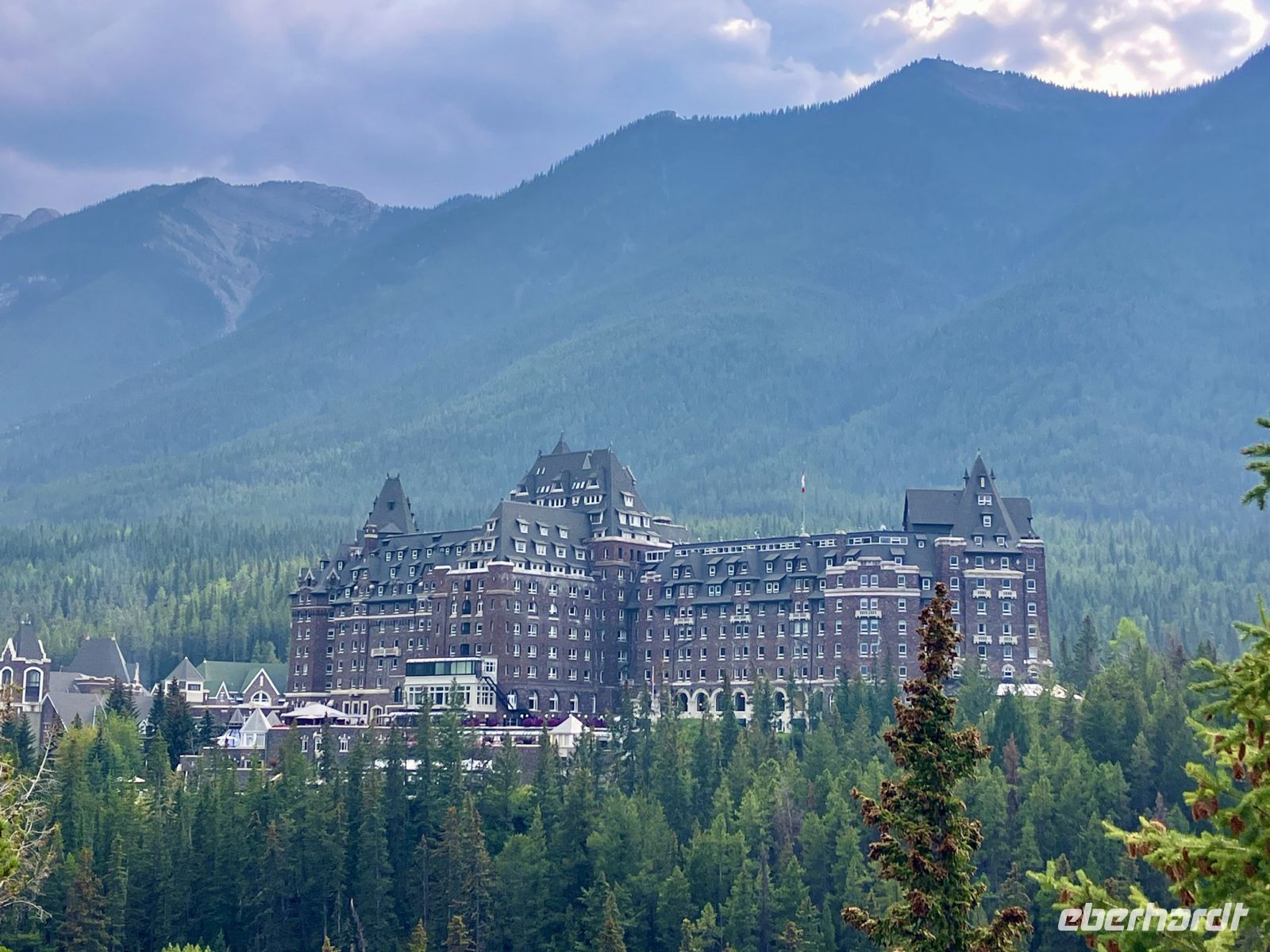 Im Sonnenschein und gut gelaunt, geht es schon in der Frueh auf den Weg nach Lake Louise. Wir fahren jedoch vorerst gleich mal weiter in den Yoho National Park denn wir wollen den Emerald Lake besuchen. Smaragdgruen glitzert er vor dem Mount President. Die roten Kanus sind die Farbtupfer auf diesem perfekten Bild. Wir wandern etwas dem Ufer entlang und genießen die herrliche Bergwelt. Bei der Rückfahrt legen wir noch einen kurzer Halt bei der natuerlichen Bruecke ein. Sie ueberspannt den Kicking Horse River. Bald gehts weiter mit der Fahrt nach Lake Louise. Oben am See angekommen sind wir auch nicht die einzigen an diesem schoenen Sonntag. Noch eine kleine Toilettenpause und schon sind wir mit Sack und Pack unterwegs den Weg hinauf zum Mirror Lake zu meistern. Da machen wir schon mal eine Verschnauf-Pause. Die Anstrengung dieser Wanderung erkennt man an den verschwitzten T-Shirts und den Jacken und Pullis die unlustig im Rucksack verstaut worden sind. Nun ist es nicht mehr weit zu Agnes Lake, bloss noch 20 Minuten, Treppen inklusive ! Es ist wahrlich eine wunderbare Wanderung mit einer gebuehrenden Belohnung fuer die Strapazen. Die Sicht auf den schimmernde See inmitten hochragender Berge ist fantastisch. Hier am Seeufer wollen wir uns nun auch setzen und das Mitgebrachte essen. Ein Picknick bei Sonnenschein schmeckt noch viel besser wenn man in guter Gesellschaft ist wie wir. Die Whisky Jacks, Blue Jays (alles Heer Arten) und Streifenhoerchen beobachten uns staendig und kontrollieren ob nicht doch was runterfaellt. Ein Stuendchen spaeter wandern wir munter wieder runter zu unserem Bus. Auf dem Weg nach Banff haben wir eine Siesta verdient und bloss unser gute Tracey doest nicht samte, sachte vor sich hin. Gott Sei Dank ! Wieder in Banff haben wir noch einen Besuch im Museum Banffs vor. Cave und Bassin ist der Ort, wo die Geschichte Banffs im Jahre 1883 ins Leben gerufen wurde. Interessant diese Höhle mit diesem warmen Schwefelwasser und den einzigartigen Schneckchen die nur hier, unter diesen Konditionen leben können. Jetzt aber, steht noch die Gondelfahrt auf Sulfure Mountain auf dem Programm. Bald sitzen wir in den bequemen 4 Personen Gondeln die uns auf den Schwefelberg Banffs bringen. WOW die Aussicht von hier oben ist atemberaubend. Der schoene Fussweg zu Samson’s Huettchen ist bloss einen Kilometer lang. Die Aussicht ist einfach ein Traum und die Geschichte von Mr. Samson inspirierend. Gemuetlich spazieren wir wieder zurueck zur Gondel und viele Fotos spaeter gondeln wir wieder ins Tal hinunter wo Tracey auf uns wartet um uns zum beruehmten Banff Springs Hotel zu fahren. Das schlossartige Gebaeude aus Stein inmitten des tiefgruenen Waldes wird von Prominenz sowie asiatischen Besuchern gern besucht. Die Skulptur von Cornelius Van Horn bewacht das ganze. Gleich danach fahren wir zu den nahegelegenen Wasserfaellen des Bow Flusses. Das muss man einfach gesehen haben. So ein voller, toller Tag. Ein Genuss