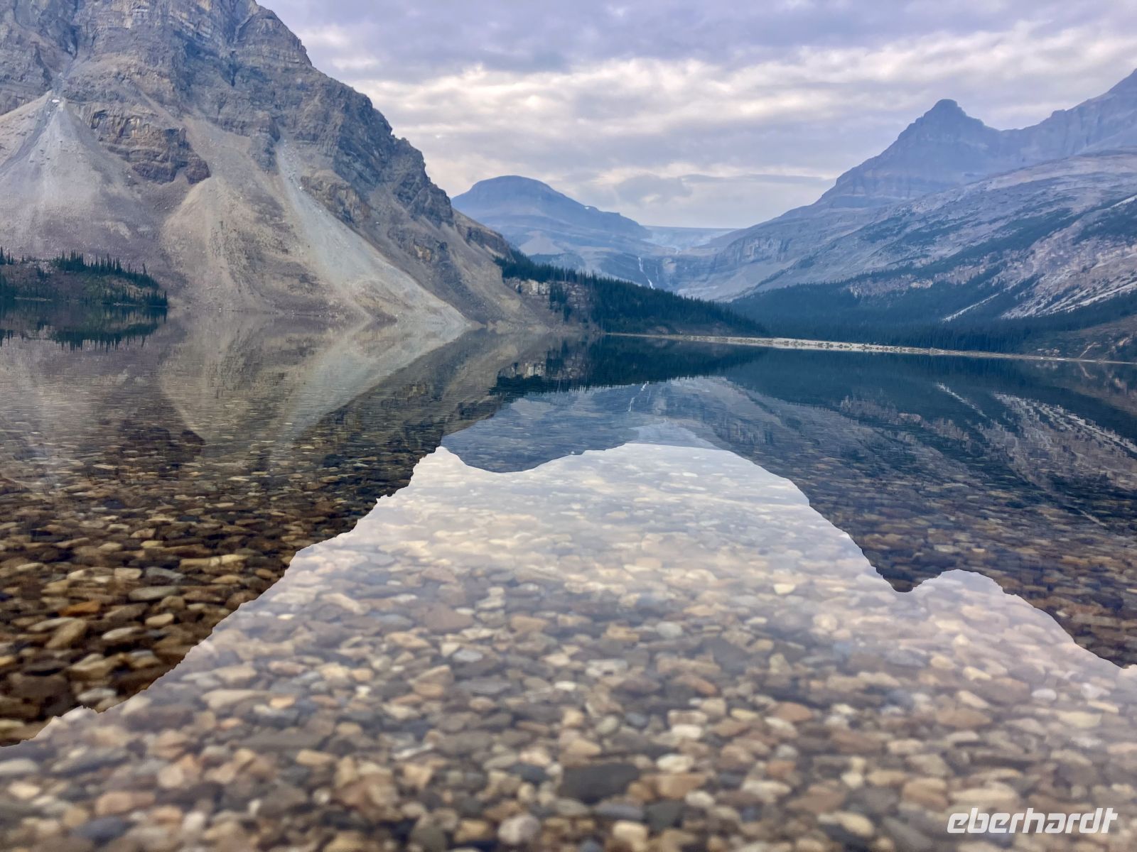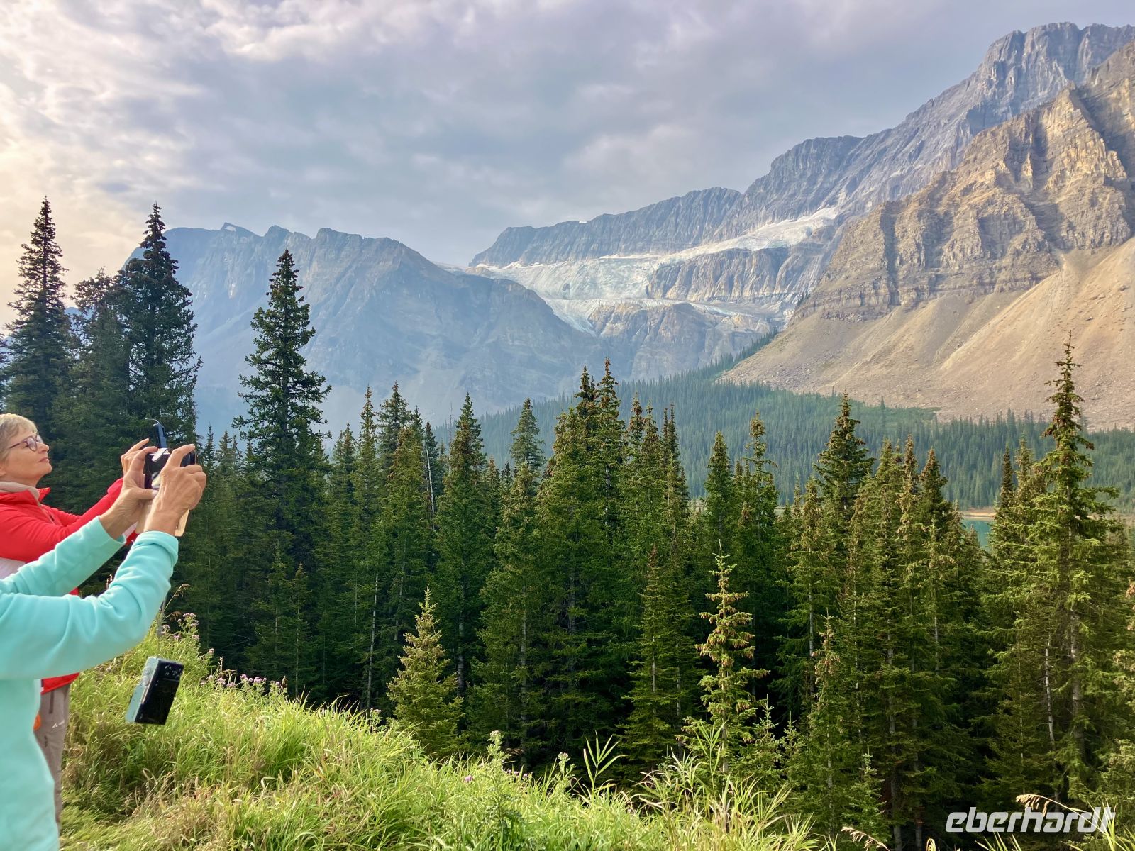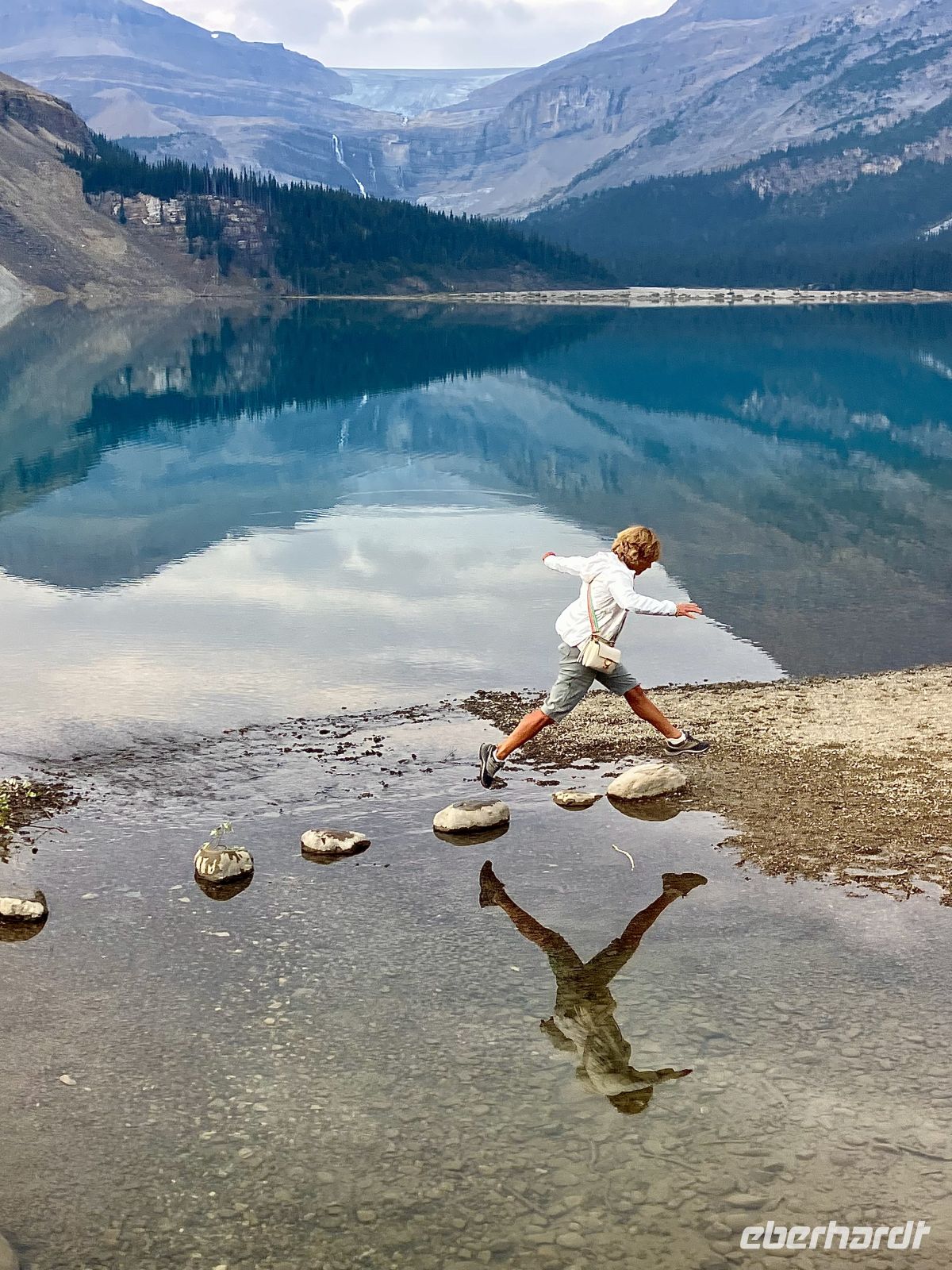 In der Frueh, so gegen 7 Uhr ist es recht kuehl, der Himmel ist blau, die Laune ist gut, sowie das Fruehstueck um 7:30. Wie auch die anderen Tage verlassen wir das Hotel um 8:30 dieses mal aber mit Koffer denn wir fahren heute Richtung Jasper. Alles ist perfekt, die Berge strahlen, die Gletscher glitzern, die Wasserfaelle schaeumen weiss und die Seen liegen ruhig in den endlosen Waeldern. Genau wie in der Ausschreibung. Viele Stops sind heute angesagt und auch viel Wissenswertes wird verkuendet. Wie ist das mit den Baeren und wieso soll man auf die Zaehne achten bei einer Baerenbegegnung. Wie ist das mit den Gletscher und den Schneefelder und wieso gibt es Silt und Moraenen. So bestaunen wir vorerst den Kraehenfuss-Gletscher und gedenken auch des Haeuptlings Kraehenfuss. Gleich danach fahren wir zum Bow See. WOW, heute ist er perfekt. Die Spiegelung ist enorm und so gibt es nun auch den Fotokurs „ Spiegelung mit IPhone 101“. Leider ist nun keine Zeit mehr fuer den Mokka in der Num Ti Jah Lodge, denn wir haben noch einige Stops vor uns ehe wir zum Columbia Eisfeld kommen. Bald gehts weiter auf der Parkstrasse, aber nicht lange, denn 5 Min spaeter halten wir schon wieder an, wir wollen uns Peto Lake anschauen. Von einer riesen Terrasse aus, haben wir eine herrliche Aussicht auf diesen dackelfoermigen, hellblauen See der inmitten eines Waldes weit unten im Tal liegt. Heute ist wohl unser Glueckstag denn Peyto Lake zeigt sich in seinem schoensten Kleid und auch hier spiegeln sich die umliegenen Berge im Wasser. Nun gehts weiter, dem Waterfowl Lake entlang. Dieser See wartet noch immer geduldig auf seine vielen Wasservoegel. Auf der Parkstrasse schauen die Gletscher von jedem Berg auf uns hinunter. Wir sehen Haengegletscher, Zungengletscher, Engelsgletscher, Zirkulargletscher und natuerlich die Hauben der Eisfelder. Nach der Mittagspause am Ufer des Saskatchewan Flusses zeigen sich einige Wolken am Himmel aber auch eine Schneeziege auf der gegenueberliegenden Bergwand. Ach wie herrlich sind doch diese Rockies und ach wie sehr werden wir von Mutter Natur verwoehnt. Auf dem Weg zu unserem Highlight heute erfahren wir, dass es in Kanada sogar Kurven auf der Strasse gibt !! Mit unserer Hilfe schaffen wir auch alle 3 Kurven, sodass wir heil beim Columbia Icefield Center ankommen. Nun sind wir da, beim Icefield Center, ach ne, so viele Leute und vor allem so viele Damen-Toiletten. Sie sind sogar im Guiness Book of Records vermerkt und das muessen wir natuerlich gleich ausforschen. Einige entscheiden sich fuer eine Moraene-Wanderung am Fusse des Athabasca Gletschers aber die Mehrheit faehrt mit dem riesen Snowcoach aufs Eis. Wir fahren vorerst mit einem normalen Bus auf eine Seitenmoraene und dann steigt man in den Snowcoach um. Damit fahren wir auf den Athabasca Gletscher. Der Fahrer James ist echt nett und ist noch immer unter dem hiesigen Durchschnittsalter von 25 Jahren. Er ist 23 und arbeitet bereits seit zwei Jahren hier. Unser Bus beherbergt noch eine grosse Gruppe Deutschsprachiger mit Marion als Reiseleitung. Wir sitzen alle brav auf unseren Baenken und horchen James zu, wie er nicht gerade leise und mit viel Entuhusiasmus etwas sehr kompliziertes auf Englisch erklaert. Oben angekommen, haben wir nun 25 Minuten Zeit das Eis zu erleben, darauf herumzu-rutschen und -turnen und mit dem klaren Gletscherwasser das mitgebrachte Flaeschchen abzufuellen. Das rutschige Bild mit der herrlichen Kulisse des Eisfalls wird sicher ein Hit. Ist Eis nicht hart ? Weshalb sind unsere Schuhe nass ? Nun gibt es noch eine Ueberraschung, denn die Whiskyflasche von Vorgestern hat noch die Haelfte drin und so stossen wir mit Whisky on the Rocks an. Wieder unten angekommen, treffen wir unsere Wanderfreunde und sind bald bereit weiter zu fahren. Nun mache wir ein kurzes Stuendchen Siesta im Bus, eher wir bei den Sunwapta Faellen halten. Ja, das steinerne Eichhörnchen sitzt noch immer mitten im Wasserfall. Was für ein schönes Motiv. Als nächsten Aussichtspunkt haben wir noch die Athabasca Faelle und seine Schlucht. Es nieselt nun leicht und so, koennen wir auch endlich unsere Regenjacken herzeigen. Eindrucksvoll hat sich hier der Athabasca Fluss ins Gebirge eingefressen, man kann sogar in einem trockenen Flusslauf gehen. Von hier ist es nicht weit zu unserem heutigen Nachtquartier. Die Beckers Chalets liegen wirklich idyllisch am Flussufer des Sunwapta Flusses. Das Abendessen ist ausgezeichnet und unsere Chalets sind sehr gemuetlich. Nach diesem vollen Tag wollen wir uns bald mal zurueckziehen und in dieser Idylle ruhig schlafen gehen.