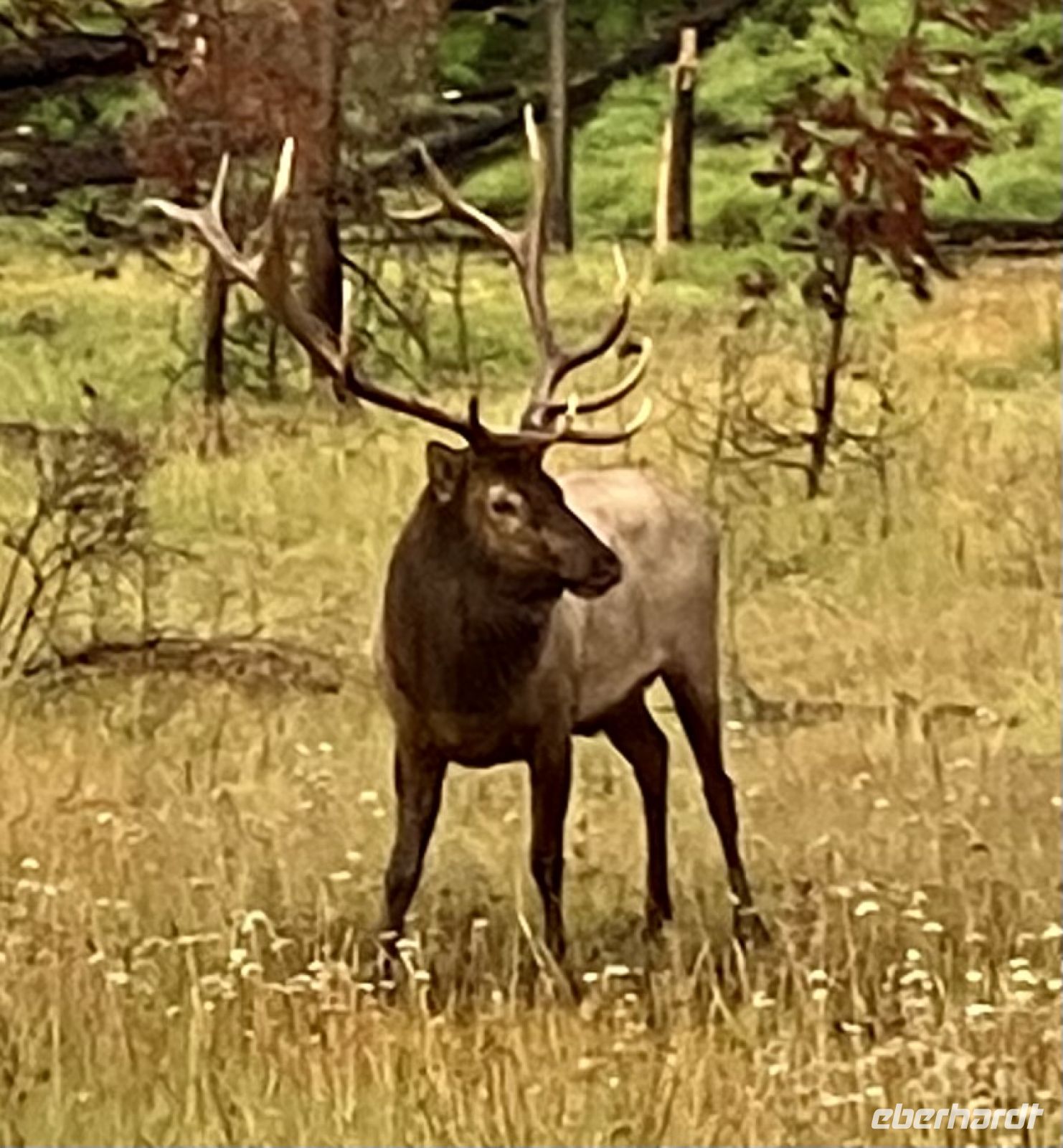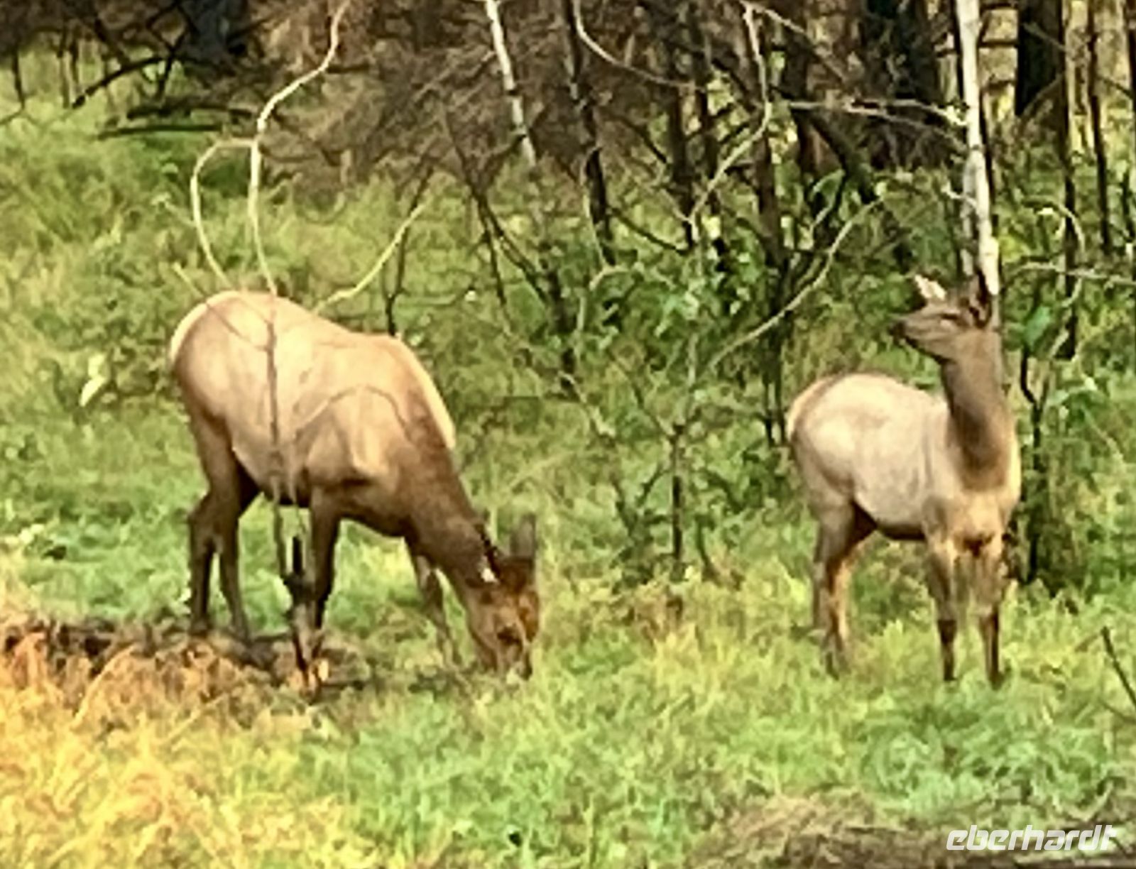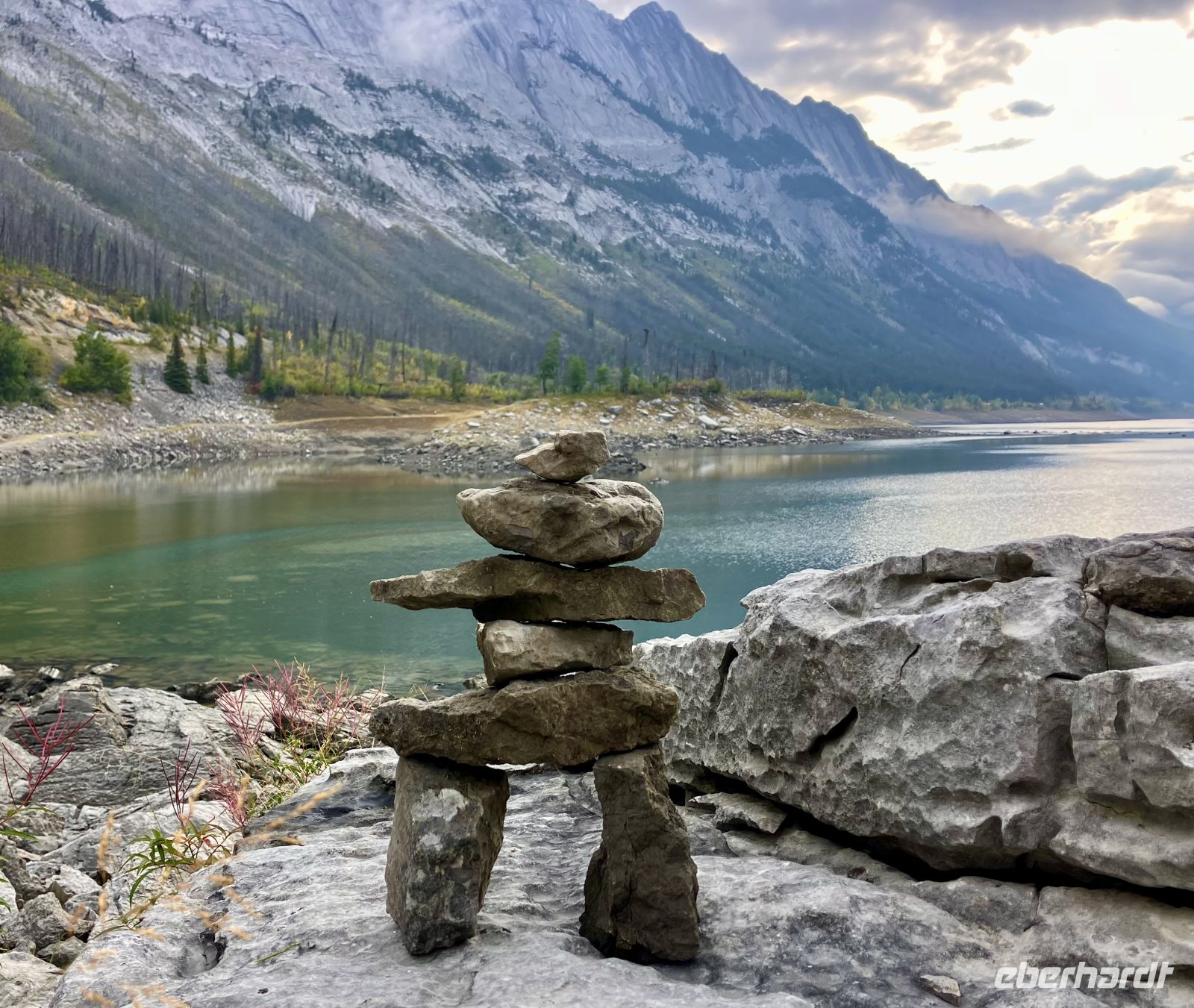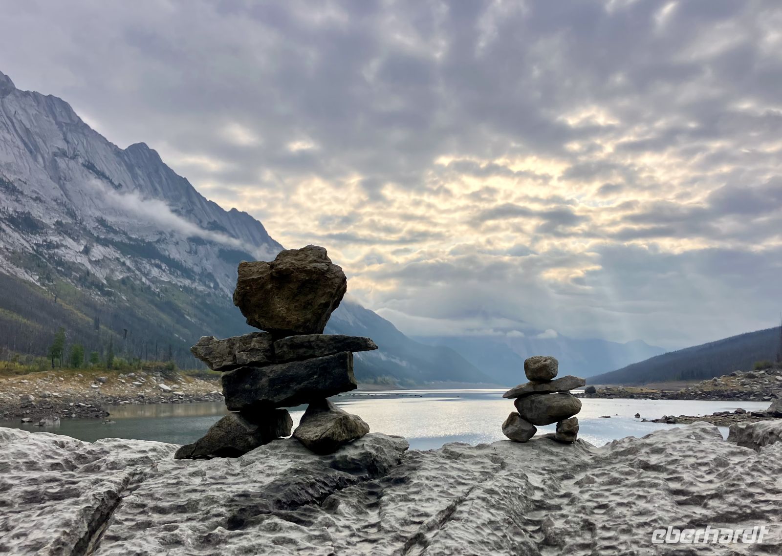 Nach dem schoenen Fruehstueck freuen wir uns nun auf das Maligne Tal und Jasper. Das Wetter ist perfekt. Ein einziges Woelkchen ziert den Himmel und sorgt fuer beste Perspektieve. So fahren wir mit dem Bus keine 2 Minuten und finden sie auch. Ein toller, ausgewachsener aber noch junger Hirsch wetzt sein Geweih im Grass und im Sand, schuettelt sich und wetzt dann wieder. Endlich merkt er, dass wir in dem Bus sitzen der keine 20 Meter von ihm entfernt auf der Strasse steht. So schaut er auf und das tolle Bild, ist in der Fotogalerie zu finden. Einfach toll. Wir lassen ihn mal den Bast entfernen und fahren weiter. Aber keinen Kilometer spaeter sehen wir eine Wapitidame mit Kind rechts und noch mehrere Wapitidmaedchen links. Heute ist wohl Wapiti Ausgang und es ist schoen zu sehen, dass sie nach dem grossen Feuer in Jasper wieder zurueckgekommen sind und sich wieder so benehmen wie vorher. Wir schauen eine Weile zu und fahren dann weiter durch Jasper durch. Es ist ein schmuckes kleines Staedtchen mit einem grossen Bahnhof fuer die Canadian National Railway. Wir werden spaeter noch Zeit haben, das Staedtchen zu erkunden. Der Bahnhof und die Hauptstraße sind noch ganz intakt und immer einen Besuch wert. Wir fahren nicht lange und halten bald wieder an, denn nun sind wir bereits bei Medicine Lake angekommen. Hier gibt es nun den Kurs «Inukshuk-Bau 101». Alle haben sich eingeschrieben, er ist gratis und lustig dazu. Ach, schau dir einer an. Eine kleine Eule sitzt auf einer verbrannten Fichte und schaut auf uns Fotografen runter. Jetzt gehts aber los, mit dem Kurs. Viele groessere und kleinere Steinmaennchen werden vor der herrlichen Kulisse des stillen Sees und der Elizabeth Range gebaut. Einige werden eher gebastelt, andere sind echte Kunstwerke geworden. Der Fantasie sind keine Grenzen gesetzt. Es wird ab sofort zur Eberhard Kunstgalerie und wir werden ab sofort zu Inukshuk Hersteller erkoren. Heuer hat es hier sehr spaerlich geregnet daher sind die Fluesse auf des Sees Boden sehr gut sichtbar. Es ist wunderschoen hier, auch wenn doch die Waelder bloss noch verkohlte Baumstaemme zu bieten haben. Spaeter, beim Maligne Sees machen wir unsere heutige Wanderung dem See entlang und durch den Wald wieder zurueck zur Bootsanlegestelle. Einige bleiben nun hier und picknicken andere wandern noch ein wenig um den See bis zu Rangers Bootshaus. Da nehmen auch wir unser Mittagessen ein und wandern wieder zurueck. Die Bootsfahrt ist einfach toll, Spirit Island ist das heutige Fotomotiv und manch einer knipst sicher auch ein gewinnbringendes Kodak-Foto. Die Berge heben sich so schoen von dem stahlblauen Himmel ab und die Gletscher glitzern weiss wohl um mit den Wölkchen zu konkurrieren. Bitte schaut Euch die Fotogalerie an. Nun ist aber Zeit, und wir fahren wieder zurueck nach Jasper. Oh schaut mal auf Medicine Lake, da ist eine Spur im Wasser und wir sehen tatsaechlich 3 Baeren wie sie durchs Wasser eilen. Die Mama voran und die beiden Jaehrlinge spielend hinterher. Nein, keine Bären es sind Grizzly. Es ist Grizzly 222 die sich und ihre Sproesslinge letzten Sommer im Maligne Canyon versteckte um dem Feuer zu entgehen. So einen tollen Zufall gibt es nicht oft. Wir sind die Gluecklichen, sie ist die Überlebende. Einige unter uns haben sich fuer eine Rafting Tour eingeschrieben. Das ist nun echt lustig und wir raften bald mit Dave den Sunwapta Fluss hinunter, an unserem Hotel vorbei und bis nach Jasper hinein. 5 Schnellen wurden uns angesagt also halten wir uns jeweils an dem aussen angebrachten Seil fest und schauen zu wie das so vor sich geht. Die erste Schnelle hat uns jedoch gelehrt, dass man mit diesem grossen knallroten Gummiboot einfach ueber die Wellen schwebt. So geniessen wir diese Rafting Fahrt sehr. Es ist fast “gemütlich” und wir lachen viel. Die anderen besichtigen in der Zwischenzeit das Dorf. Jasper ist klein und fein mit seinen 6 Liquor Stores und bloss 2 Lebensmittelgeschaeften ! Natuerlich sehen wir heute auch die Stellen mit den abgebrannten Haeuser. Tracy holt dann die Staedtebummler wieder ab und danach die Rafter und faehrt alle wieder in die Beckers Chalets, unser Hotel. Das Abendessen, ist auch heute im Hotel und wieder sehr lecker und sehr schön angerichtet. Wir haben wieder so viel erlebt und unternommen, dass wir fuer nichts mehr Energie aufbringen koennen. Also fluechtet jeder in sein Waldhaeuschen und......Gute Nacht......und tiefen Schlaf.
