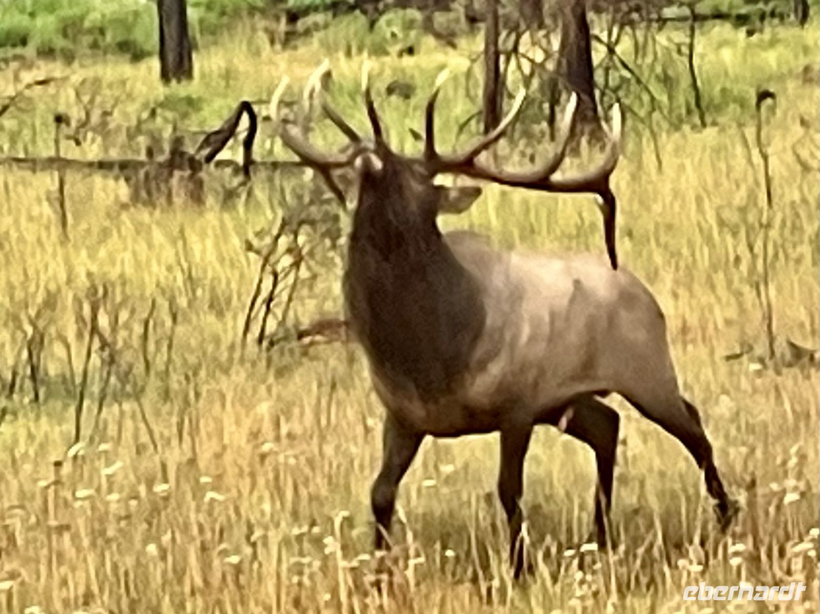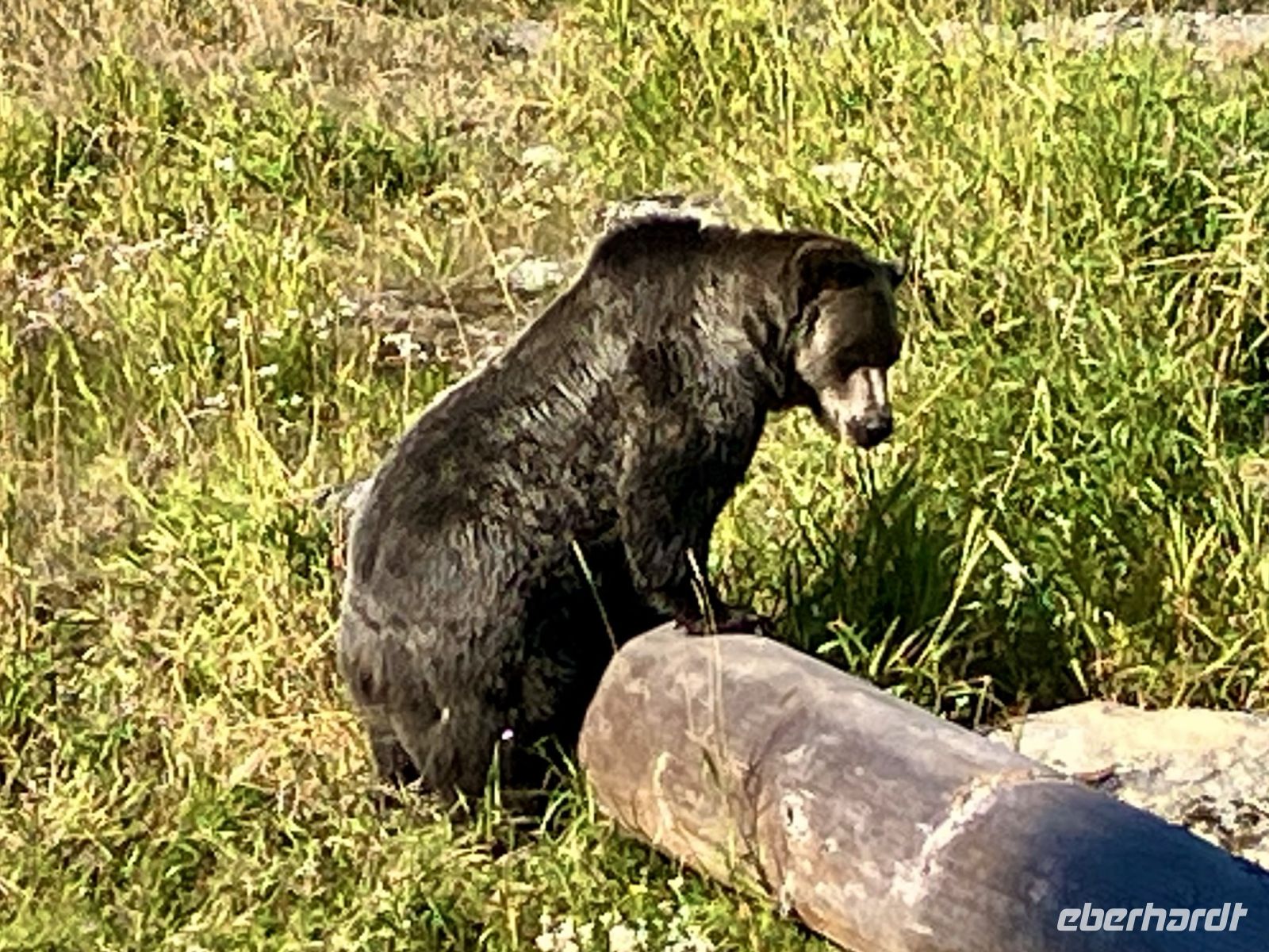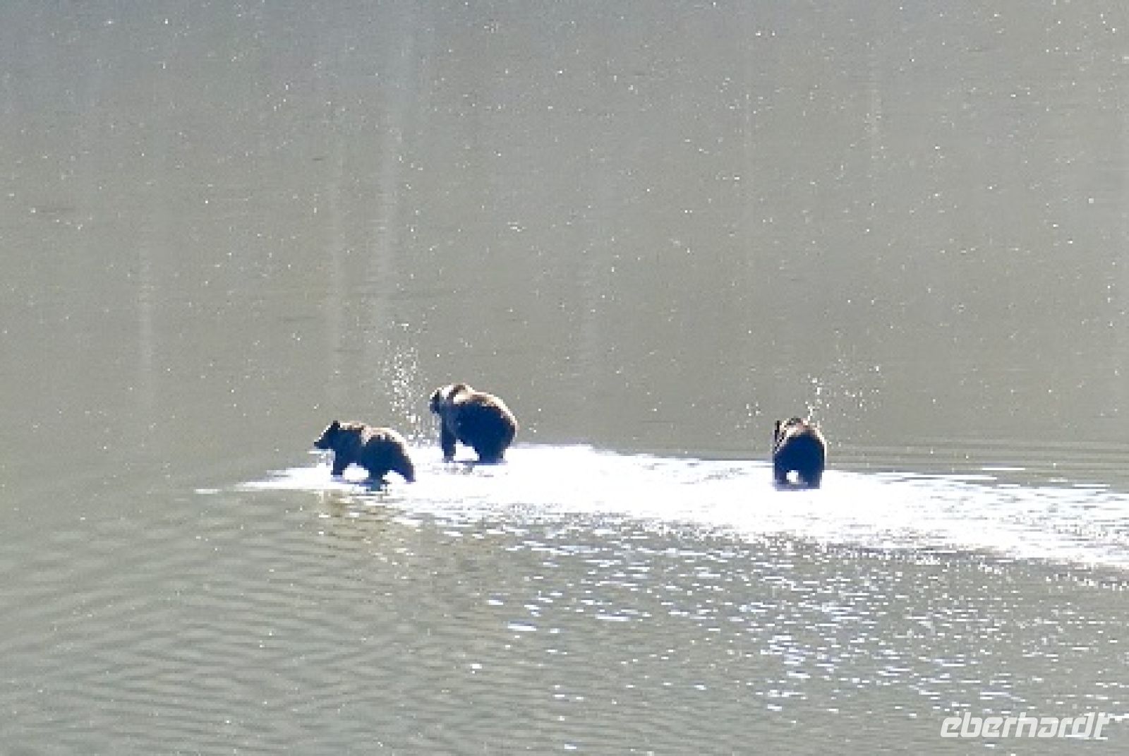 Nach dem schoenen Fruehstueck freuen wir uns nun auf das Maligne Tal und Jasper. Das Wetter ist perfekt. Ein einziges Woelkchen ziert den Himmel und sorgt fuer beste Perspektieve. So fahren wir mit dem Bus keine 2 Minuten und finden sie auch. Ein toller, ausgewachsener aber noch junger Hirsch wetzt sein Geweih im Grass und im Sand, schuettelt sich und wetzt dann wieder. Endlich merkt er, dass wir in dem Bus sitzen der keine 20 Meter von ihm entfernt auf der Strasse steht. So schaut er auf und das tolle Bild, ist in der Fotogalerie zu finden. Einfach toll. Wir lassen ihn mal den Bast entfernen und fahren weiter. Aber keinen Kilometer spaeter sehen wir eine Wapitidame mit Kind rechts und noch mehrere Wapitidmaedchen links. Heute ist wohl Wapiti Ausgang und es ist schoen zu sehen, dass sie nach dem grossen Feuer in Jasper wieder zurueckgekommen sind und sich wieder so benehmen wie vorher. Wir schauen eine Weile zu und fahren dann weiter durch Jasper durch. Es ist ein schmuckes kleines Staedtchen mit einem grossen Bahnhof fuer die Canadian National Railway. Wir werden spaeter noch Zeit haben, das Staedtchen zu erkunden. Der Bahnhof und die Hauptstraße sind noch ganz intakt und immer einen Besuch wert. Wir fahren nicht lange und halten bald wieder an, denn nun sind wir bereits bei Medicine Lake angekommen. Hier gibt es nun den Kurs «Inukshuk-Bau 101». Alle haben sich eingeschrieben, er ist gratis und lustig dazu. Ach, schau dir einer an. Eine kleine Eule sitzt auf einer verbrannten Fichte und schaut auf uns Fotografen runter. Jetzt gehts aber los, mit dem Kurs. Viele groessere und kleinere Steinmaennchen werden vor der herrlichen Kulisse des stillen Sees und der Elizabeth Range gebaut. Einige werden eher gebastelt, andere sind echte Kunstwerke geworden. Der Fantasie sind keine Grenzen gesetzt. Es wird ab sofort zur Eberhard Kunstgalerie und wir werden ab sofort zu Inukshuk Hersteller erkoren. Heuer hat es hier sehr spaerlich geregnet daher sind die Fluesse auf des Sees Boden sehr gut sichtbar. Es ist wunderschoen hier, auch wenn doch die Waelder bloss noch verkohlte Baumstaemme zu bieten haben. Spaeter, beim Maligne Sees machen wir unsere heutige Wanderung dem See entlang und durch den Wald wieder zurueck zur Bootsanlegestelle. Einige bleiben nun hier und picknicken andere wandern noch ein wenig um den See bis zu Rangers Bootshaus. Da nehmen auch wir unser Mittagessen ein und wandern wieder zurueck. Die Bootsfahrt ist einfach toll, Spirit Island ist das heutige Fotomotiv und manch einer knipst sicher auch ein gewinnbringendes Kodak-Foto. Die Berge heben sich so schoen von dem stahlblauen Himmel ab und die Gletscher glitzern weiss wohl um mit den Wölkchen zu konkurrieren. Bitte schaut Euch die Fotogalerie an. Nun ist aber Zeit, und wir fahren wieder zurueck nach Jasper. Oh schaut mal auf Medicine Lake, da ist eine Spur im Wasser und wir sehen tatsaechlich 3 Baeren wie sie durchs Wasser eilen. Die Mama voran und die beiden Jaehrlinge spielend hinterher. Nein, keine Bären es sind Grizzly. Es ist Grizzly 222 die sich und ihre Sproesslinge letzten Sommer im Maligne Canyon versteckte um dem Feuer zu entgehen. So einen tollen Zufall gibt es nicht oft. Wir sind die Gluecklichen, sie ist die Überlebende. Einige unter uns haben sich fuer eine Rafting Tour eingeschrieben. Das ist nun echt lustig und wir raften bald mit Dave den Sunwapta Fluss hinunter, an unserem Hotel vorbei und bis nach Jasper hinein. 5 Schnellen wurden uns angesagt also halten wir uns jeweils an dem aussen angebrachten Seil fest und schauen zu wie das so vor sich geht. Die erste Schnelle hat uns jedoch gelehrt, dass man mit diesem grossen knallroten Gummiboot einfach ueber die Wellen schwebt. So geniessen wir diese Rafting Fahrt sehr. Es ist fast “gemütlich” und wir lachen viel. Die anderen besichtigen in der Zwischenzeit das Dorf. Jasper ist klein und fein mit seinen 6 Liquor Stores und bloss 2 Lebensmittelgeschaeften ! Natuerlich sehen wir heute auch die Stellen mit den abgebrannten Haeuser. Tracy holt dann die Staedtebummler wieder ab und danach die Rafter und faehrt alle wieder in die Beckers Chalets, unser Hotel. Das Abendessen, ist auch heute im Hotel und wieder sehr lecker und sehr schön angerichtet. Wir haben wieder so viel erlebt und unternommen, dass wir fuer nichts mehr Energie aufbringen koennen. Also fluechtet jeder in sein Waldhaeuschen und......Gute Nacht......und tiefen Schlaf.