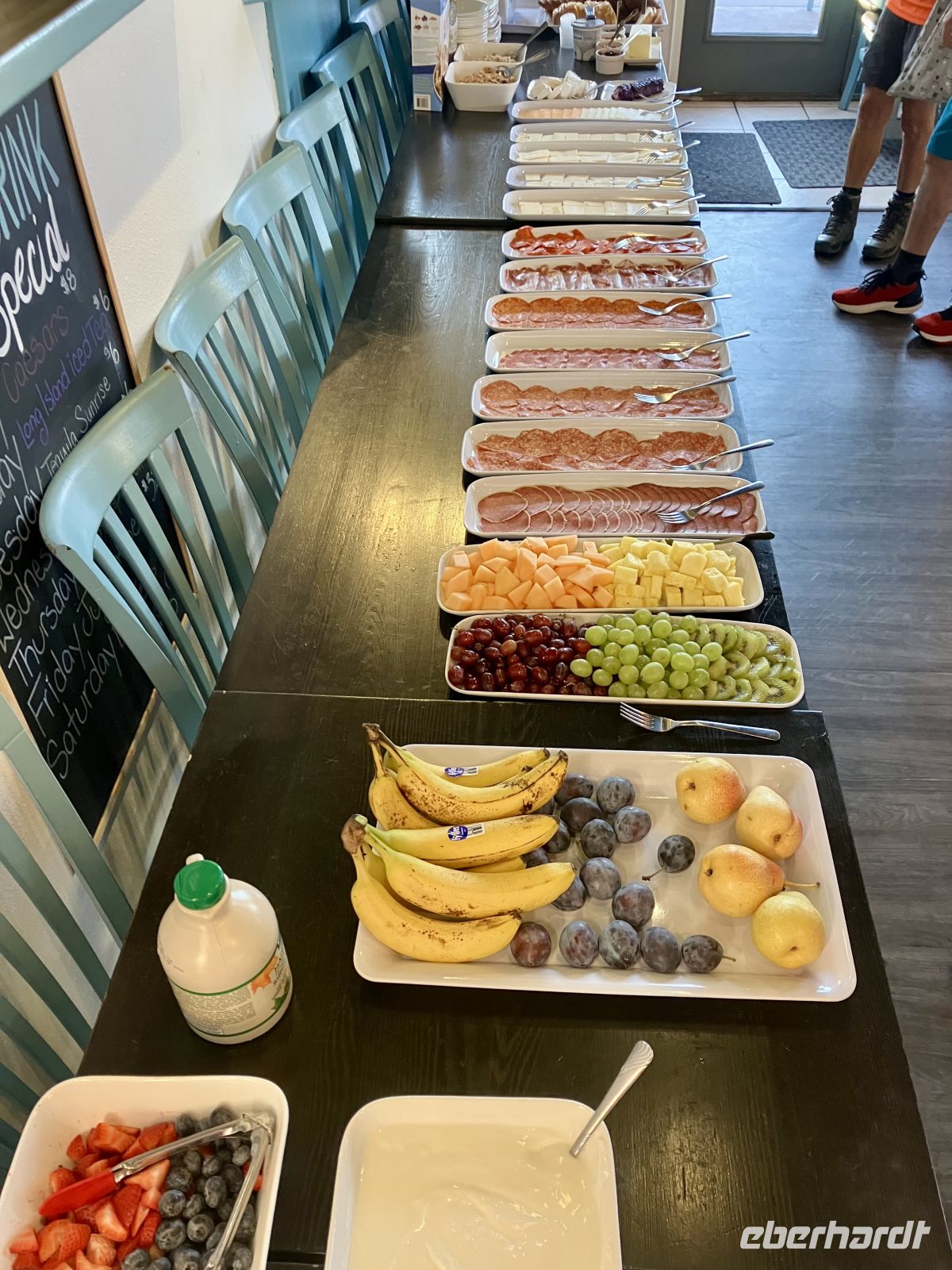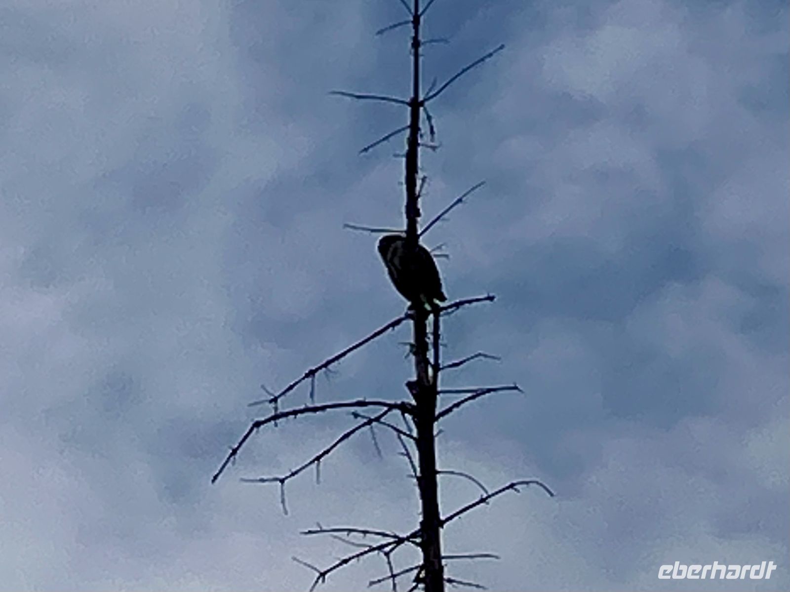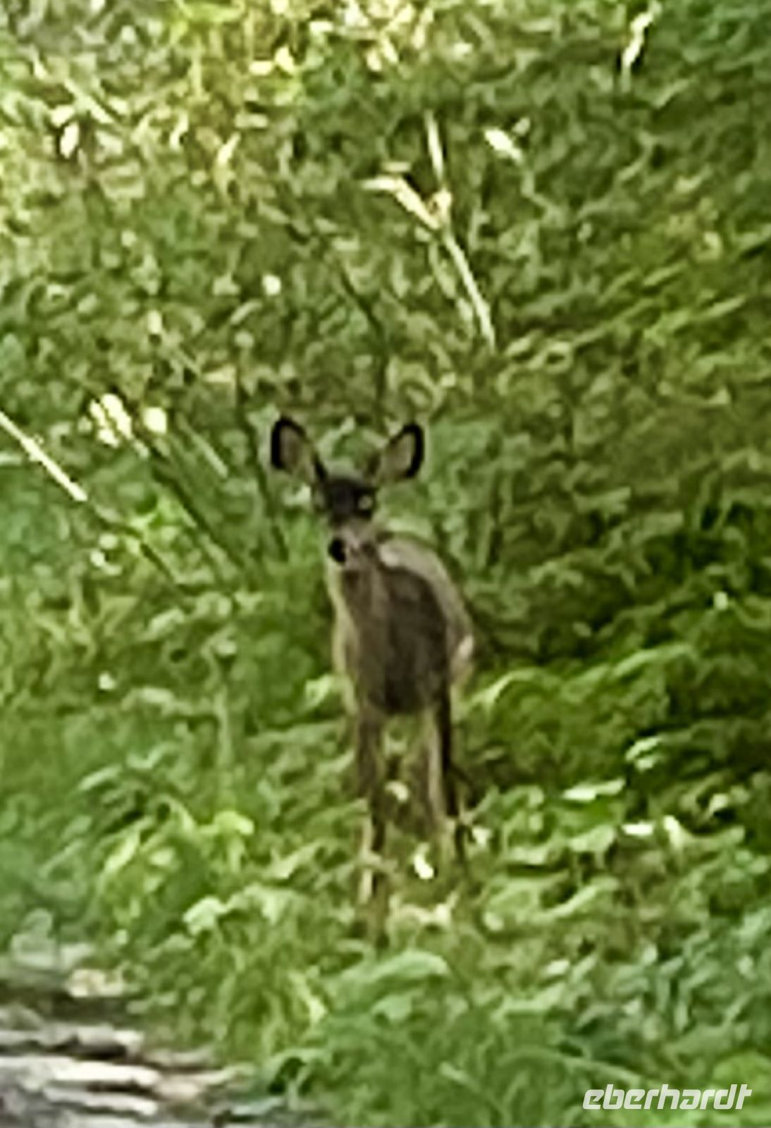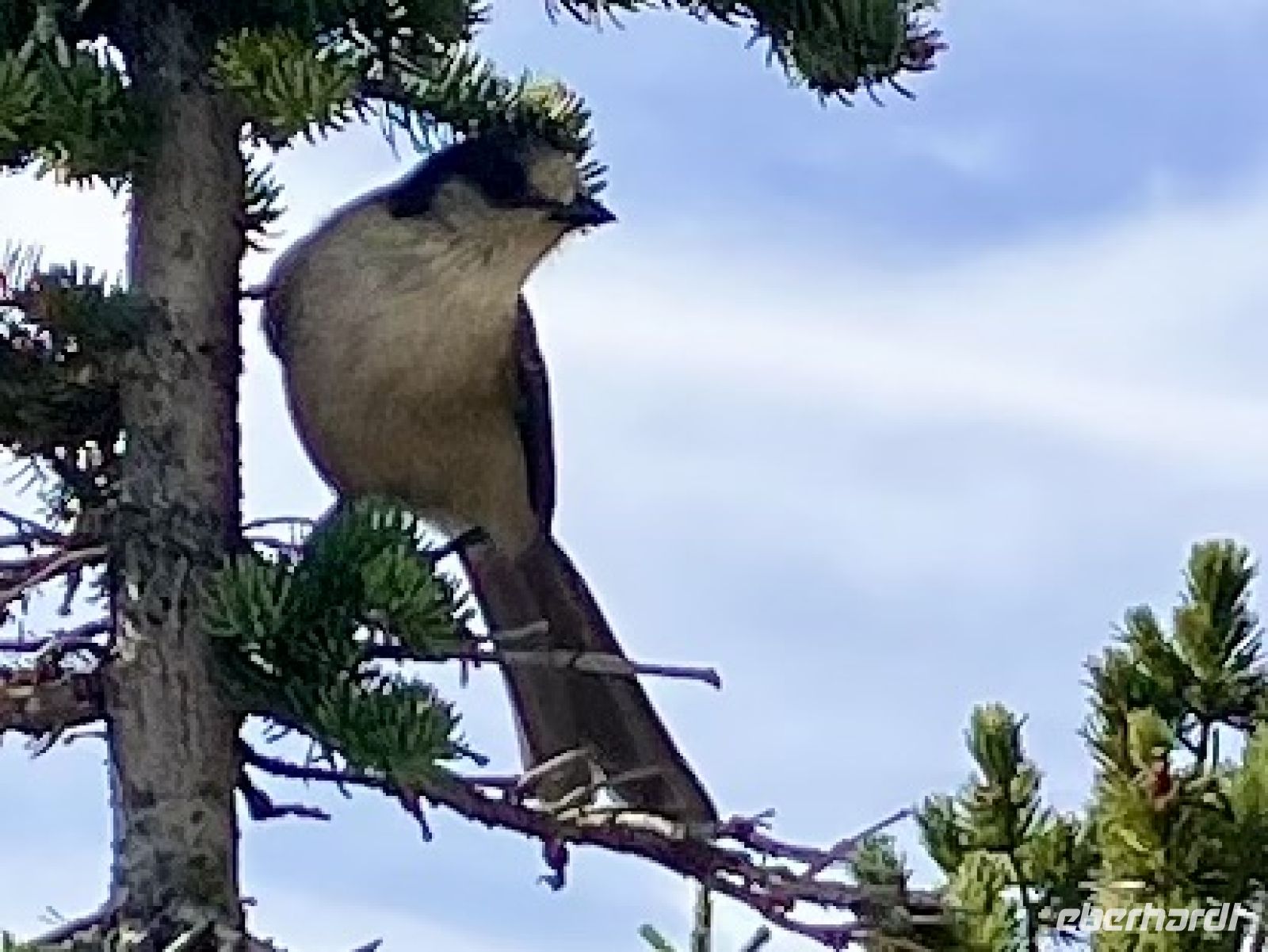 Nach dem schoenen Fruehstueck freuen wir uns nun auf das Maligne Tal und Jasper. Das Wetter ist perfekt. Ein einziges Woelkchen ziert den Himmel und sorgt fuer beste Perspektieve. So fahren wir mit dem Bus keine 2 Minuten und finden sie auch. Ein toller, ausgewachsener aber noch junger Hirsch wetzt sein Geweih im Grass und im Sand, schuettelt sich und wetzt dann wieder. Endlich merkt er, dass wir in dem Bus sitzen der keine 20 Meter von ihm entfernt auf der Strasse steht. So schaut er auf und das tolle Bild, ist in der Fotogalerie zu finden. Einfach toll. Wir lassen ihn mal den Bast entfernen und fahren weiter. Aber keinen Kilometer spaeter sehen wir eine Wapitidame mit Kind rechts und noch mehrere Wapitidmaedchen links. Heute ist wohl Wapiti Ausgang und es ist schoen zu sehen, dass sie nach dem grossen Feuer in Jasper wieder zurueckgekommen sind und sich wieder so benehmen wie vorher. Wir schauen eine Weile zu und fahren dann weiter durch Jasper durch. Es ist ein schmuckes kleines Staedtchen mit einem grossen Bahnhof fuer die Canadian National Railway. Wir werden spaeter noch Zeit haben, das Staedtchen zu erkunden. Der Bahnhof und die Hauptstraße sind noch ganz intakt und immer einen Besuch wert. Wir fahren nicht lange und halten bald wieder an, denn nun sind wir bereits bei Medicine Lake angekommen. Hier gibt es nun den Kurs «Inukshuk-Bau 101». Alle haben sich eingeschrieben, er ist gratis und lustig dazu. Ach, schau dir einer an. Eine kleine Eule sitzt auf einer verbrannten Fichte und schaut auf uns Fotografen runter. Jetzt gehts aber los, mit dem Kurs. Viele groessere und kleinere Steinmaennchen werden vor der herrlichen Kulisse des stillen Sees und der Elizabeth Range gebaut. Einige werden eher gebastelt, andere sind echte Kunstwerke geworden. Der Fantasie sind keine Grenzen gesetzt. Es wird ab sofort zur Eberhard Kunstgalerie und wir werden ab sofort zu Inukshuk Hersteller erkoren. Heuer hat es hier sehr spaerlich geregnet daher sind die Fluesse auf des Sees Boden sehr gut sichtbar. Es ist wunderschoen hier, auch wenn doch die Waelder bloss noch verkohlte Baumstaemme zu bieten haben. Spaeter, beim Maligne Sees machen wir unsere heutige Wanderung dem See entlang und durch den Wald wieder zurueck zur Bootsanlegestelle. Einige bleiben nun hier und picknicken andere wandern noch ein wenig um den See bis zu Rangers Bootshaus. Da nehmen auch wir unser Mittagessen ein und wandern wieder zurueck. Die Bootsfahrt ist einfach toll, Spirit Island ist das heutige Fotomotiv und manch einer knipst sicher auch ein gewinnbringendes Kodak-Foto. Die Berge heben sich so schoen von dem stahlblauen Himmel ab und die Gletscher glitzern weiss wohl um mit den Wölkchen zu konkurrieren. Bitte schaut Euch die Fotogalerie an. Nun ist aber Zeit, und wir fahren wieder zurueck nach Jasper. Oh schaut mal auf Medicine Lake, da ist eine Spur im Wasser und wir sehen tatsaechlich 3 Baeren wie sie durchs Wasser eilen. Die Mama voran und die beiden Jaehrlinge spielend hinterher. Nein, keine Bären es sind Grizzly. Es ist Grizzly 222 die sich und ihre Sproesslinge letzten Sommer im Maligne Canyon versteckte um dem Feuer zu entgehen. So einen tollen Zufall gibt es nicht oft. Wir sind die Gluecklichen, sie ist die Überlebende. Einige unter uns haben sich fuer eine Rafting Tour eingeschrieben. Das ist nun echt lustig und wir raften bald mit Dave den Sunwapta Fluss hinunter, an unserem Hotel vorbei und bis nach Jasper hinein. 5 Schnellen wurden uns angesagt also halten wir uns jeweils an dem aussen angebrachten Seil fest und schauen zu wie das so vor sich geht. Die erste Schnelle hat uns jedoch gelehrt, dass man mit diesem grossen knallroten Gummiboot einfach ueber die Wellen schwebt. So geniessen wir diese Rafting Fahrt sehr. Es ist fast “gemütlich” und wir lachen viel. Die anderen besichtigen in der Zwischenzeit das Dorf. Jasper ist klein und fein mit seinen 6 Liquor Stores und bloss 2 Lebensmittelgeschaeften ! Natuerlich sehen wir heute auch die Stellen mit den abgebrannten Haeuser. Tracy holt dann die Staedtebummler wieder ab und danach die Rafter und faehrt alle wieder in die Beckers Chalets, unser Hotel. Das Abendessen, ist auch heute im Hotel und wieder sehr lecker und sehr schön angerichtet. Wir haben wieder so viel erlebt und unternommen, dass wir fuer nichts mehr Energie aufbringen koennen. Also fluechtet jeder in sein Waldhaeuschen und......Gute Nacht......und tiefen Schlaf.