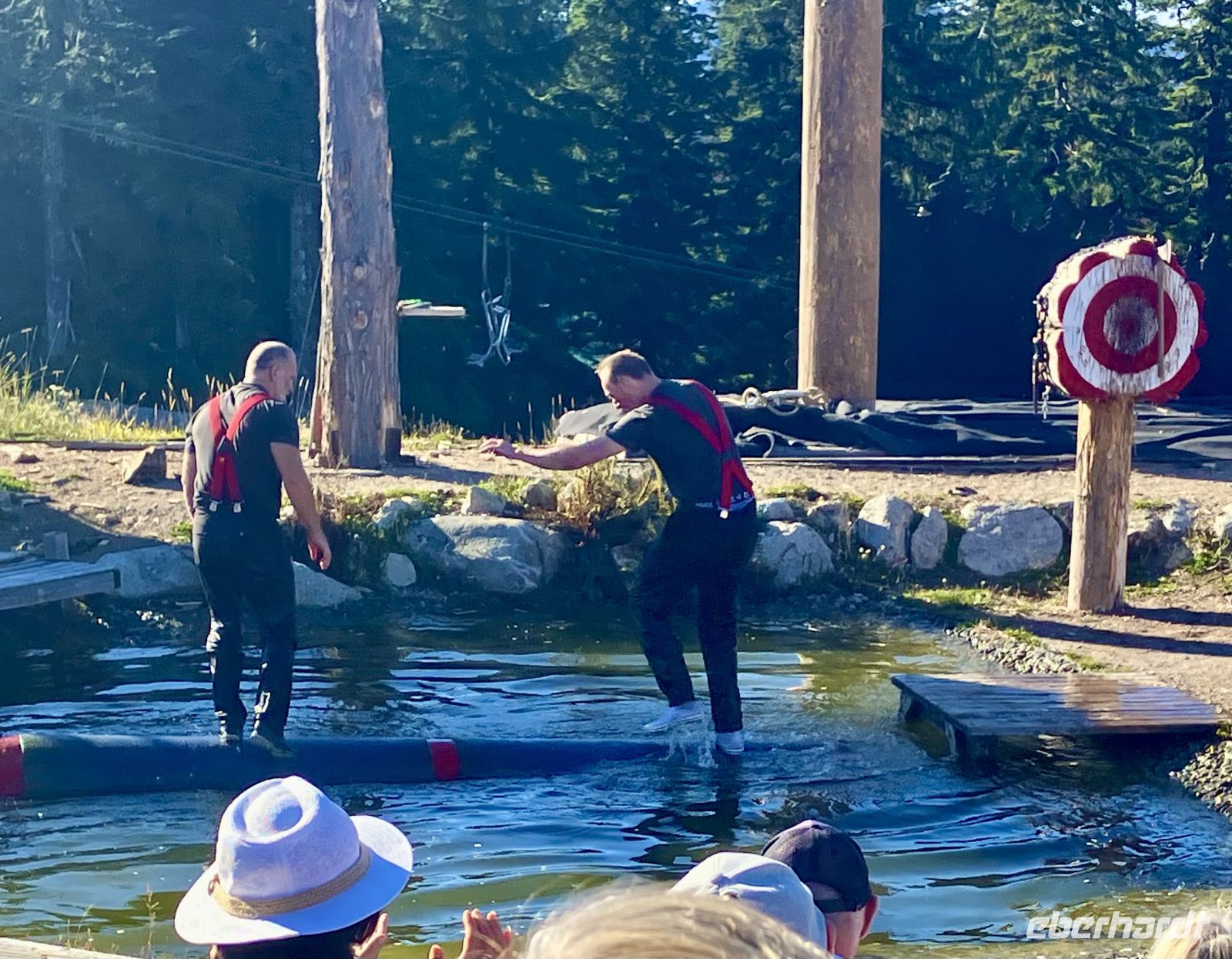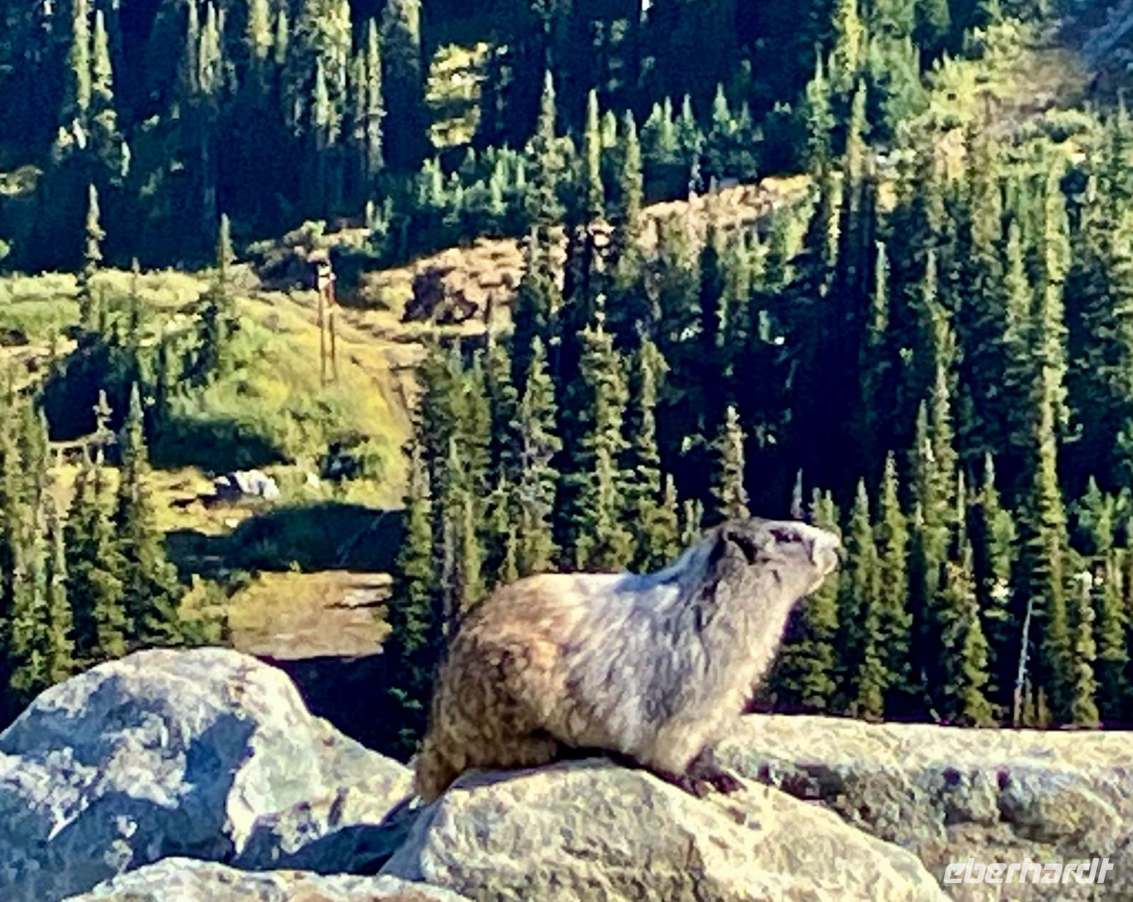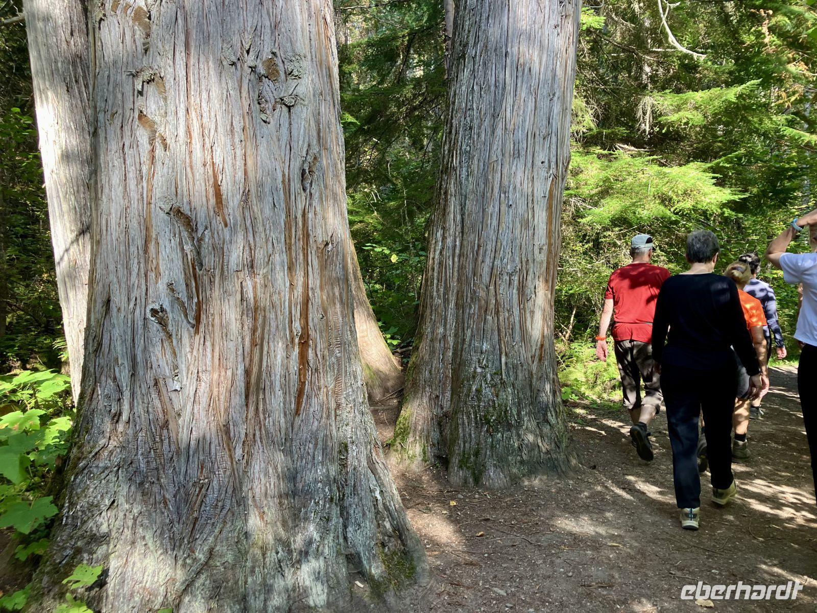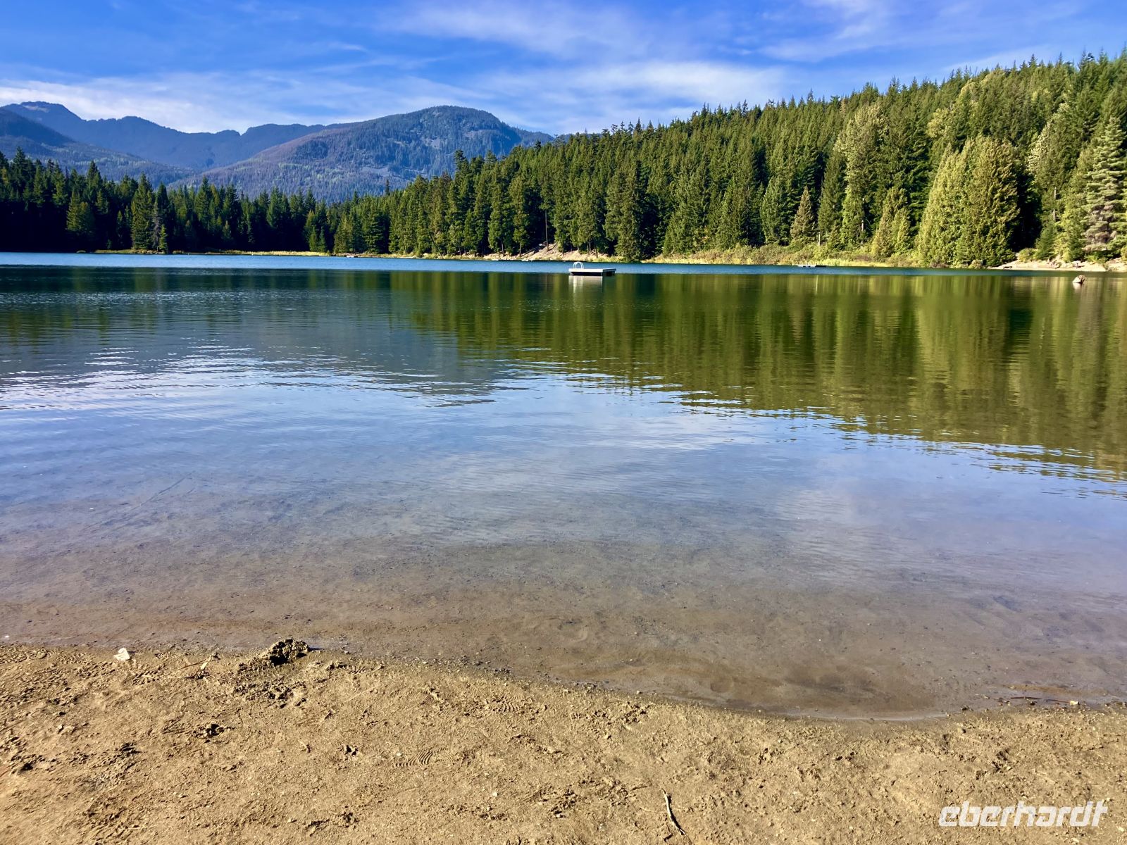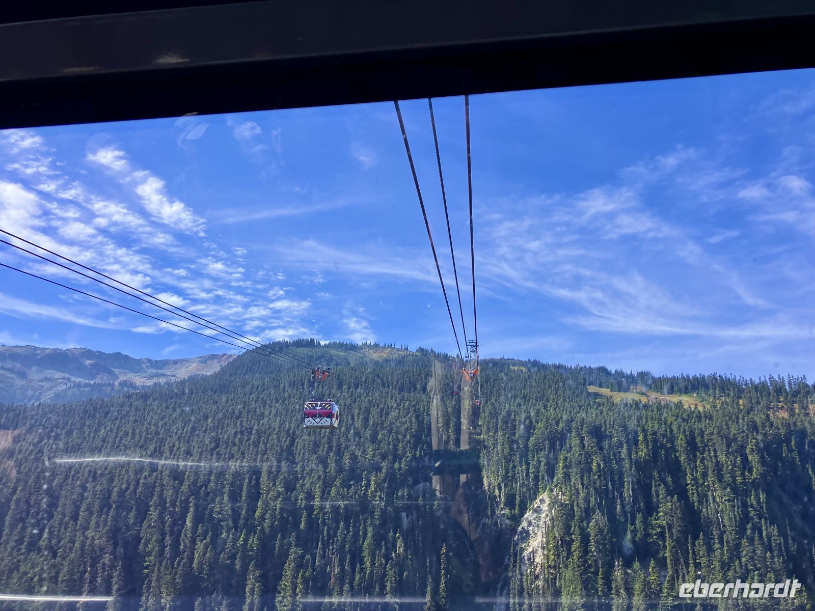Guten Morgen in Whistler. Wirklich…. Ist das wahr….. haben wir so viel Glueck ? Kein einziges Woelkchen am Himmelszelt. Vielleicht gibt es keine Wolken in Kanada. Ein neuer Exportartikel ? Sollen wir ein Startup gruenden ? Fruehstueck gibt es heute in einem nahegelegenen Restaurant. Es gibt ein schoenes gemuetliches Fruehstueck. Gestaerkt gehen wir nun Picknick einkaufen und wandern danach ins upper village zur Blackcomb Gondola. Die Whistler Gondola ist fuer einen Monat gesperrt und wird revidiert. Mit Tageskarte in der Hand, schweben wir mit dieser neuen Gondel hinauf. Da gibt es auch einen Zwischenhalt und wir wollen natuerlich gleich aussteigen, ahhh nein, Elisabeth hat doch gesagt, wir sollen sitzen bleiben bis wir ganz oben auf Blackcomb Mt. sind. Hier oben, auf den Felsen sehen wir gut genaehrte Murmeltiere. Sie sind riesengross und posieren regelrecht fuer uns. Nach dieser bezaubernden Show, gehen wir gleich zur Peak 2 Peak Gondola. Diese schwebende Verbindung der zwei Berge hatte, zur Zeit der Konstruktion, die laengste Seilspanne der Welt und ist nicht nur ein Erlebnis sondern auch ein technisches Spitzenprodukt. Die ganze Gruppe passt in eine Gondel und bald schweben wir hoch ueber dem Fitzsimmons Tal von Blackcomb Mt nach Whistler Mt. Wir sitzen alle in der “Glassbottom Gondola” und sehen daher auch direkt auf das Tal hinunter. Auf Whistler Mt. sehen wir auch schon die Olympiaderinge der Winterspiele 2010. So knipsen wir viele Bilder von dieser prachtvollen Aussicht auf die umliegenden Berge und Gletscher. Bald setzen wir uns wieder in die Peak 2 Peak Gondel zurueck nach Blackcomb Mountain, da wir dort wandern wollen. Der heutige 3-stuendige Wanderweg , schlaengelt sich entlang des Berges. Es ist ein sehr schoener Pfad ueber Stock und Stein mit Sicht auf Whistler Mountain, vorbei an kleinen Seen, immer wieder begleitet von Whisky Jacks und Raben. Die Sicht ist wie von einem Flugzeug aus, einfach fantastisch und die perfekten Bonsai-Tannen und Fichten begleiten uns auf dieser Wanderung. Wir goennen uns auch eine schoene Picknick-Pause an einem groesseren See, dem Blackcomb Lake. Eigentlich wollten wir auch hier baden, aber dieser See ist heuer gruen mit Algen, der Sommer war wohl sehr warm. Das laedt nicht gerade zum baden ein, also wandern wir wieder zurueck zur Gondel mit den trockenen Badehosen aber dieses mal auf einem anderen Weg. Es ist einfach herrlich, hier auf Blackcomb Mountain. Mit der Gondel schweben wir bald darauf wieder ins Dorf hinunter. Unten angekommen, gehen nun einige unter uns zurueck in Richtung Hotel und andere unternehmen mit mir eine Wanderung um Lost Lake herum. Wieder zurueck in Whistler ist nun Freizeit für alle angesagt. Ein Leichtes in einem Ort wie Whistler mit so vielen Geschaeften und Moeglichkeiten.