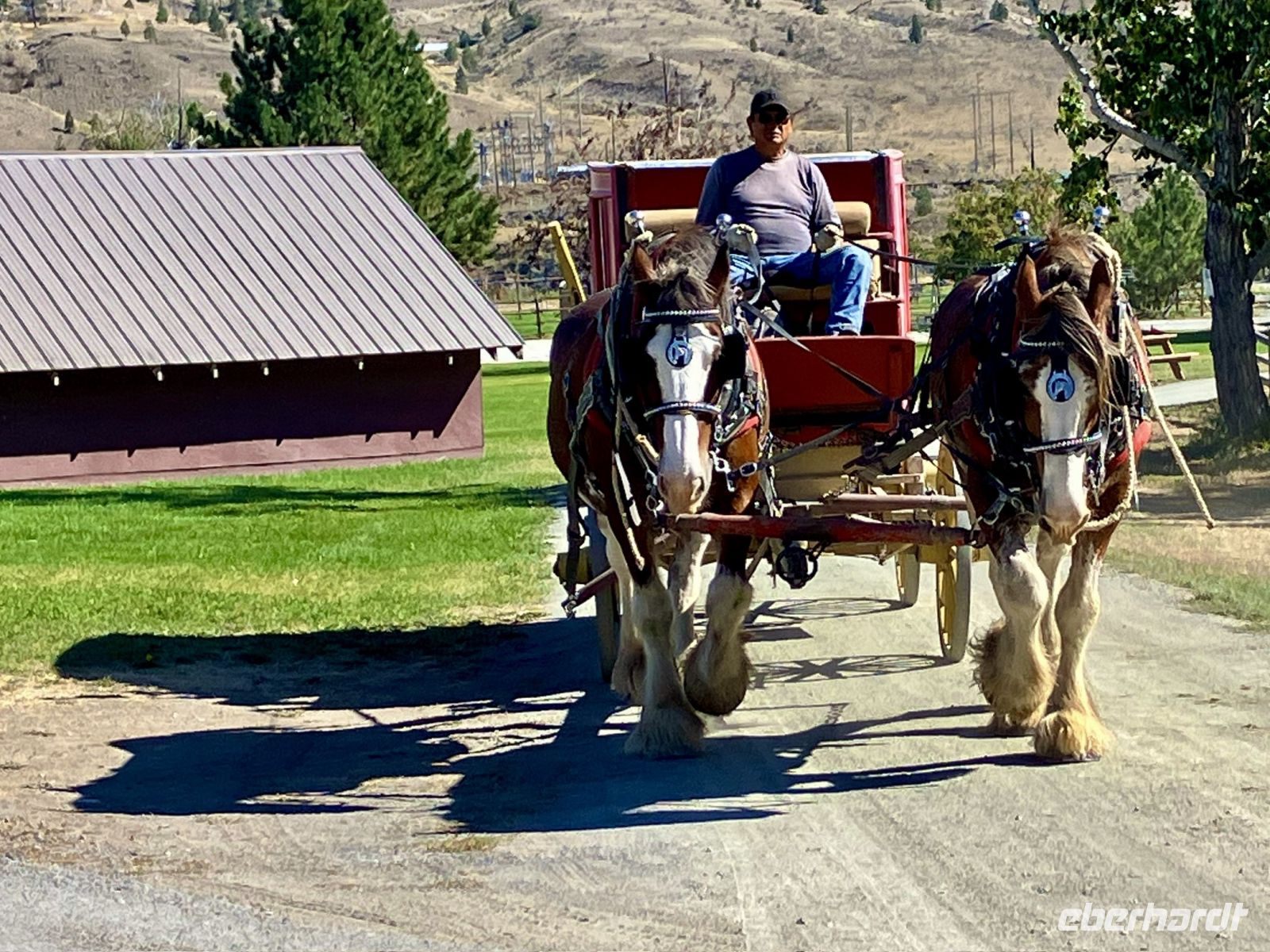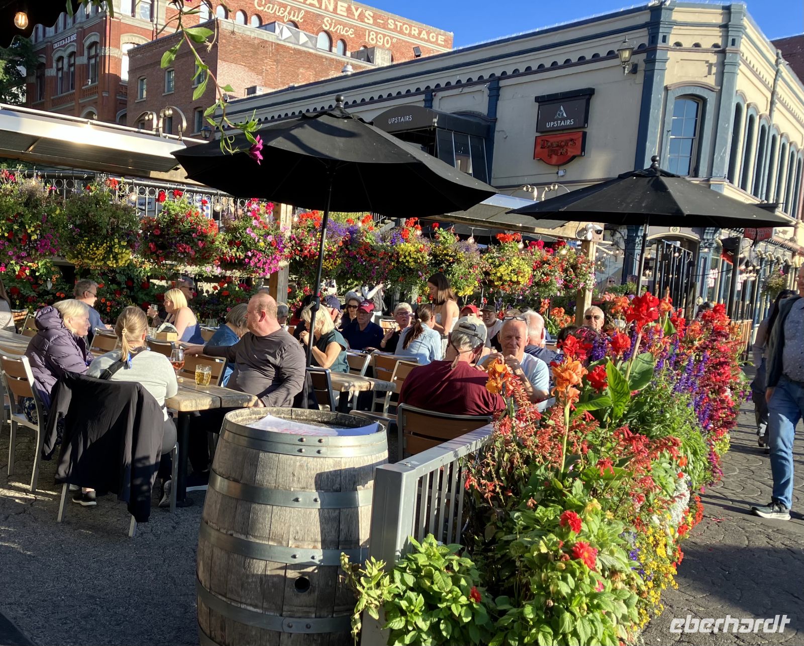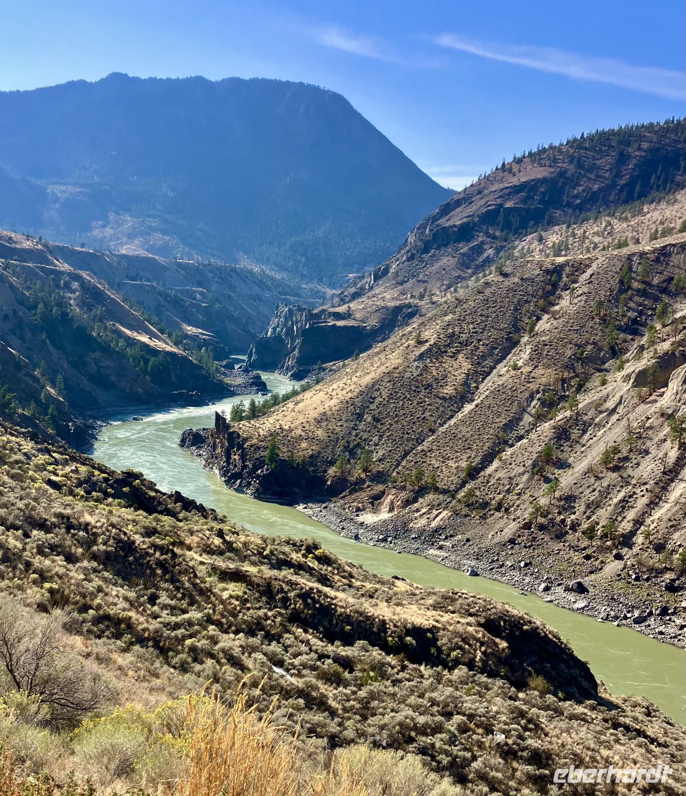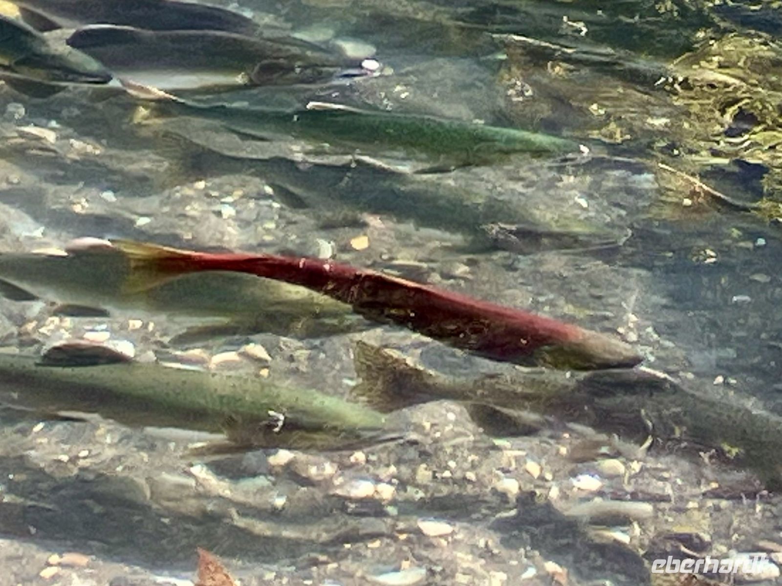 Heute geht unsere Reise von Clearwater nach Whistler. Auf der Fahrt nach Kamloops sprechen wir ueber unsere Pioniere wie Simon Fraser und David Thompson, die Goldgraeber und der verrueckte Goldrausch und die Ersten Nationen. So erreichen wir auch bald Kamloops, wo des Busses Durst gestillt wird. Und unserer auch ! Bald darauf fahren wir an Salzseen vorbei, dem Kamloops Lake und Thompson River entlang bis wir nicht gegen Mittag die historische Hat Creek Ranch erreichen. Dort werden wir schon erwartet und werden von Jordan auf der Cariboo Wagenstrasse zu dem Posthotel begleitet, fast genauso wie die Goldgraeber um 1856. Nun erfahren wir noch mehr ueber die interessante Goldgraeber Zeit in Britisch Columbien. Wir besuchen das Posthotel und bewundern unter anderem die gut erhaltene Seidentapete, die kleinen Zimmer, das englische Porzellan und die Bar mit dem Kartenspiel ohne Nummern auf dem Tisch. Gleich daneben haben die Sushwap Erste Nation eine kleine Kulturstaette aufgebaut. White Dove, unser Begleiterin, ist in traditioneller Kleidung der Sushwap gekleidet und erzaehlt uns in Kuerze Interessantes ueber ihre Kultur und ihre Gebraeuche. Wir hoeren unter anderem, dass sie traditionellerweise im Winter in Kekuli wohnen (das sind Erdbehausungen) und stellen uns nun vor, wie ein Winter in dieser Behausung, mit ca 40 Familienmitglieder wohl sein wuerde...Zu Mittag fahren wir auf einen nahe gelegenen Markt. Da gibt es ausser unzaehligen Kuerbisen auch feine kleine Speisen. Essen kann man auf der Veranda inmitten eines Obstgartens. Nach dem wohlverdienten Mittagsschlaefchen im Bus erreichen wir Fraser Canyon. Die Strasse klebt geradezu am Abhang dieser Schlucht, aber Tracey faehrt uns sicher und geduldig nach Lillooet. Bei Seaton Creek sehen wir endlich laichende Lachse, in dem Cayoosh Fluesschen kommen mehrere Lachsarten zusammen. Wir sehen sogar einige Sockey Lachse die so schoen rot und gruen gefaerbt sind. Am Strand von Seaton Lake, da wo die Lachse wie wild springen, organisieren wir nun eine Weinverkostung von vier verschiedenen Weinsorten aus Kanada. Ich glaube der Shiraz, welcher im Mondschein geerntet wird, hat dies Rennen gewonnen. Ja, der gute Padre Pandossi hatte damals eine gute Idee, hier in Kanada Wein anzupflanzen. Was vor 20 Jahren noch eher nach Essig roch wird heute auch international ausgezeichnet. Leicht angeheitert geht es auf die Duffy Lake Road, auch die Rock‘n Roll Strasse genannt, da sie, aehnlich einer Passtrasse, das wasserarme Mittelland verlaesst und nach tausenden von abenteuerlichen Kurven das Kuestengebirge erreicht. Tracey entpuppt sich nun als echter Kurvenkoenig. Whistler ist unser Ziel und wir kommen auch zeitlich gerecht an. Dieses Olympiadorf und Spielwiese der Vancouver-iten, hat eine Fussgaengerzone die wir gleich erforschen. Elisabeth hat hier auch 2 Jahre gelebt und gibt uns alle Insider Tips. Sie erzaehlt uns auch von den Mountain Biker und wie sie die Pisten hinuntersaussen in ihren kriegerischen Ausruestungen. Wir koennen den morgigen Tag kaum erwarten. In Whistler ist was los, so viele junge Leute beleben dieses Dorf, es jagen sich geradezu Bars, Restaurants, Sportgeschaefte, Clubs und Pubs. Jeder findet auch «sein» Restaurant. Es ist noch nicht Wochenende, aber jeder feiert bis lange in die Nacht hinein. Nur gut, dass unser Hotel laermgedaemmte Fenster hat. Oder sollen wir nicht doch in so eine wilde Bar gehen und einfach mitfeiern ?