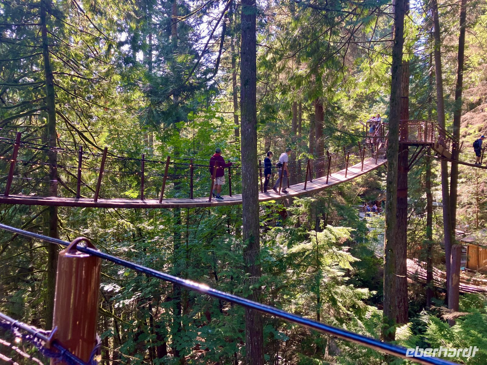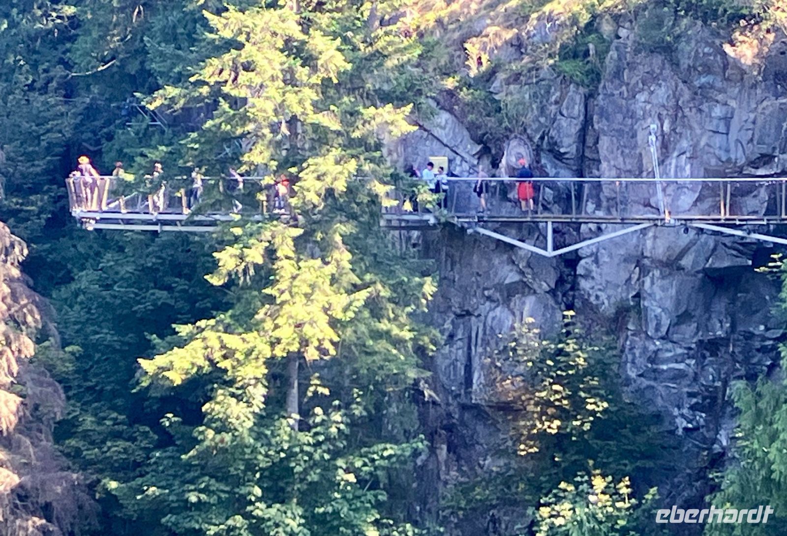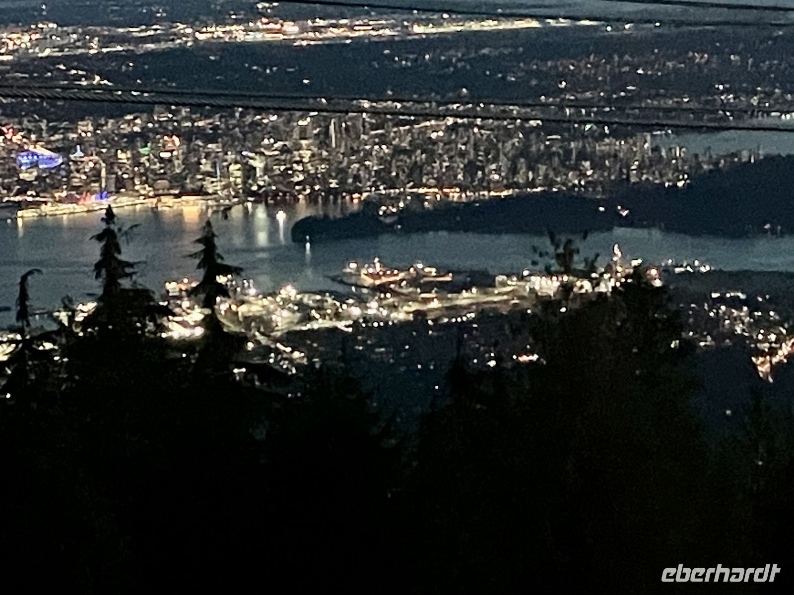 Nach dem Fruehstueck steht auch schon Hathwinder, unser neuer Fahrer vor dem Hotel. Er faehrt uns nach North Vancouver den Capilano Fluss und Park hinauf bis zu einem Stausee. Beim Cleaveland Dam halten wir, steigen aus und machen auch gleich eine schoene Wanderung in dem tollen Capilano Park und sehen wieder Urbaeume. Tolle Zedern, Douglasien und Hemlocktannen die weit zum Himmel ragen schauen auf uns nieder. Die Wanderung bringt uns zum Capilano Fluss und danach ueber eine Bruecke, in die Fischaufzucht-Anlage. Hier lernen wir wieder vieles ueber die Lachse. Wegen des Dammes werden die zurückkehrende Lachse hier auf eine Fischleiter geleitet wo man die Fischeier haendisch befruchtet und die kleinen Fischchen in grossen Tanks aufzieht bis sie nicht so weit sind, dass man sie dem Fluss wieder zurueckgeben kann, sodass die Junglachse auch wieder auf die grosse Lebensreise gehen koennen. Auch sie werden, viele Jahre spaeter wieder auf diese selbe Fischleiter geleitet, damit auch sie wieder laichen koennen. Nun aber gehts weiter, die beruehmte Haengebruecke will besichtigt und unser Mut getestet werden. Schon ganz schoen beeindruckend diese Bruecke, und besonders diese anderen Leute die da alle darauf umidum wackeln. Wir machen uns einen Spass daraus, indem wir versuchen ohne uns am Geländer anzuhalten ueber diese wackelige, hohe und lange Haendebruecke zu gehen. Gar nicht einfach bei dem schaukeln. Sowie die anderen Touristen kommen, gehen, stehen und fotografieren auch wir. Wir schaffen es alle und haben promoviert den Baumwipfelweg zu unternehmen. Das ist nun wirklich imposant und wir knipsen wieder tolle Bilder. Um zur Mittagspause zu gelangen, muessen wir nun wieder ueber die verrueckte Haengebruecke, der Magen knurrt jedoch so wild, dass wir uns dem Schicksal einfach hingeben, wir sind ja nun geuebt. Nun beginnt das naechste Abenteuer. Der neueste Felssteig in diesem Park wartet bereits auf uns. Wir sind gut, wir koennen das. Der Steig ist an der Felswand angebracht und man kann sogar in die Tiefe der Schlucht durchschauen. Wir werden beim Ausgang auch mit einem händische unterschriebenen Zertifikat belohnt, welches wir zu Hause natuerlich rahmen und aufhaengen werden. OK, bloss im Gaesteklo ! Nun aber weiter zu Grouse Mountain. Hinauf mit den neuen kleinen Gondeln auf den 1250 Mt hohen Skiberg der Vancouveriten. Vorerst eilen wir gleich zu Coola und Grinder. Oben auf Grouse Mountain leben sie, es handelt sich um die 2 Grizzly-Jungs, die vor 26 hier als Waisenkinder aufgenommen wurden. In einem grossen Gehege leben die beiden und zeigen sich heute von der besten Seite. Coola schwimmt in seinem kleinen See und spielt mit einem Ast. Er kann sogar Rueckenschwimmen ! Grinder zeigt jedoch seinen Balance Akt und taenzelt mit seinen 400 Kg auf einem Holzstamm ueber den anderen See. Bravo ! Es ist bereits Herbst, ja es scheint die Sonne schoen warm und die beiden erhalten gerade wieder Zusatznahrung. Im Moment ist es organisches Trockenfutter. In der Frueh waren es Beeren und Aepfel und am Abend gibts dann Lachs auf ihrem Menu. Das Futter wird ihnen immer naeher ihrer Wintertenne gegeben, so gewoehnen sie sich langsam wieder an die Tenne. Wir beobachten Grinder und Coola eine Weile schauen ihnen zu wie sie essen, trinken und spielen. Nach dieser tollen Beobachtung fahren wir mit einer Sesselbahn auf die Bergspitze und ergoetzen uns der tollen Aussicht auf die Stadt. Sogar Mount Baker kann man heute gut sehen. Er zeigt uns seine schwebende, von Gletscher ueberzogene Bergspitze. Jetzt aber wieder runter denn bald gibt es die Holzhacker Show. Ach wie lustig, wir schauen den beiden Holzarbeiter zu, wie sie sich im Kettensaegen- und Holzhacken-Wettbewerb auseinandersetzen. Wie sie auf hohe Pfaehle klettern und wie sie auf schwimmendem Holz stehend, versuchen einander ins Wasser zu schmeissen. Alles ist sehr unterhaltsam und bald darauf werden wir zum Dinner geladen. Unser elegantes Abschiedsessen nehmen wir hier oben in dem Luxusrestaurant in unser Wanderbekleidung ein. Toll, wenn man sich so verwoehnen lassen kann. Alles schmeckt vorzueglich, wird bestens serviert und ist schoen hergerichtet sodass jeder von seinem Teller auch Fotos machen muss. Aber nicht bloss von den Speisen denn auch die Aussicht ruft staendig nach Beachtung. Wir erleben einen besonders schoenen Abend mit besonders schoenem Sonnenuntergang. Bei der Talfahrt mit der Gondel schauen wir nochmals auf die hell erleuchtete Stadt hinunter. Wie schoen doch dies Vancouver ist. Unten angekommen, steht auch wieder ein Bus fuer uns bereit. Lovedeet ist nun unsere charmante Fahrerin die uns wieder zum Hotel zurueckfaehrt. Auch heute geht ein gelungener, toller Tag zu Ende und wir denken natuerlich bereits an den langen Flug morgen und wie wir all die gekaufte Ware wohl im Koffer verstauen wollen.