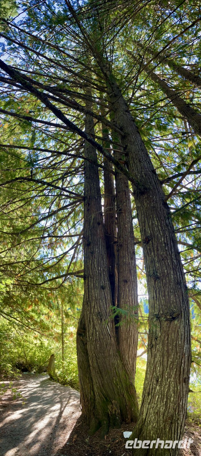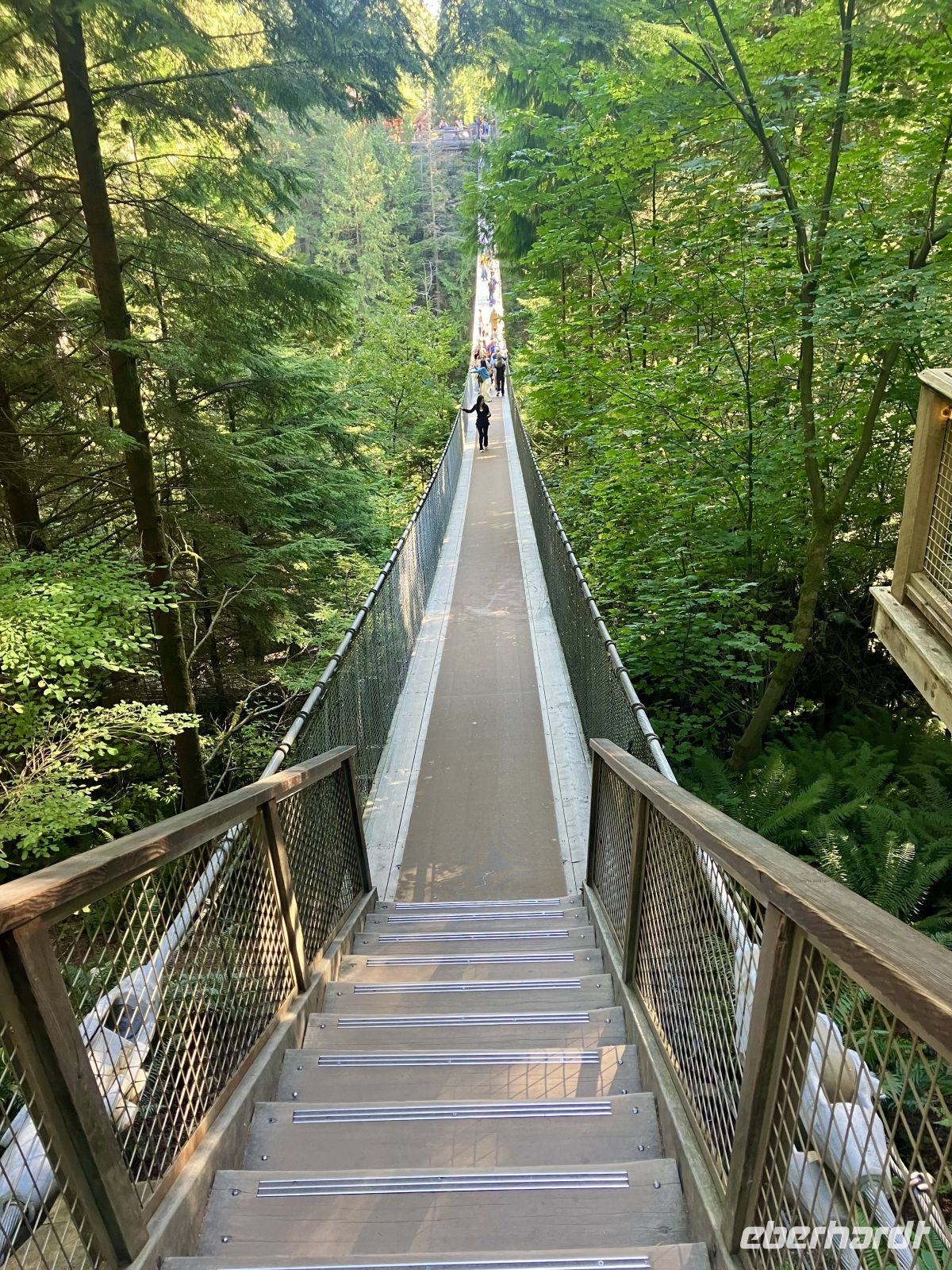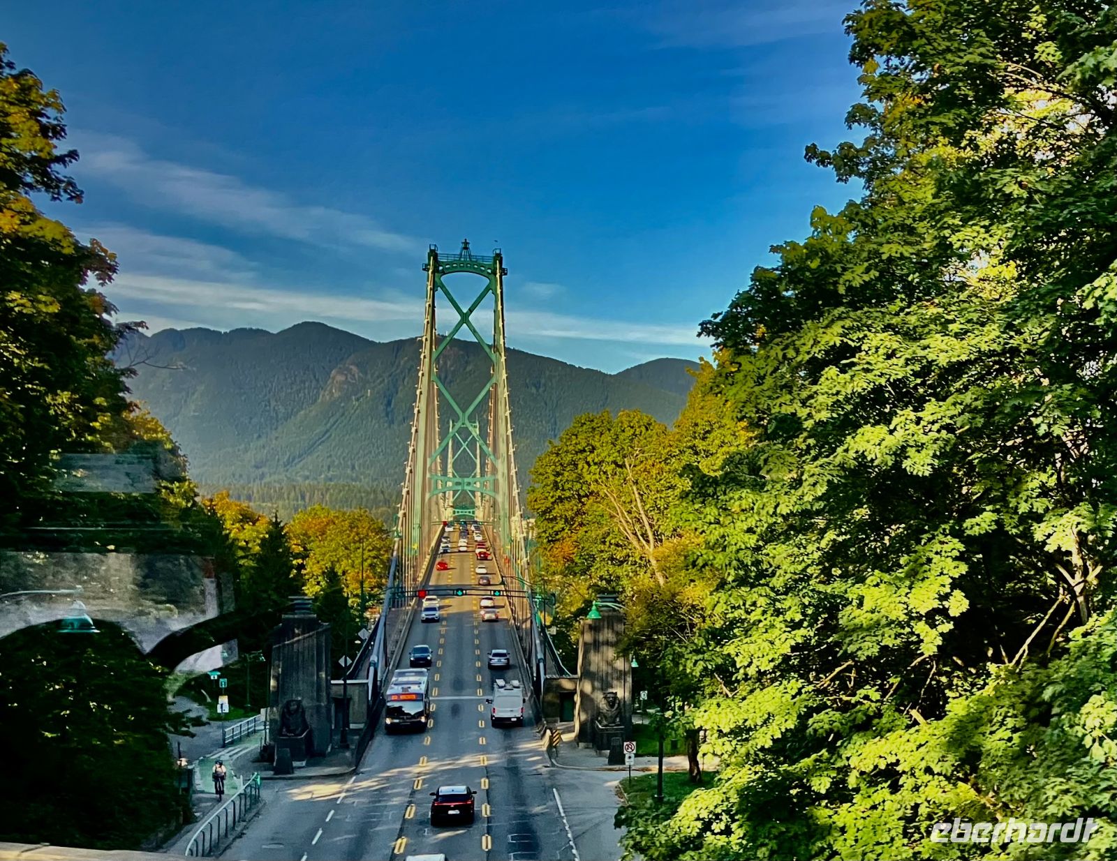 Nach dem Fruehstueck steht auch schon Hathwinder, unser neuer Fahrer vor dem Hotel. Er faehrt uns nach North Vancouver den Capilano Fluss und Park hinauf bis zu einem Stausee. Beim Cleaveland Dam halten wir, steigen aus und machen auch gleich eine schoene Wanderung in dem tollen Capilano Park und sehen wieder Urbaeume. Tolle Zedern, Douglasien und Hemlocktannen die weit zum Himmel ragen schauen auf uns nieder. Die Wanderung bringt uns zum Capilano Fluss und danach ueber eine Bruecke, in die Fischaufzucht-Anlage. Hier lernen wir wieder vieles ueber die Lachse. Wegen des Dammes werden die zurückkehrende Lachse hier auf eine Fischleiter geleitet wo man die Fischeier haendisch befruchtet und die kleinen Fischchen in grossen Tanks aufzieht bis sie nicht so weit sind, dass man sie dem Fluss wieder zurueckgeben kann, sodass die Junglachse auch wieder auf die grosse Lebensreise gehen koennen. Auch sie werden, viele Jahre spaeter wieder auf diese selbe Fischleiter geleitet, damit auch sie wieder laichen koennen. Nun aber gehts weiter, die beruehmte Haengebruecke will besichtigt und unser Mut getestet werden. Schon ganz schoen beeindruckend diese Bruecke, und besonders diese anderen Leute die da alle darauf umidum wackeln. Wir machen uns einen Spass daraus, indem wir versuchen ohne uns am Geländer anzuhalten ueber diese wackelige, hohe und lange Haendebruecke zu gehen. Gar nicht einfach bei dem schaukeln. Sowie die anderen Touristen kommen, gehen, stehen und fotografieren auch wir. Wir schaffen es alle und haben promoviert den Baumwipfelweg zu unternehmen. Das ist nun wirklich imposant und wir knipsen wieder tolle Bilder. Um zur Mittagspause zu gelangen, muessen wir nun wieder ueber die verrueckte Haengebruecke, der Magen knurrt jedoch so wild, dass wir uns dem Schicksal einfach hingeben, wir sind ja nun geuebt. Nun beginnt das naechste Abenteuer. Der neueste Felssteig in diesem Park wartet bereits auf uns. Wir sind gut, wir koennen das. Der Steig ist an der Felswand angebracht und man kann sogar in die Tiefe der Schlucht durchschauen. Wir werden beim Ausgang auch mit einem händische unterschriebenen Zertifikat belohnt, welches wir zu Hause natuerlich rahmen und aufhaengen werden. OK, bloss im Gaesteklo ! Nun aber weiter zu Grouse Mountain. Hinauf mit den neuen kleinen Gondeln auf den 1250 Mt hohen Skiberg der Vancouveriten. Vorerst eilen wir gleich zu Coola und Grinder. Oben auf Grouse Mountain leben sie, es handelt sich um die 2 Grizzly-Jungs, die vor 26 hier als Waisenkinder aufgenommen wurden. In einem grossen Gehege leben die beiden und zeigen sich heute von der besten Seite. Coola schwimmt in seinem kleinen See und spielt mit einem Ast. Er kann sogar Rueckenschwimmen ! Grinder zeigt jedoch seinen Balance Akt und taenzelt mit seinen 400 Kg auf einem Holzstamm ueber den anderen See. Bravo ! Es ist bereits Herbst, ja es scheint die Sonne schoen warm und die beiden erhalten gerade wieder Zusatznahrung. Im Moment ist es organisches Trockenfutter. In der Frueh waren es Beeren und Aepfel und am Abend gibts dann Lachs auf ihrem Menu. Das Futter wird ihnen immer naeher ihrer Wintertenne gegeben, so gewoehnen sie sich langsam wieder an die Tenne. Wir beobachten Grinder und Coola eine Weile schauen ihnen zu wie sie essen, trinken und spielen. Nach dieser tollen Beobachtung fahren wir mit einer Sesselbahn auf die Bergspitze und ergoetzen uns der tollen Aussicht auf die Stadt. Sogar Mount Baker kann man heute gut sehen. Er zeigt uns seine schwebende, von Gletscher ueberzogene Bergspitze. Jetzt aber wieder runter denn bald gibt es die Holzhacker Show. Ach wie lustig, wir schauen den beiden Holzarbeiter zu, wie sie sich im Kettensaegen- und Holzhacken-Wettbewerb auseinandersetzen. Wie sie auf hohe Pfaehle klettern und wie sie auf schwimmendem Holz stehend, versuchen einander ins Wasser zu schmeissen. Alles ist sehr unterhaltsam und bald darauf werden wir zum Dinner geladen. Unser elegantes Abschiedsessen nehmen wir hier oben in dem Luxusrestaurant in unser Wanderbekleidung ein. Toll, wenn man sich so verwoehnen lassen kann. Alles schmeckt vorzueglich, wird bestens serviert und ist schoen hergerichtet sodass jeder von seinem Teller auch Fotos machen muss. Aber nicht bloss von den Speisen denn auch die Aussicht ruft staendig nach Beachtung. Wir erleben einen besonders schoenen Abend mit besonders schoenem Sonnenuntergang. Bei der Talfahrt mit der Gondel schauen wir nochmals auf die hell erleuchtete Stadt hinunter. Wie schoen doch dies Vancouver ist. Unten angekommen, steht auch wieder ein Bus fuer uns bereit. Lovedeet ist nun unsere charmante Fahrerin die uns wieder zum Hotel zurueckfaehrt. Auch heute geht ein gelungener, toller Tag zu Ende und wir denken natuerlich bereits an den langen Flug morgen und wie wir all die gekaufte Ware wohl im Koffer verstauen wollen.