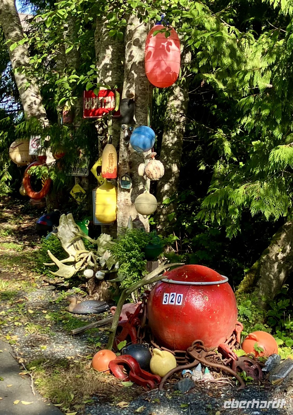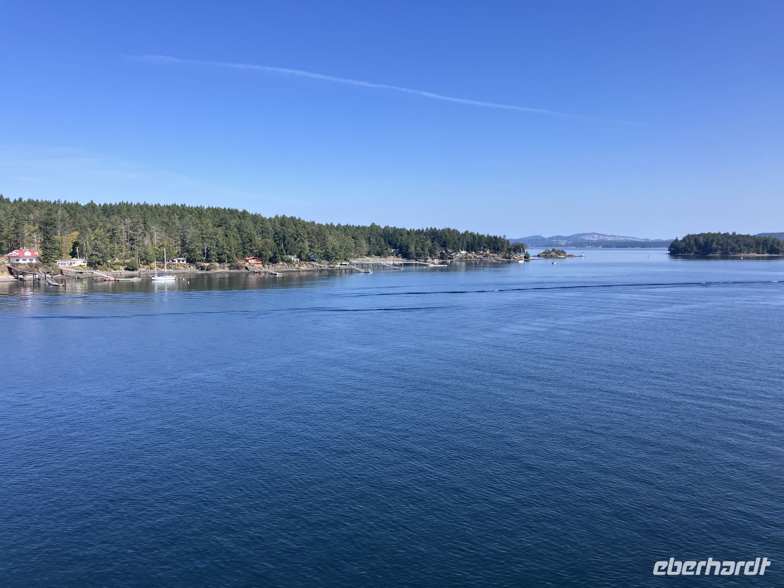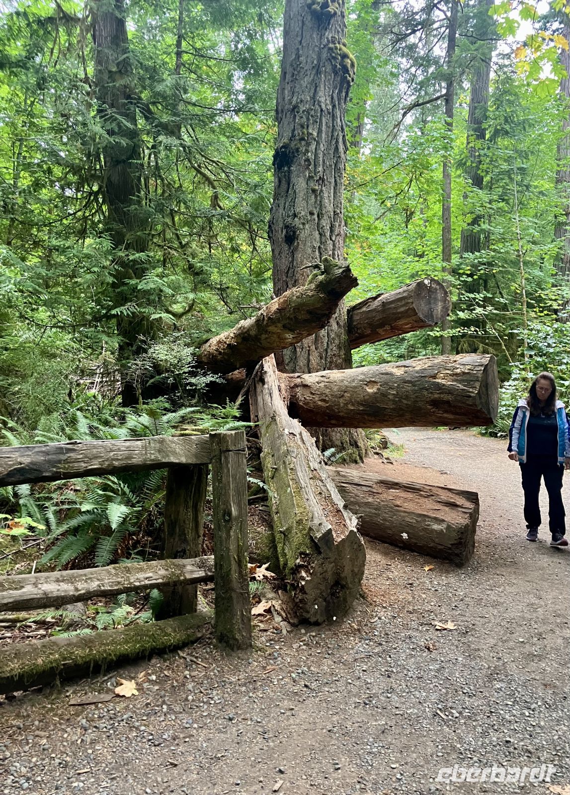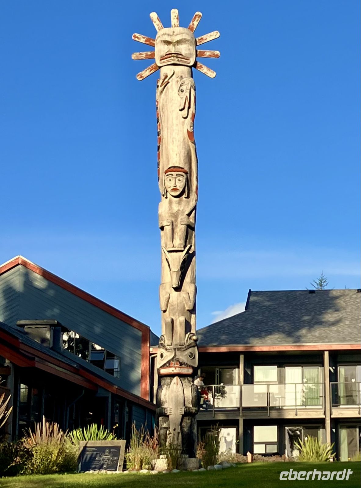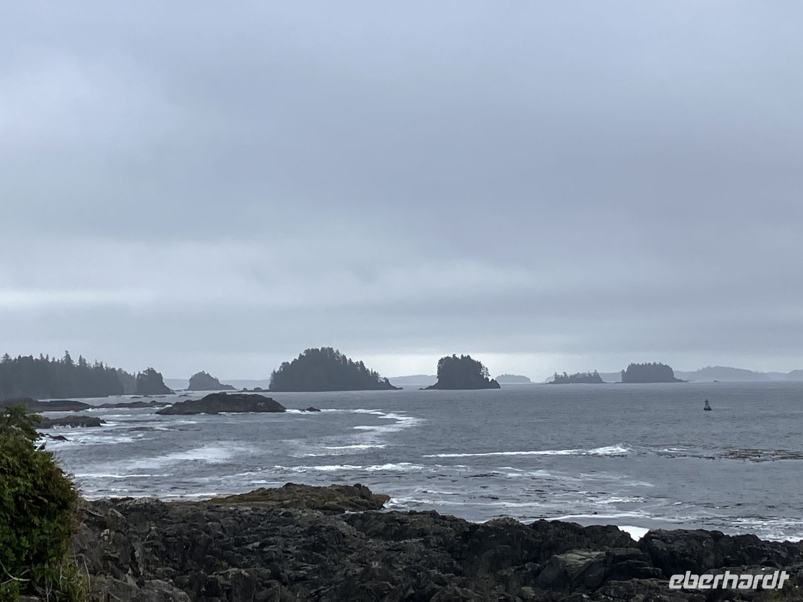 Aufgewacht, Augen geoeffnet und nach draussen geschaut. Ich konnte den Augen kaum trauen, es gibt sie, die Wolken, es zeigen sich heute, gleich 2 Wolken am Himmel. Kaum zu glauben. Aber das ist OK, da wir viele Kilometer zuruecklegen muessen und unsere Kamera auch mal Urlaub machen moechte. Nach dem Fruehstueck fahren wir auf der Sea to Sky Highway zuegig in Richtung Vancouver. Ja diese Olympiade 2010 hat hier viele Veraenderungen hervorgerufen, die Strasse ist PicoBello. Wir halten auch bei den Tantalus Bergen an, denn nun wird das letzte Foto von Gletschern und Eisfelder dieser Reise geschossen. Naechster Halt ist Horseshoe Bay, das ist einer der zwei Faehrehafen fuer die vielen Faehren welche Vancouver mit Vancouver Island verbinden. Die Faehre bringt uns in 1 Stunde 35 Minuten auf die Insel von Vancouver. Wir fahren gleich mit dem Bus auf die Faehre und steigen aus, um dem Auslaufen beizuwohnen. In der Ferne kann man die Hochhaeuser von Vancouver sehen. Die Perle des Pazifiks werden wir jedoch erst in 4 Tagen besuchen ! Wir wollen heute nach Tofino, es liegt an der Westkueste der Insel. Der kurze Stop beim Markt in Coombs ist unterhaltsam, die Ziegen stehen auf dem Markthallendach die Kundschaft in dem Markt. Leute, Geschäfte, Markt und Ziegen, alles ist farbenfroh wie die angepriesene Ware. Das Eis schmeckt auch vorzueglich wenn es auch etwas zu grosszuegig ausgefallen ist. Die ½ Stunde vergeht flugs, da es hier so viel anzuschauen gibt. Waeren die Koffer nicht schon so voll, haetten wir gerne so einen Riesenbudda fuer den lieben Nachbarn, ein Holzspielzeug fuer die Enkelchen oder einen handgefertigten Tontopf fuer den eigenen Garten mitgebracht. Leider, leider. Fuers T-shirt und Picknick morgen hats gerade noch gereicht. Spaeter gehen wir ganz vertraeumt in einem Urwald spazieren. Die Riesen schauen auf uns Zwerge hinunter und viele Baeume sind von Moos so umgeben, es scheint sie haetten Pelzmaentel an. Jetzt fahren wir aber weiter, denn die Strecke nach Tofino zieht sich immer in die Laenge. Uuups, es schuettet nun wirklich heftig, aus den 2 Wolken wurde eine ganze Wolkendecke und dies sehr dunkel. Wir durchqueren die ganze Insel von Vancouver um an die Westkueste zu gelangen. Dort angekommen, gehen wir gleich mal an einen wilden Strand. Ahh die Luft, das Meer, es riecht herrlich aber der Regen ist nun so heftig, dass wir ganz schnell wieder im Bus verschwinden. Bald sind wir bei unserem Hotel und checken auch gleich ein. Dies Hotel wird von “First Nations” gefuehrt, es liegt idyllisch an einem tollen Strand mit Felschen davor die sogar Baeume drauf haben. Jedes Zimmer hat eine herrliche Aussicht auf den gepflegten Park, den Strand, das offene Meer und den kleinen, vorgelagerten Inselen. Ach, koennten wir hier in den grossen Zimmer nicht gleich eine Woche Urlaub einplanen ? Abendessen gehen wir heute gemeinsam im Restaurant welches sich im Hotel befindet. Tische und Speisenauswahl ist bereits vororganisiert. So verbringen wir einen schoenen Abend im triefenden Regen und schlafen später wie die Herrgoettchen.