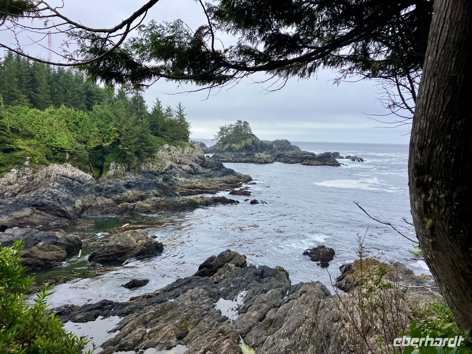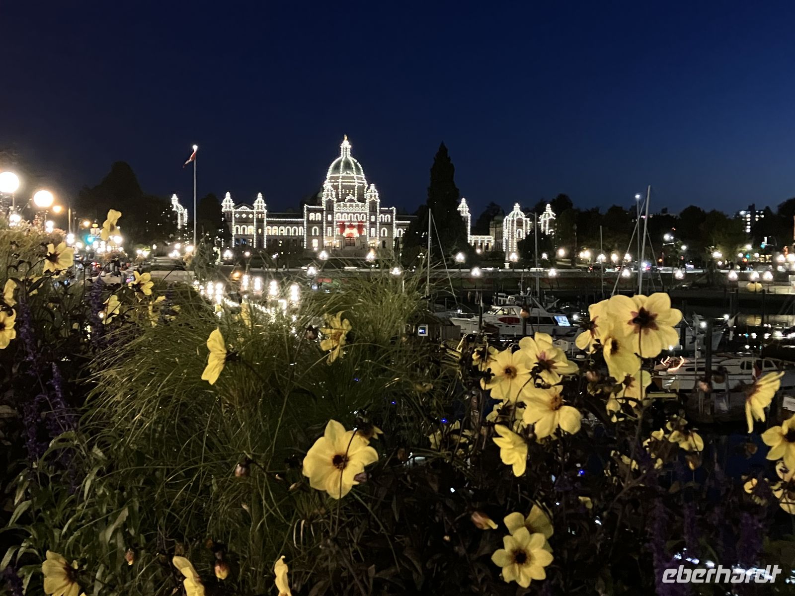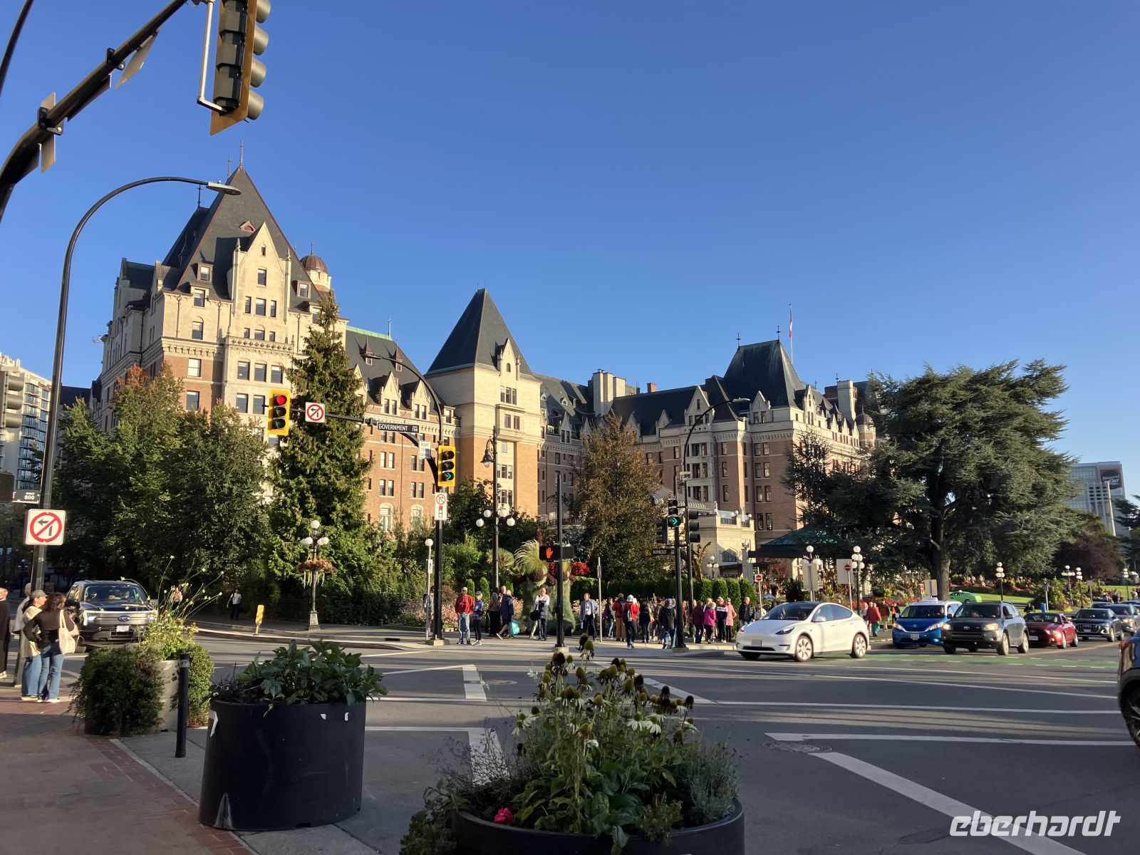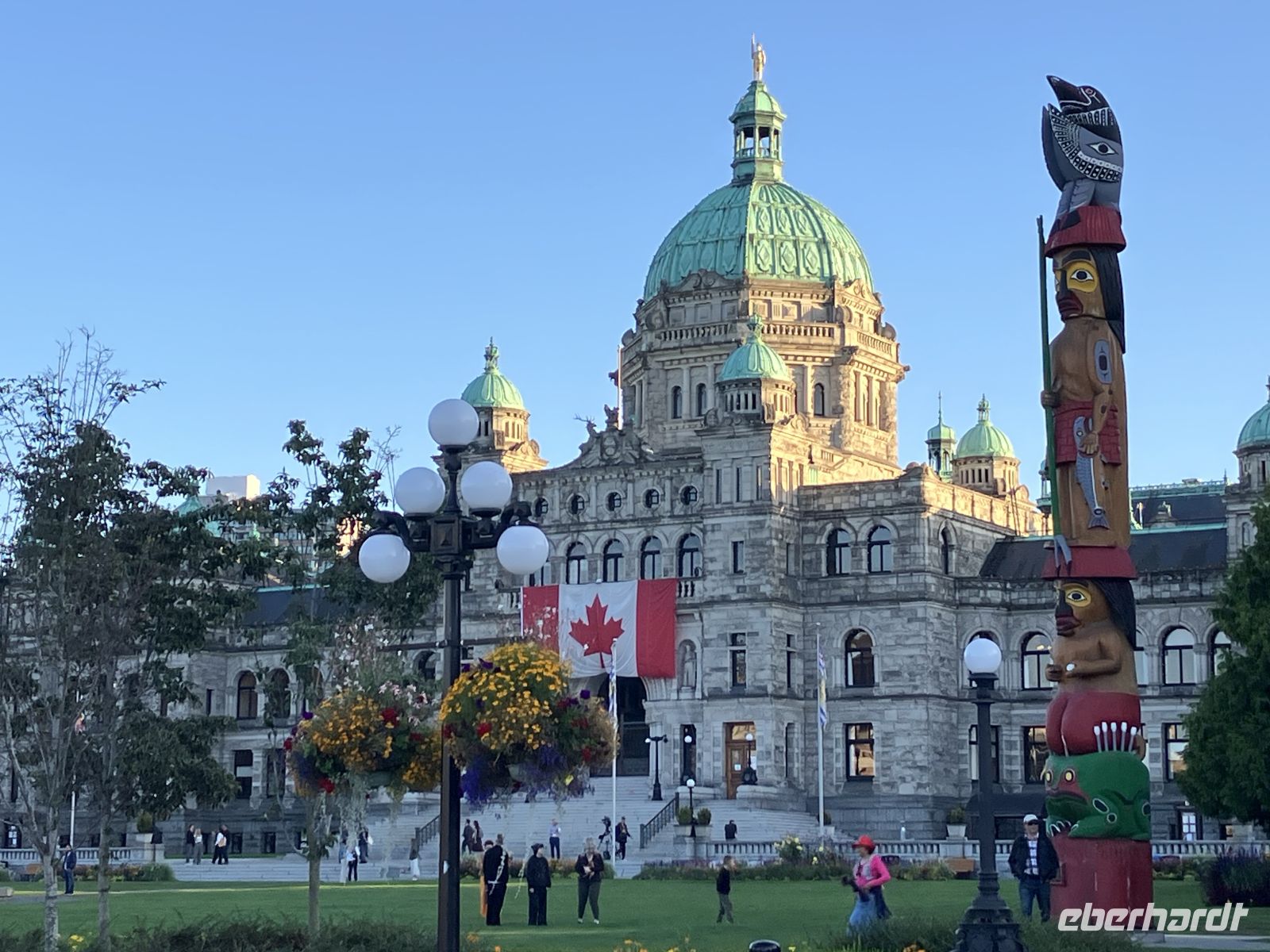 Oh wie herrlich, man erblickt wieder blauen Himmel, das Zimmer ist sehr gross und angenehm temperiert und die Decken sind warm, wer will da schon aufstehen....Wir, denn auch heute wird sicher wieder ein toller Tag. Nach dem Fruehstueck in unserem Strandhotel gehts gleich auf unsere «Romantische Wanderung». Erst fahren wir aus dem Pacific Rim National Park raus und gleich ins kleine Staedtchen Ucuelet. Hier wandern wir nun eine laengere Stunde der Kueste entlang in einem Urwald. Die Aussichten aufs Meer, die Felsen, Straende und Inseln sind einfach atemberaubend, die Eindruecke haftend. Mit dieser maerchenhafter Wanderung verabschieden wir uns nun von der Westkueste Kanadas. Die Rueckfahrt nach Nanaimo wird kurz mit einem Besuch bei einem legendaeren Tim Hortons unterbrochen, ansonsten werden noch alle offenen Fragen zu verschiedenen Themen durchgenommen bis wir nicht einfach vor uns hin doesen. Der naechste Halt ist in einer Freilicht-Gallerie. In Chemainus sind naemlich viele Hauswaende mit historischen Gemaelde bemalt. Man kann von einem Bild zum anderen gehen und sich manchmal sogar in ein Gemaelde hineinfotografieren. Daraufhin gehts weiter in Richtung Sueden bis nach Victoria, unser heutiges Ziel der Reise. Die Stadtfuehrung durch die Hauptstadt von BC passt in die 90 Minute die wir noch zur Verfuegung haben, denn die Innenstadt ist eher klein mit seinem alten Chinesenviertel, der Governement Street und dem Hafen mit dem gewaltigen Empress Hotel und dem Regierungsgebaeude. Die Geschichten von Francis Rattenburry, Mr. Dunsmuir, James Cook und vielen anderen Herrschaften vergangener Zeiten sind interessant, unterhaltsam und auch lustig. Der Hafen mit seinen vielen Attraktionen sowie die Pubs stehen ganz oben auf der Victoria Lieblings-liste. Unser Hotel ist am inneren Hafen, ganz toll gelegen. Das Abendessen geniessen wir in einem schoenen Restaurant mit herrlichem Blick auf das tolle Empress Hotel. Heute abend gehen wir auch noch in den Irischen Pub. Es unterhaelt uns eine Irin mit flotter Musik. Das Bierchen der lokalen Brauerei schmeckt vorzueglich es ist eines der rund 30 verschiedenen Biere vom Zapfen. So klingt auch dieser Tag erfolgreich aus.