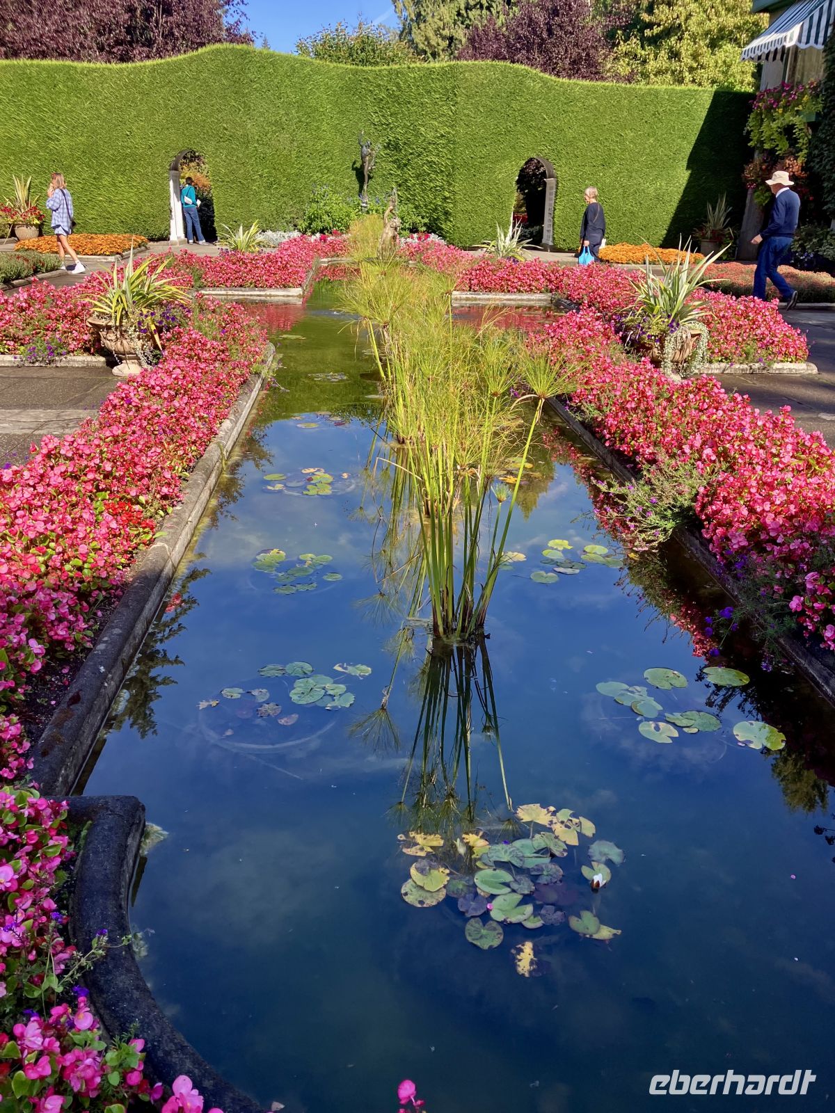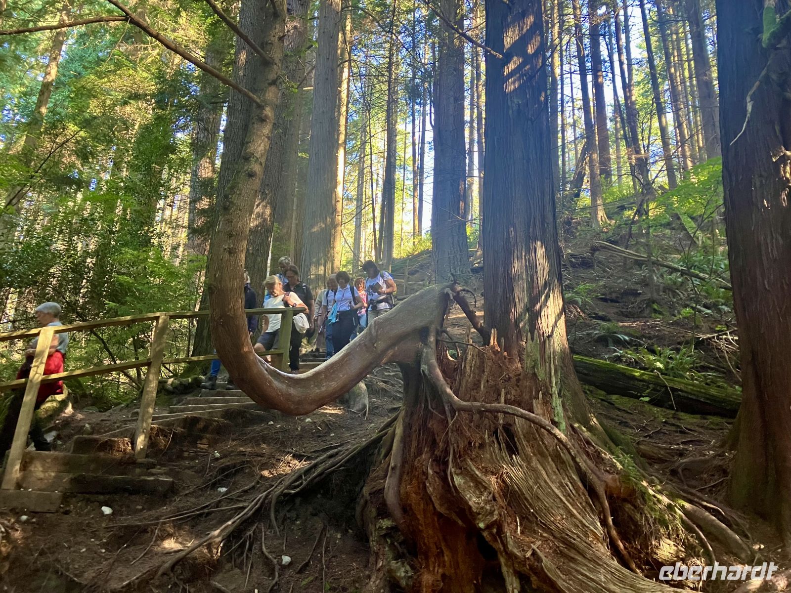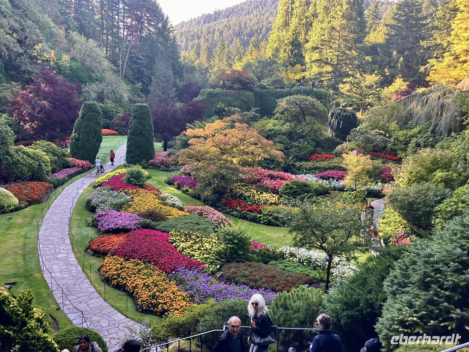 Abreise von Victoria steht heute auf dem Programm. Sobald die Koffer im Bus verstaut sind, fahren wir vorerst zur Meile 0 der Trans Canada Highway und dem Denkmal an Terry Fox. Wir gehen auch nochmals an einen kleinen Strand mit Blick auf die Olympia Peninsola die sich im Staate Washington der USA befindet. Wir fahren auf der HWY No 1 aus der Stadt hinaus, bei der Universitaet vorbei in die beruehmten Butchart Gardens. Dies ist eine riesengrosse Anlage mit verschiedenen Gaerten welche von ueber einer Milion Besucher jaehrlich besucht wird. Vorerst schauen wir uns den haengenden Garten an, danach den Wald-Garten, den versunkene Garten mit seiner Fontaene, danach den Rosengarten, den japanischen Garten, den franzoesischen- und, zu guter Letzt, den italienischen Garten. Bis wir wieder beim Kaffeehaus landen. Wir sehen bloss noch Blueten und Blumen vor unseren Augen. So beeindruckend sind diese Gaerten, dass wir uns nun einen Kaffee goennen wollen und vielleicht im Giftshop noch etwas geblumtes finden fuer die daheim gebliebenen die auf die Pflanzen aufpassen. Mittags sind wir auf der Faehre. Die Sonne strahlt. Aehnlich einem Kreuzschiff auf der Inside Passage schaut es hier aus. Wir verbringen fast die ganze Zeit auf dem oberen Sonnendeck. Die 1 ½ Stunden sind sehr schnell vorbei. Bei Ankunft auf dem Festland fahren wir in Richtung Norden nach Vancouver. Wir lernen die Stadt auch gleich kennen, denn die Stadtfuehrung fuehrt uns vorerst nach Chinatown. Es ist das 2. groesste Chinatown nach San Francisco und die angepriesene Ware ist bloss auf chinesisch beschrieben. Das meiste scheint getrocknet oder gesalzen zu sein. Anschliessend gehts nach Gastown. Es ist der aelteste Stadteil Vancouvers mit seiner interessanten Geschichte und seiner Dampfuhr die man auf jedem Vancouver Prospekt auch sehen kann. Und nun stehen wir vor der Dampfuhr. Die Stunde wird durch viel Dampf im Big Ben Muster angezeigt und durchs Glass kann man das Getriebe anschauen. Ganz schoen einfallsreich der britische Lok-Ingenieur ! Nun sehen wir noch viele Sehenswuerdigkeite der Perle des Pazifiks und halten wieder in Stanley Park bei den Geschichts-erzaehlenden-Pfaehlen. Auch hier weiss Elisabeth noch Geschichten dazu. Die lustige Kinder-Trockenanlage beim Wasserspielplatz ist sehr amuesant und die Loewenbruecke ist beeindruckend. Bald gelangen wir so zu unserem Hotel wo wir uns von Tracey mit einem dicken Umschlag und besten Wuenschen verabschieden. Wir werden ihn vermissen, er hat uns sicher und gut gefuehrt. Heute Abend ist freies Abendbrot und so ziehen wir alle, mit unseren Stadtkarten ausgeruestet, durch die Strassen Vancouvers. Wichtig ist jedoch das Rendez-vous am englischen Strand zum Sonnenuntergang