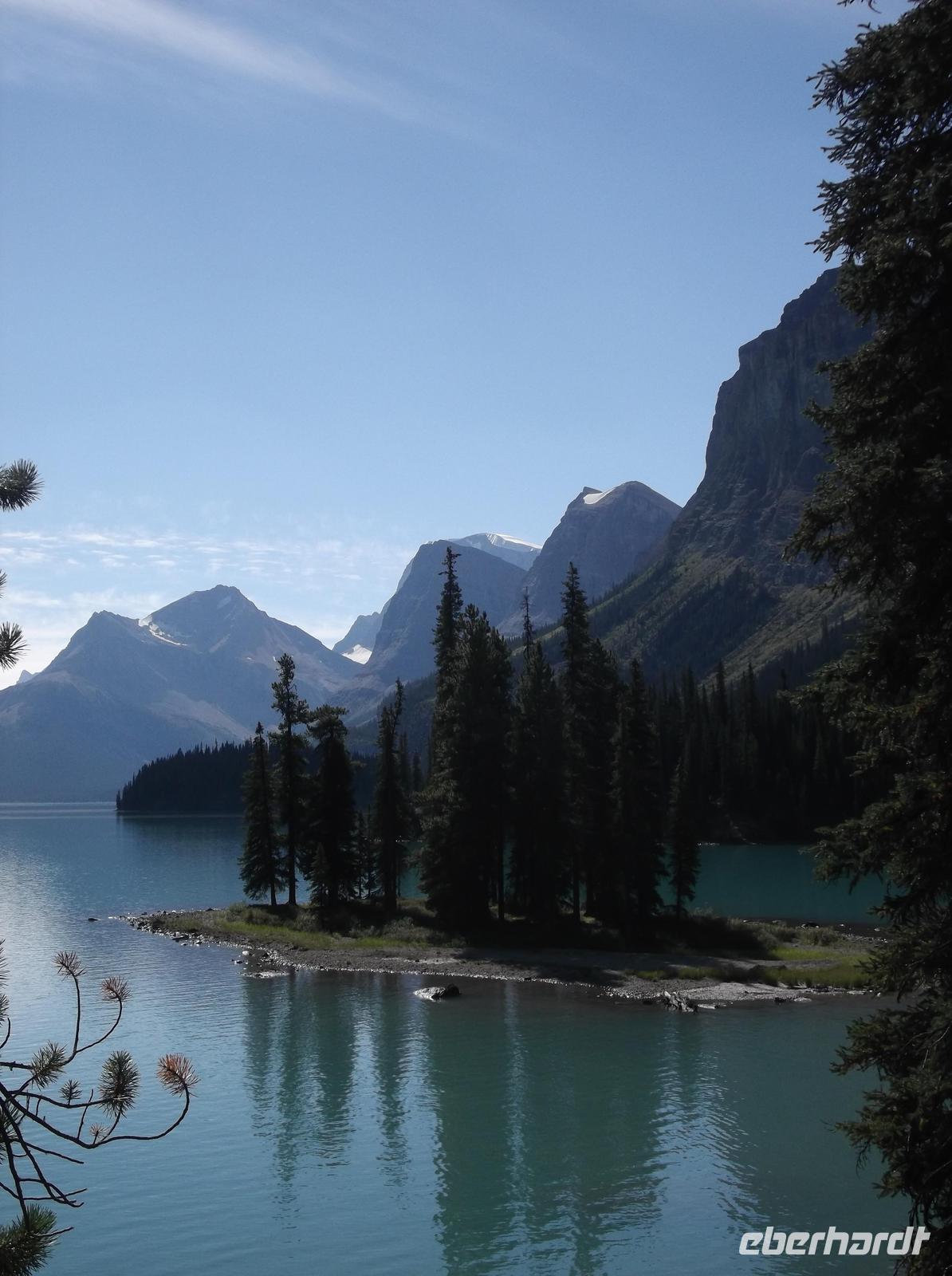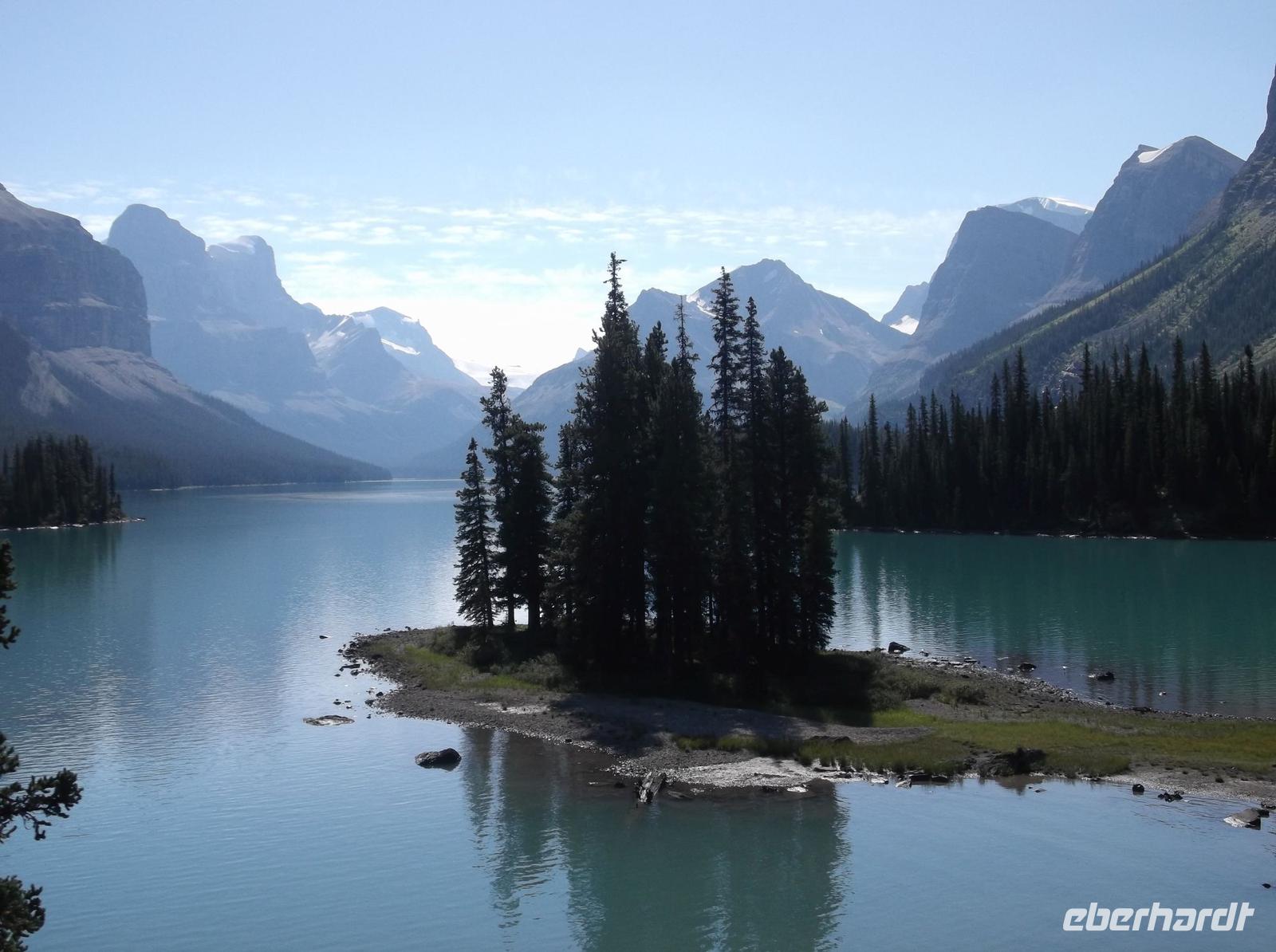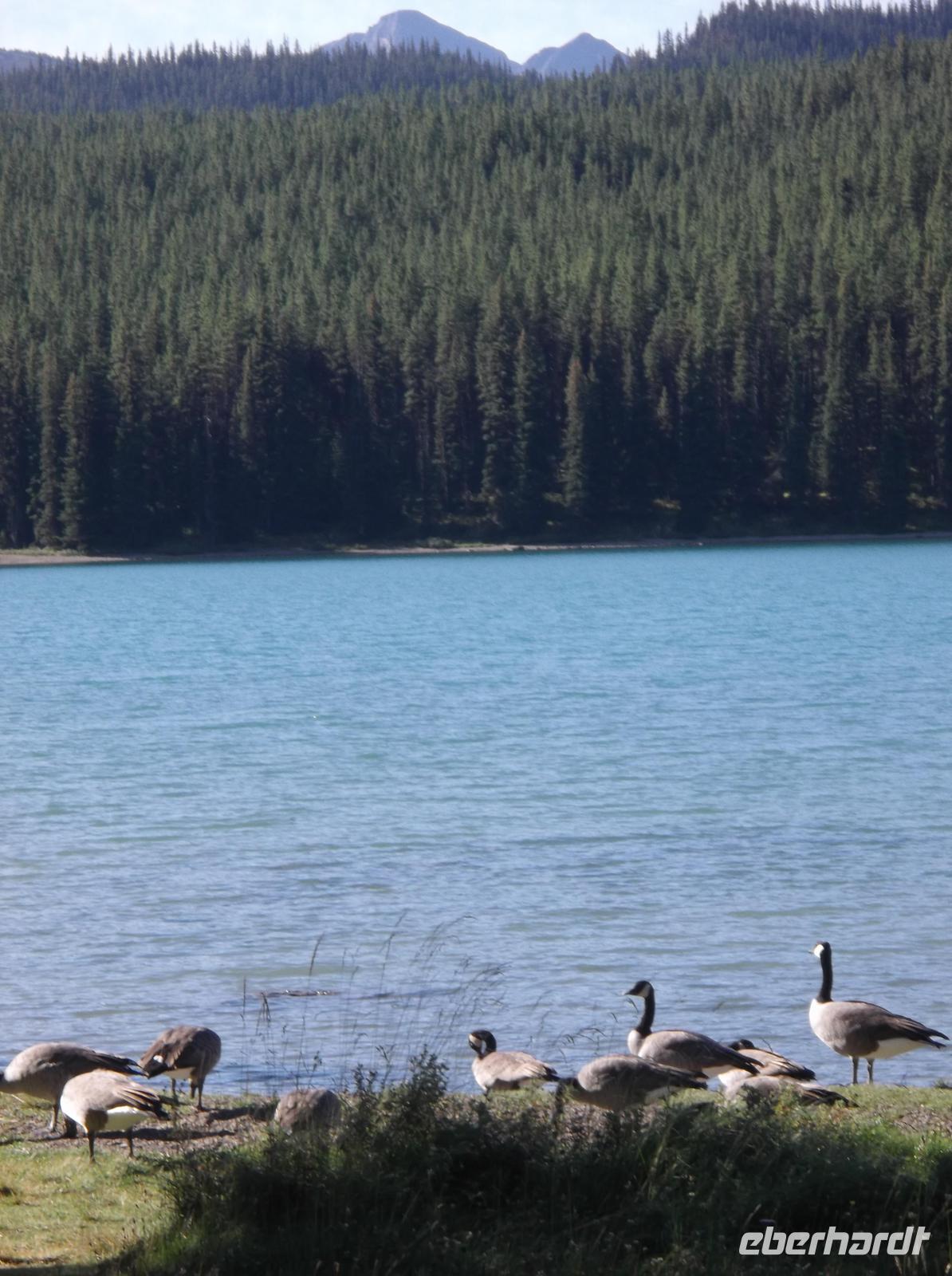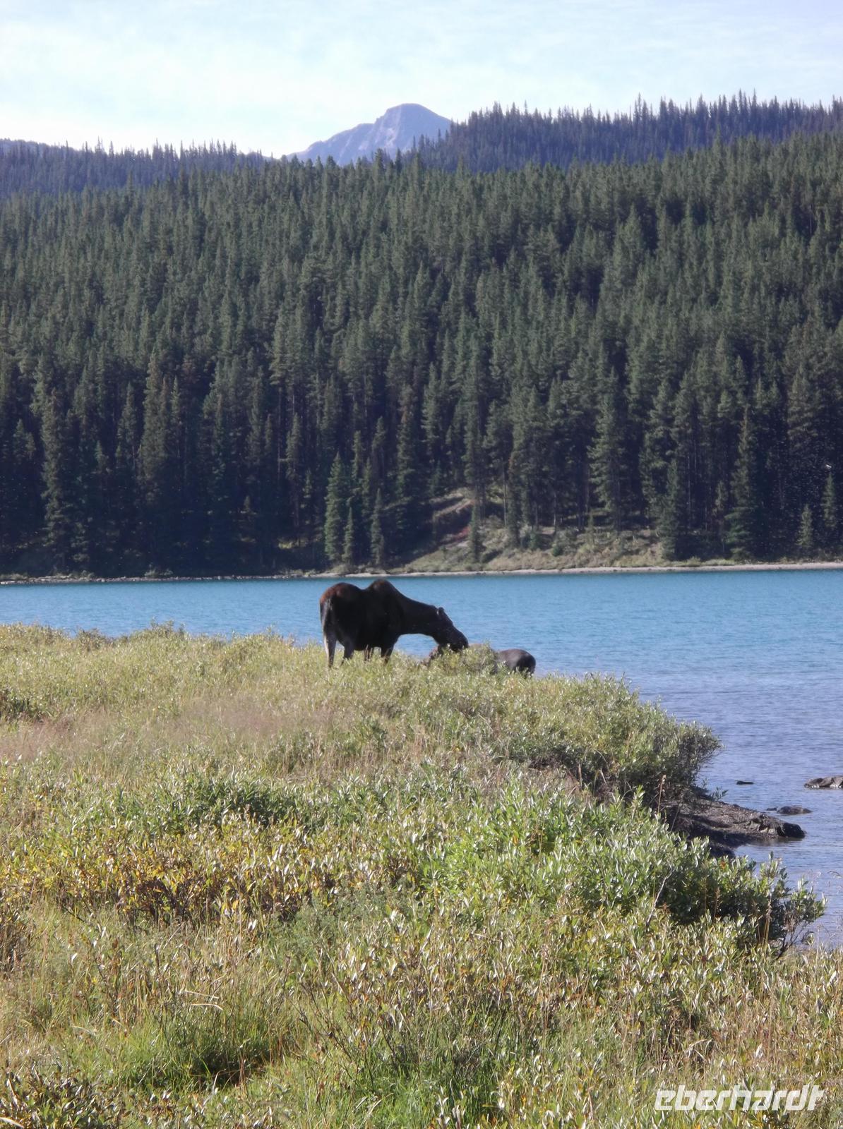 02.09.13:Wenn Engel reisen..... Wieder ein wunderschöner sonniger Tag. Heute steht ein Ausflug zum Maligne See auf dem Programm. Aber vorher machen wir einen kurzen Halt am Medicine Lake. Hier treffen wir auf ein beeindruckendes geologisches Phänomen. Frühere Indianer glaubten, Geister seien für das temporäre Verschwinden dieses von Maligne River gespeisten Sees verantwortlich. Tatsächlich versickert im Herbst das Wasser jedoch in poröse Kalksteinschichten und in ein einzigartiges unterirdisches Drainagesystem der Natur. Die Quellen frieren ein und tauen erst im folgenden Frühjahr wieder auf. nach kurzer Fahrt sind wir am Malignesee angekommen. Die Ausmaße des Sees sind ebenso beeindruckend wie die Gebirgskulissse im Hintergrund. Mit dem Boot fährt man bis zur Südspitze des Sees zur Spirit Island, einer weltbekannten Postkartenansicht und eines der meistforografierten Panoramen. Bevor es zurück nach Jasper geht, bleibt Zeit für einen kurzen Abstecher in den