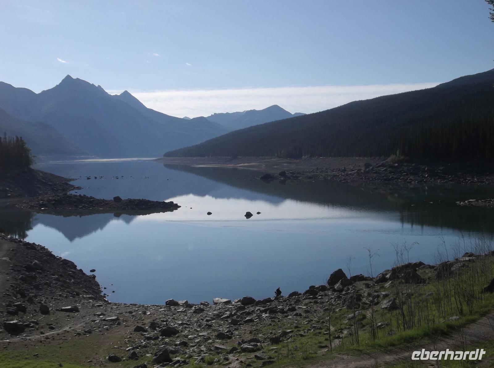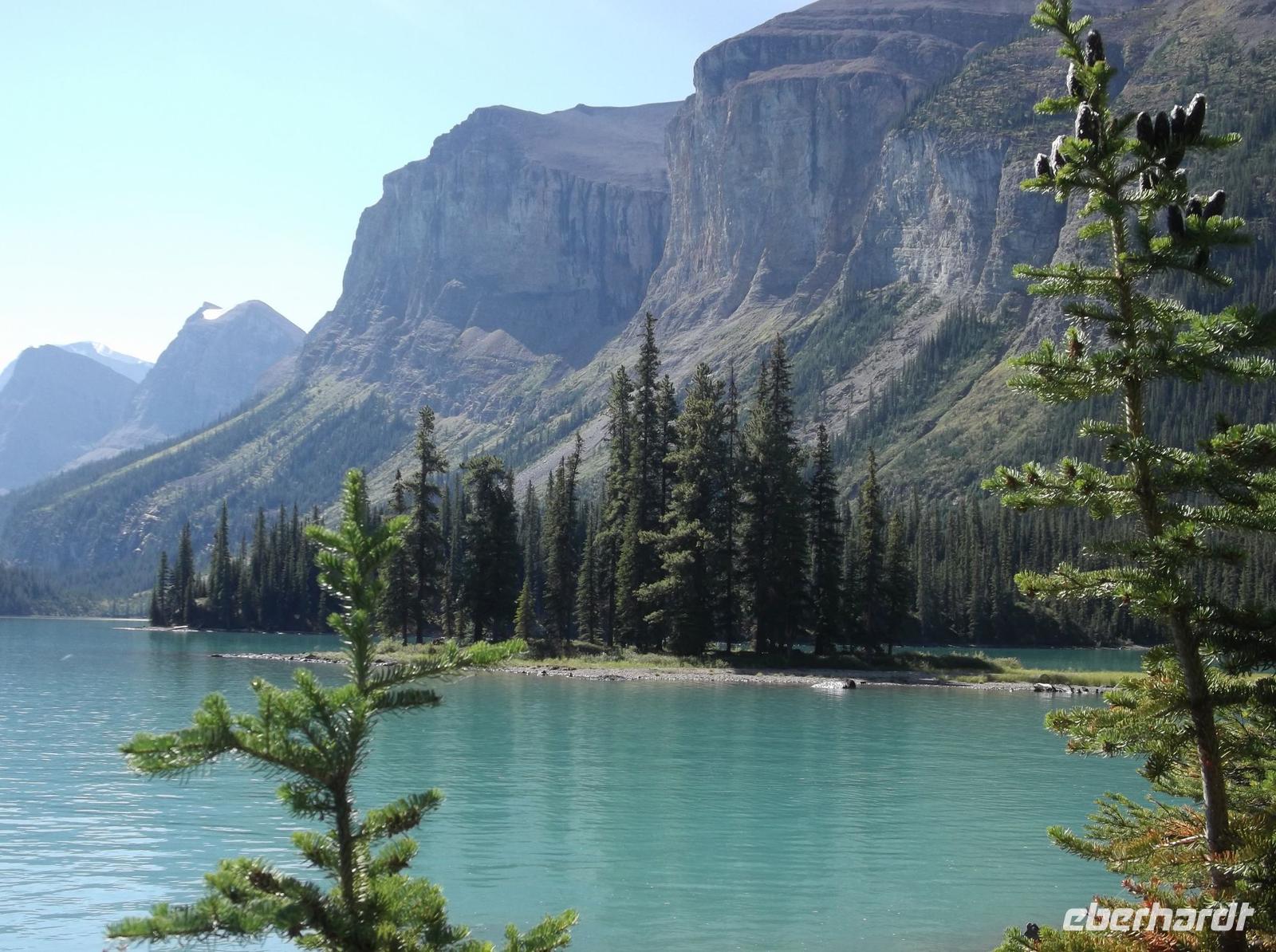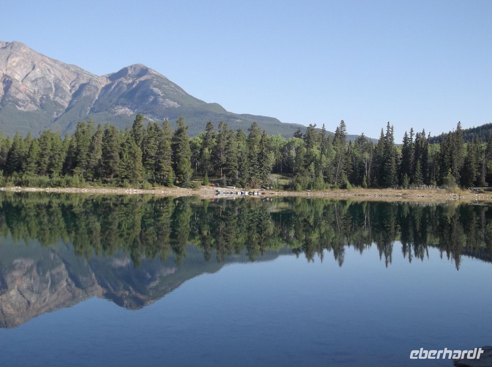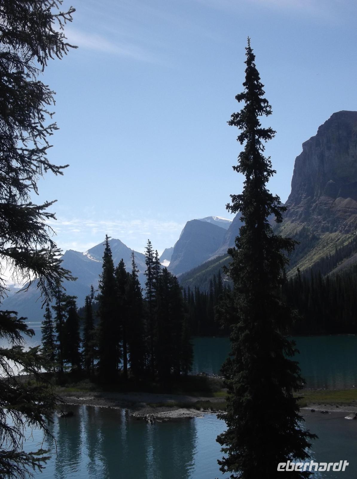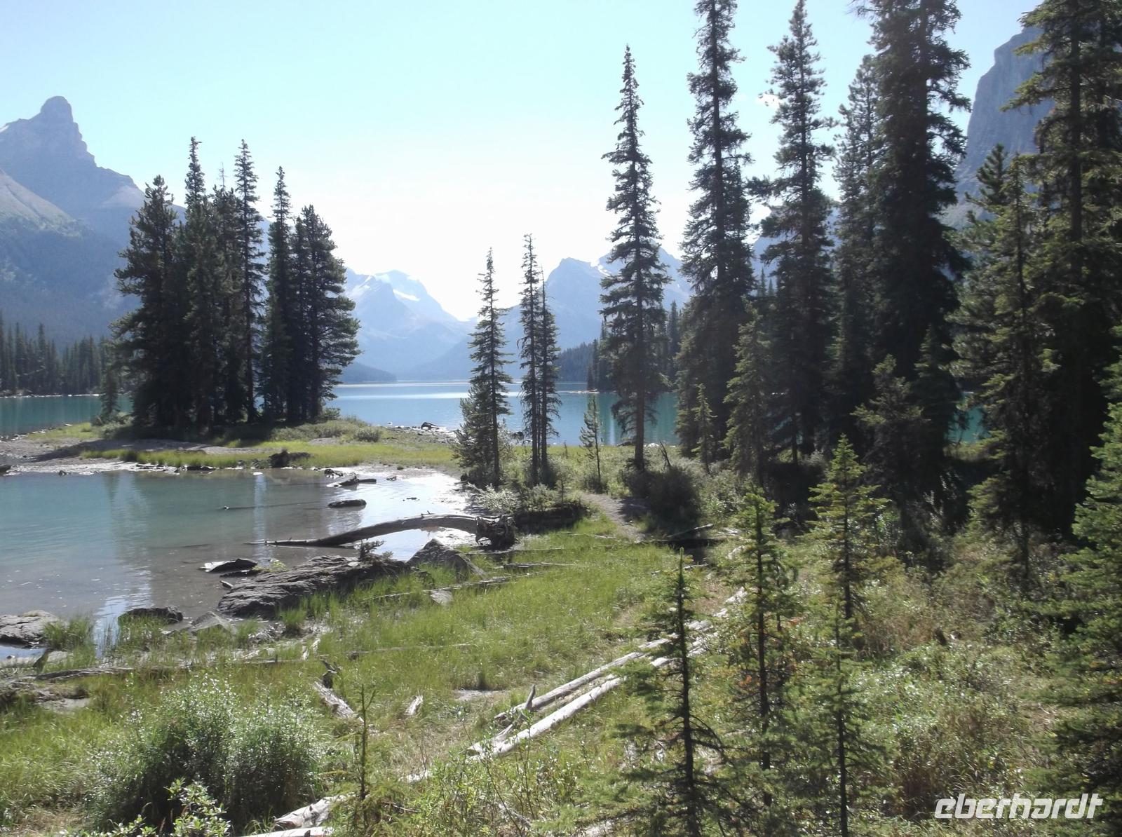 02.09.13:Wenn Engel reisen..... Wieder ein wunderschöner sonniger Tag. Heute steht ein Ausflug zum Maligne See auf dem Programm. Aber vorher machen wir einen kurzen Halt am Medicine Lake. Hier treffen wir auf ein beeindruckendes geologisches Phänomen. Frühere Indianer glaubten, Geister seien für das temporäre Verschwinden dieses von Maligne River gespeisten Sees verantwortlich. Tatsächlich versickert im Herbst das Wasser jedoch in poröse Kalksteinschichten und in ein einzigartiges unterirdisches Drainagesystem der Natur. Die Quellen frieren ein und tauen erst im folgenden Frühjahr wieder auf. nach kurzer Fahrt sind wir am Malignesee angekommen. Die Ausmaße des Sees sind ebenso beeindruckend wie die Gebirgskulissse im Hintergrund. Mit dem Boot fährt man bis zur Südspitze des Sees zur Spirit Island, einer weltbekannten Postkartenansicht und eines der meistforografierten Panoramen. Bevor es zurück nach Jasper geht, bleibt Zeit für einen kurzen Abstecher in den