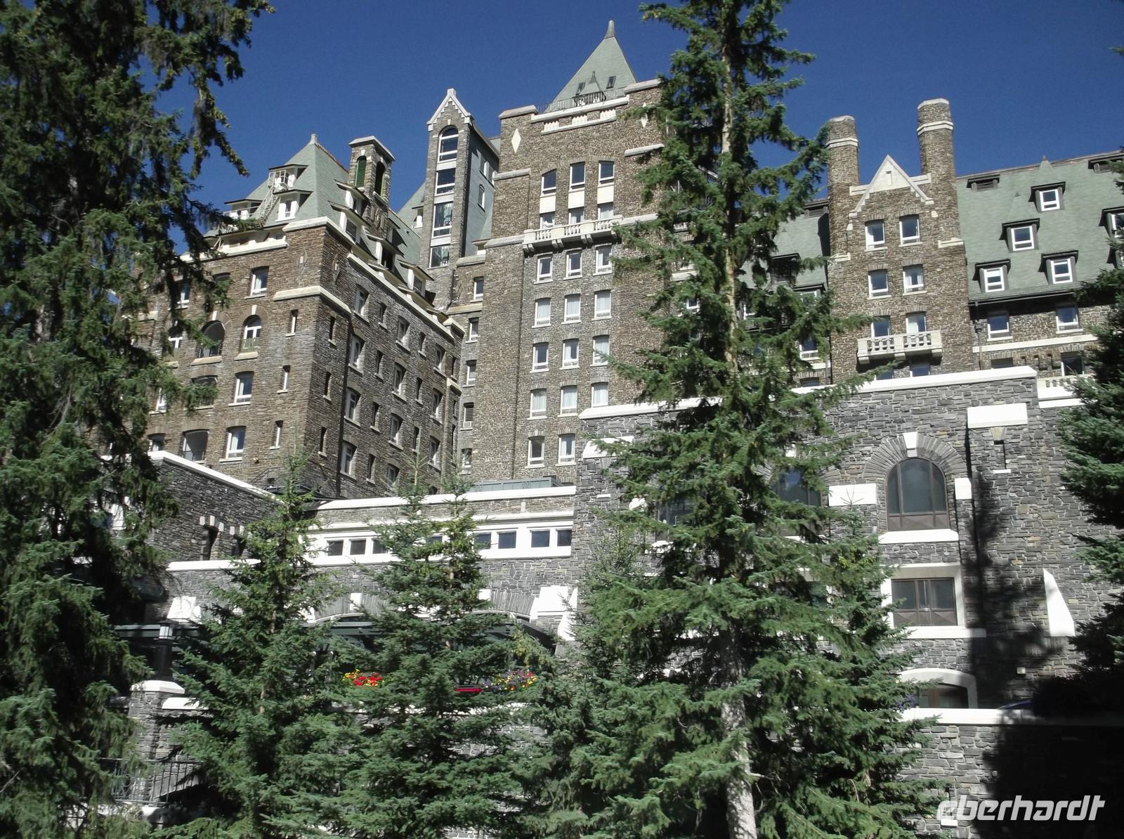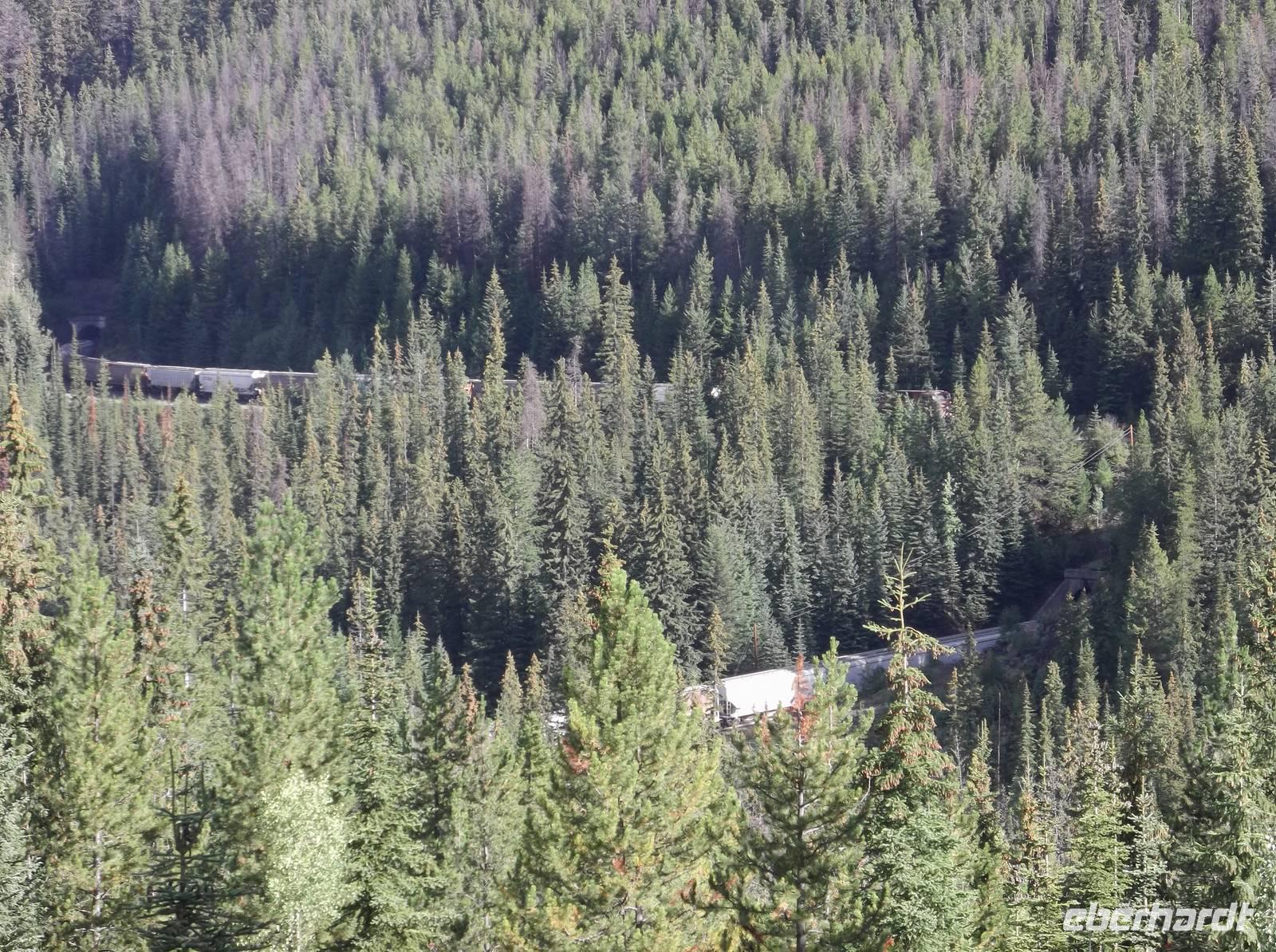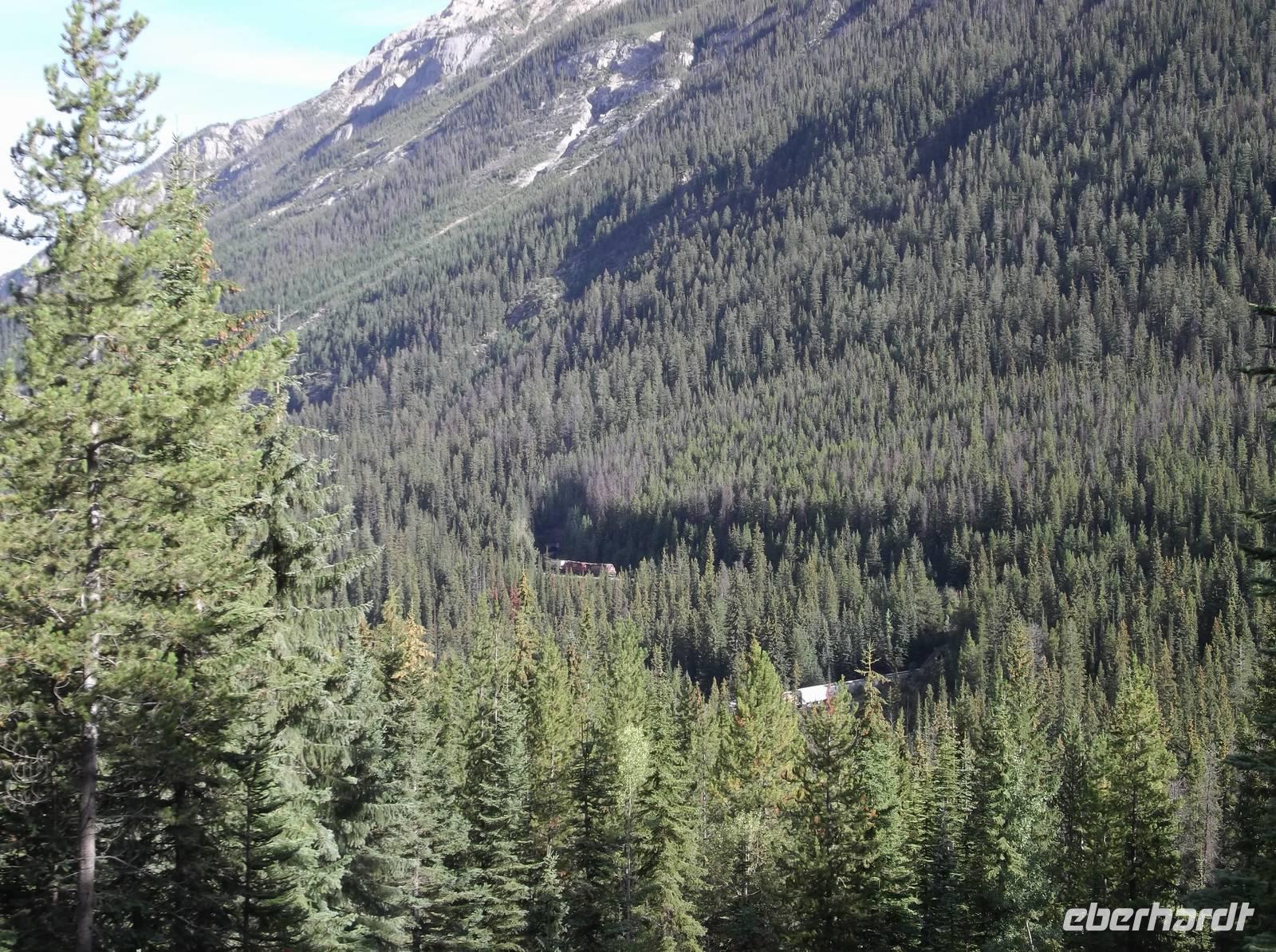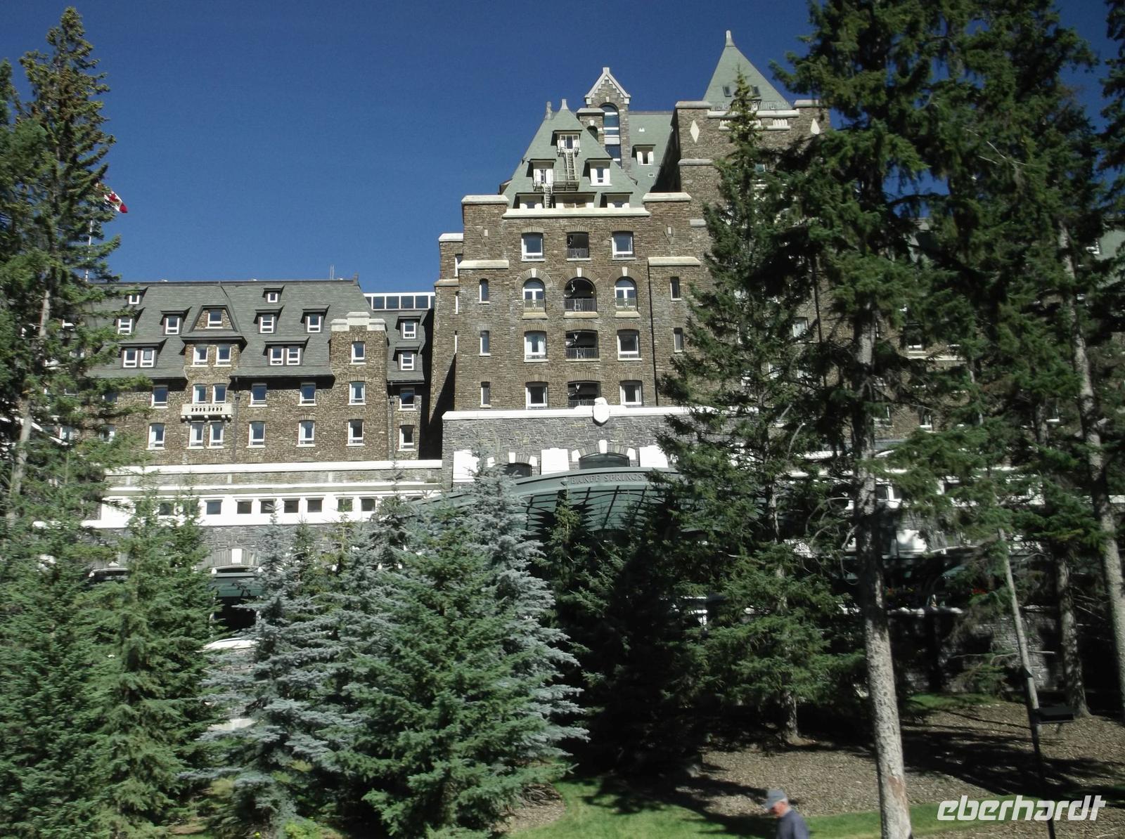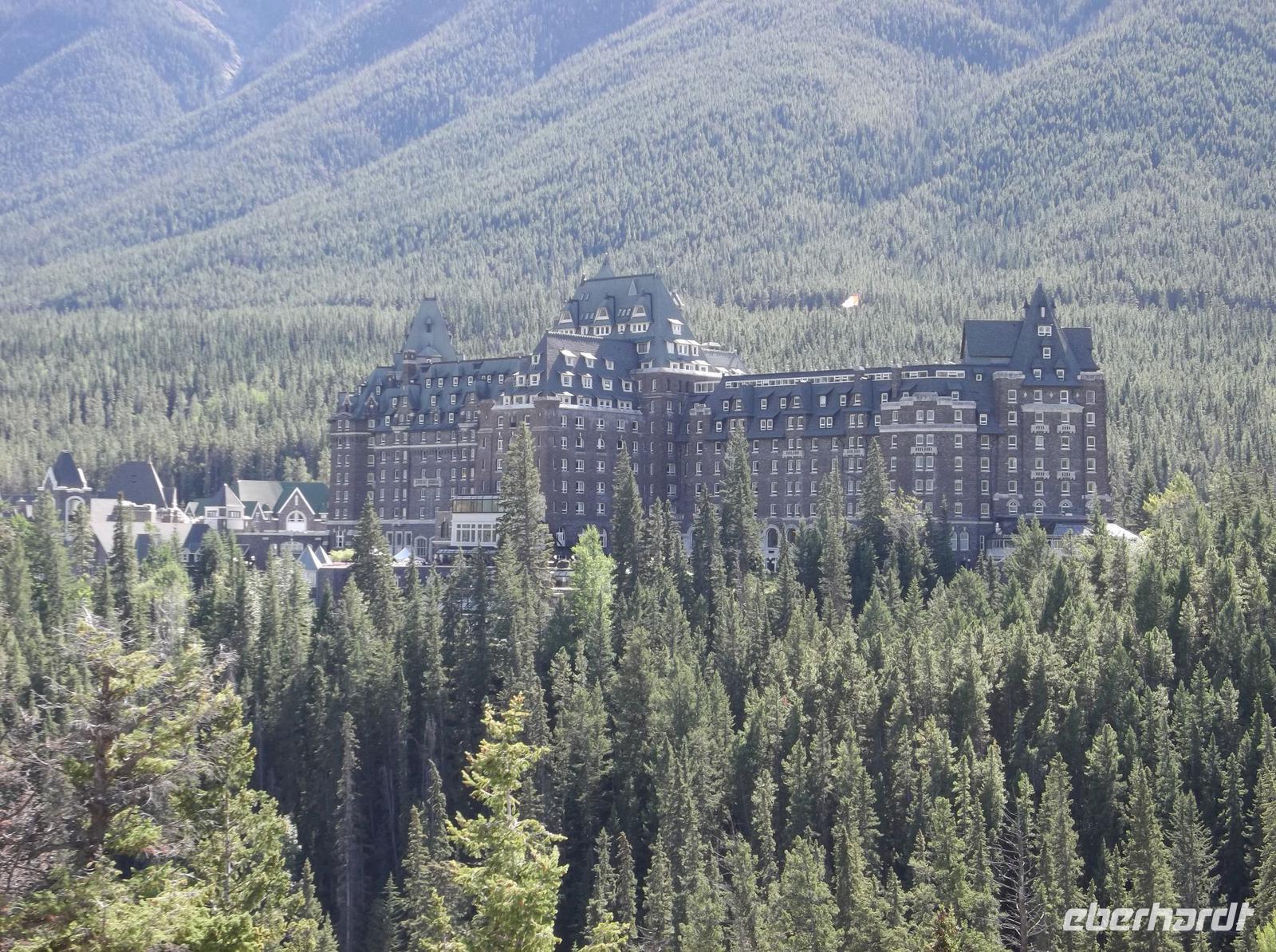 31.08.13: Ein Traumwetter für den heutigen Ausflug in den Banff- und Yoho Nationalpark kündigt sich an. Zunächst erfolgt ein Stopp am Castle Mountain, einem gewaltigen Bergmassiv, der in den 2728 m hohen Eisenhower Peak gipfelt. Ein Erlebnis der besonderen Art ist der sogenannte Spiraltunnel. Von einem Aussichtspunkt kann man beobachten, wir hatten das Glück, wie die extrem langen Züge den Tunnel durchqueren. Während die vorderen Waggons den Tunnel bereits unten wieder verlassen, fahren oben die hinteren Waggons erst in den Eingang hinein. Warum ist das so? Mit 4,5% besaß die ursprüngliche Streckenführung der Canadian Pacific Railway das steilste und zugleich unfallträchtigste Gefälle aller kanadischen Eisenbahnen. Die 1909 fertiggestellten Spiral Tunnels mit jeweils zwei Spiralenserpentinen reduzieren das Gefälle auf 2,2%. Für uns gibt es kein Rasten und Ruhen. Weiter geht es zur Natural Bridge. Die "natürliche Brücke" über den Kicking Horse River entstand durch jahrhundertelange Erosion die einen Tunnel durch den massiven Fels grub und ein besonderes Naturschauspiel bietet. Gegen Mittag erreichen wir Lake Louis, von den Stoneyindianern auch " See der kleinen Fische" genannt. Wir nehmen unvergessliche Eindrücke mit nach Hause. Zum Gesamteindruck des blauen Wassers und der schneebedeckten Gipfel gesellt sich noch der Blick auf den fast bis ans Wasser reichenden Victoria Gletscher. An einem Ende des Sees thront das Hotel Chateau Lake Louis, ein nostalgisches Grandhotel aus dem Jahre 1894. Sein heutiges Aussehen hat es aus dem Jahr 1924 nachdem ein Brand den aus Holz errichteten Vorgängerbau zerstört hatte. Auf dem Rückweg nach Banff machen wir noch einen kleinen Spaziergang zum Johnston Canyon und wandeln auf diesem beliebten Wanderweg durch eine spektakuläre Schlucht und sehen imposante Wasserfälle. Weiter geht die Fahrt zu einer Aussichtsplattform und wieder eröffnet sich uns ein grandioser Blick auf Banff. Blickfang ist das Wahrzeichen der Stadt: das 1888 eröffnete Banff Springs Hotel, einst mit 250 Gästezimmern größtes Hotel der Welt, in dem später auch einmal Marilyn Monroe nächtigte. Es hat noch viel vom Glanz des frühen Eisenbahntourismus bewahren können, da sich nur Wohlhabende den Luxus einer Fahrt in die Rockies leisten konnten.