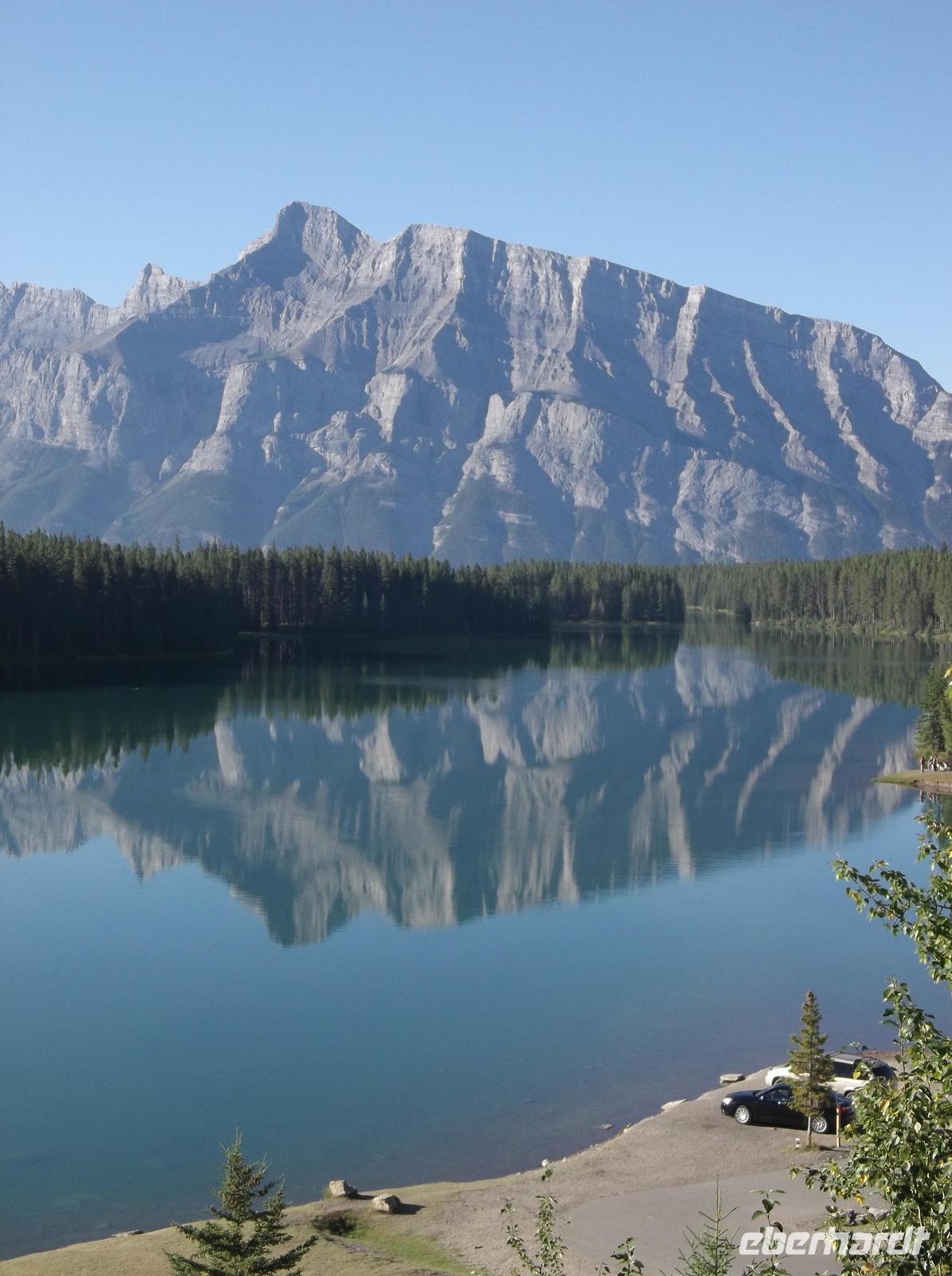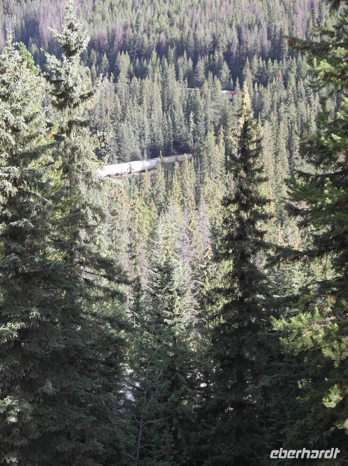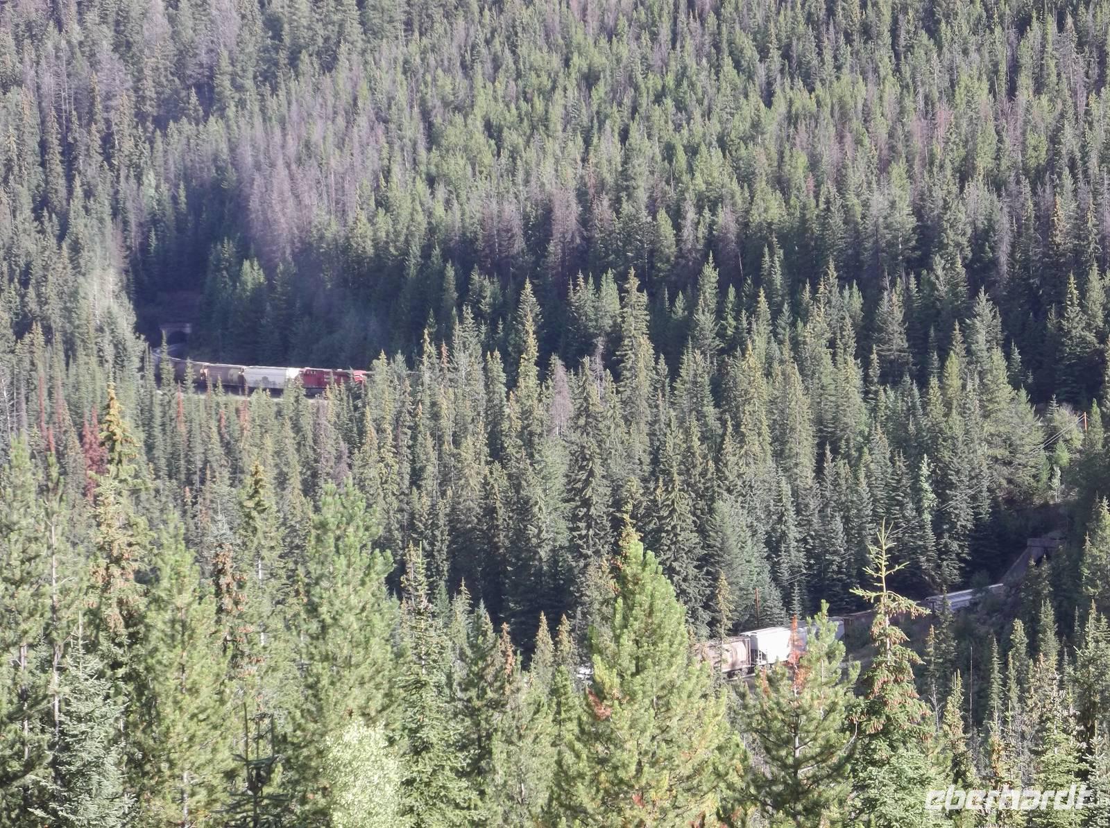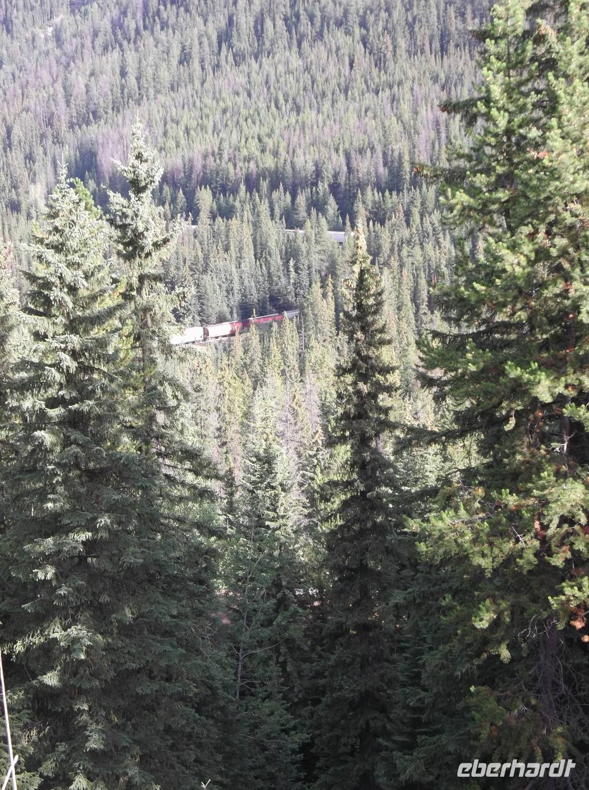 31.08.13: Ein Traumwetter für den heutigen Ausflug in den Banff- und Yoho Nationalpark kündigt sich an. Zunächst erfolgt ein Stopp am Castle Mountain, einem gewaltigen Bergmassiv, der in den 2728 m hohen Eisenhower Peak gipfelt. Ein Erlebnis der besonderen Art ist der sogenannte Spiraltunnel. Von einem Aussichtspunkt kann man beobachten, wir hatten das Glück, wie die extrem langen Züge den Tunnel durchqueren. Während die vorderen Waggons den Tunnel bereits unten wieder verlassen, fahren oben die hinteren Waggons erst in den Eingang hinein. Warum ist das so? Mit 4,5% besaß die ursprüngliche Streckenführung der Canadian Pacific Railway das steilste und zugleich unfallträchtigste Gefälle aller kanadischen Eisenbahnen. Die 1909 fertiggestellten Spiral Tunnels mit jeweils zwei Spiralenserpentinen reduzieren das Gefälle auf 2,2%. Für uns gibt es kein Rasten und Ruhen. Weiter geht es zur Natural Bridge. Die "natürliche Brücke" über den Kicking Horse River entstand durch jahrhundertelange Erosion die einen Tunnel durch den massiven Fels grub und ein besonderes Naturschauspiel bietet. Gegen Mittag erreichen wir Lake Louis, von den Stoneyindianern auch " See der kleinen Fische" genannt. Wir nehmen unvergessliche Eindrücke mit nach Hause. Zum Gesamteindruck des blauen Wassers und der schneebedeckten Gipfel gesellt sich noch der Blick auf den fast bis ans Wasser reichenden Victoria Gletscher. An einem Ende des Sees thront das Hotel Chateau Lake Louis, ein nostalgisches Grandhotel aus dem Jahre 1894. Sein heutiges Aussehen hat es aus dem Jahr 1924 nachdem ein Brand den aus Holz errichteten Vorgängerbau zerstört hatte. Auf dem Rückweg nach Banff machen wir noch einen kleinen Spaziergang zum Johnston Canyon und wandeln auf diesem beliebten Wanderweg durch eine spektakuläre Schlucht und sehen imposante Wasserfälle. Weiter geht die Fahrt zu einer Aussichtsplattform und wieder eröffnet sich uns ein grandioser Blick auf Banff. Blickfang ist das Wahrzeichen der Stadt: das 1888 eröffnete Banff Springs Hotel, einst mit 250 Gästezimmern größtes Hotel der Welt, in dem später auch einmal Marilyn Monroe nächtigte. Es hat noch viel vom Glanz des frühen Eisenbahntourismus bewahren können, da sich nur Wohlhabende den Luxus einer Fahrt in die Rockies leisten konnten.
