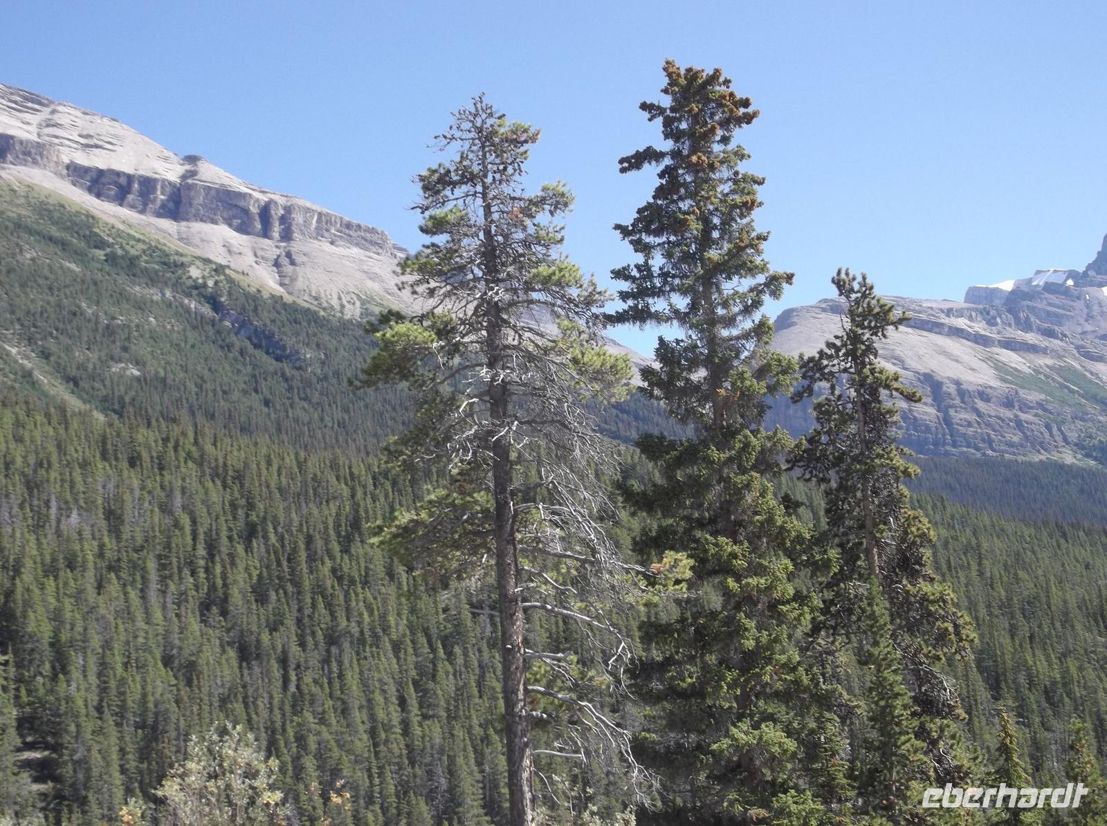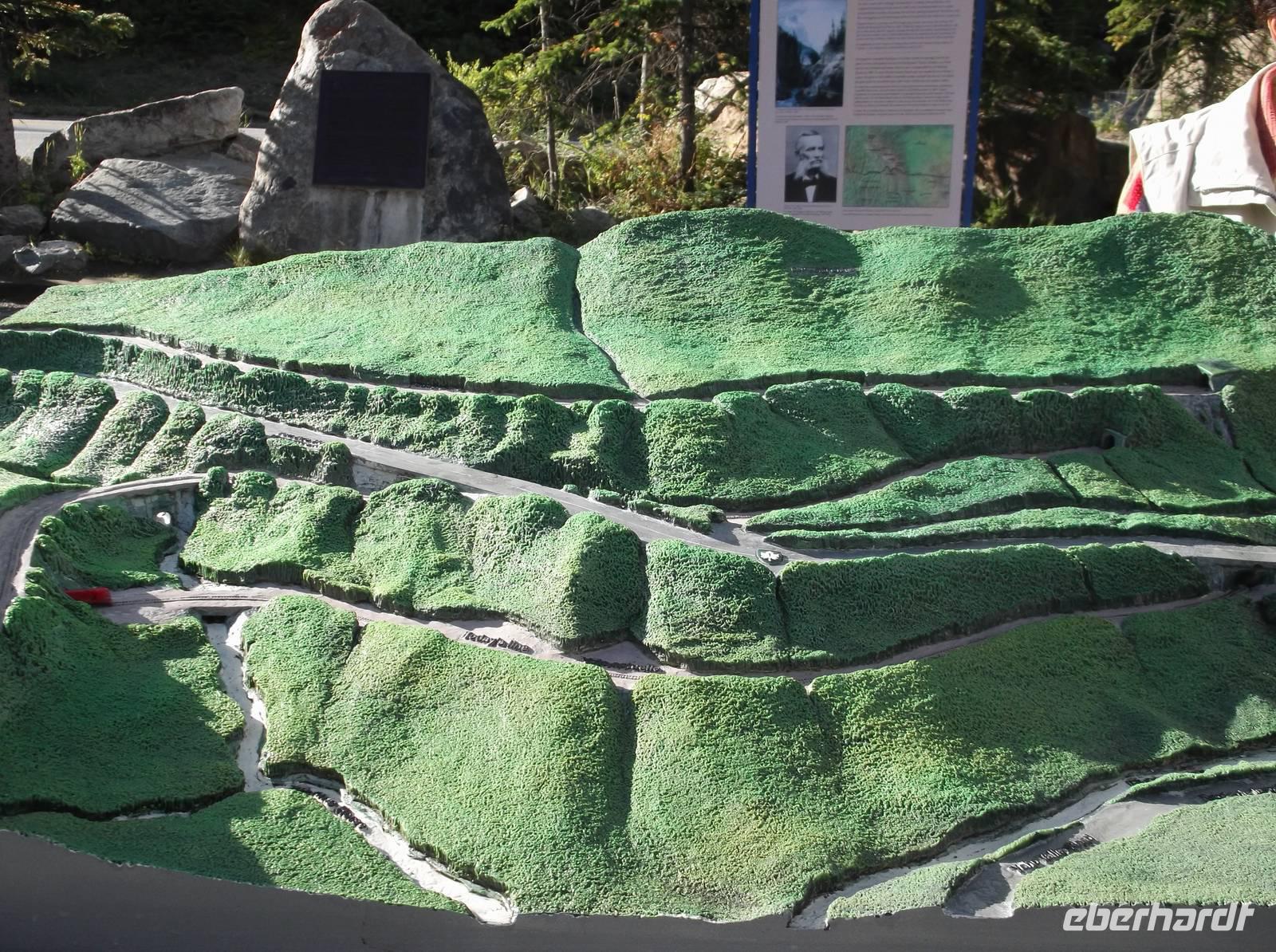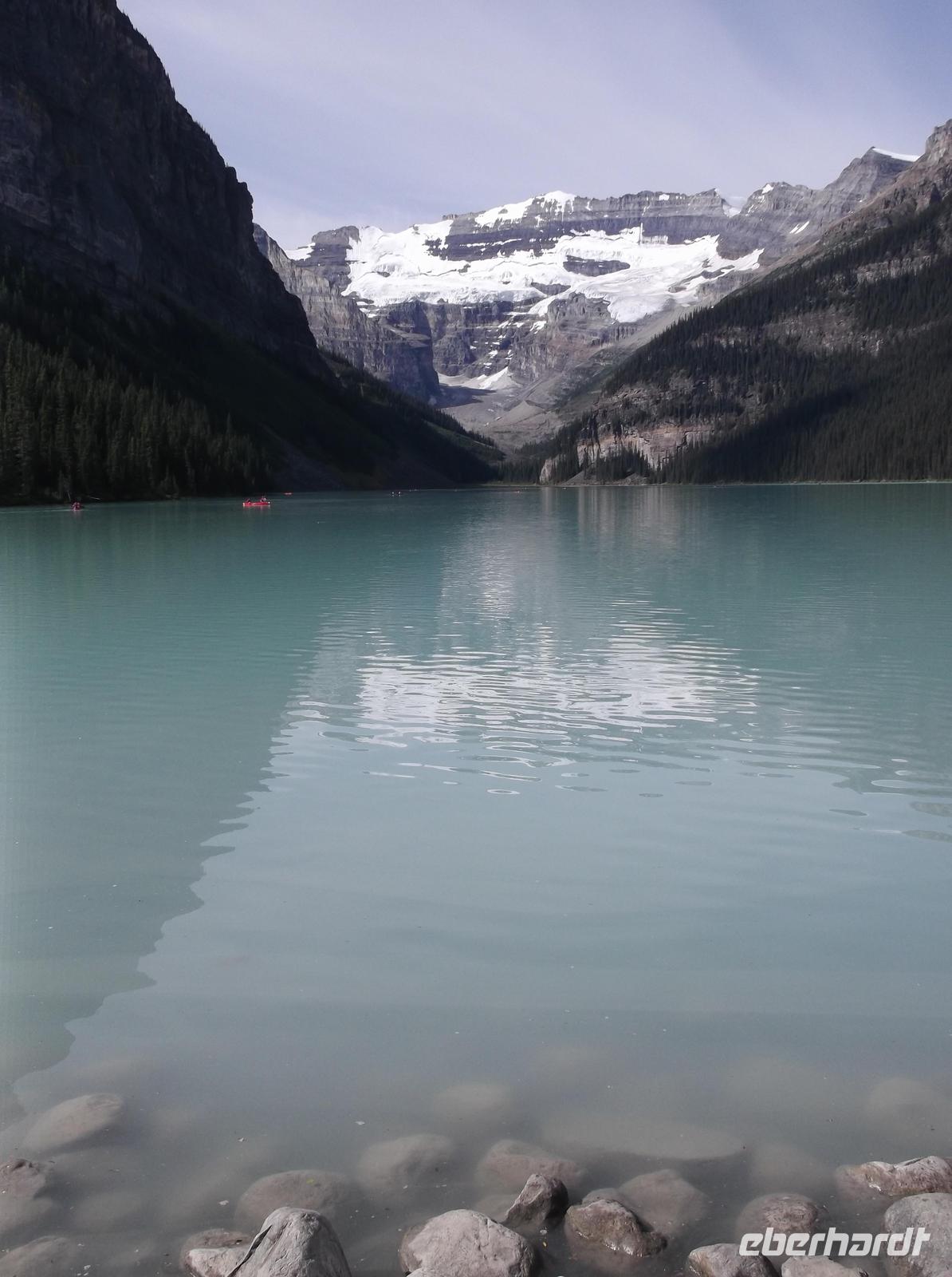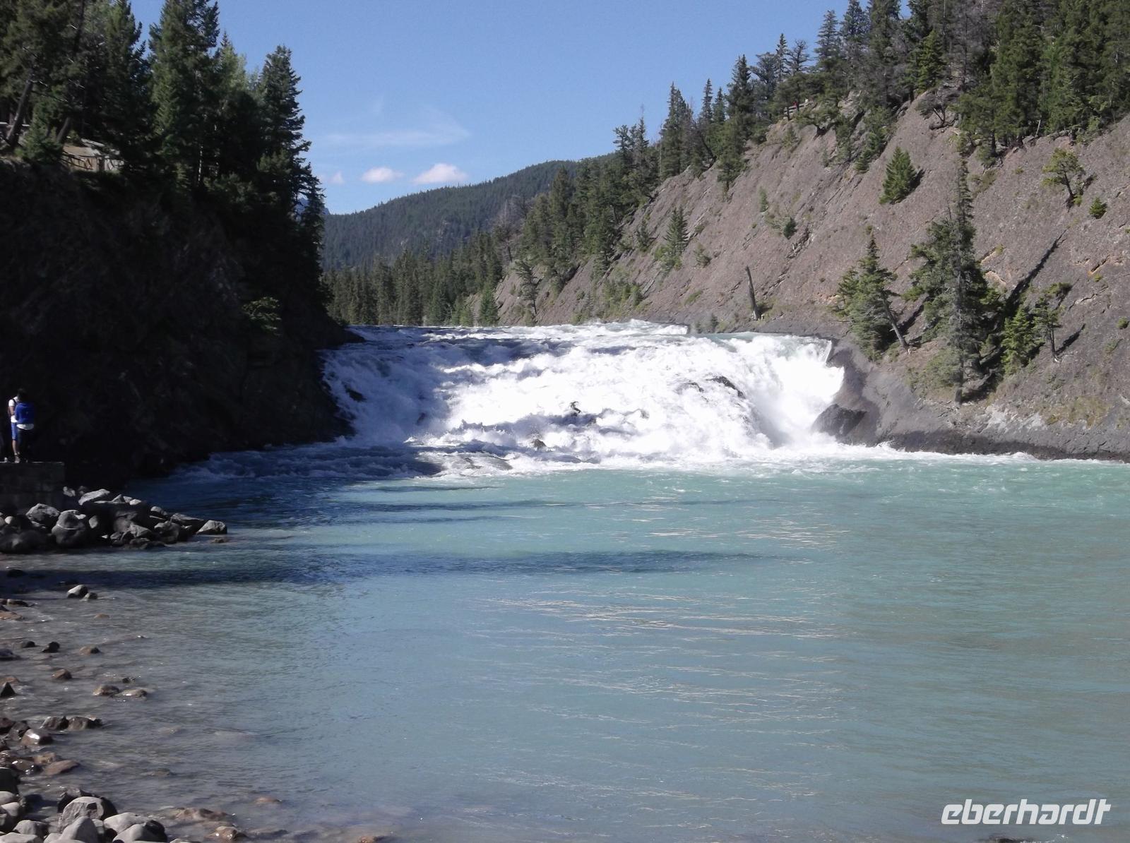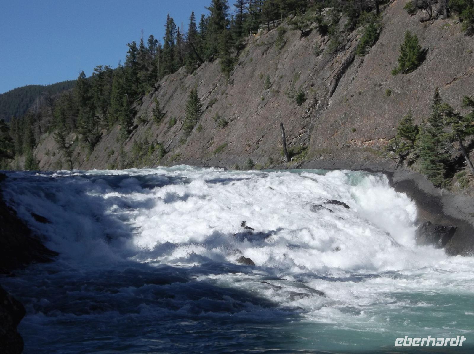 31.08.13: Ein Traumwetter für den heutigen Ausflug in den Banff- und Yoho Nationalpark kündigt sich an. Zunächst erfolgt ein Stopp am Castle Mountain, einem gewaltigen Bergmassiv, der in den 2728 m hohen Eisenhower Peak gipfelt. Ein Erlebnis der besonderen Art ist der sogenannte Spiraltunnel. Von einem Aussichtspunkt kann man beobachten, wir hatten das Glück, wie die extrem langen Züge den Tunnel durchqueren. Während die vorderen Waggons den Tunnel bereits unten wieder verlassen, fahren oben die hinteren Waggons erst in den Eingang hinein. Warum ist das so? Mit 4,5% besaß die ursprüngliche Streckenführung der Canadian Pacific Railway das steilste und zugleich unfallträchtigste Gefälle aller kanadischen Eisenbahnen. Die 1909 fertiggestellten Spiral Tunnels mit jeweils zwei Spiralenserpentinen reduzieren das Gefälle auf 2,2%. Für uns gibt es kein Rasten und Ruhen. Weiter geht es zur Natural Bridge. Die "natürliche Brücke" über den Kicking Horse River entstand durch jahrhundertelange Erosion die einen Tunnel durch den massiven Fels grub und ein besonderes Naturschauspiel bietet. Gegen Mittag erreichen wir Lake Louis, von den Stoneyindianern auch " See der kleinen Fische" genannt. Wir nehmen unvergessliche Eindrücke mit nach Hause. Zum Gesamteindruck des blauen Wassers und der schneebedeckten Gipfel gesellt sich noch der Blick auf den fast bis ans Wasser reichenden Victoria Gletscher. An einem Ende des Sees thront das Hotel Chateau Lake Louis, ein nostalgisches Grandhotel aus dem Jahre 1894. Sein heutiges Aussehen hat es aus dem Jahr 1924 nachdem ein Brand den aus Holz errichteten Vorgängerbau zerstört hatte. Auf dem Rückweg nach Banff machen wir noch einen kleinen Spaziergang zum Johnston Canyon und wandeln auf diesem beliebten Wanderweg durch eine spektakuläre Schlucht und sehen imposante Wasserfälle. Weiter geht die Fahrt zu einer Aussichtsplattform und wieder eröffnet sich uns ein grandioser Blick auf Banff. Blickfang ist das Wahrzeichen der Stadt: das 1888 eröffnete Banff Springs Hotel, einst mit 250 Gästezimmern größtes Hotel der Welt, in dem später auch einmal Marilyn Monroe nächtigte. Es hat noch viel vom Glanz des frühen Eisenbahntourismus bewahren können, da sich nur Wohlhabende den Luxus einer Fahrt in die Rockies leisten konnten.