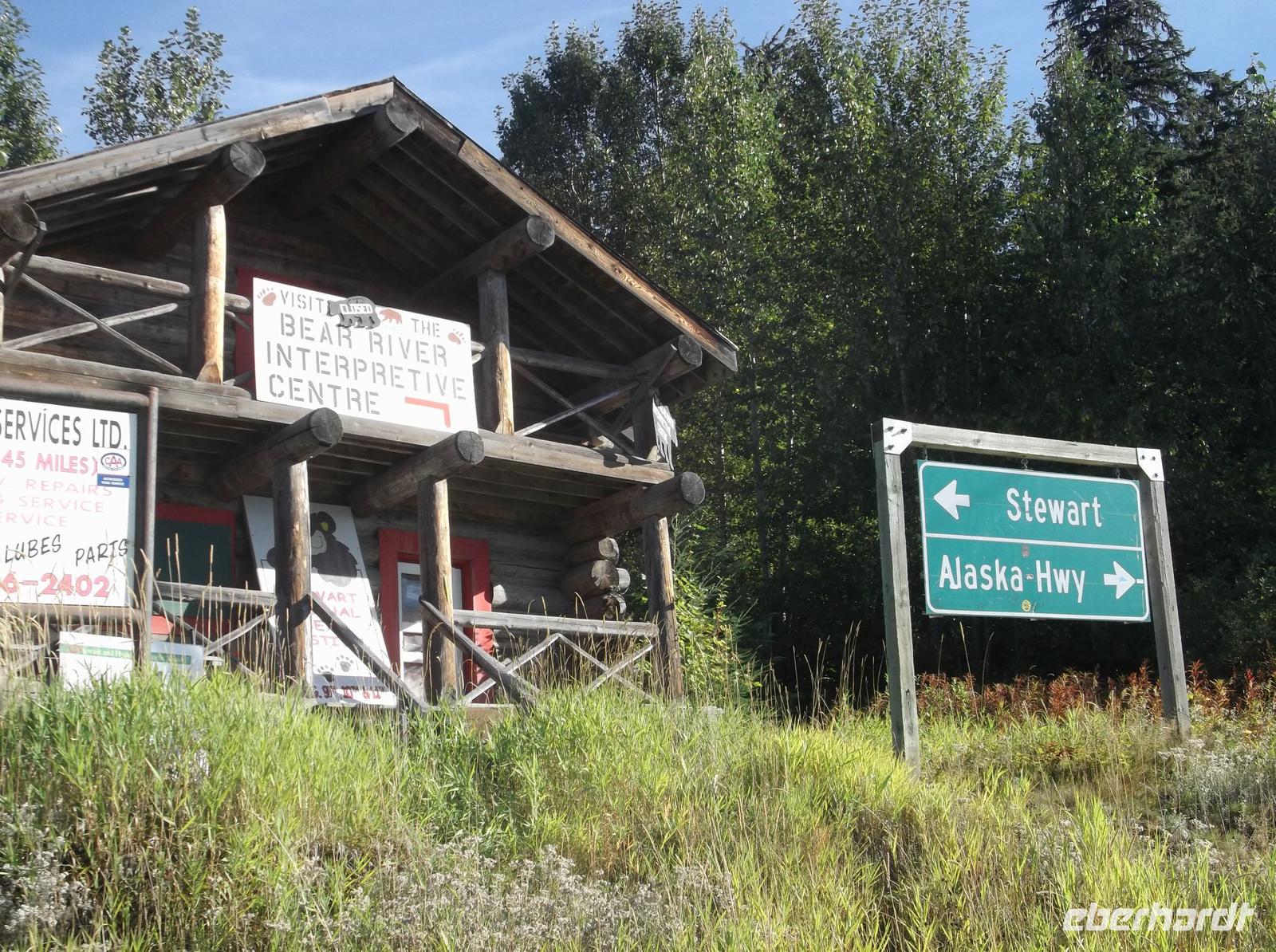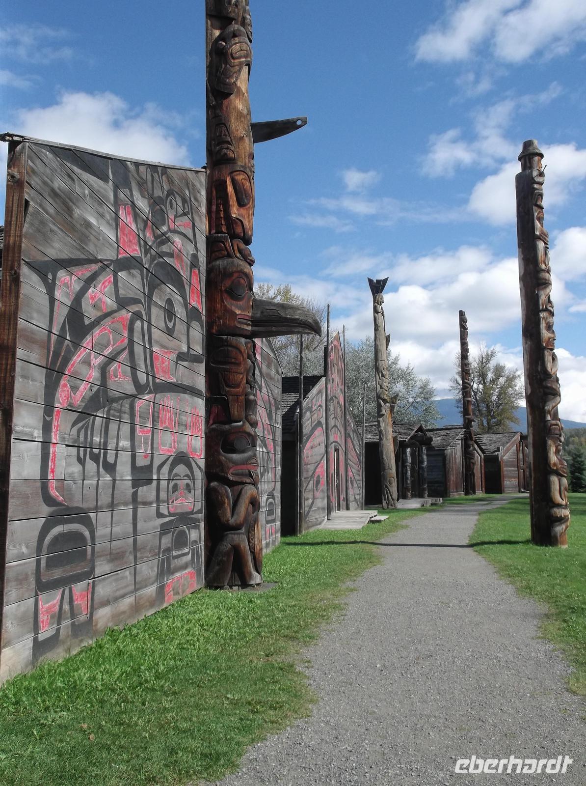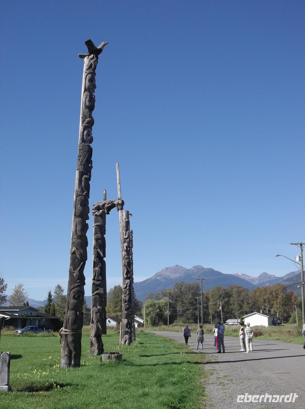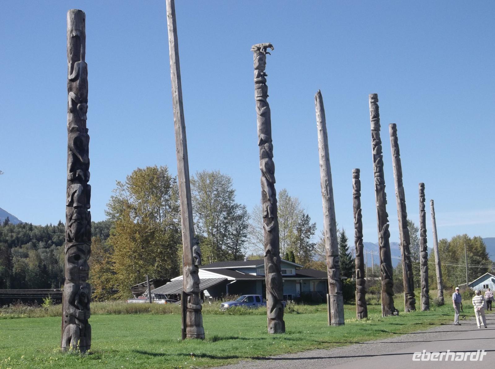 05.09.13: Heute fahren wir nach Stewart, an der Grenze zu Alaska gelegen. Wenn man dem Yellowhead Highway südwärts folgt, gelangt man bald zum Moricetown Canyon mit seinen tosenden Stromschnellen. Hier konnten wir Indianer beobachten, die in althergebrachter Manier die begehrten Fische fangen. Auf unserer Weiterfahrt kommen wir nach Hazelton, wo sich in der Nähe das Indianerdorf Ksan Village befindet, das bei einem traditionellen Siedlungsplatz der Gitskan Indianer eingerichtet wurde. In drei original nachgebauten, ursprünglich jeweils von einem Klan bewohnten Langhäusern erfährt man viel über das Leben und die Traditionen der Indianer und auch über die tiefe Symbolik der kunstvoll geschnitzten Totempfähle. Mit vielen neuen Eindrücken geht es nach Stewart vorbei am Beargletscher, der ab und zu große Eisblöcke in den See poltern läßt. Unterwegs geht es durch eine Szenerie von schroffen, schneebedeckten Gipfeln, Wasserfällen, Seen und Gletschern bis wir in Stewart ankommen.