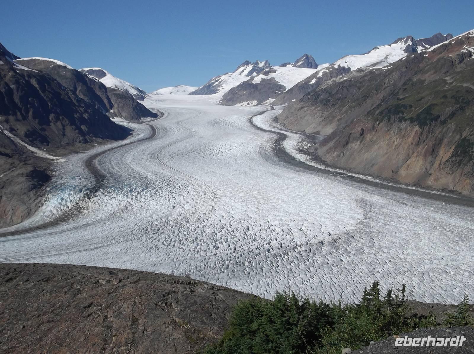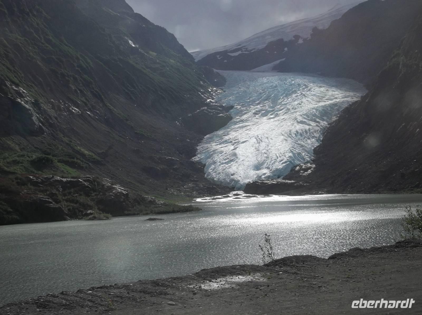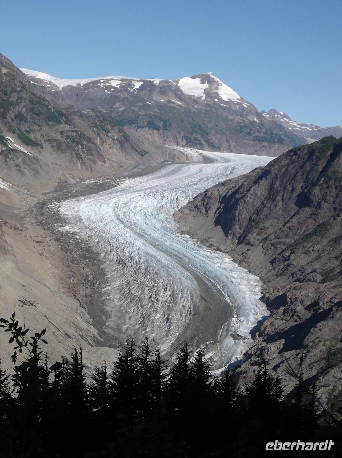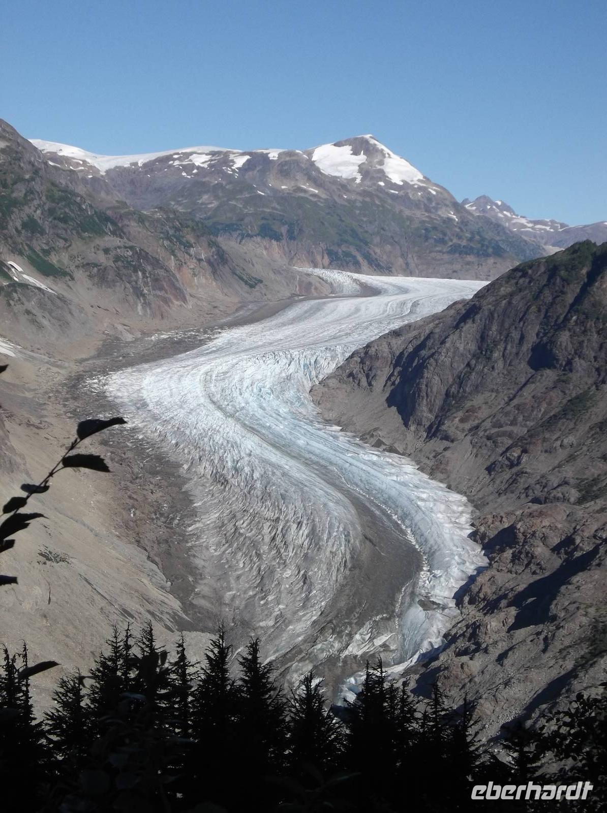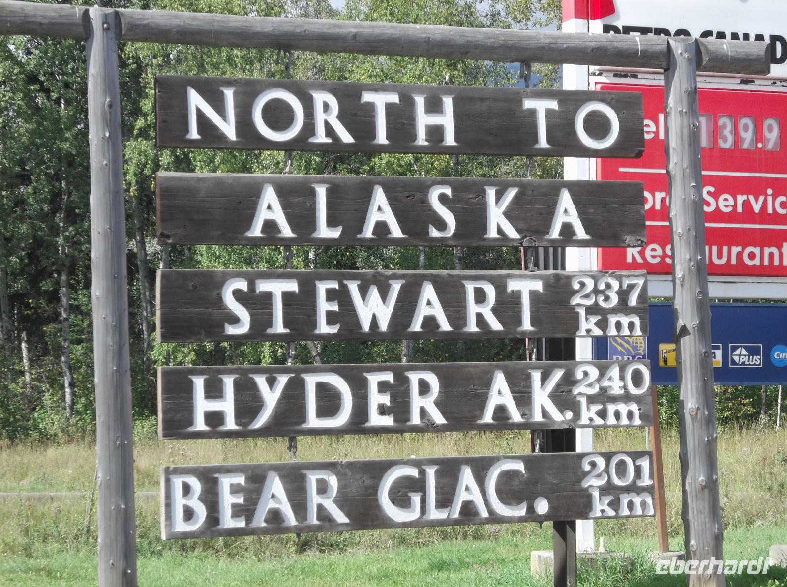 05.09.13: Heute fahren wir nach Stewart, an der Grenze zu Alaska gelegen. Wenn man dem Yellowhead Highway südwärts folgt, gelangt man bald zum Moricetown Canyon mit seinen tosenden Stromschnellen. Hier konnten wir Indianer beobachten, die in althergebrachter Manier die begehrten Fische fangen. Auf unserer Weiterfahrt kommen wir nach Hazelton, wo sich in der Nähe das Indianerdorf Ksan Village befindet, das bei einem traditionellen Siedlungsplatz der Gitskan Indianer eingerichtet wurde. In drei original nachgebauten, ursprünglich jeweils von einem Klan bewohnten Langhäusern erfährt man viel über das Leben und die Traditionen der Indianer und auch über die tiefe Symbolik der kunstvoll geschnitzten Totempfähle. Mit vielen neuen Eindrücken geht es nach Stewart vorbei am Beargletscher, der ab und zu große Eisblöcke in den See poltern läßt. Unterwegs geht es durch eine Szenerie von schroffen, schneebedeckten Gipfeln, Wasserfällen, Seen und Gletschern bis wir in Stewart ankommen.