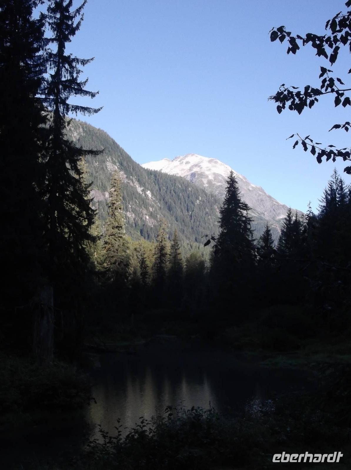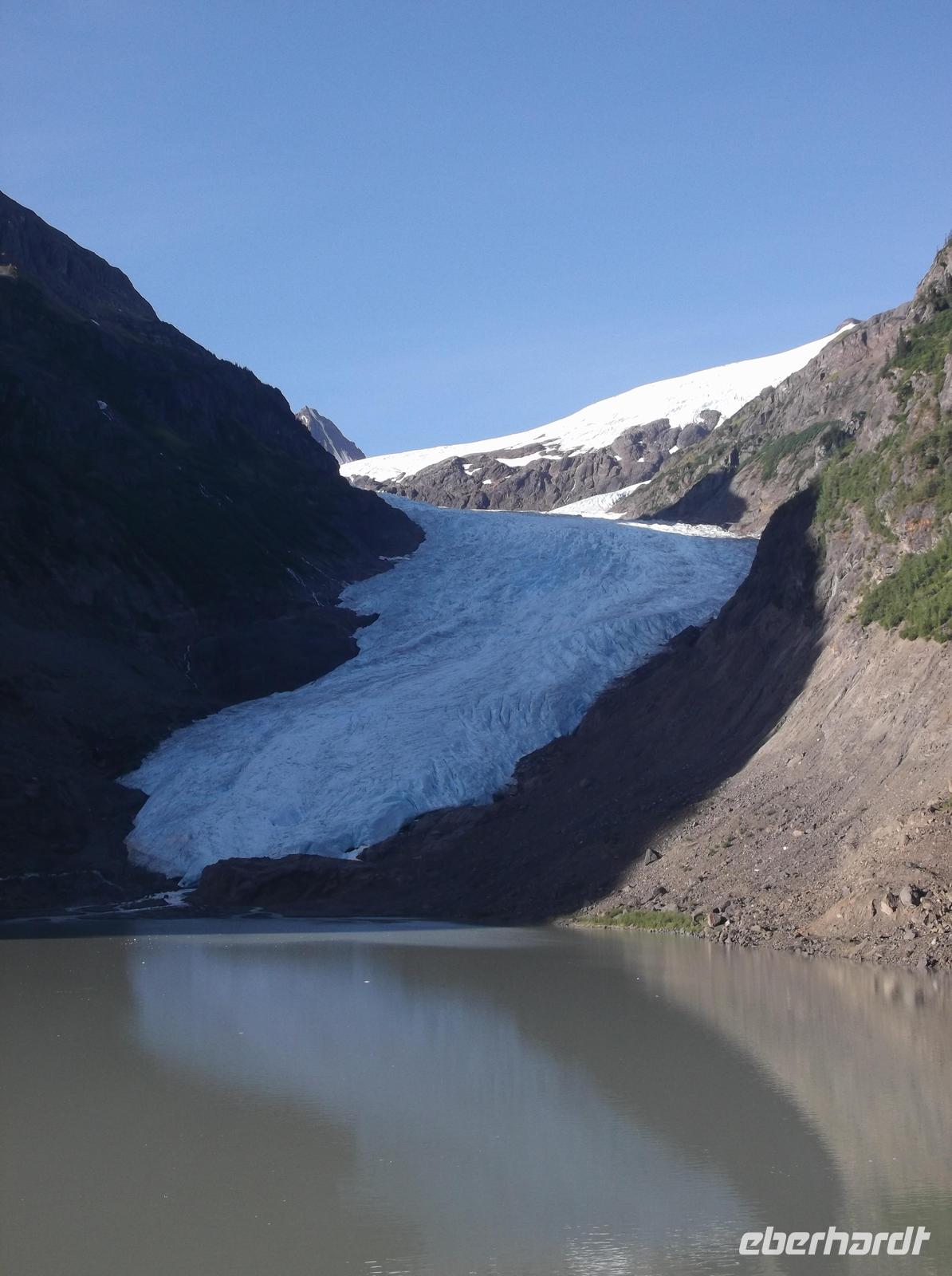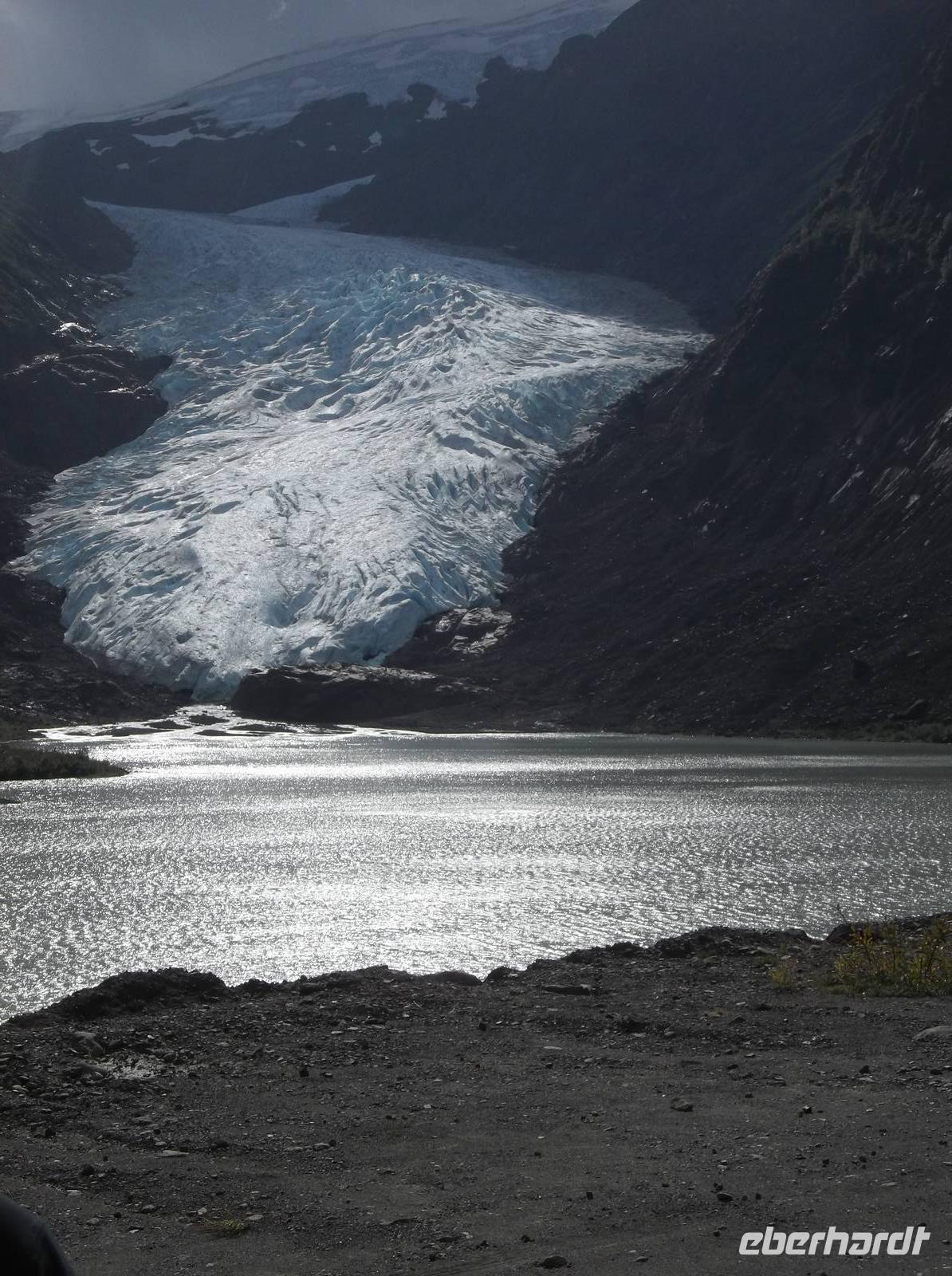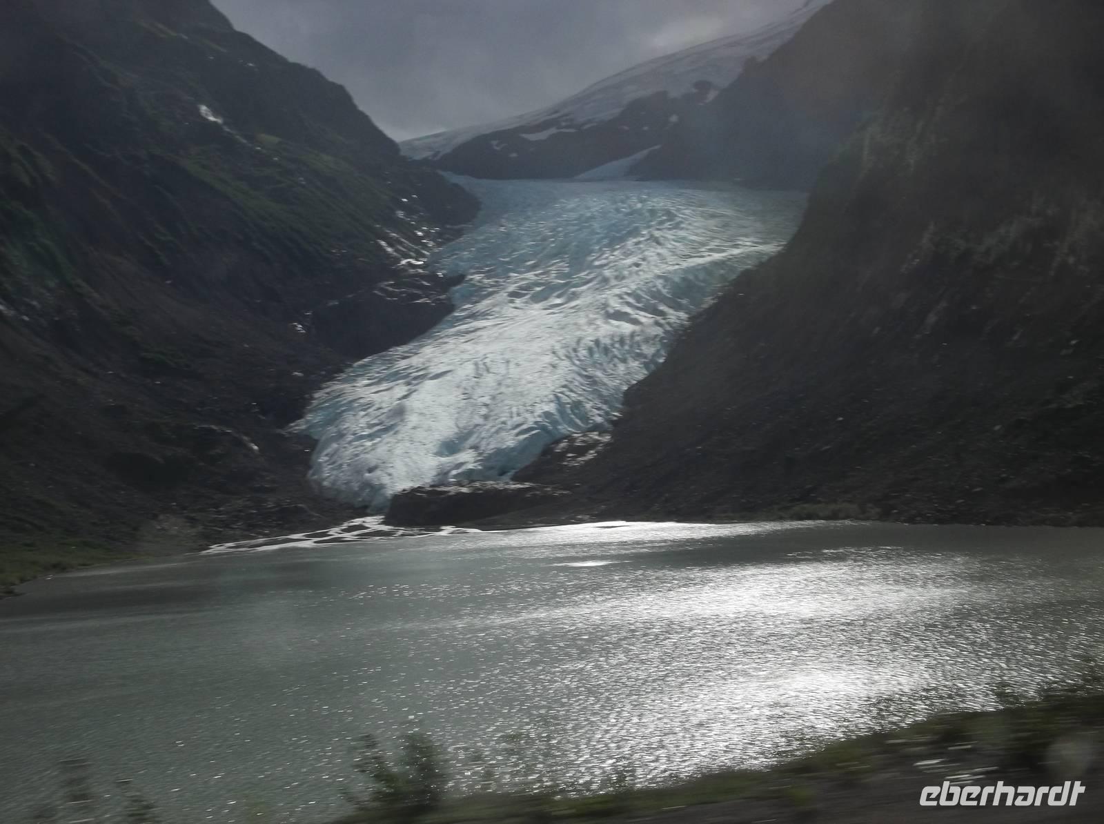 05.09.13: Heute fahren wir nach Stewart, an der Grenze zu Alaska gelegen. Wenn man dem Yellowhead Highway südwärts folgt, gelangt man bald zum Moricetown Canyon mit seinen tosenden Stromschnellen. Hier konnten wir Indianer beobachten, die in althergebrachter Manier die begehrten Fische fangen. Auf unserer Weiterfahrt kommen wir nach Hazelton, wo sich in der Nähe das Indianerdorf Ksan Village befindet, das bei einem traditionellen Siedlungsplatz der Gitskan Indianer eingerichtet wurde. In drei original nachgebauten, ursprünglich jeweils von einem Klan bewohnten Langhäusern erfährt man viel über das Leben und die Traditionen der Indianer und auch über die tiefe Symbolik der kunstvoll geschnitzten Totempfähle. Mit vielen neuen Eindrücken geht es nach Stewart vorbei am Beargletscher, der ab und zu große Eisblöcke in den See poltern läßt. Unterwegs geht es durch eine Szenerie von schroffen, schneebedeckten Gipfeln, Wasserfällen, Seen und Gletschern bis wir in Stewart ankommen.