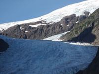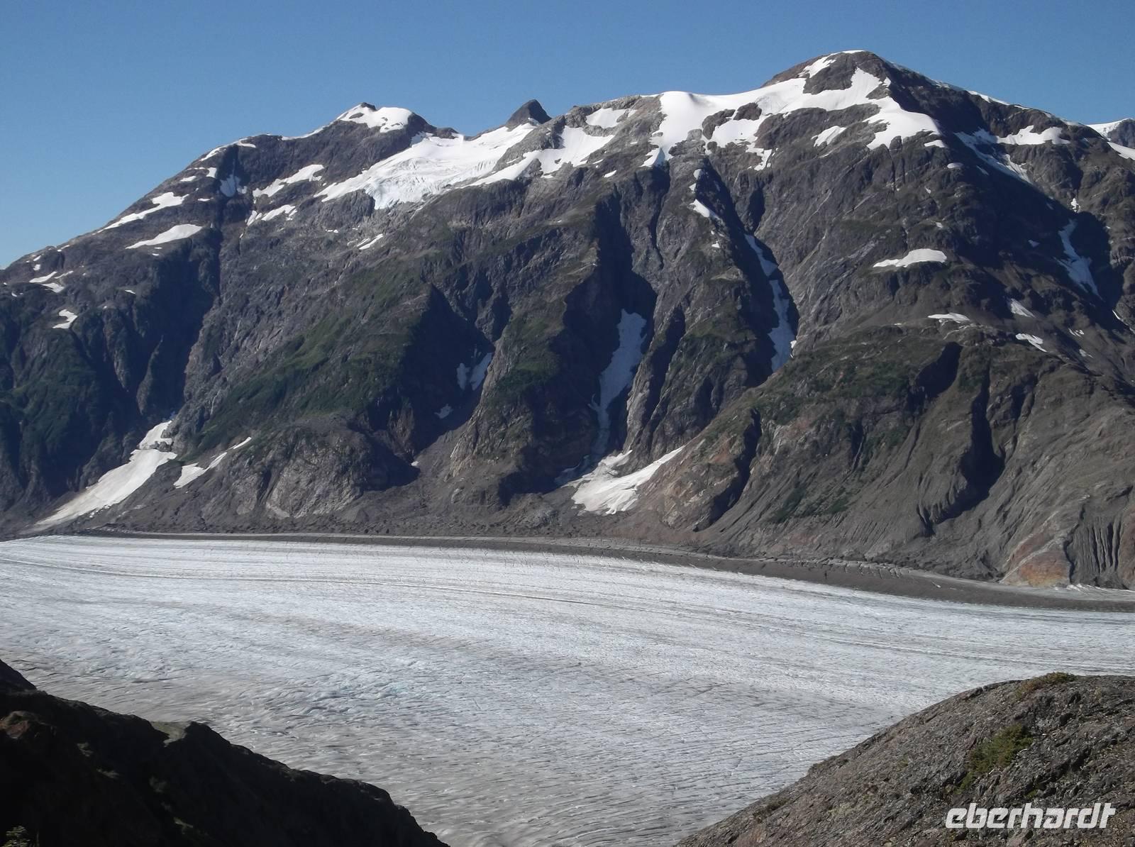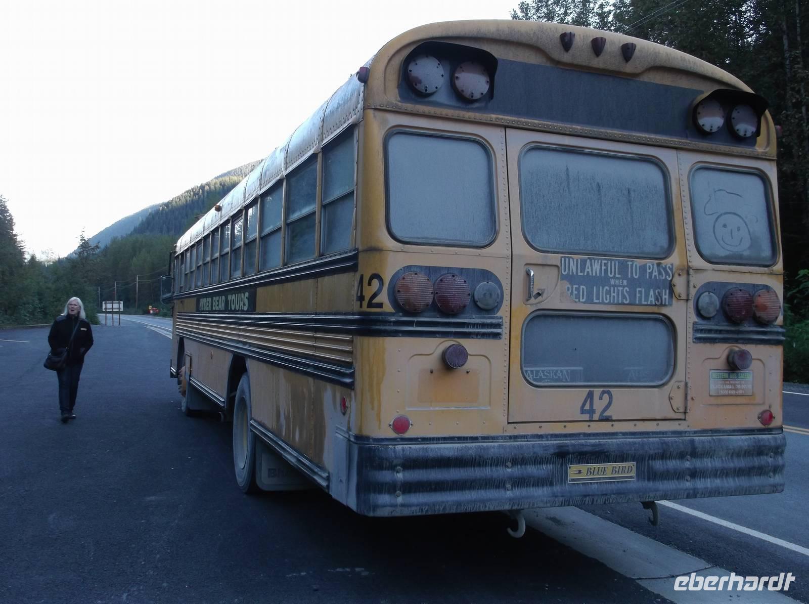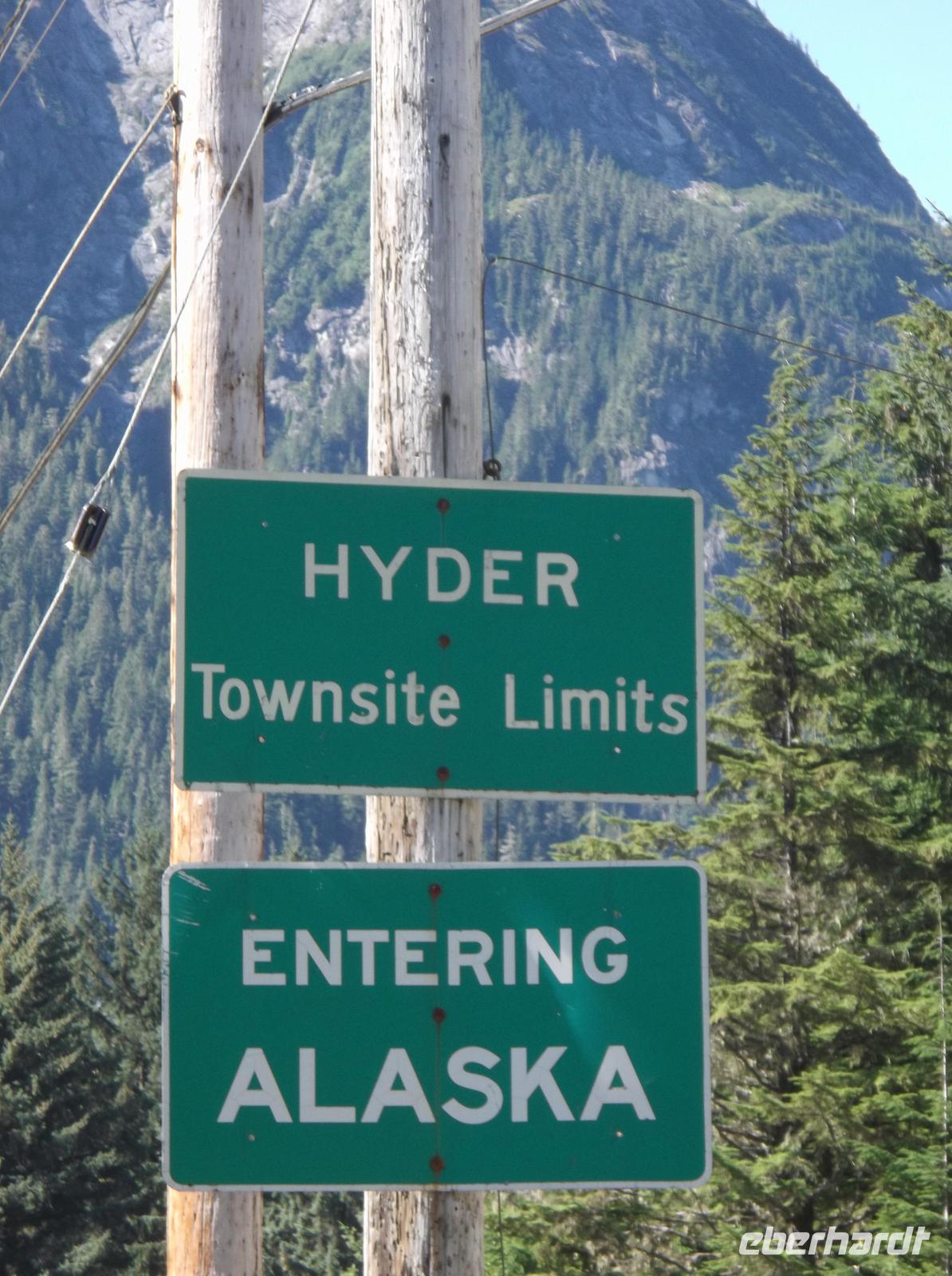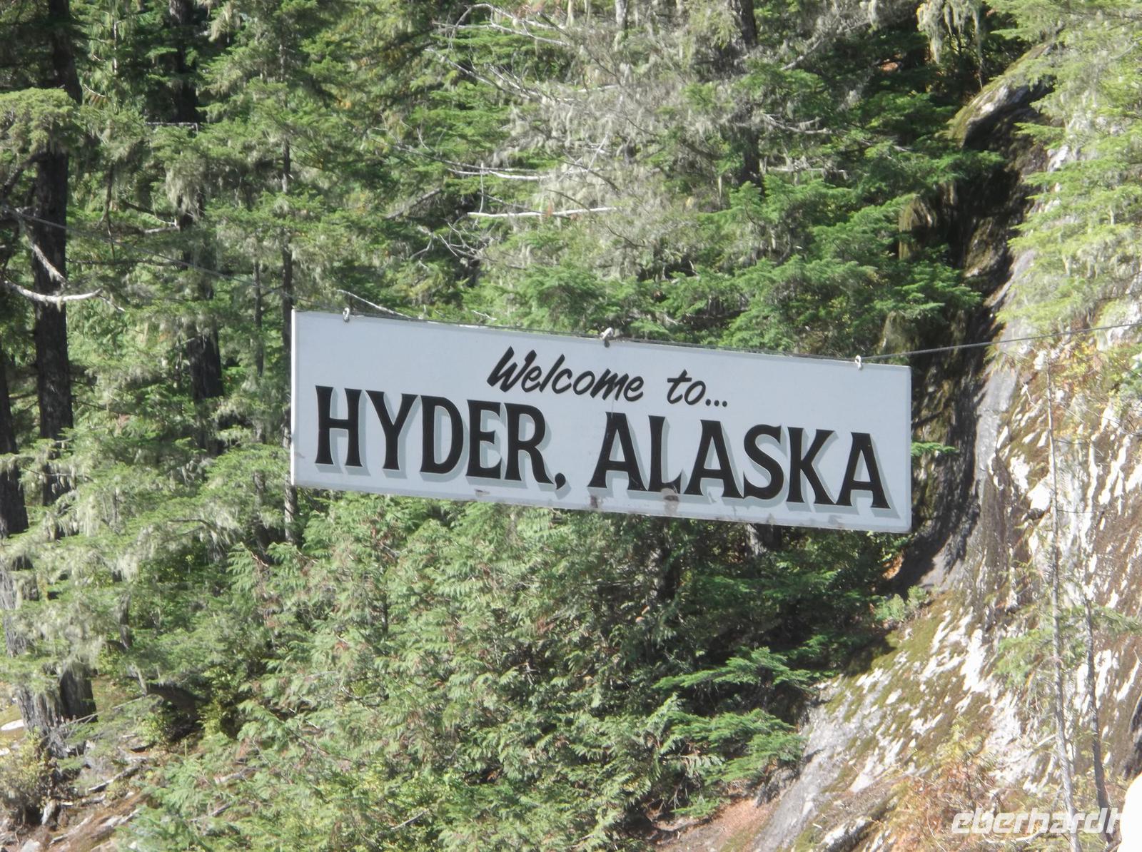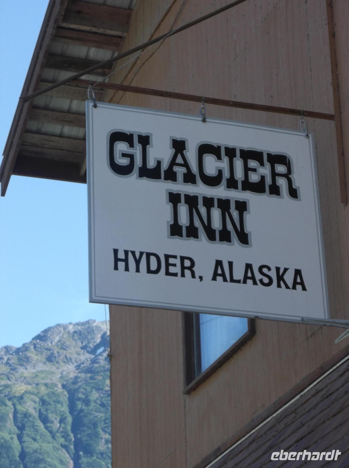 06.09.13: Der Tag der Bärenbeobachtung. Von Flint, einem einheimischen Ranger, werden wir mit einem gelben Schulbus abgeholt und lernen ein Stückchen Alaska kennen. Hyder nennt sich "the frienliest little ghost town". Zunächst halten wir am sogenannten Fish Creek, der vor allem bei Anglern sehr beliebt ist. Vielleicht läßt sich ein Bär blicken, wir haben jedenfalls den Photoapparat griffbereit. Aber Meister Petz gibt sich leider nicht die Ehre. Auf einer geschotterten, engen und kurvenreichen Straße vorbei an an verlassenen Stollen und noch aktiven Bergwerken eröffnet sich uns ein prachtvolles Panorama oberhalb des spektakulären Salmongletschers, des fünftgrößten Gletschers Nordamerikas. Nach dem Picknick kehren wir nach Hyder zurück. In Ermangelung anderer Attraktionen bietet der Ort