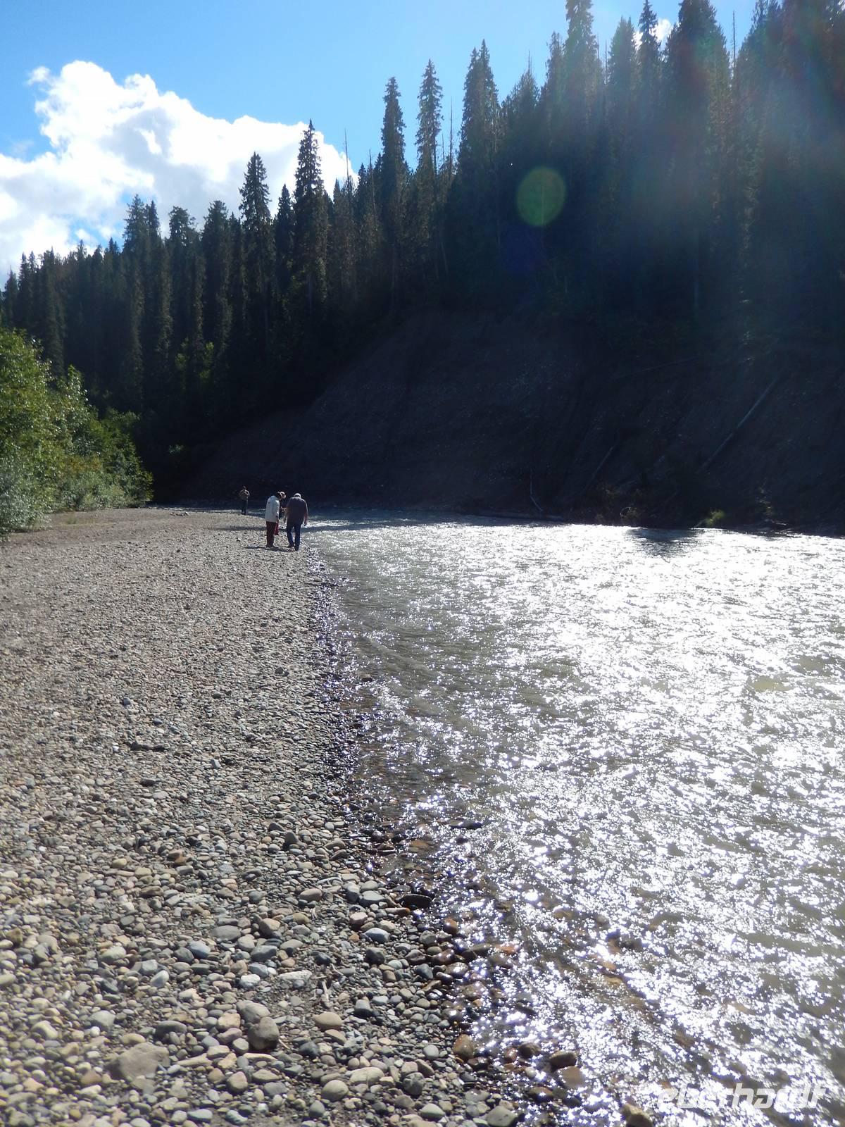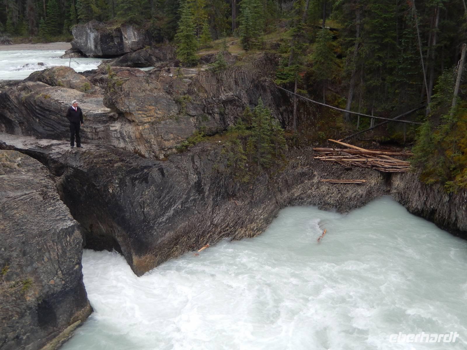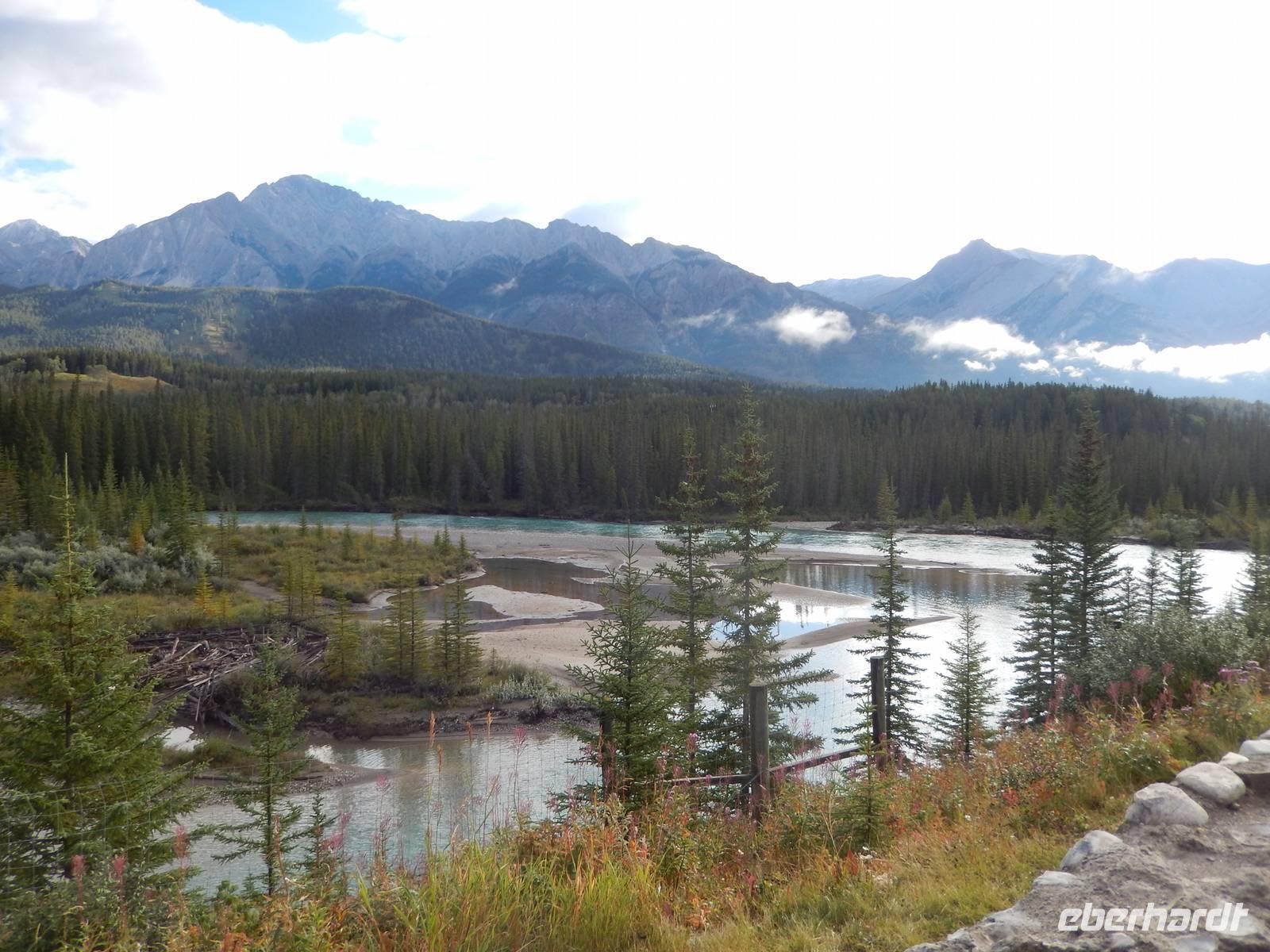 Heute mussten wir eine weite Strecke bewältigen. Zuerst ging es jedoch noch zu einer kurzen Besichtigung zu Fuß zu den Sunwapta Falls, unweit vom Hotel. Auf der Strecke nach Prince George überquerten wir zunächst die Grenze von Alberta nach British Columbia und mussten unsere Uhren um eine weitere Stunde zurück stellen. Zum Mittag erreichten wir einen Rastplatz mit grandiosem Blick auf den 3954 Meter hohen Mount Robson, den damit höchsten Berg der Rocky Mountains. Beim strahlenden Sonnenschein erhaschten wir einige schöne Fotos des von Gletschern übersähten Gipfels und genossen unser Picknick inmitten des Berpanoramas. Unterwegs machten wir noch einmal Halt am Rande des Fraser Rivers, wo wir den Abdruck einer Bärentatze im Schlamm am Flussufer entdeckten. Schließlich legten wir die restliche Strecke bis nach Prince George zurück. In der Holz- und Papierstadt bezogen wir unsere luxuriöses Hotel für die heutige Nacht.
