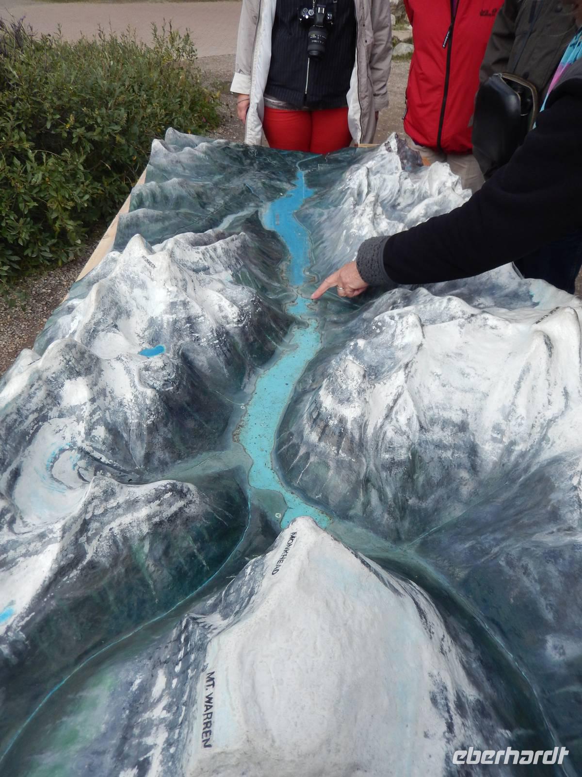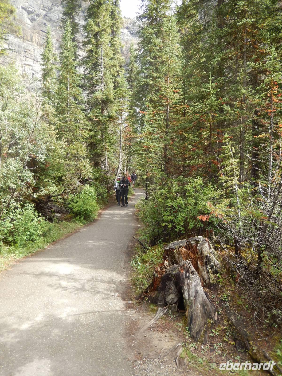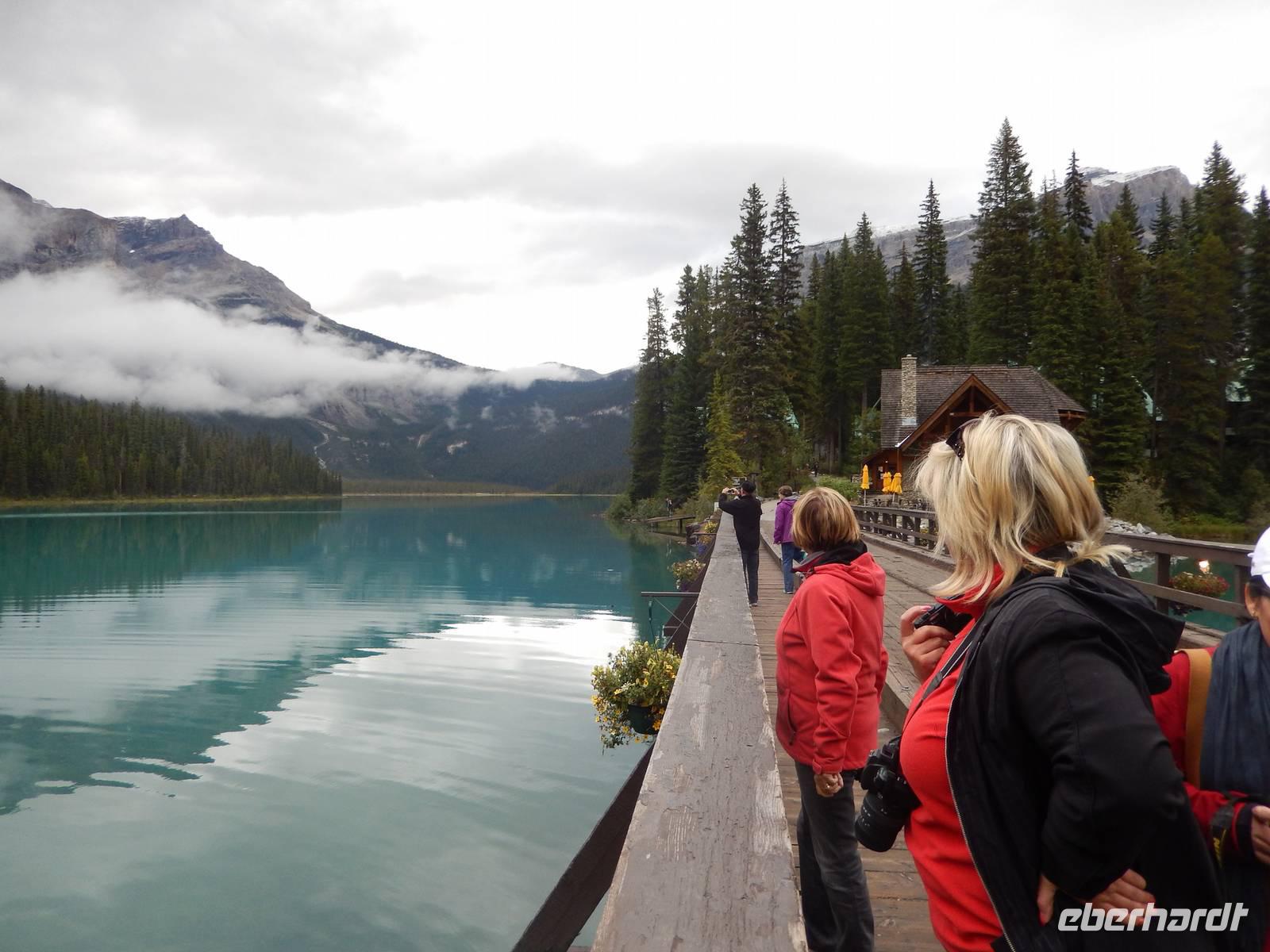 Nach einem reichhaltigen kanadischen Frühstück starteten wir heute mit leichten Jetjag-Erscheinungen zum ersten Tagesausflug. Wir legten einen Stopp am Castle Mountain ein, einem gewaltigen Bergmassiv, dessen höchster Punkt - Eisenhower Peak genannt - 2728 Meter in die Höhe ragt. Kurz darauf besuchten wir die sogenannten Spiraltunnel, von deren Aussichtspunkt aus man die langen Güterzüge bei der Durchfahrt beobachten kann. Dies konnten wir leider nicht, da kein Zug durch das Tunnelsystem unterwegs war, aber Schautafeln und Modelle zeigten uns trotzdem anschaulich, wie die Gleise unterirdisch angelegt sind, um bei dem starken Gefälle am Hang durch die künstliche Streckenverlängerung das Unfallrisiko zu mindern. Weiter ging die Fahrt zu einem kurzen Aufenthalt am Emerald Lake mit seiner wunderschönen smaragdgrünen Farbe. Wir spazierten individuell am Ufer entlang und genossen die frische Bergluft. Als nächstes sahen wir die eindrucksvolle Natural Bridge am Kicking Horse River. Durch natürliche Ausspülung entstand diese natürliche Brücke und zieht viele Besucher an. Damit wir nicht einrosten ging es gleich weiter zum nächsten Stopp an den Takakkaw Falls, einem imposantem Wasserfall inmitten romantisch-wilder Natur. Zur Mittagspause machten wir schließlich Halt am Schmelzwassersee Lake Louise, trotz wolkigem Wetter konnten wir sogar kurz einen Blick auf den Victoria Gletscher erhaschen, der ihn speist. Im glamourösen Grandhotel Chateau Lake Louise aus dem Jahr 1894 konnte jeder für sich etwas Essen gehen, die luxuriöse Anlage besichtigen oder gemütlich am Seeufer entlang spazieren - und das Bisschen Regen verdarb uns sicher auch nicht die Laune. Auf dem Rückweg entdeckten wir alte indianische Geister, die sogenannten „Hoodoos", helle, schmal aufragende Kalksteinfelsen, die durch Erosion eine ganz eigene Form erhielten und den alten Naturvölkern vielleicht ein wenig Angst einjagten. Außerdem genossen wir noch kurz den Ausblick auf das Banff Springs Hotel, ebenfalls aus dem 19. Jahrhundert, welches als Luxusdomizil für die besonders wohlhabenden Touristen dient. Zurück in Banff konnte jeder (trotz Sonntag) den verbleibenden Nachmittag für eigene Erkundungen auf der belebten Einkaufsstraße nutzen oder sich im Supermarkt ein paar Snacks für den nächsten Tag besorgen. Zum Abendessen fanden wir uns schließlich im Restaurant „Ticino" ein ließen den Abend gemütlich ausklingen.