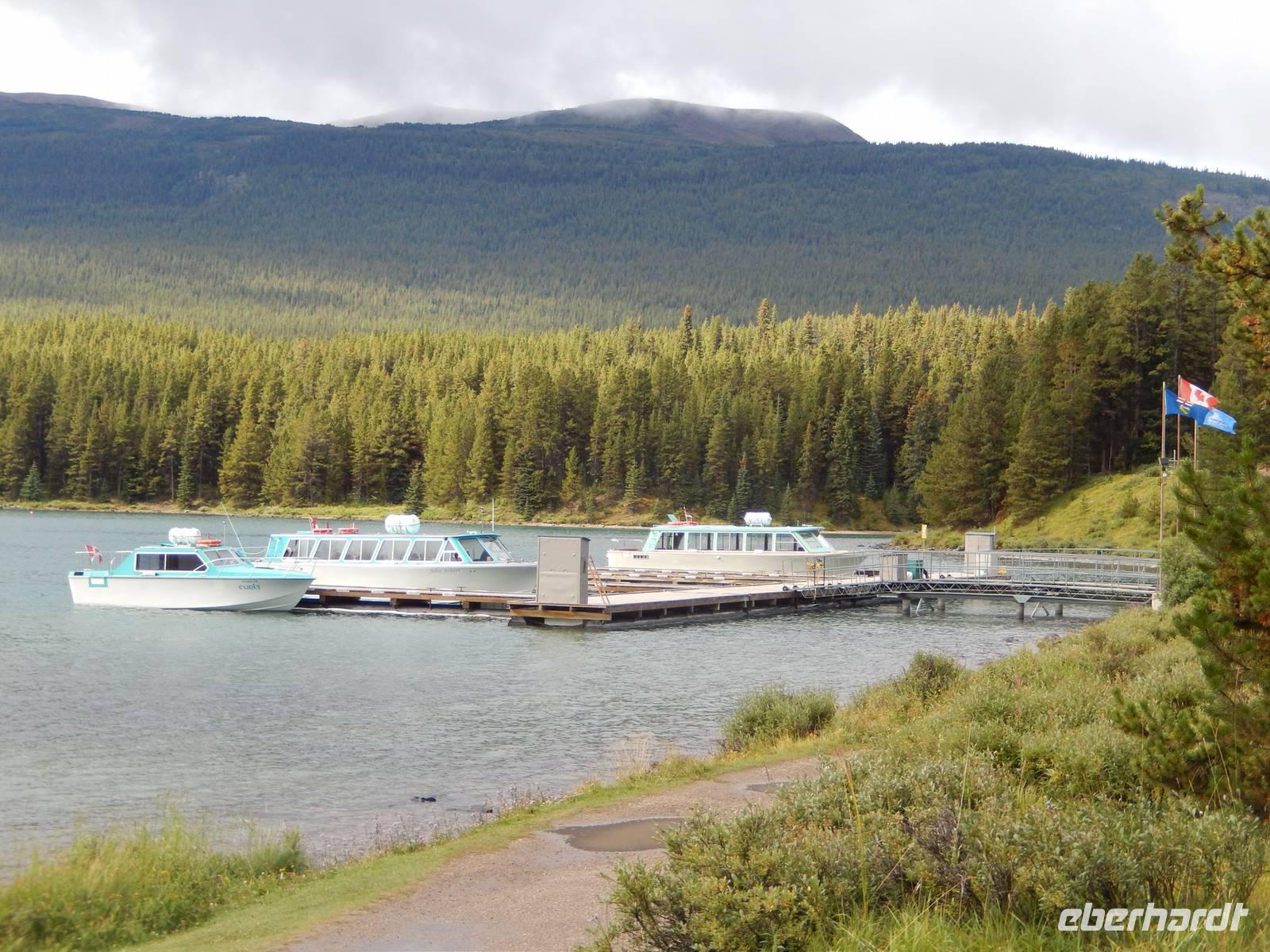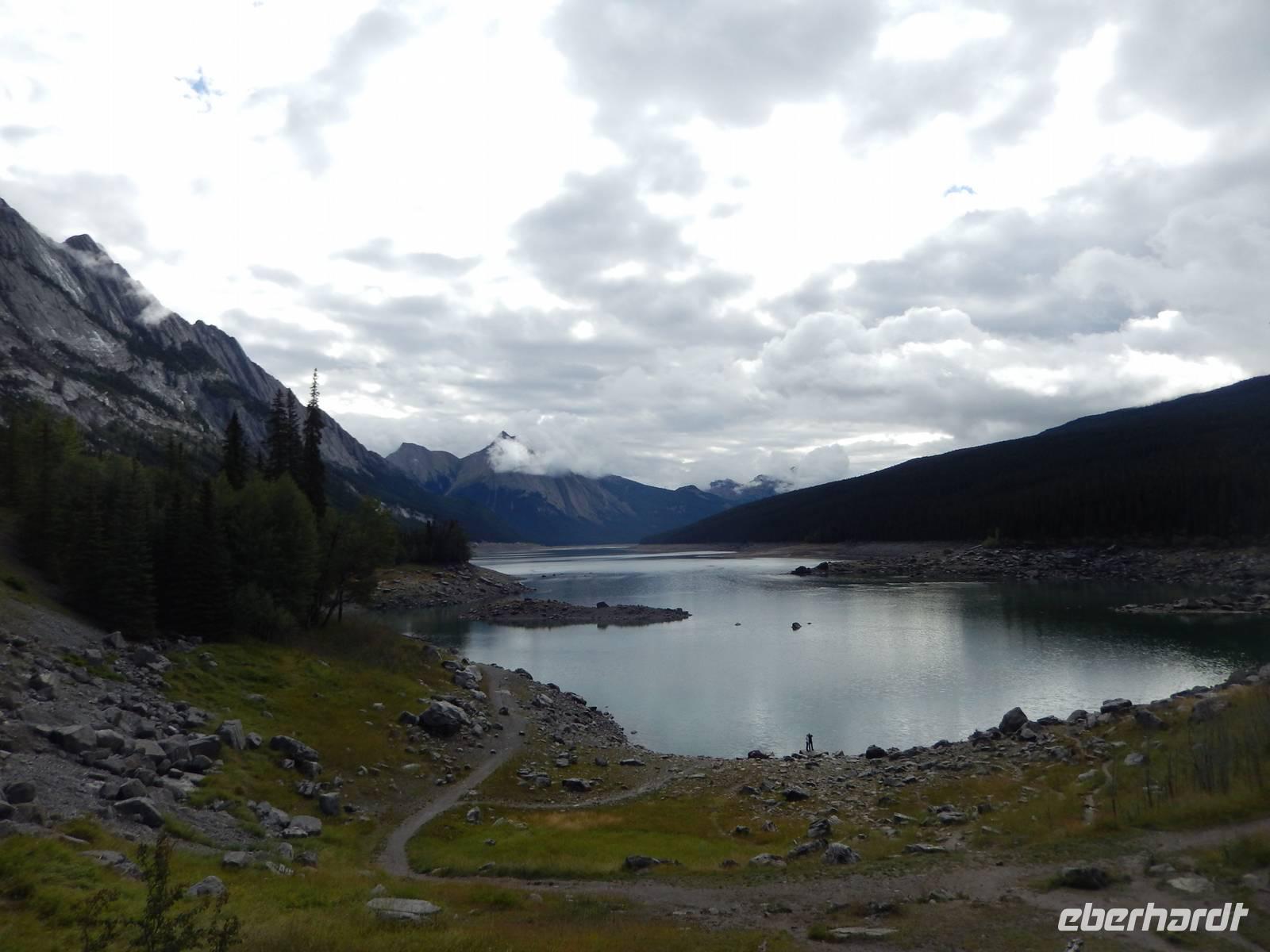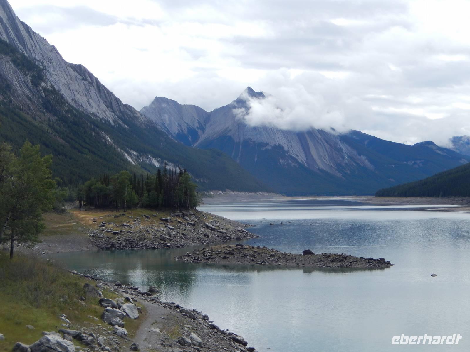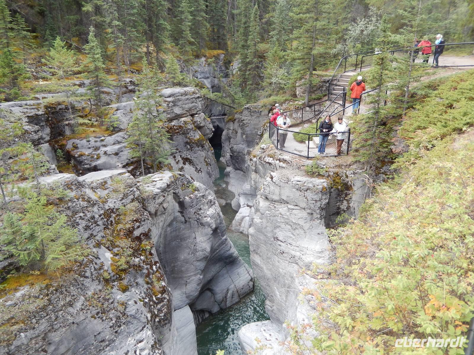 Auf dem Weg zum über 40 Kilometer langen Maligne Lake machten wir einen Zwischenstopp am Medicine Lake, der je nach Jahreszeit teilweise völlig im Erdreich versickert oder wieder vollläuft. Bei der Weiterfahrt konnten wir gut die vielen Tierspuren im flachen Wasser erkennen und entdeckten sogar einige Dickhornschafe an der Straße. Am Maligne Lake angekommen unternahmen wir einen gemächlichen Spaziergang am Ufer entlang, da das Wetter für eine Bootsfahrt zu wechselhaft war und eine schöne Aussicht damit nicht garantiert. Im Besucherzentrum direkt am See stärkten wir uns mit Suppe oder einem Sandwich und fuhren schließlich die gleiche Strecke zurück zu einem Abstecher an dem Maligne Canyon, eine eindrucksvolle Felsschlucht mit sprudelnden Wasserfällen, die man mithilfe mehrer Brücken überqueren und besichtigen kann. Weiter ging die Heimfahrt mit einer Pause in Jasper, wo wir noch etwas Zeit zum Bummeln hatten. Am späten Nachmittag erreichten wir wieder unsere Bungalow-Lodge in der Nähe der Sunwapta Falls.