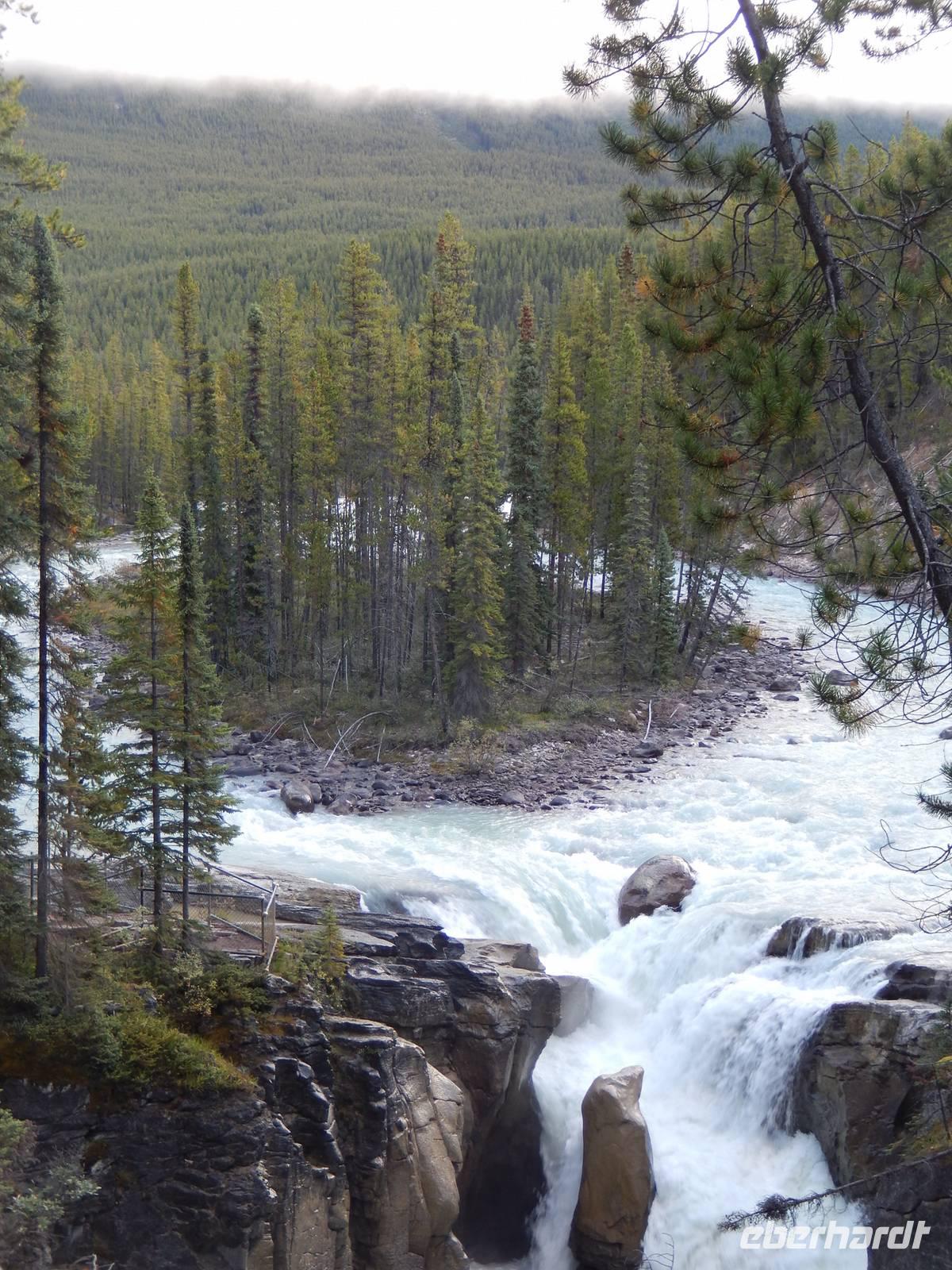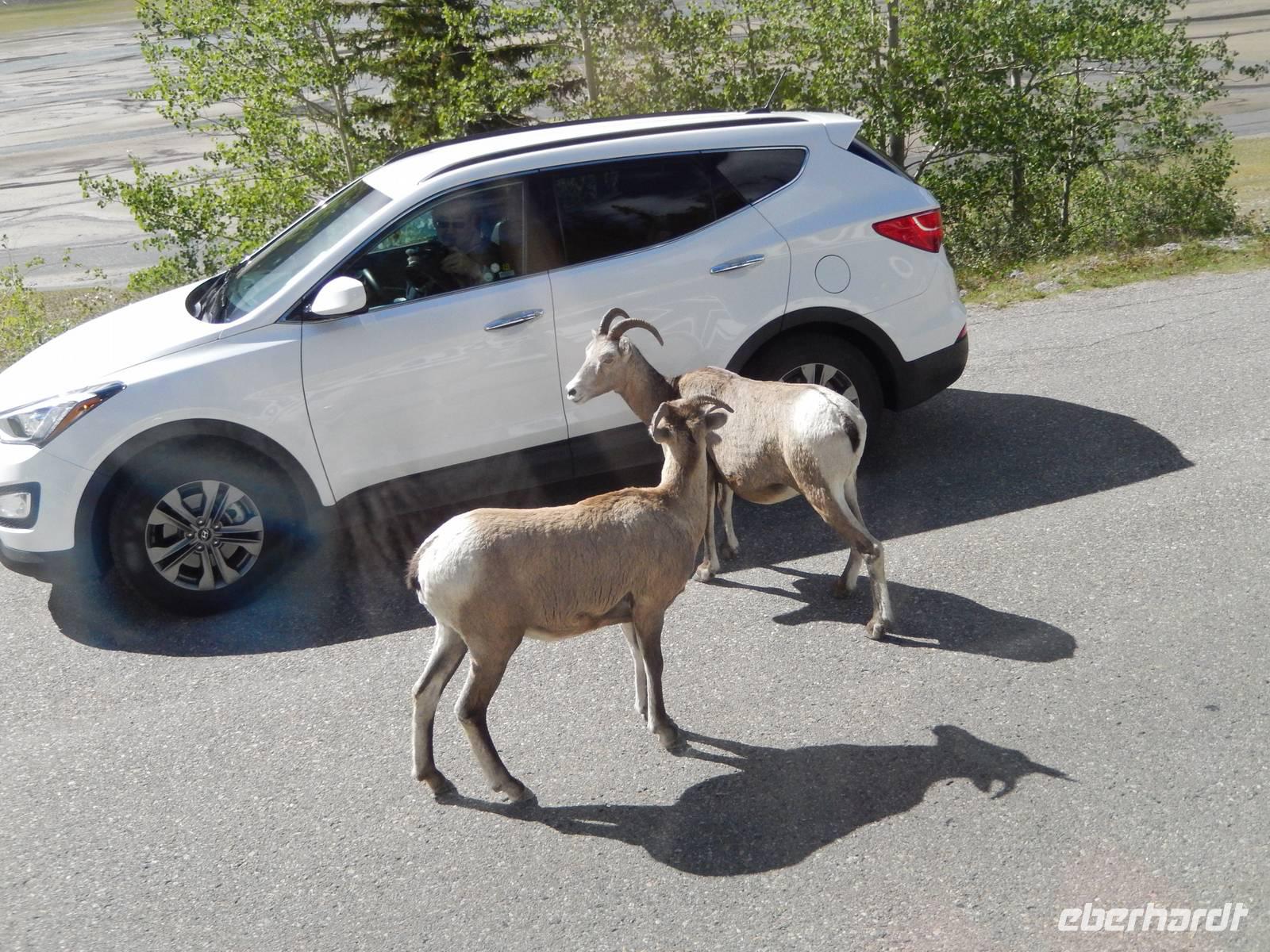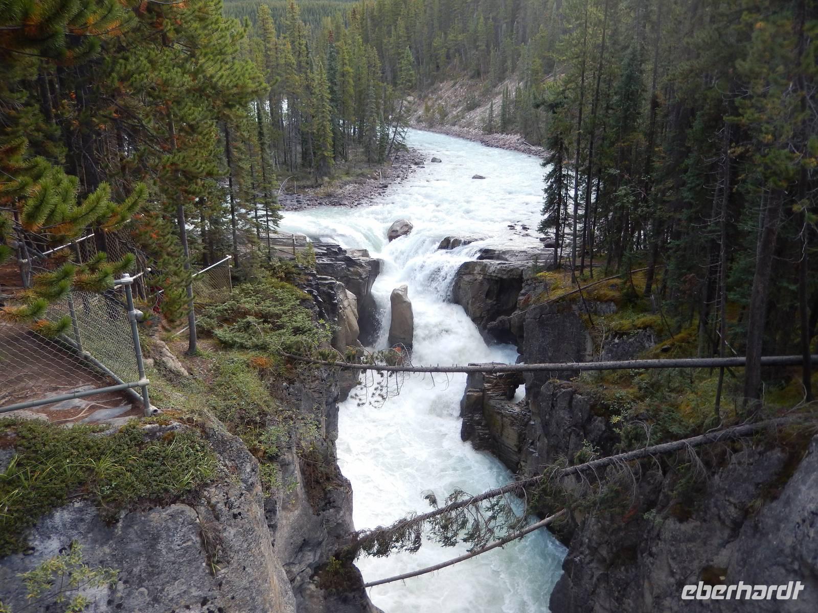 Auf dem Weg zum über 40 Kilometer langen Maligne Lake machten wir einen Zwischenstopp am Medicine Lake, der je nach Jahreszeit teilweise völlig im Erdreich versickert oder wieder vollläuft. Bei der Weiterfahrt konnten wir gut die vielen Tierspuren im flachen Wasser erkennen und entdeckten sogar einige Dickhornschafe an der Straße. Am Maligne Lake angekommen unternahmen wir einen gemächlichen Spaziergang am Ufer entlang, da das Wetter für eine Bootsfahrt zu wechselhaft war und eine schöne Aussicht damit nicht garantiert. Im Besucherzentrum direkt am See stärkten wir uns mit Suppe oder einem Sandwich und fuhren schließlich die gleiche Strecke zurück zu einem Abstecher an dem Maligne Canyon, eine eindrucksvolle Felsschlucht mit sprudelnden Wasserfällen, die man mithilfe mehrer Brücken überqueren und besichtigen kann. Weiter ging die Heimfahrt mit einer Pause in Jasper, wo wir noch etwas Zeit zum Bummeln hatten. Am späten Nachmittag erreichten wir wieder unsere Bungalow-Lodge in der Nähe der Sunwapta Falls.