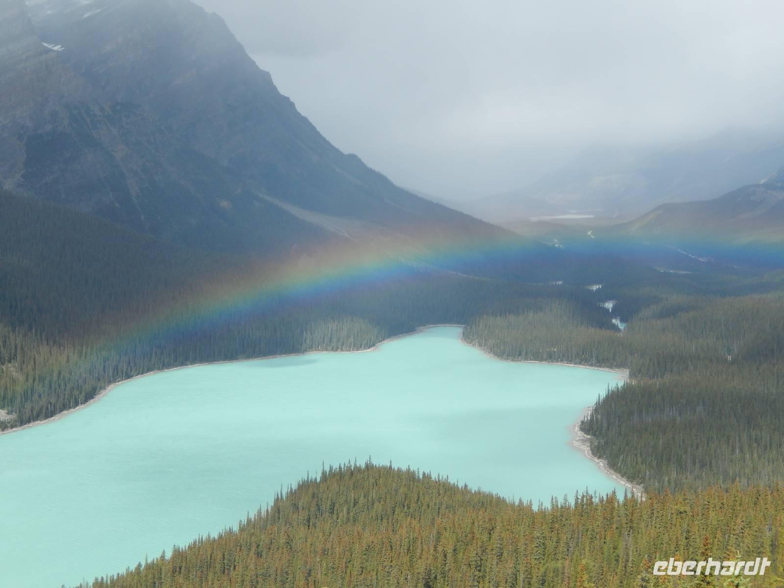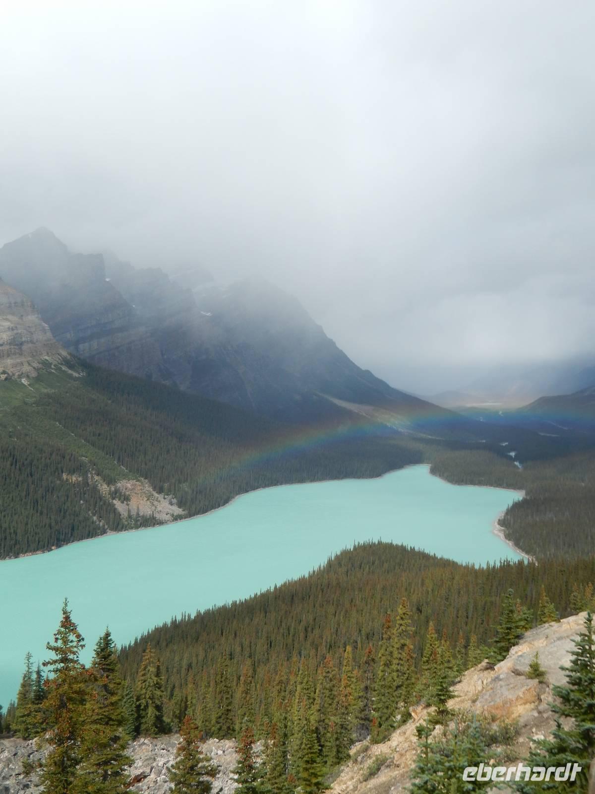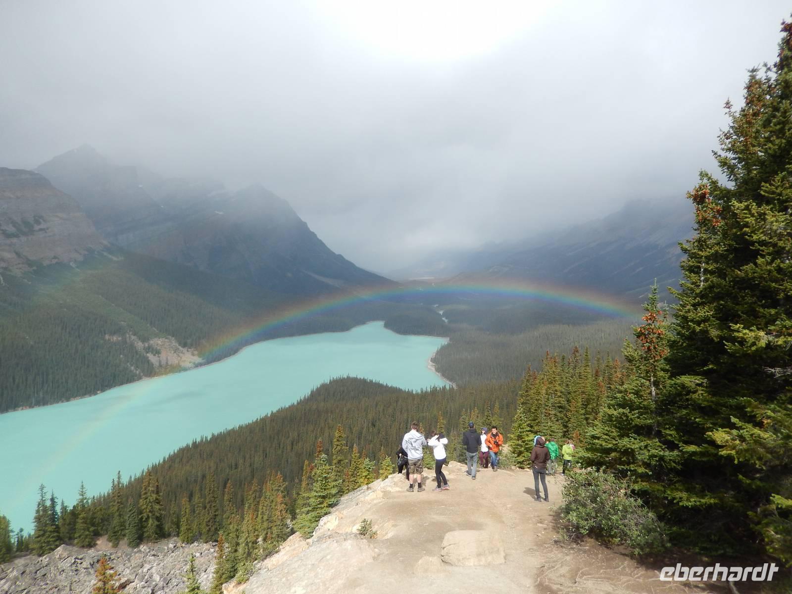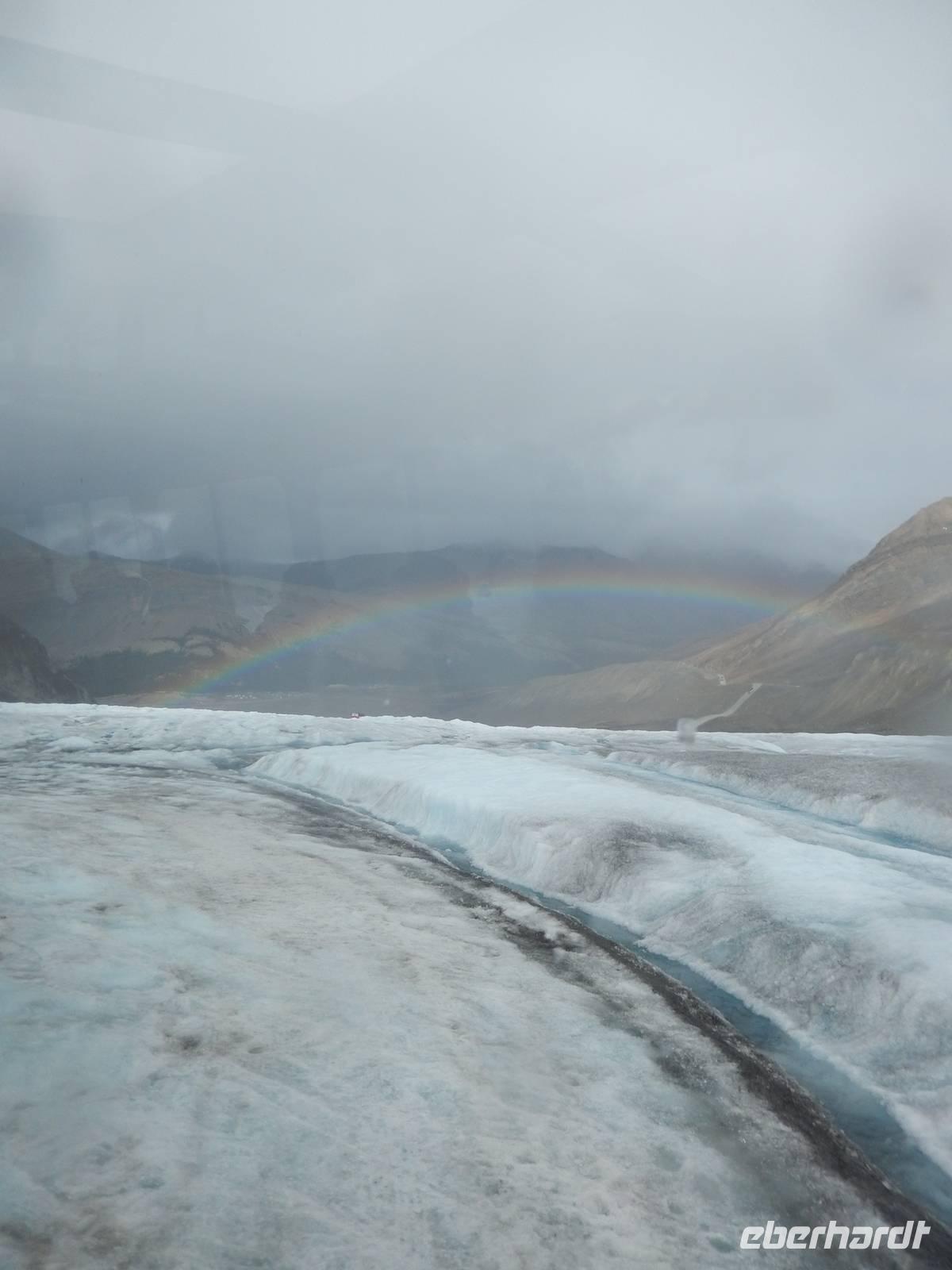 Erneut entdeckten wir heute auf zahlreichen Zwischenstopps Kanadas wilde und fast unberührte Natur. Zuerst hatten wir kurz Zeit, am Banff Wasserfall ein die Morgenluft zu genießen, dann ging es weiter zum wunderschönen Jack Lake mit seiner kleinen Halbinsel und verstreuten Booten. Am blassgrünen Peyto Lake überraschte uns ein prächtiger Regenbogen vor dem felsigen Bergpanorama, was besonders die Fotografen freute. Leider zog das Wetter im Laufe des Tages zu, sodass wir bei unserer Ankunft im Besucherzentrum am Atabasca-Gletscher fast nur graue „Suppe" sehen konnten. Trotzdem erklomm nach kurzer Aufwärmphase im Besucherzentrum die ganze Gruppe mutig im Gletscher-Cruiser das Columbia Icefield und ging auf dem Gletschereis spazieren. Natürlich waren wir aber dennoch froh, kurz darauf wieder warm und trocken im Bus zu sitzen, der uns schließlich in unser neues Hotel direkt in der Wildnis brachte. Dort angekommen tranken wir gemeinsam eine heiße Schokolade und bezogen unsere gemütlichen Bungalows. Zum Barbecue-Abendessen erzählte uns die Naturalistin Heidi alles Wissenswerte über die Tierwelt der umliegenden Nationalparks, natürlich mit tatkräftiger Unterstützung aus dem Publikum.