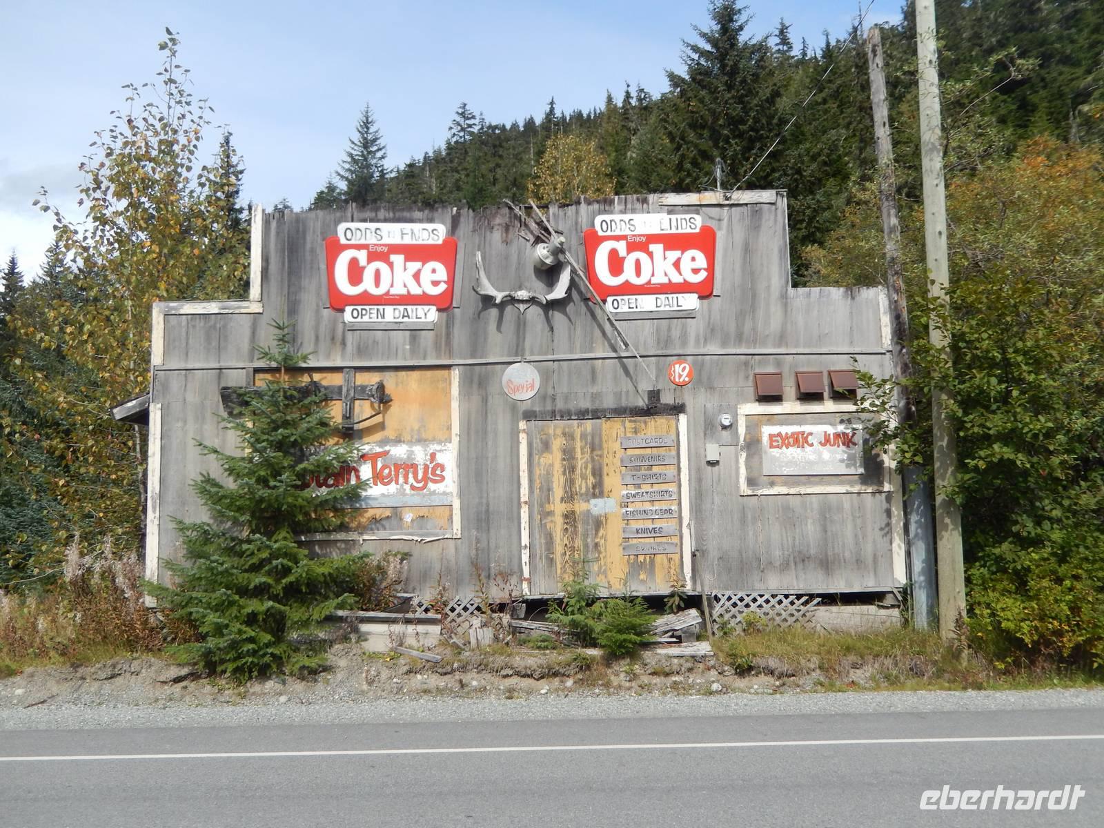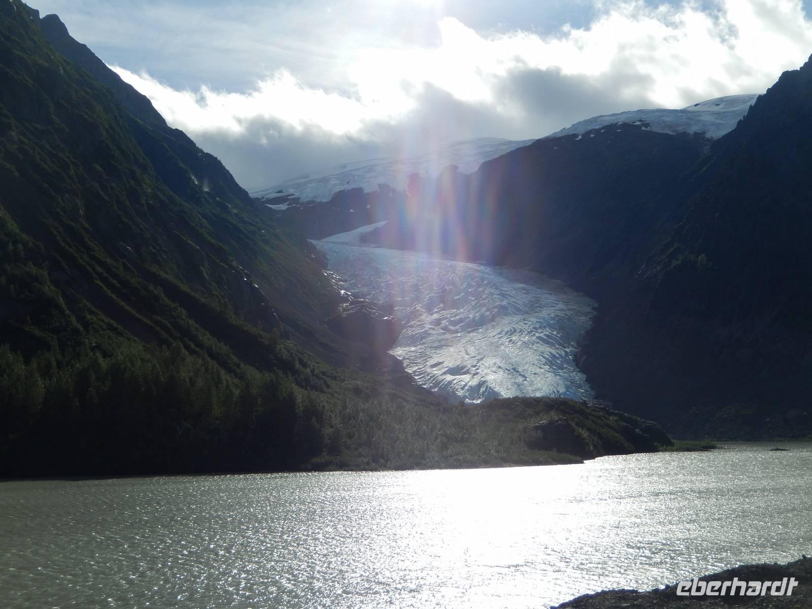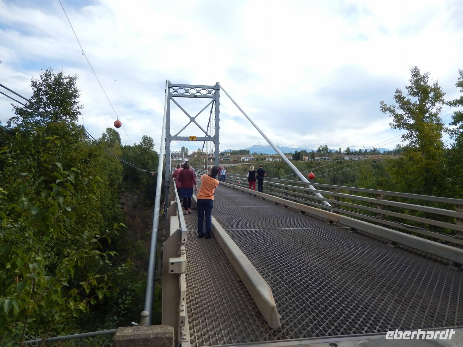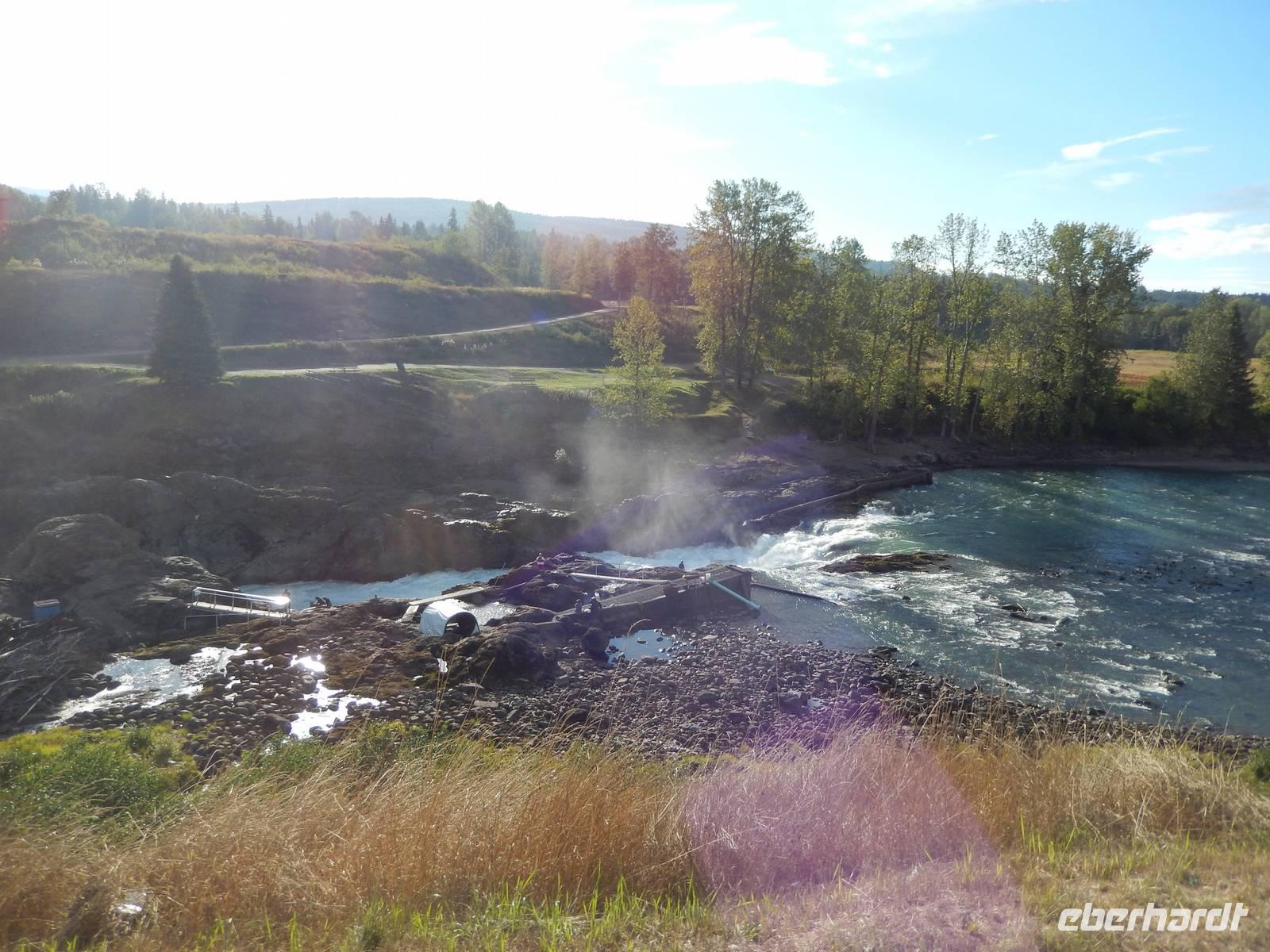 Auf nach Alaska! Oder zumindest beinahe, denn heute würden wir Stewart, direkt an der Grenze liegend, erreichen. Zuerst machten wir aber unseren routinierten vormittäglichen Halt, diesmal am tosenden Moricetown Canyon, wo wir einheimischen Fischern beim Lachse fangen zuschauen konnten. Danach erreichten wir das originalgetreu nachgebaute Indianerdorf Ksan in Hazelton. Bei einer Führung durch die verschiedenen Langhäuser erfuhren wir viel über die Kultur der alten Indianderstämme des Gitskan-Volkes. Wir bestaunten die zahlreichen handgemachten Alltagsgegenstände und die kunstvolle Ausschmückung innerhalb der Häuser. Eine echte Indianerin zeigte uns schließlich die traditionellen Tanzkostüme und sang und tanzte sogar für uns. Weiterhin konnten wir die gewaltigen Totempfähle außerhalb der Gebäude bewundern und einem Holzschnitzer bei der Arbeit über die Schulter schauen. Anschließend setzten wir unseren Weg nach Stewart fort und überquerten zu Fuß die „durchsichtige" Hängebrücke über dem 80 Meter tiefen Hagwiglet Canyon, deren Boden nur aus Stahlgeflecht besteht, durch das man in die Tiefe schauen kann. Wir stoppten an einer kleinen Tankstelle, damit Goran unseren Bus füttern konnte. Unterdessen betrachteten wir einmal aus der Nähe die mannshohen Pick up Trucks und SUVs der Kanadier, die in dieser Landschaft das übliche PKW-Modell zu sein scheinen. Wir entdeckten einen weiteren Schwarzbären, der vor uns die Straße überquerte und erreichten kurz vor unserer heutigen Endstation noch den Bear-Gletscher, der in der Abendsonne glitzerte. Zum Abschluss des Tages wurde uns in unserem Hotel in Stewart zum Abendessen je ein gegrilltes halbes Hähnchen serviert, das nicht nur gewaltig sondern auch sehr lecker war. Rund und satt fielen wir in unsere Betten.