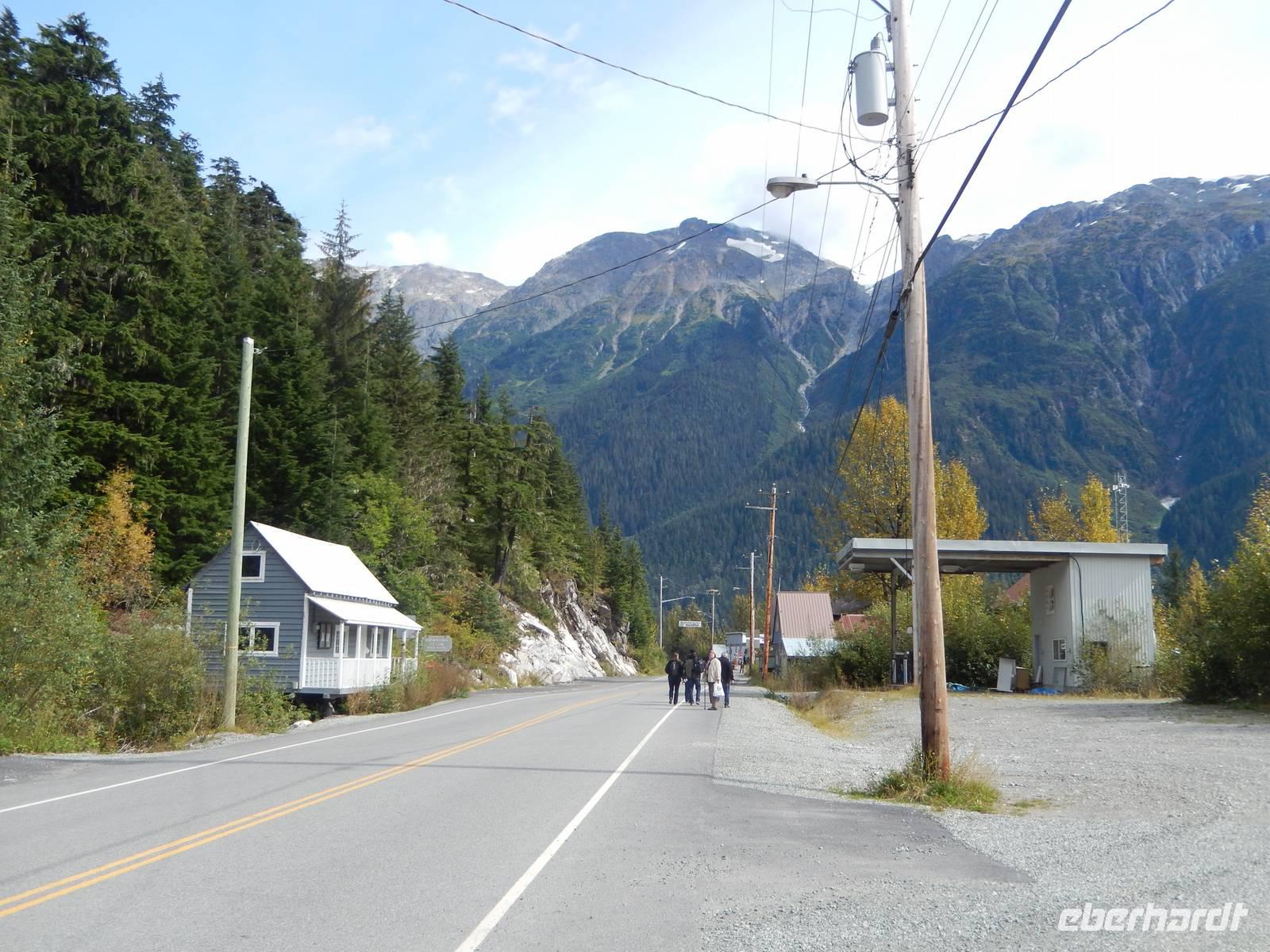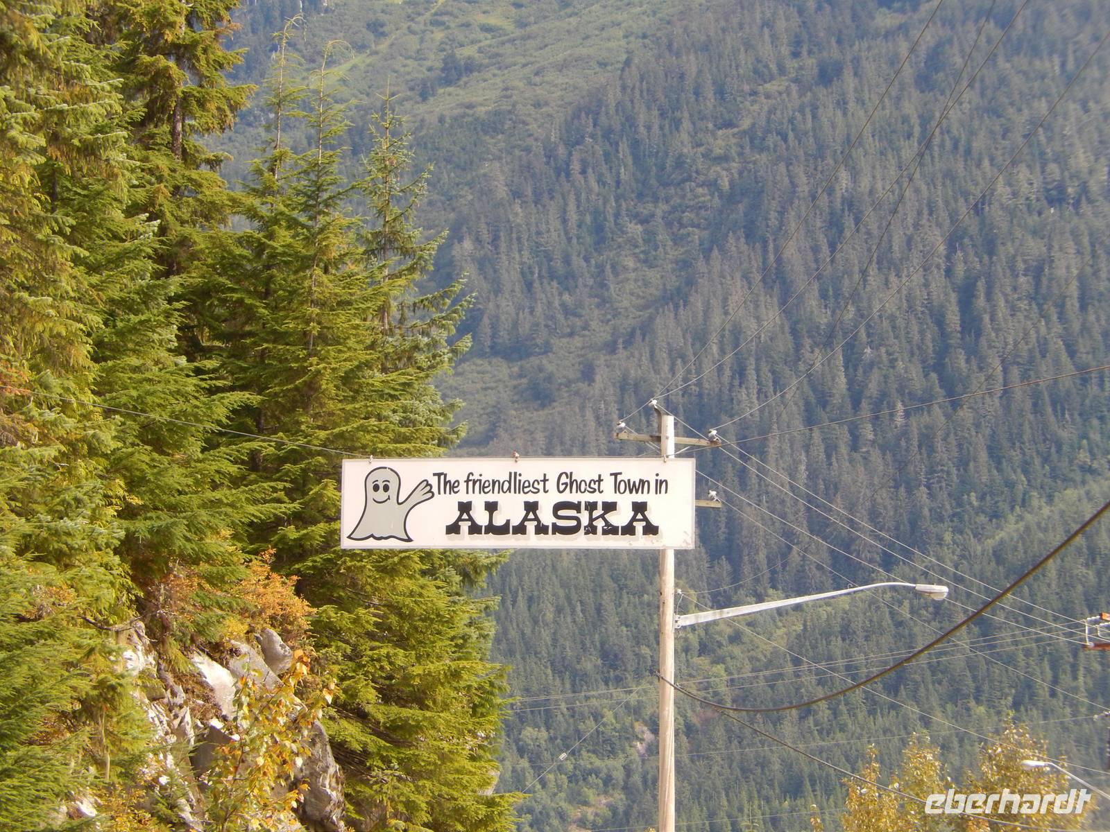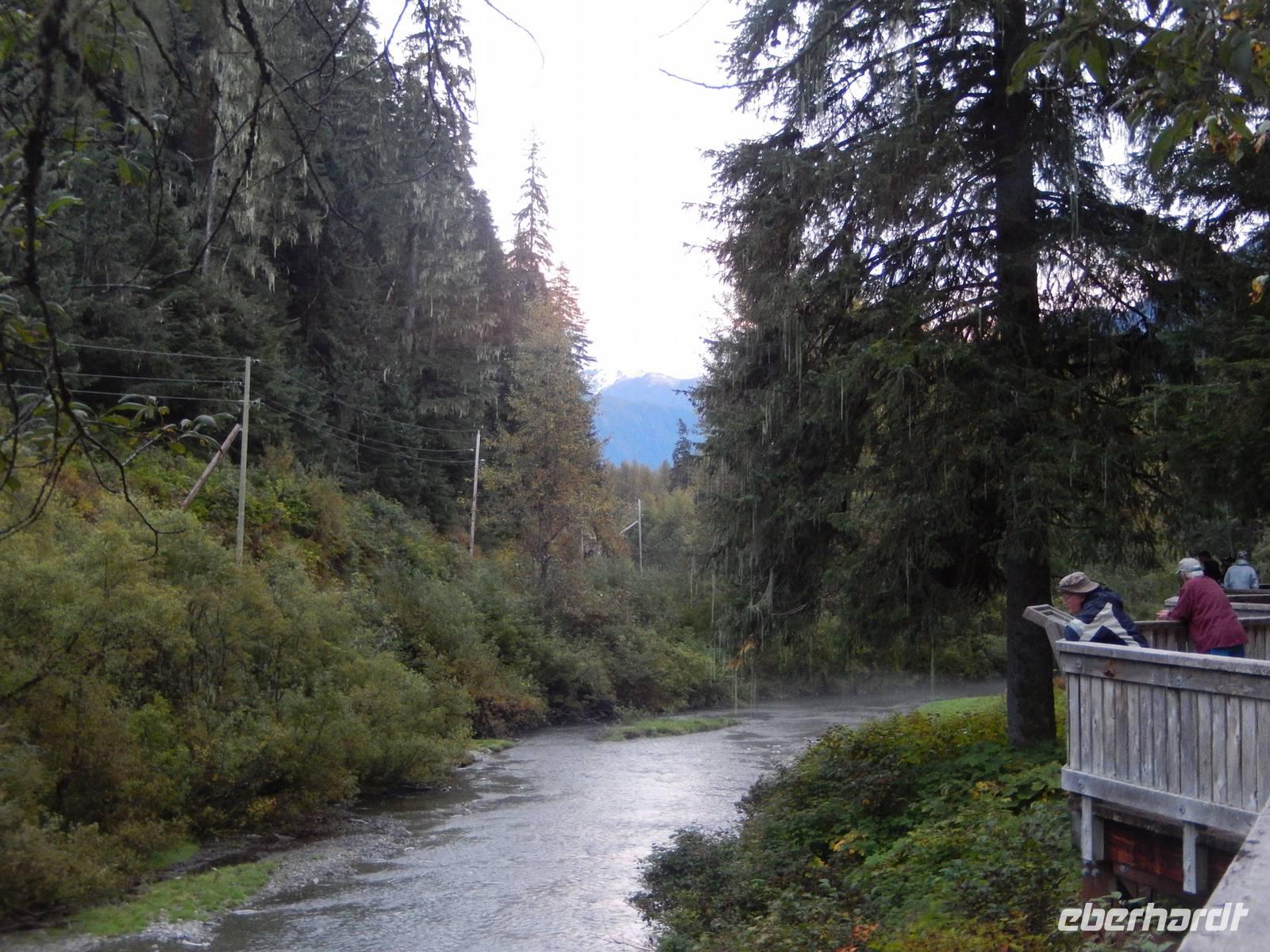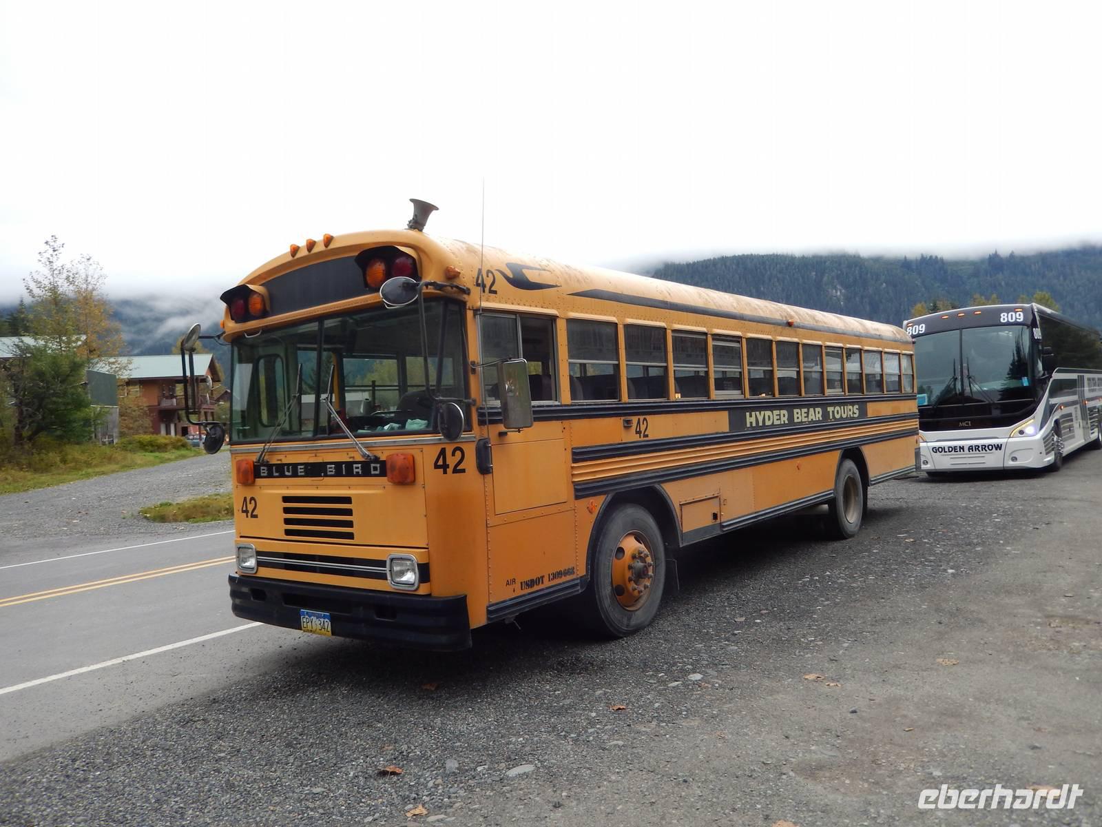 Obwohl Goran heute eigentlich seinen freien Tag gehabt hätte, war er natürlich sofort bereit, uns mit seinem Bus über die Grenze nach Hyder zu fahren, denn unsere eigentlicher Bus für den heutigen Tag hatte nur eine Fahr-Lizenz innerhalb der USA und konnte uns deshalb nicht am Hotel abholen. Das rechneten wir Goran natürlich hoch an, der zumindest den Rest des Ausflugs mit uns als Gast unternahm. In Hyder, der freundlichsten Geisterstadt der Welt, empfing uns ein amerikanischer, gelber Schulbus. Fahrer Flint chauffierte uns zuerst zum Beobachtungspunkt am Fish Creek, wo man gerade jetzt zur Lachswanderung oft Bären beobachten konnte. Leider hatten wir kein Glück und bekamen außer Fischen und Möwen nichts zu sehen - abgesehen von der traumhaften Natur. Wir fuhren weiter entlang kaum befestigter Bergstraßen bis hinauf zum Salmon-Gletscher der sowohl durch seine Größe als auch seine Schönheit besticht. Wir machten ein ausgiebiges Picknick mit Truthahnsandwiches, Keksen und Saft und genossen dabei die Gletscherwelt unter uns. Ein wenig gepiesakt durch die vielen Mücken machten wir uns schließlich auf den Rückweg nach Hyder, wo wir entlang des Highways durch den Ort spazierten und die vielen verlassenen Blockhütten und alten Geschäfte betrachteten. Im Glacier Inn, einem Hotel mit Bar wurden wir dann offiziell „hyderized" und zwar mithilfe eines starken Skake-Bite-Schnapses, der doch ziemlich durchheizte. Im kleinen Geschäft gegenüber konnten wir Souveniers kaufen, darunter auch Besonderheiten wie Rentierfleisch in Dosen oder hausgemachtes Toffee. Goran brachte uns schließlich nach einer kurzen Passkontrolle an der Grenze zurück nach Stewart. Am frühen Abend trafen wir uns dann erneut zu einem weiteren Versuch, einen Bären zu entdecken und fuhren erneut über die Grenze zum Fish Creek, doch auch diesmal hatten wir kein Glück und fuhren ohne Bärenfotos zurück ins Hotel.