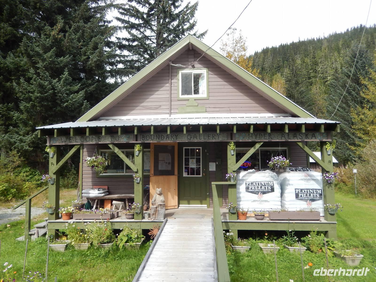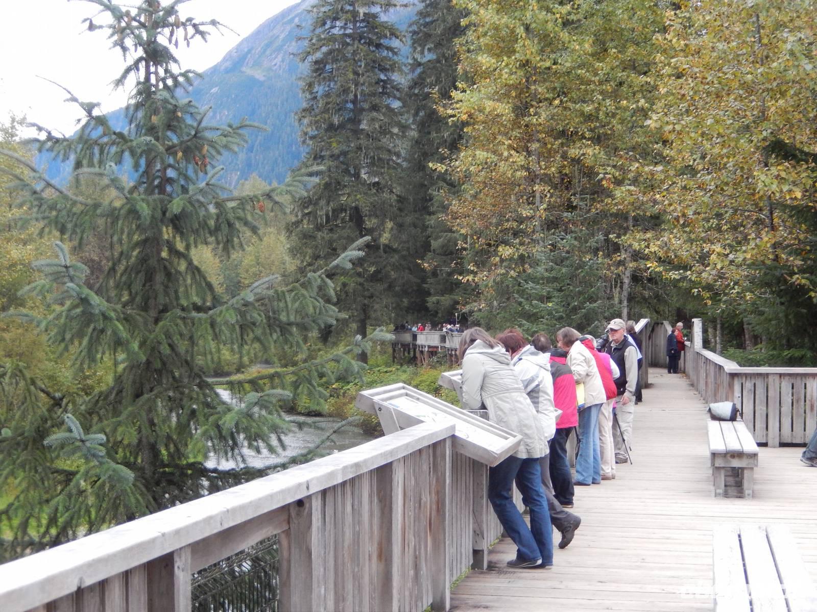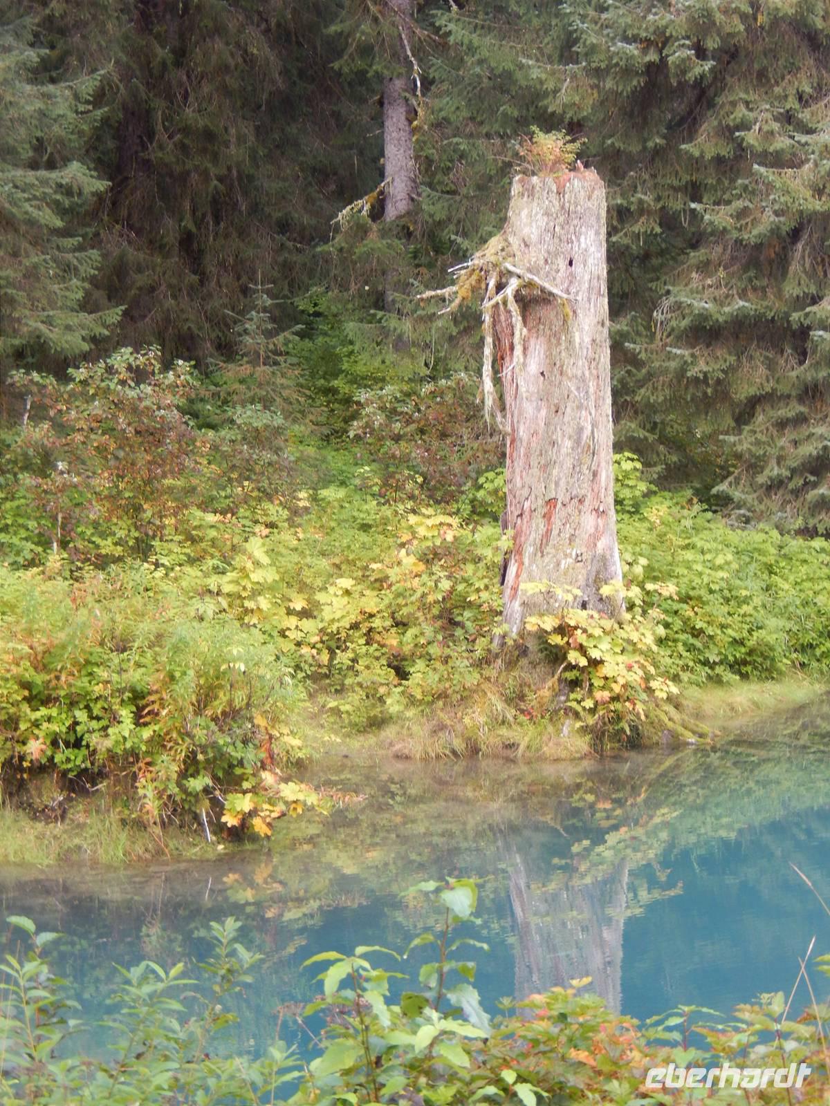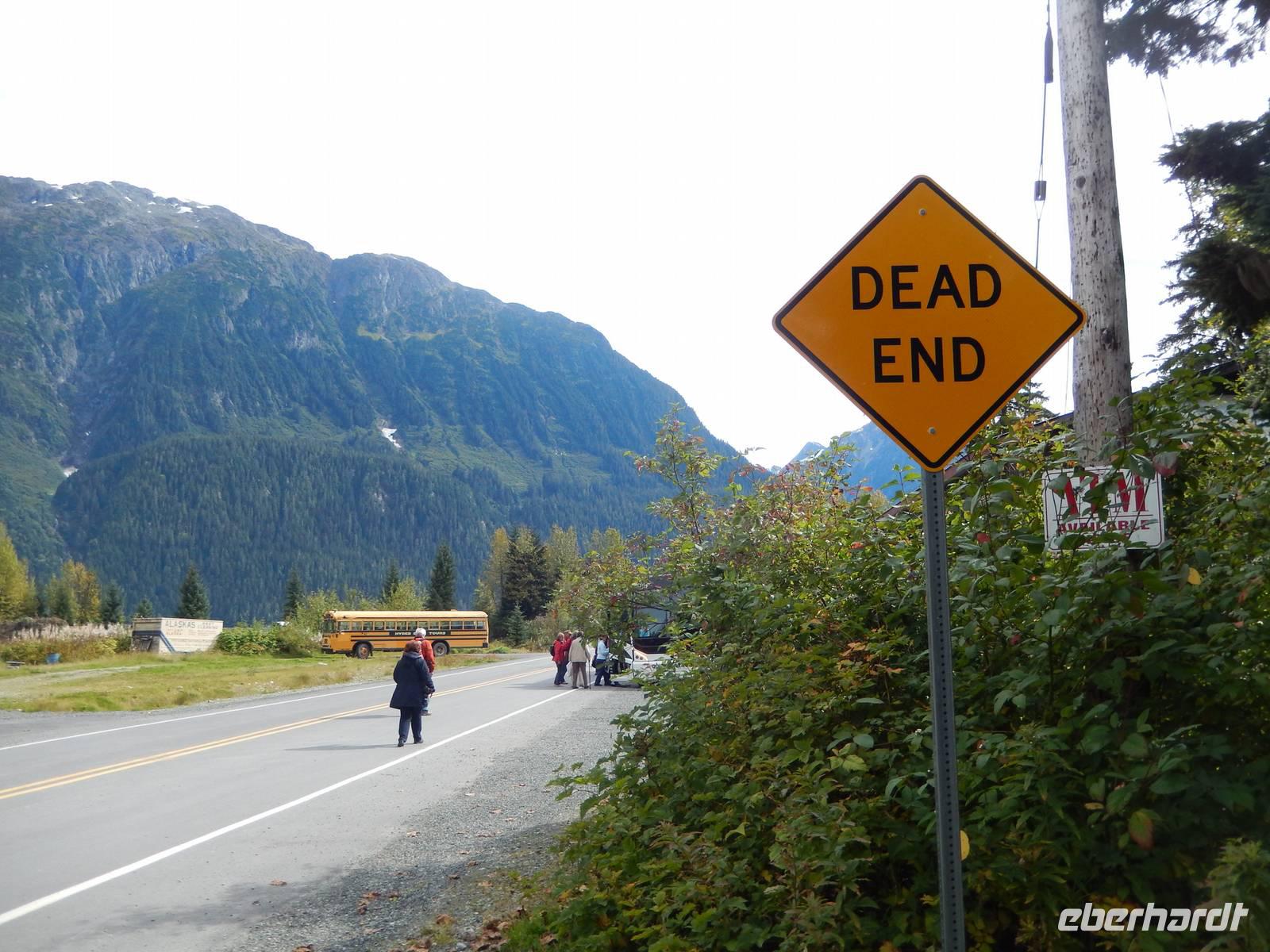 Obwohl Goran heute eigentlich seinen freien Tag gehabt hätte, war er natürlich sofort bereit, uns mit seinem Bus über die Grenze nach Hyder zu fahren, denn unsere eigentlicher Bus für den heutigen Tag hatte nur eine Fahr-Lizenz innerhalb der USA und konnte uns deshalb nicht am Hotel abholen. Das rechneten wir Goran natürlich hoch an, der zumindest den Rest des Ausflugs mit uns als Gast unternahm. In Hyder, der freundlichsten Geisterstadt der Welt, empfing uns ein amerikanischer, gelber Schulbus. Fahrer Flint chauffierte uns zuerst zum Beobachtungspunkt am Fish Creek, wo man gerade jetzt zur Lachswanderung oft Bären beobachten konnte. Leider hatten wir kein Glück und bekamen außer Fischen und Möwen nichts zu sehen - abgesehen von der traumhaften Natur. Wir fuhren weiter entlang kaum befestigter Bergstraßen bis hinauf zum Salmon-Gletscher der sowohl durch seine Größe als auch seine Schönheit besticht. Wir machten ein ausgiebiges Picknick mit Truthahnsandwiches, Keksen und Saft und genossen dabei die Gletscherwelt unter uns. Ein wenig gepiesakt durch die vielen Mücken machten wir uns schließlich auf den Rückweg nach Hyder, wo wir entlang des Highways durch den Ort spazierten und die vielen verlassenen Blockhütten und alten Geschäfte betrachteten. Im Glacier Inn, einem Hotel mit Bar wurden wir dann offiziell „hyderized" und zwar mithilfe eines starken Skake-Bite-Schnapses, der doch ziemlich durchheizte. Im kleinen Geschäft gegenüber konnten wir Souveniers kaufen, darunter auch Besonderheiten wie Rentierfleisch in Dosen oder hausgemachtes Toffee. Goran brachte uns schließlich nach einer kurzen Passkontrolle an der Grenze zurück nach Stewart. Am frühen Abend trafen wir uns dann erneut zu einem weiteren Versuch, einen Bären zu entdecken und fuhren erneut über die Grenze zum Fish Creek, doch auch diesmal hatten wir kein Glück und fuhren ohne Bärenfotos zurück ins Hotel.