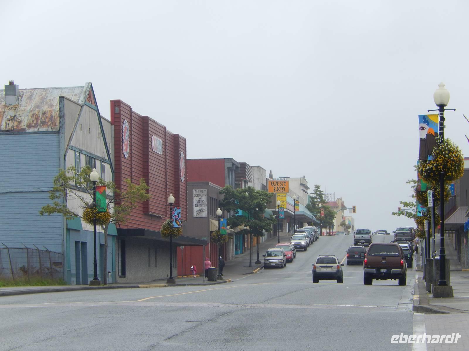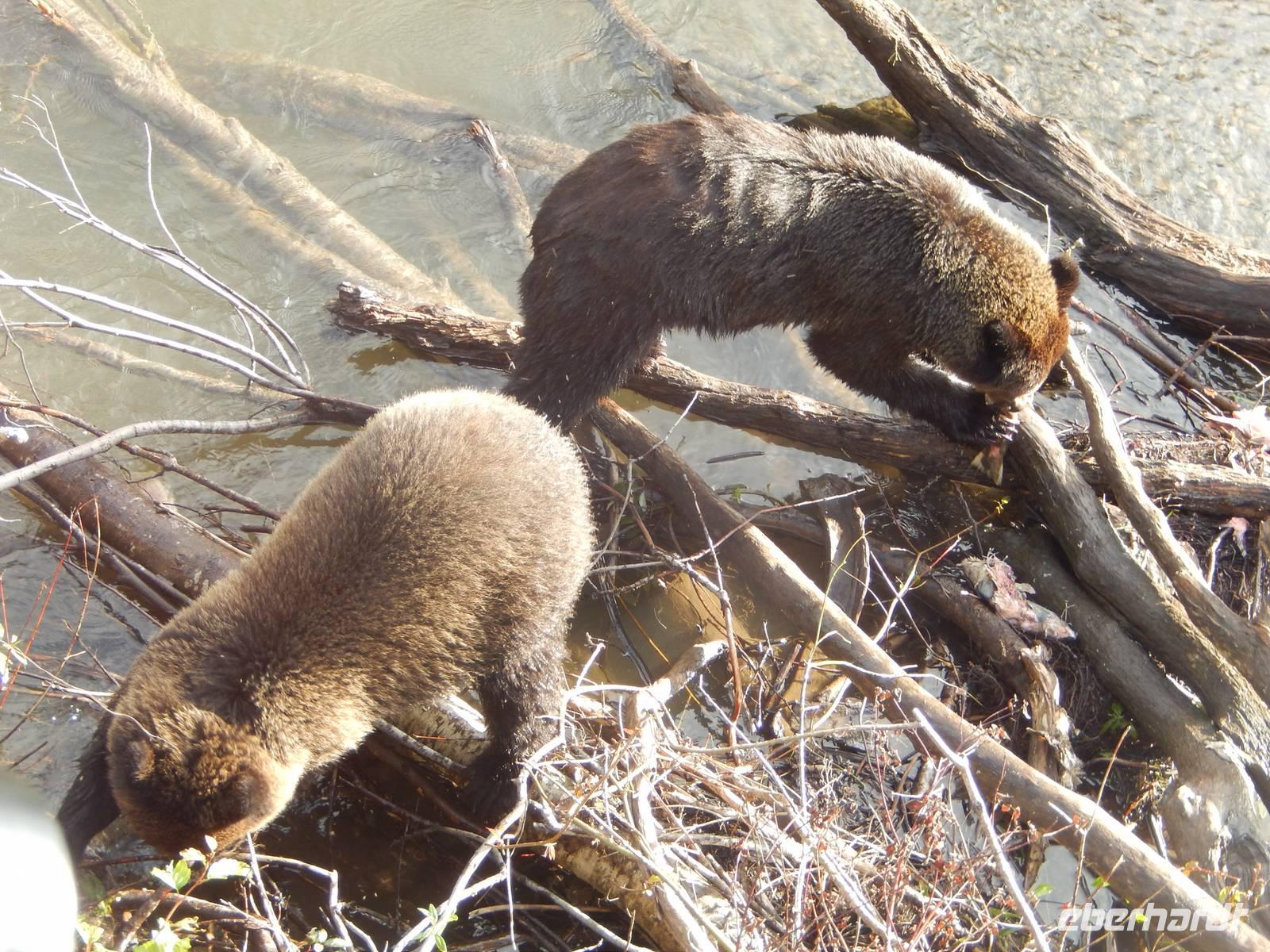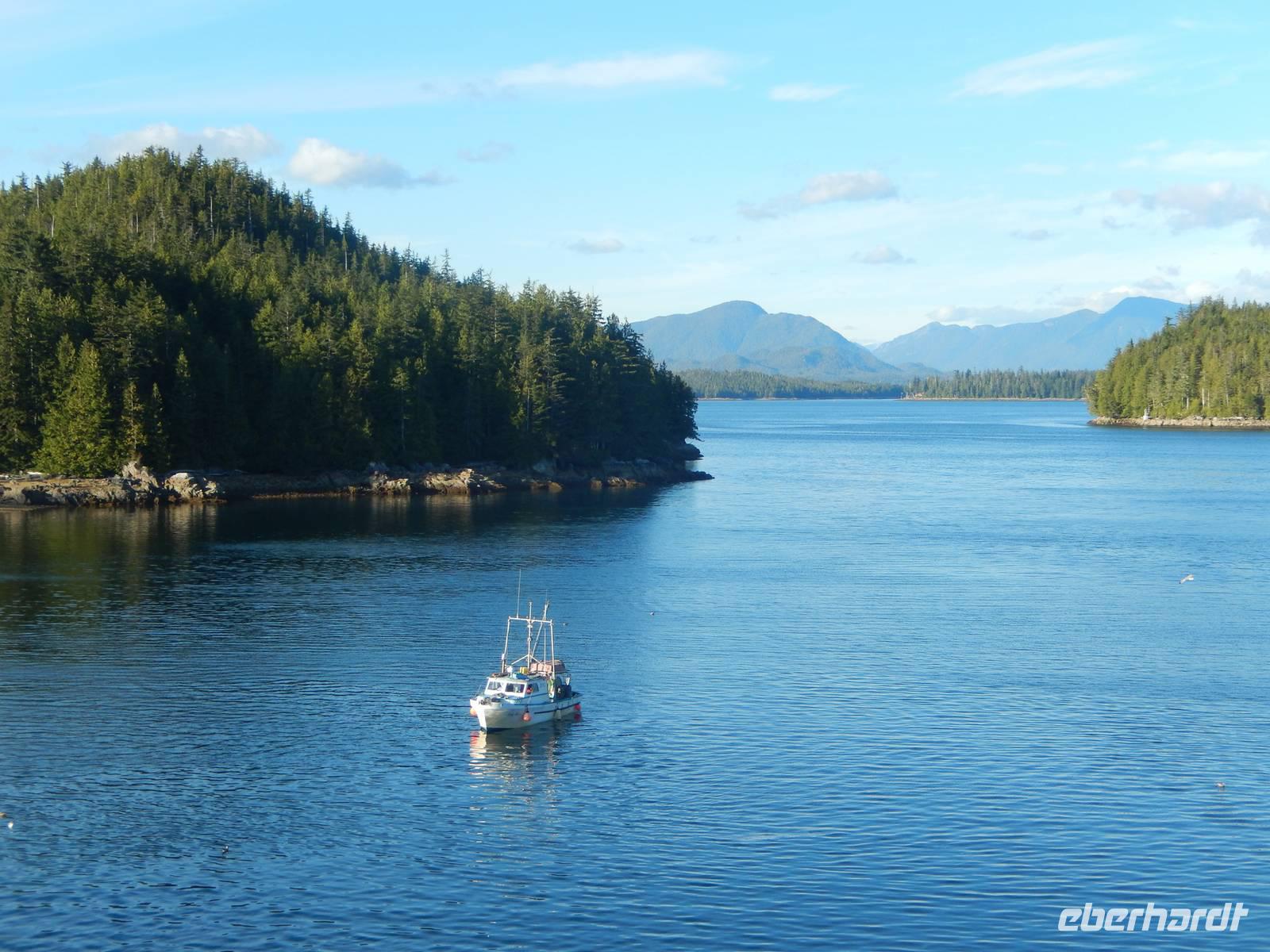 Heute verließen wir die Grenzstadt Stewart und machten uns auf in Richtung Küste. Auf dem Weg nach Prince Rupert hatten wir heute jedoch ganz besonders viel Glück: Am Hannah Creek, einem kleinen Fluss, der unseren Highway kreuzte lockten uns einige Schaulustige an, die fotografierend auf der darüberliegenden Brücke standen. Diese Chance ließ sich Goran natürlich nicht entgehen und ließ uns ebenfalls aussteigen. Zuerst sahen wir nur die typisch während der Laichzeit rot-grün gefärbten Lachse im flachen Wasser schwimmen, doch schon kurz darauf tobten zwei junge Grizzlybären aus dem Unterholz auf die fette Beute zu. Besonders klug stellten sie sich allerdings nicht an, was aber für uns nicht weniger unterhaltsam war. Beide Bären ließen sich von uns knipsenden und tuschelnden Zuschauern ganz und gar nicht stören, sondern mampften gierig die erbeuteten und angeschwemmten Fische. Später erzählte Reiseleiterin Marion, dass selbst sie noch nie aus solcher Nähe wilde Bären hat beobachten können - ein echtes Highlight und mehr als genug Entschädigung für die Bärenflaute am Vortag. Auf der Weiterfahrt legten wir unseren Mittagsstopp in der kleinen Stadt Terrace ein und einige von uns besuchten das Schnellrestaurant Tim Hortons, dessen Filialen hier landesweit in großer Zahl zu finden sind. Angekommen in Prince Rupert betraten wir unsere Hotel aufgrund von Bauarbeiten durch den Hintereingang, was aber niemanden störte. Wir hatten noch reichlich Zeit, den Nachmittag in der Stadt zu verbringen, zum Beispiel in der quirligen Cow Bay. Unser Abendessen bekamen wir in einem urig griechischem Restaurant direkt im Hotel. Zeitig ging es ins Bett, denn am nächsten Morgen mussten wir sehr zeitig aufstehen.