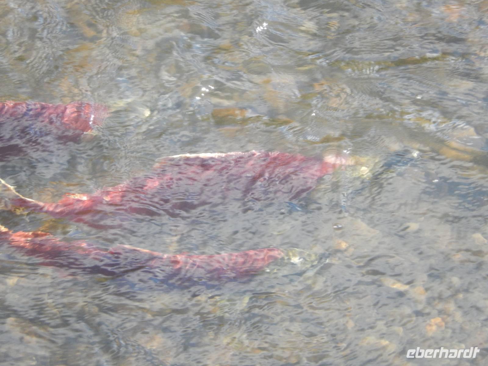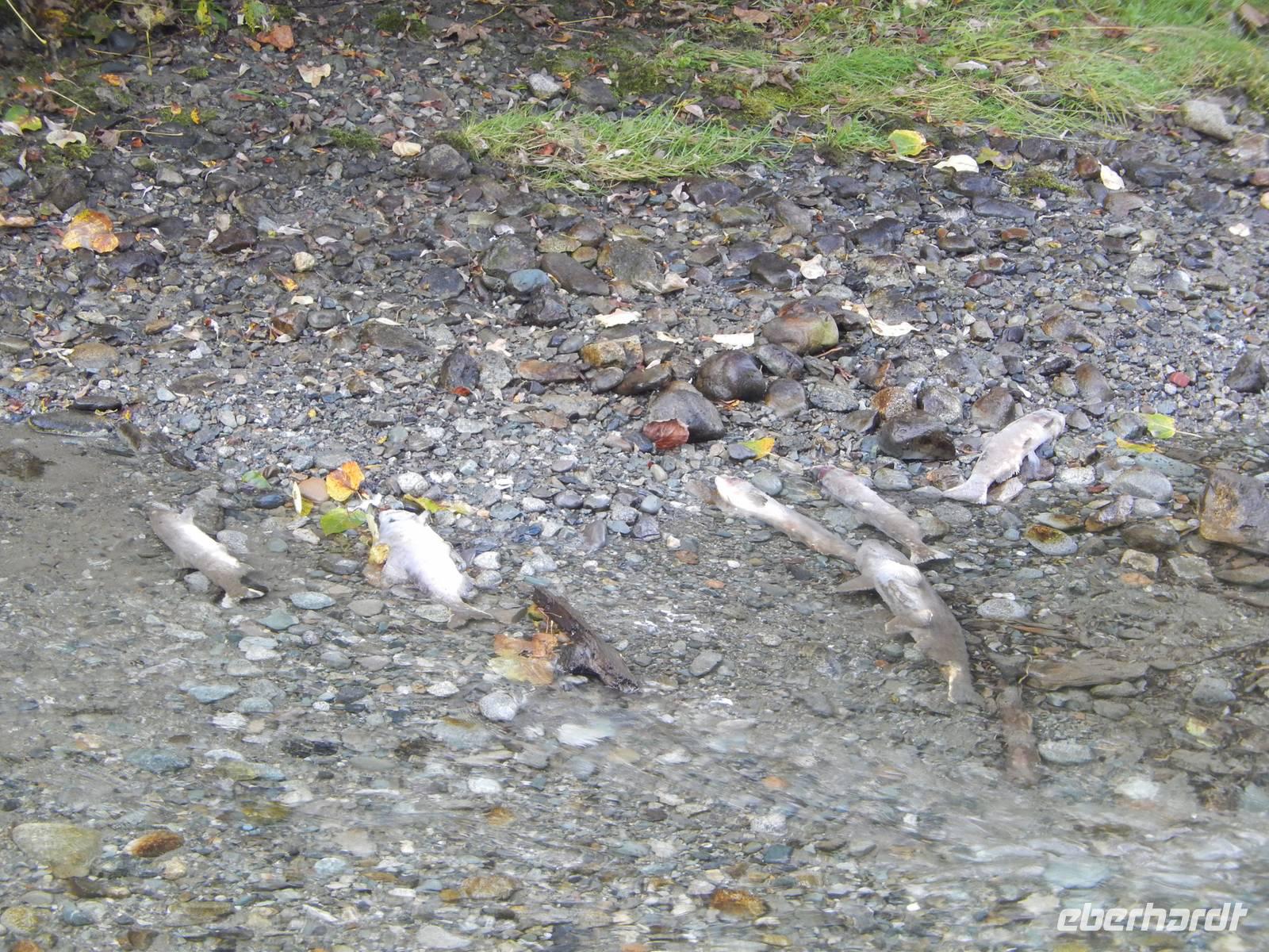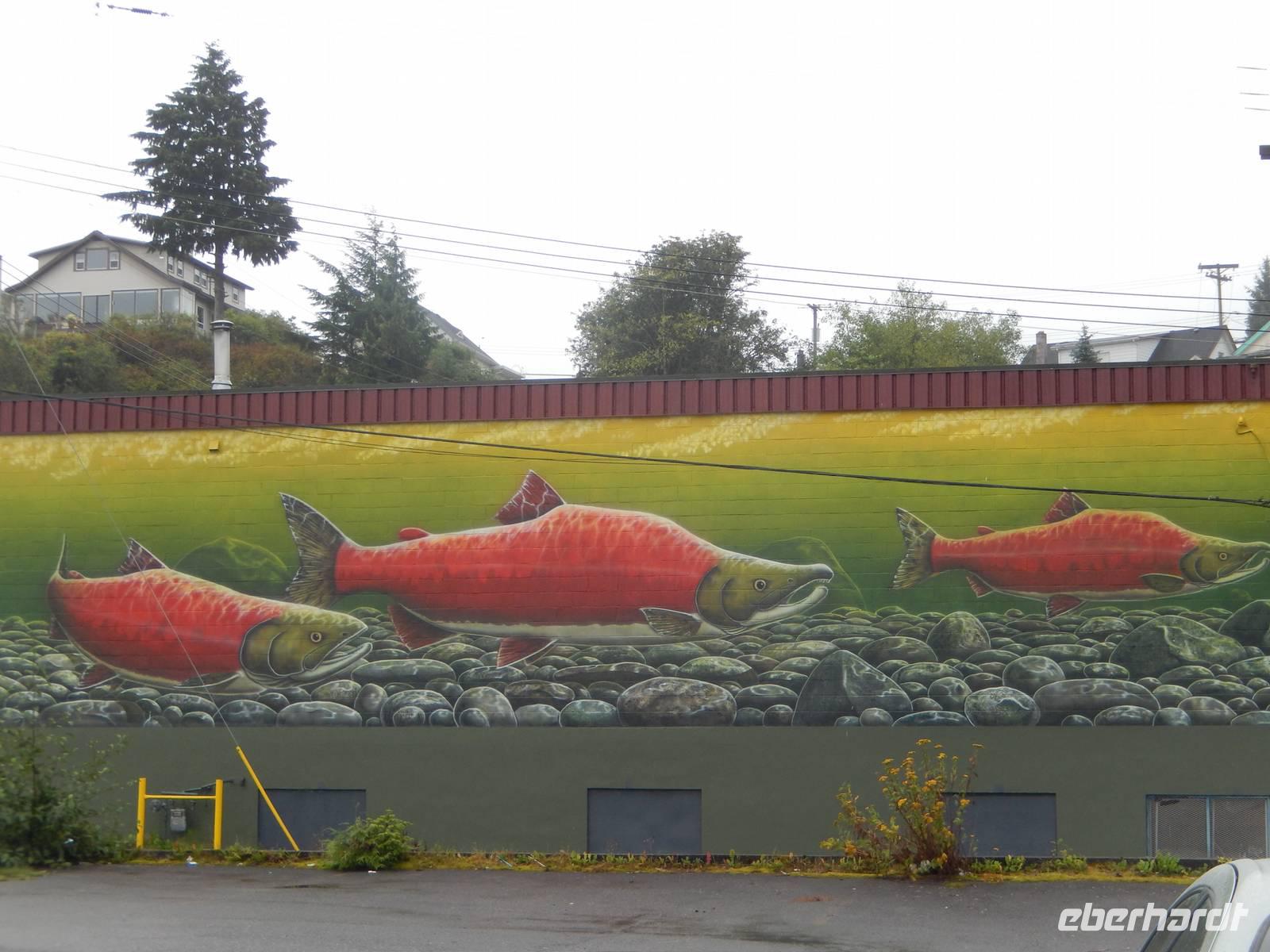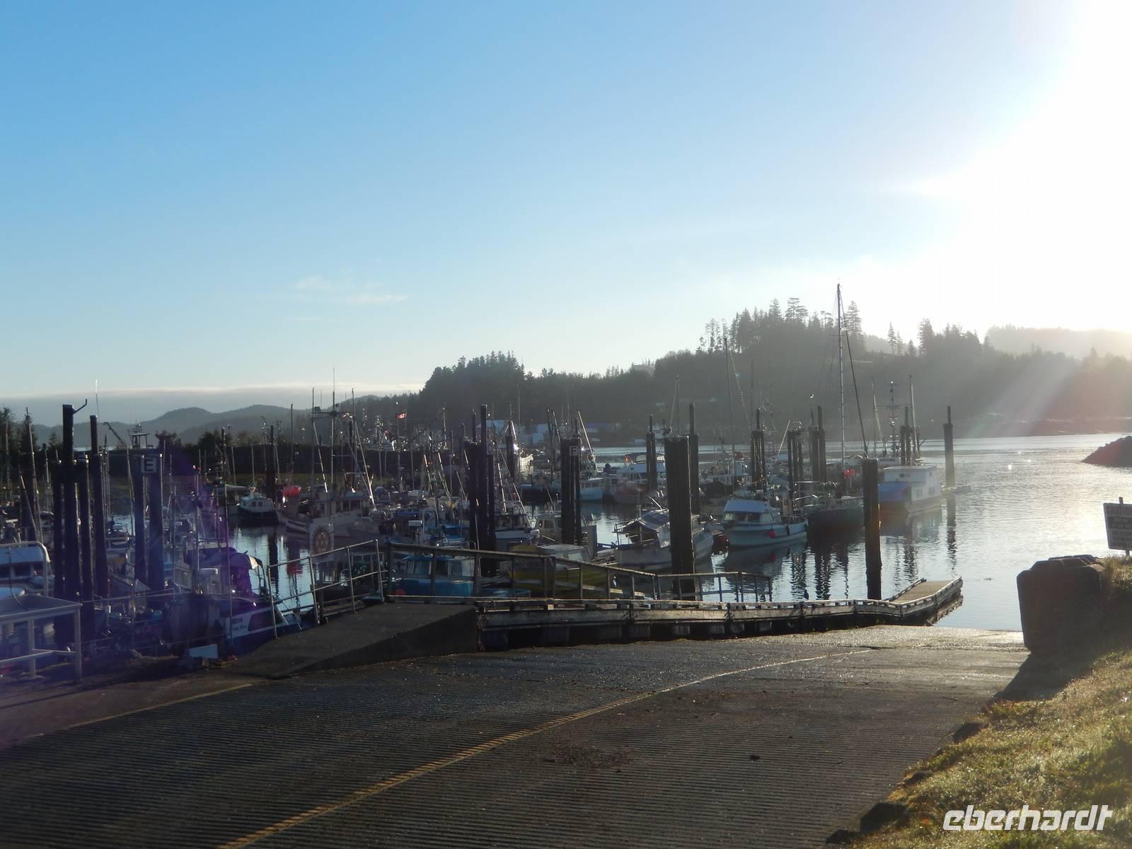 Heute verließen wir die Grenzstadt Stewart und machten uns auf in Richtung Küste. Auf dem Weg nach Prince Rupert hatten wir heute jedoch ganz besonders viel Glück: Am Hannah Creek, einem kleinen Fluss, der unseren Highway kreuzte lockten uns einige Schaulustige an, die fotografierend auf der darüberliegenden Brücke standen. Diese Chance ließ sich Goran natürlich nicht entgehen und ließ uns ebenfalls aussteigen. Zuerst sahen wir nur die typisch während der Laichzeit rot-grün gefärbten Lachse im flachen Wasser schwimmen, doch schon kurz darauf tobten zwei junge Grizzlybären aus dem Unterholz auf die fette Beute zu. Besonders klug stellten sie sich allerdings nicht an, was aber für uns nicht weniger unterhaltsam war. Beide Bären ließen sich von uns knipsenden und tuschelnden Zuschauern ganz und gar nicht stören, sondern mampften gierig die erbeuteten und angeschwemmten Fische. Später erzählte Reiseleiterin Marion, dass selbst sie noch nie aus solcher Nähe wilde Bären hat beobachten können - ein echtes Highlight und mehr als genug Entschädigung für die Bärenflaute am Vortag. Auf der Weiterfahrt legten wir unseren Mittagsstopp in der kleinen Stadt Terrace ein und einige von uns besuchten das Schnellrestaurant Tim Hortons, dessen Filialen hier landesweit in großer Zahl zu finden sind. Angekommen in Prince Rupert betraten wir unsere Hotel aufgrund von Bauarbeiten durch den Hintereingang, was aber niemanden störte. Wir hatten noch reichlich Zeit, den Nachmittag in der Stadt zu verbringen, zum Beispiel in der quirligen Cow Bay. Unser Abendessen bekamen wir in einem urig griechischem Restaurant direkt im Hotel. Zeitig ging es ins Bett, denn am nächsten Morgen mussten wir sehr zeitig aufstehen.
