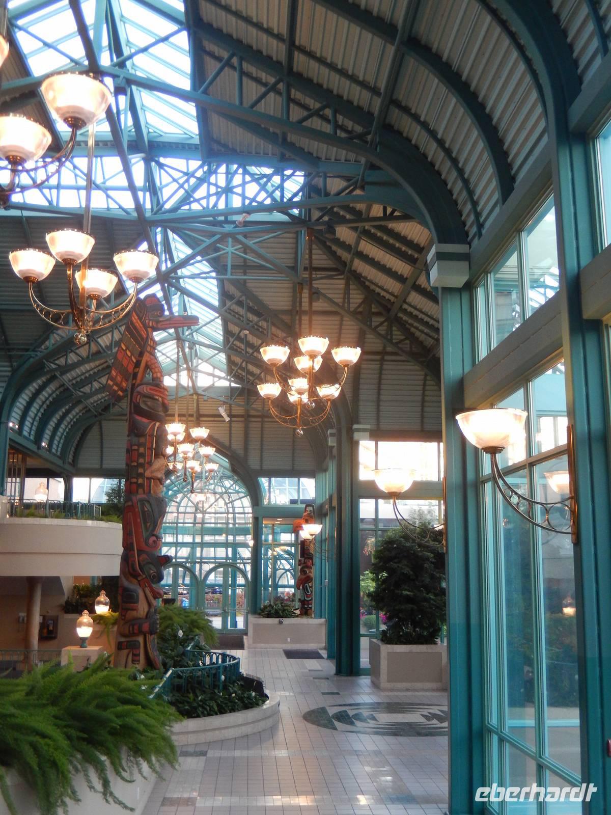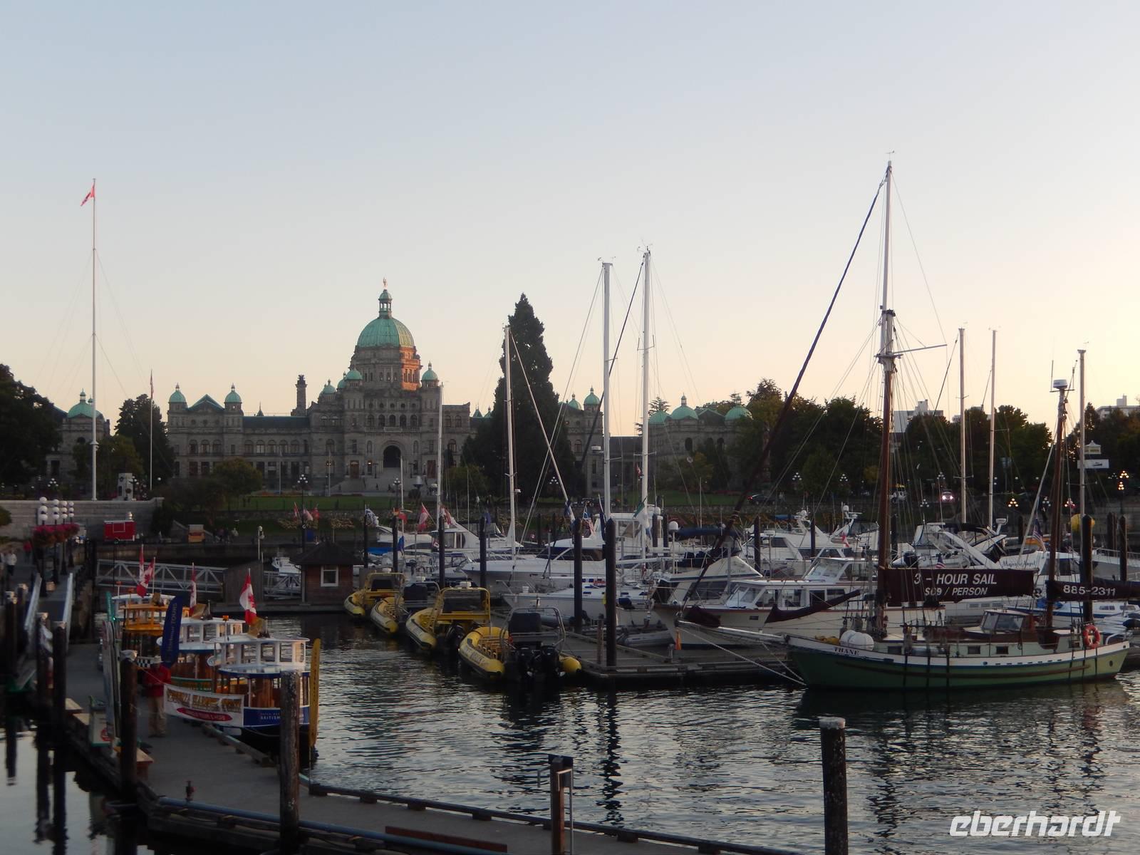 Nach der kurzen Nacht kletterten wir heute schläfrig in unseren Bus und machten uns bereit für unsere Fahrt ans andere Ende von Vancouver Island - nach Victoria. Der Vormittagshalt fand diesmal am spiegelglatten Hoomak Lake statt, der über eine Holztreppe zu erreichen war. Hier ließ es sich aushalten. Weiter ging die Fahrt danach zu einem weiteren Programmpunkt, nämlich in die kleine Stadt Chemainus, die Bekanntheit erlangte durch ihre großen und kunstvollen Wandgemälde an verschiedenen Gebäuden, diese werden auch als Murals bezeichnet. Als in der 70er Jahren das Sägewerk der Stadt schloss, entschlossen sich die Einwohner, die Geschichte der Stadt in Form dieser Bilder zu erzählen, was natürlich bald viele Touristen anlockte und neue Arbeitsplätze schaffte. Bevor es weiterging konnte jeder noch Marions Ehemann und ihrem kleinen und Hallo sagen, denn die beiden schauten kurz vorbei. Gegen Nachmittag erreichten wir schließlich die ehemalige Hauptstadt der Provinz British Columbia: Victoria. Die ehemalige Pelzhandels- und Goldsucherstadt besticht besonders durch ihr mediterran anmutendes Flair mit vielen Blumenlaternen, bergigen Gassen und Straßen und dem romantischen Hafen. Nach einer orientierenden Stadtrundfahrt hatten wir noch selbst Zeit, die Innenstadt zu erkunden. Durch eine Verschiebung bei der Zeit des Abendessens verbrachten wir dann schließlich die zusätzliche halbe Stunde damit, uns die Einrichtung des luxuriösen Empress Hotels auf der gegenüberliegenden Straßenseite anzuschauen, bevor wir schließlich mitten am Hafen einkehrten und die Sicht auf die Bucht und die bunt beleuchteten Gebäude genossen.